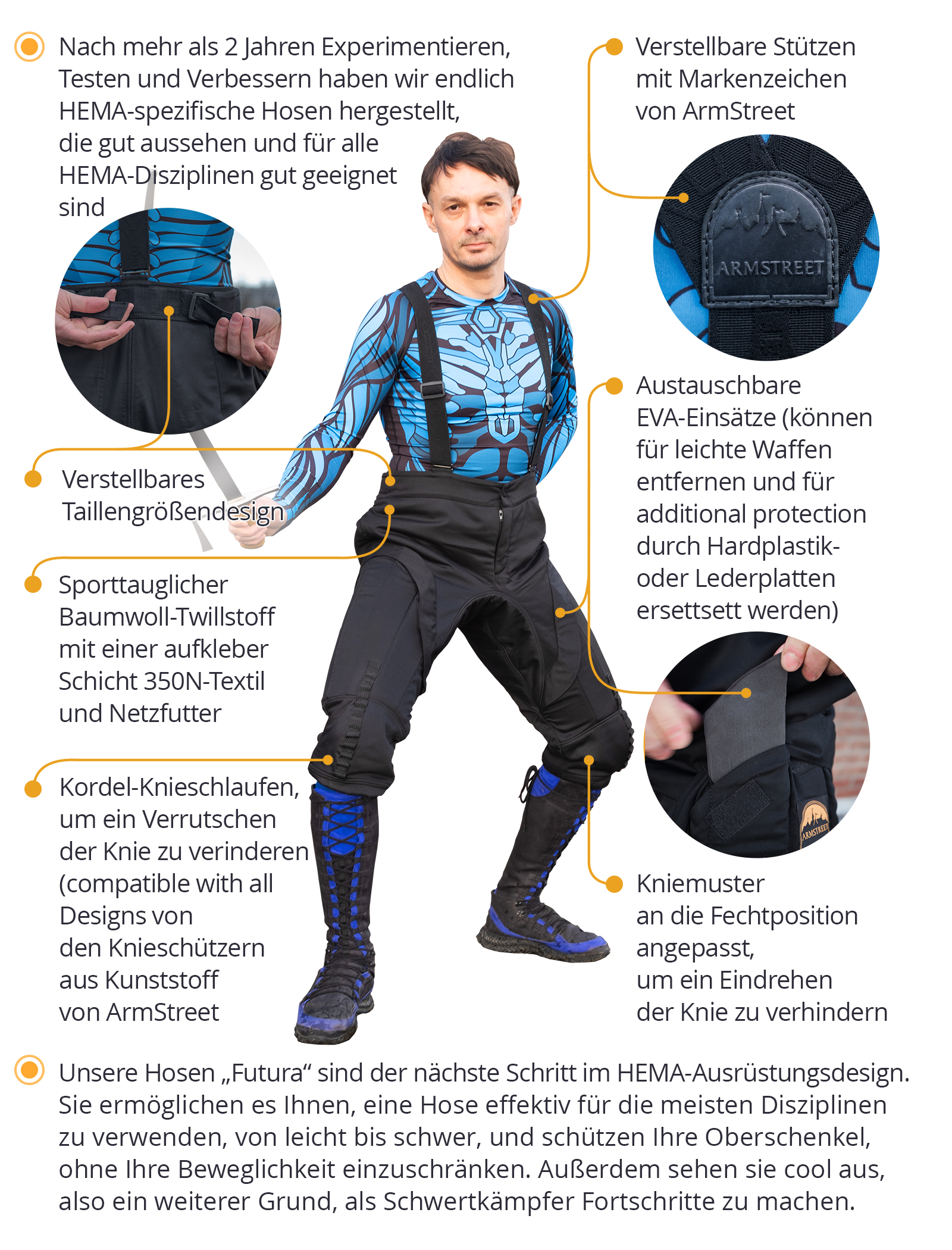 HEMA-Hose „Futura“ – eine neue Generation von HEMA-Ausrüstung 24. Februar, 2025 HEMA-Hose „Futura“ Eine neue Generation leistungsstarker HEMA-Ausrüstung von ArmStreet Angesichts all der Herausforderungen und Veränderungen, die ArmStreet während der Kriegsjahre in der Ukraine erlebt hat, war es am schwierigsten, Forschung und Entwicklung wieder auf das ursprüngliche Niveau zu bringen. Dennoch haben wir beschlossen, keine Kompromisse einzugehen: Unser einziges Ziel ist es, weiter voranzukommen, in diesem speziellen Fall Dinge zu entwerfen, die in Bezug auf Leistung und Funktionalität den nächsten Schritt darstellen. Die Probleme, die wir lösen wollten und bisher gelöst haben: Design. Wir wollten Hosen herstellen, die wirklich gut aussehen, nicht nur zwei quadratische Kästen, die mit einem Gürtel verbunden sind. Wir wollten die Probleme mit den jüngsten Designs lösen. Die meisten derzeit existierenden Designs basieren auf olympischen Fechthosen, was nicht wirklich gut funktioniert, da ein viel schwereres Sandwich aus Stoffschichten, Polsterung und in den meisten Fällen harte Knie mit der Hose verbunden sein müssen. Wir wollten ein Einheitsdesign schaffen, das unsere Hosen so schützt, dass sie für ein Langschwert oder einen Husarensäbel ausreichend sind, aber bequem für ein kleines Schwert oder ein leichtes Rapier. Wir wollten, dass sie Teil unserer „Futura“-Kollektion sind (natürlich wird eine Jacke folgen), um der Idee von HEMA als modernem Sport mit historischen Wurzeln und einem Superhelden-Flair der Popkultur zu entsprechen. Um es kurz zu machen: Wir haben es geschafft. Nach über einem Jahr Prototypentests haben es unsere Hosen bereits auf die Podeste prestigeträchtiger europäischer Veranstaltungen wie HLO oder Mortslag geschafft, an Hunderten von Turnierkämpfen und Tausenden von Sparrings teilgenommen und Feedback von mehreren Fechtern der A-Klasse erhalten. Wir haben auch auf die Besonderheiten verschiedener HEMA-Szenen geachtet, uns auf die Herstellung eines universellen Produkts konzentriert und jetzt Feedback von unseren US-Partnern gesammelt. Alles hat seinen Preis. Um also die Fragen zu den Kosten vorherzusehen: Ja, es hat seinen Preis. Wenn Sie etwas anatomisch korrektes herstellen möchten, das auch bei aktiven Bewegungen gut funktioniert, den Träger in verschiedenen Positionen schützt und viel Größenflexibilität bietet, müssen Sie etwas Ingenieurskunst an den Tag legen. Ein bisschen Ingenieursarbeit hat also ein Meisterwerk aus 126 Teilen hervorgebracht. Wenn man sich also vorstellt, wie viel Arbeit es kostet, eine Hose zuzuschneiden und zusammenzusetzen, ist der Preis niedriger als erwartet. Bei der ersten Veranstaltung in den USA, bei der wir diese Hose präsentierten, hatten wir drei Fechter für eine Hose. Unser Vorschlag war, eine Duellreihe zu veranstalten, sie haben sich jedoch für das Los entschieden. Ist es sinnvoll, in dieses Ausrüstungsstück zu investieren? Dies sind die Hosen unseres Chefs (der auch Fechttrainer ist), die er seit etwa einem Jahr testet. Der Prototyp hatte keine Supporter, also hat er normale Supporter verwendet. Aber alles andere ist gleich wie beim kürzlich vorgestellten Design. Er hatte ein ziemlich herausforderndes Schwertkampfjahr mit mehr als 100 Sparringstagen oder kleineren Events, bei denen ich sie regelmäßig verwendet hat, und 8 Turnieren, die normalerweise mehrere Disziplinen und Kämpfe bis zur späten Ausscheidungs- oder Finalphase umfassten. Als Fechter ist der Säbel seine Hauptwaffe. Er übt auch regelmäßig mit einem schwereren Husarensäbel und gelegentlich mit einem Langschwert und Rapier & Dolch sowie einem Einstock, also hat er sie mit den meisten der vorhandenen HEMA-Waffen ausprobiert. Der einzige Grund, warum er sich entschieden hat, sie durch ein neues Paar zu ersetzen, ist, dass Miha eigentlich ein Paar mit Halterungen wollte, also ist das Originalpaar in einwandfreiem Zustand und würde wahrscheinlich als Leihausrüstung an einen Verein oder jemanden gehen, der es braucht. Das einzige große Anzeichen für starke Abnutzung ist, dass der Stoff in einigen verschwitzten Ecken leicht ausgebleicht ist, was ein großartiges Ergebnis ist. Als wettbewerbsfähiger HEMA-Fechter für seine Waffenkollegen denkt er also, dass es eine Ausrüstung ist, die in Bezug auf Komfort und Leistung einen kleinen Unterschied machen würde, und es ist ein wichtiger großer Schritt nach vorne für ArmStreet in Richtung einer Hochleistungs-HEMA-Ausrüstung. Bleiben Sie dran, bleiben Sie in Kontakt und gewinnen Sie Ihre Kämpfe.