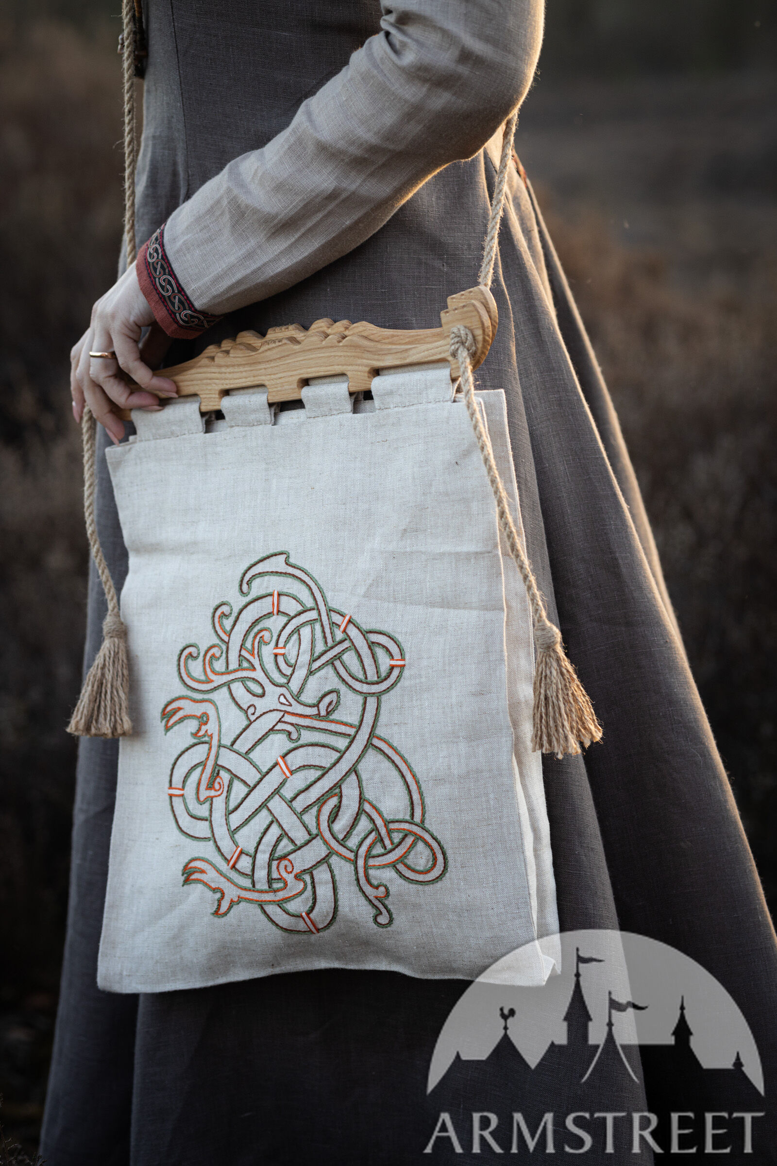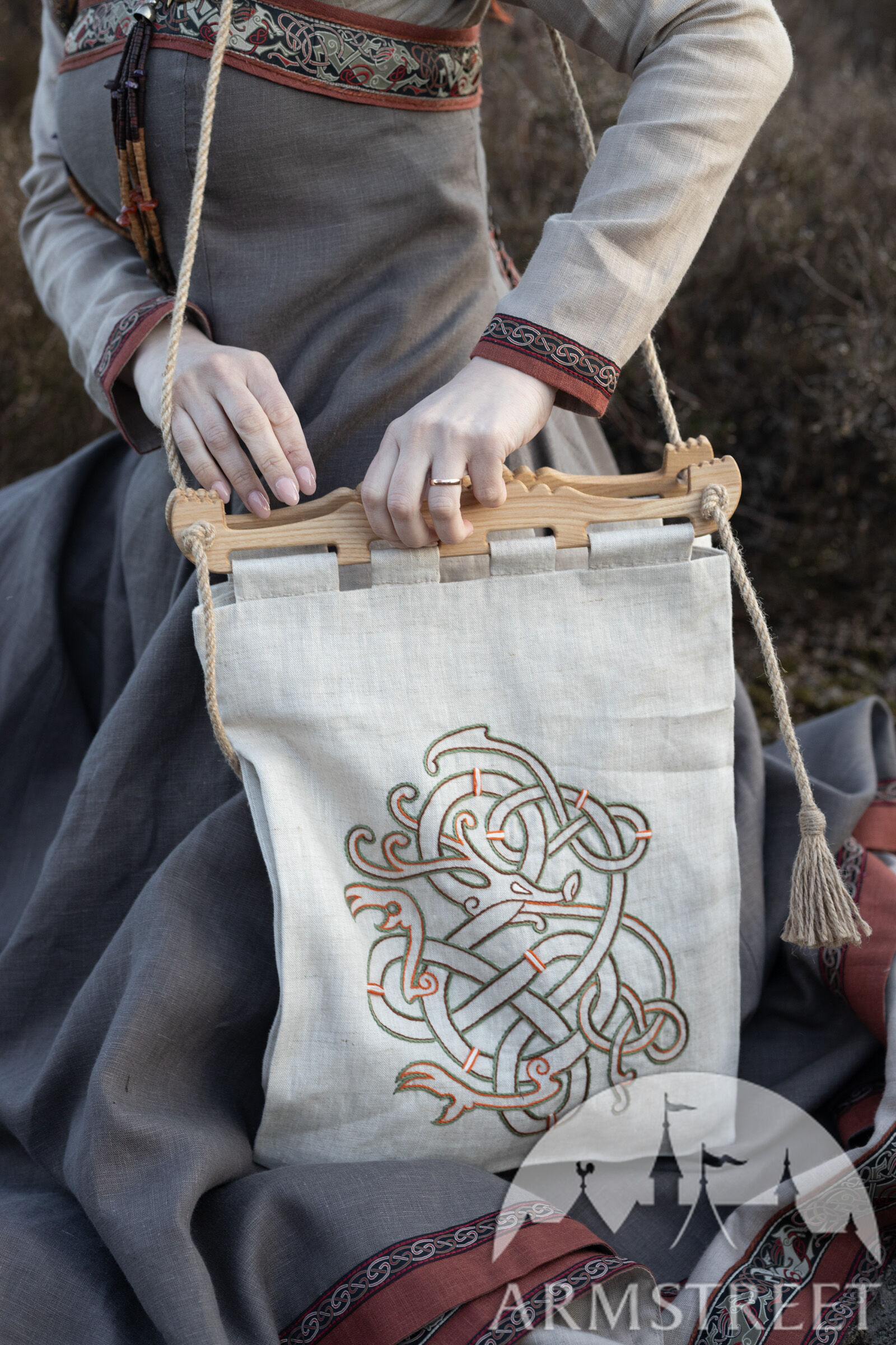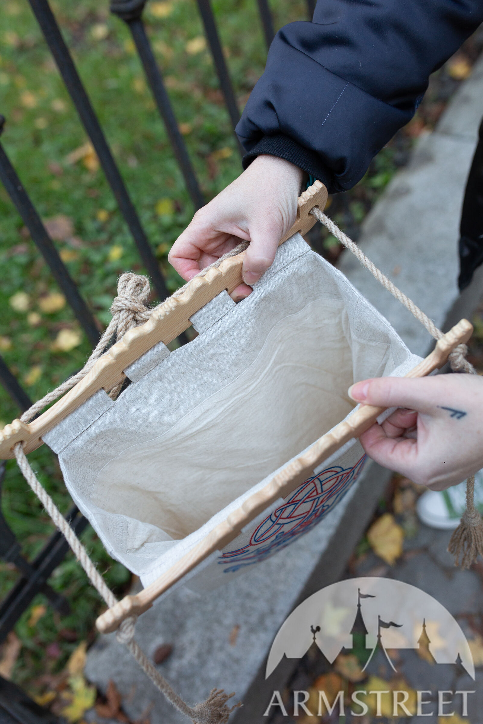 Die funktionale Tasche basiert auf archäologischen Funden aus der Wikingersiedlung Haithabu (Hedeby), einem wichtigen Handelszentrum im 8.-11. Jhdt nahe der Ostsee im heutigen Norddeutschland. Haithabu lag an wichtigen Handelsrouten, die Skandinavien mit Europa und darüber hinaus verbanden, und war ein blühendes Zentrum für Handel und Kultur. Die Tasche bestand typischerweise aus einem Paar Holzrahmen, oft aus Eiche oder Esche, an denen ein Stoffbeutel (und möglicherweise Lederbeutel) sicher befestigt war. Die Kombination aus Holzplatten und einem durchgezogenen Seilgriff verhindert, dass der Inhalt der Tasche herausfällt – ein Muss für den täglichen Gebrauch der Händler, Handwerker und Siedler von Haithabu. Das Design schien so erfolgreich, dass die Bilder in Ibn Butláns „Tacuinum Sanitatis“ noch im Mittelalter Taschen im gleichen Stil zeigen.