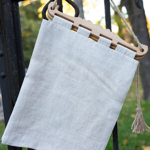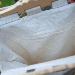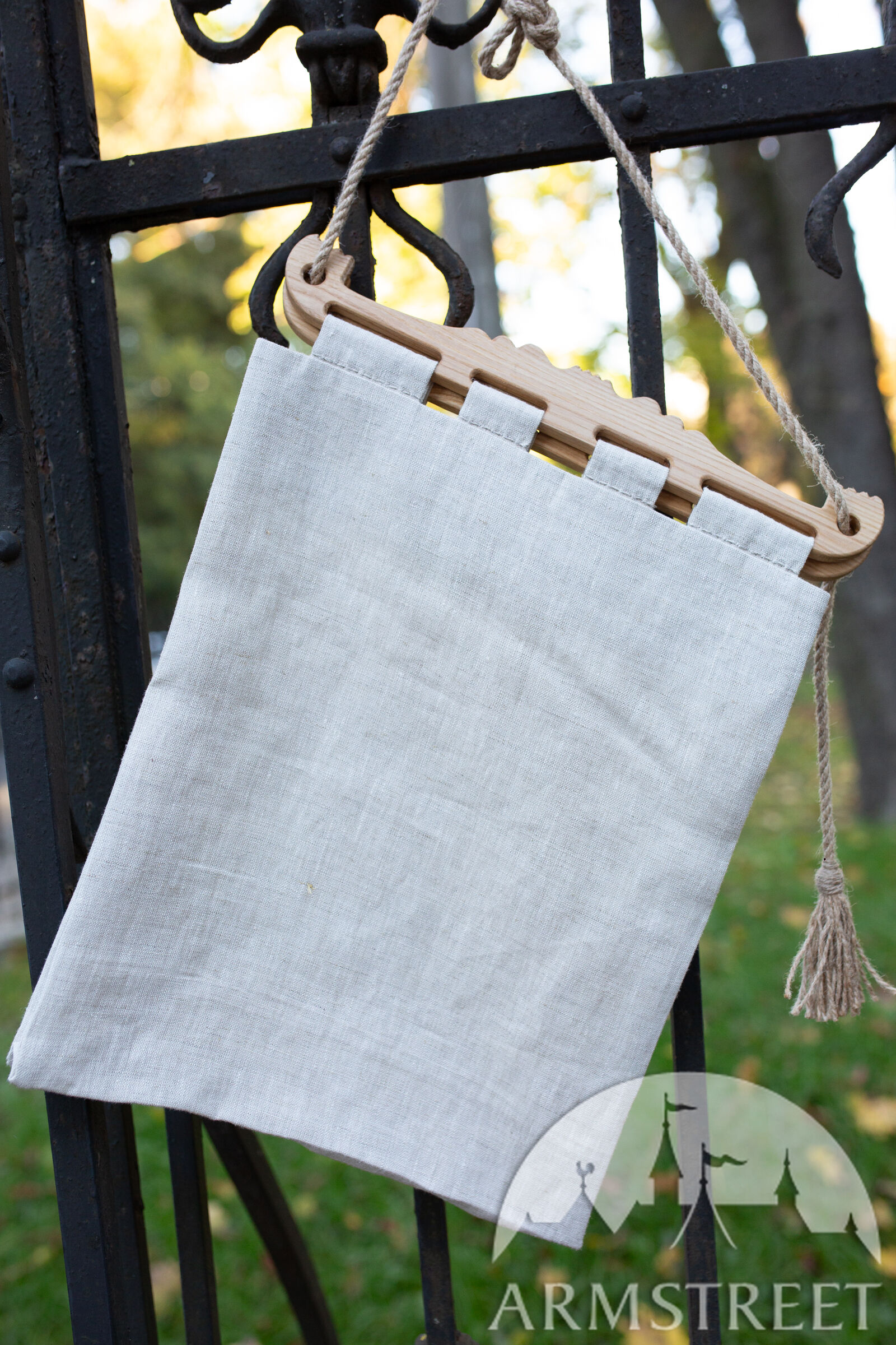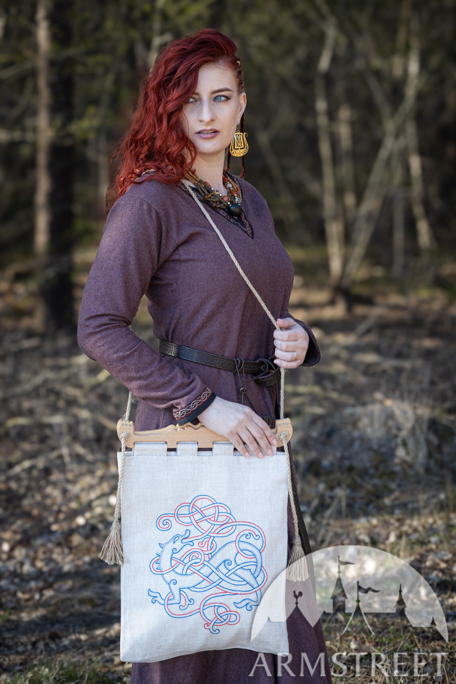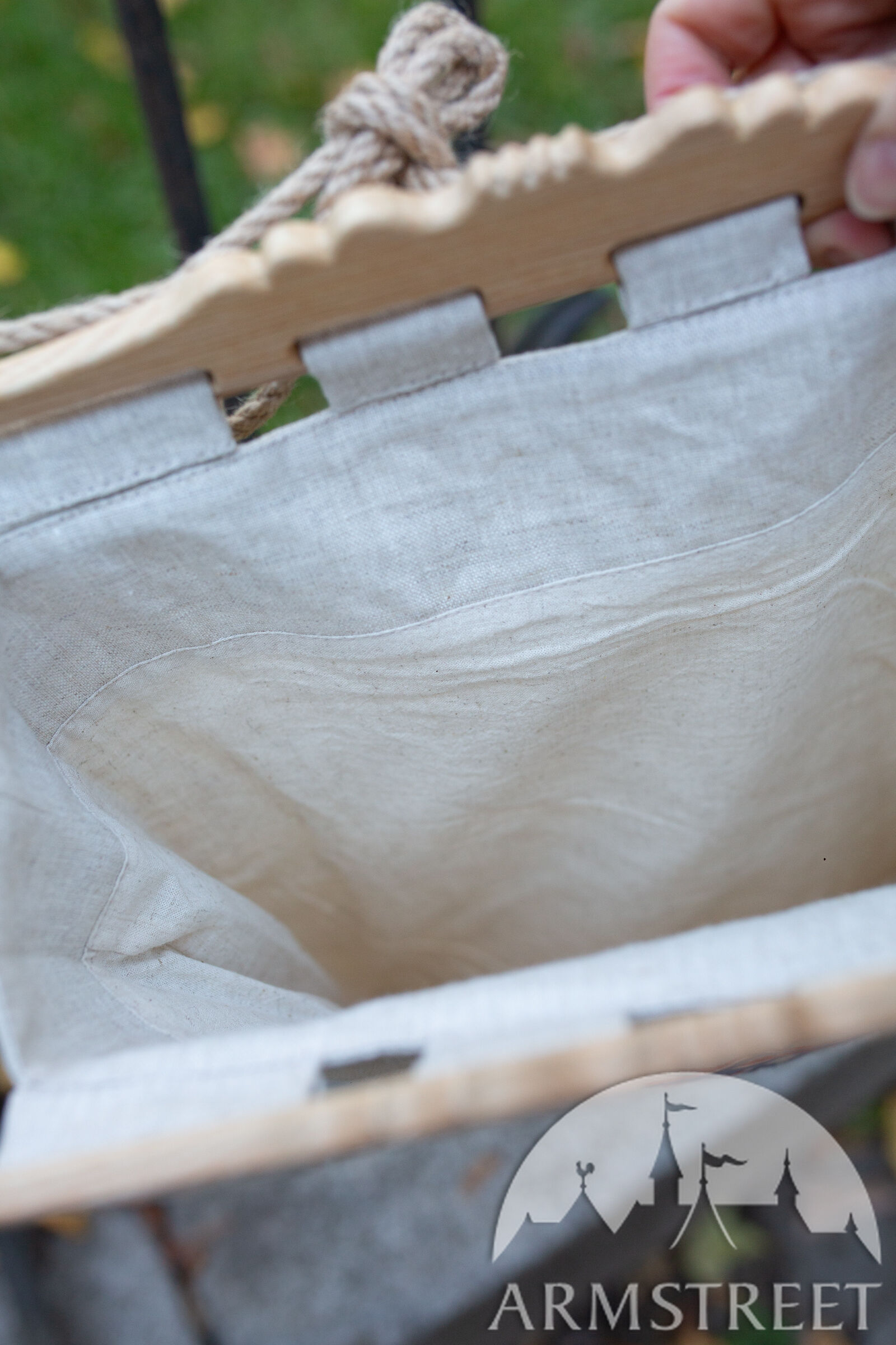 Die funktionale Tasche basiert auf archäologischen Funden aus der Wikingersiedlung Haithabu (Hedeby), einem wichtigen Handelszentrum im 8.-11. Jhdt nahe der Ostsee im heutigen Norddeutschland. Haithabu lag an wichtigen Handelsrouten, die Skandinavien mit Europa und darüber hinaus verbanden, und war ein blühendes Zentrum für Handel und Kultur. Die Tasche bestand typischerweise aus einem Paar Holzrahmen, oft aus Eiche oder Esche, an denen ein Stoffbeutel (und möglicherweise Lederbeutel) sicher befestigt war. Die Kombination aus Holzplatten und einem durchgezogenen Seilgriff verhindert, dass der Inhalt der Tasche herausfällt – ein Muss für den täglichen Gebrauch der Händler, Handwerker und Siedler von Haithabu. Das Design schien so erfolgreich, dass die Bilder in Ibn Butláns „Tacuinum Sanitatis“ noch im Mittelalter Taschen im gleichen Stil zeigen.