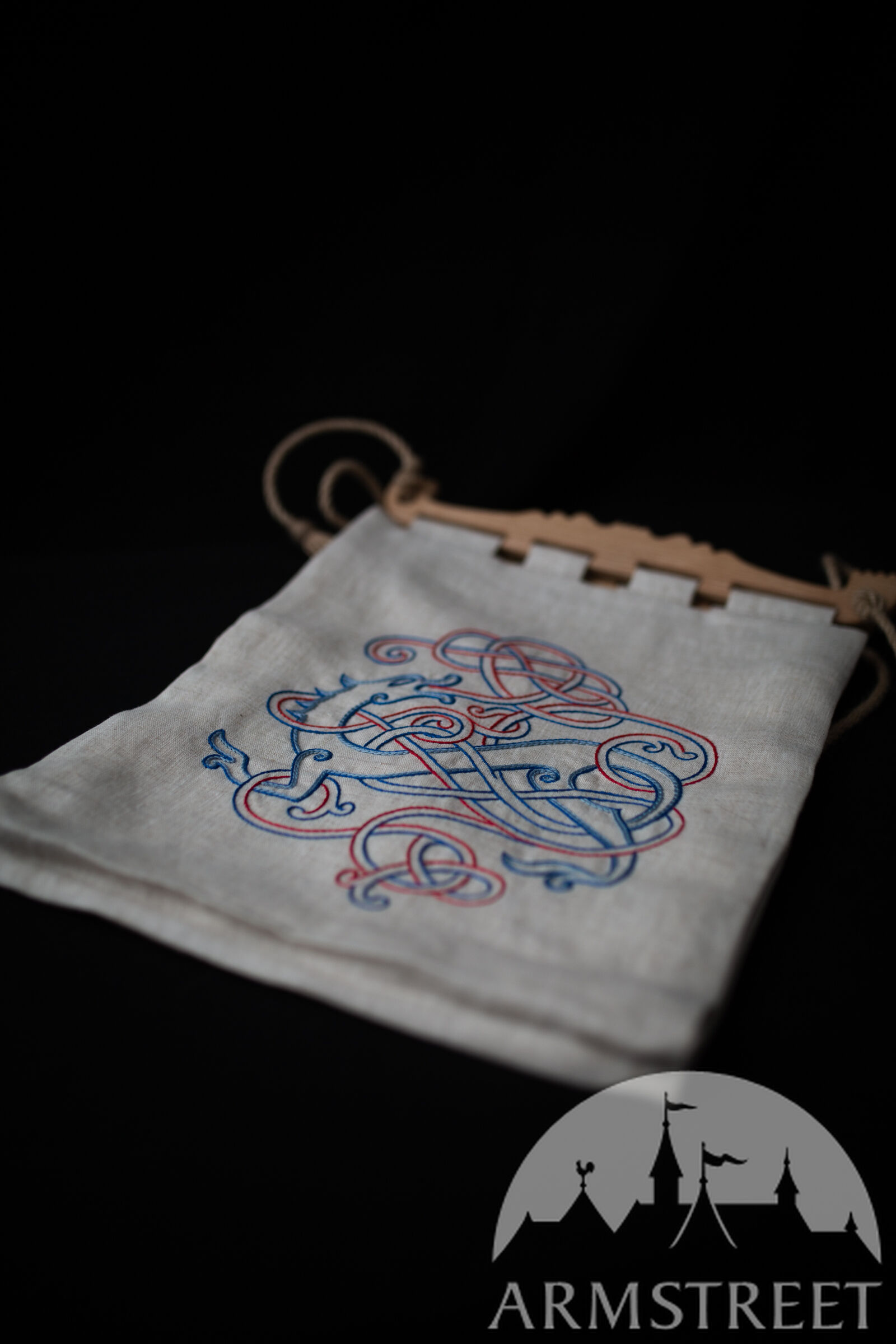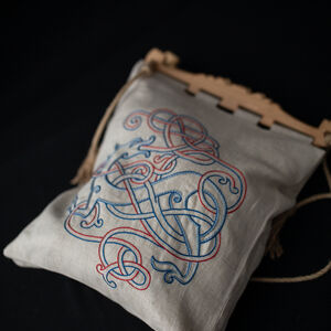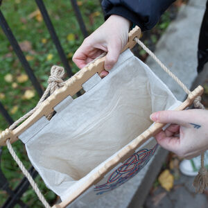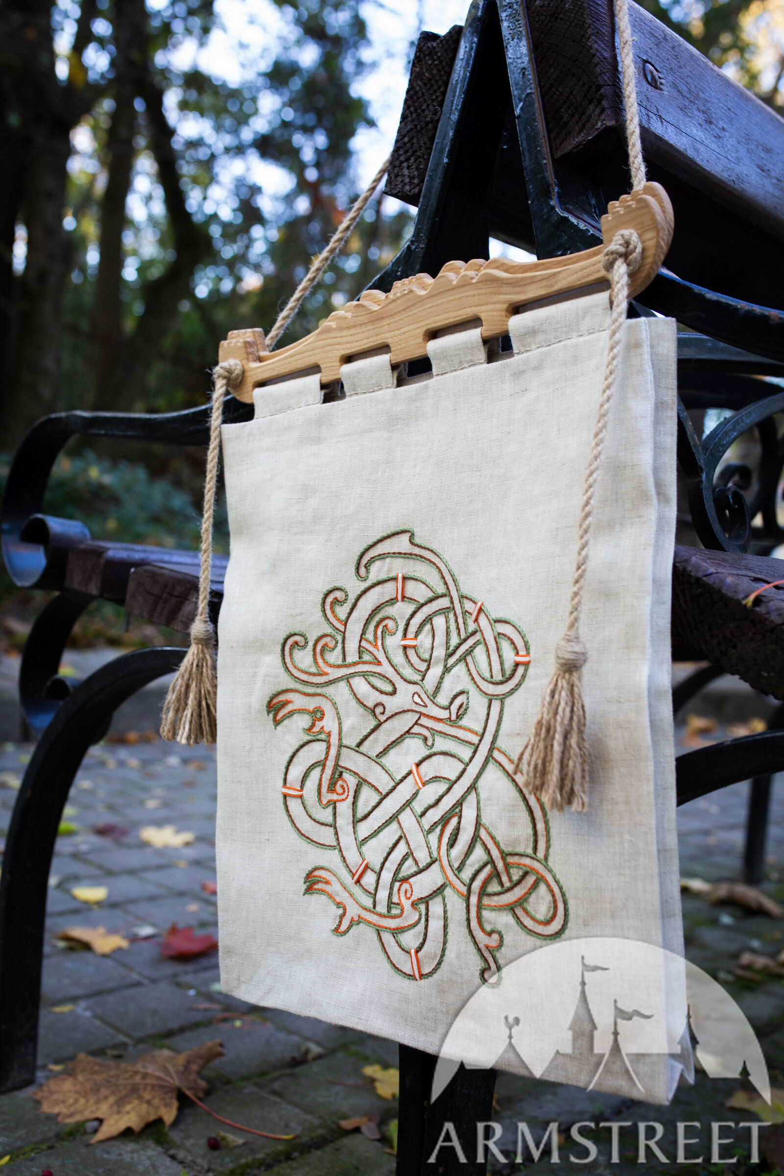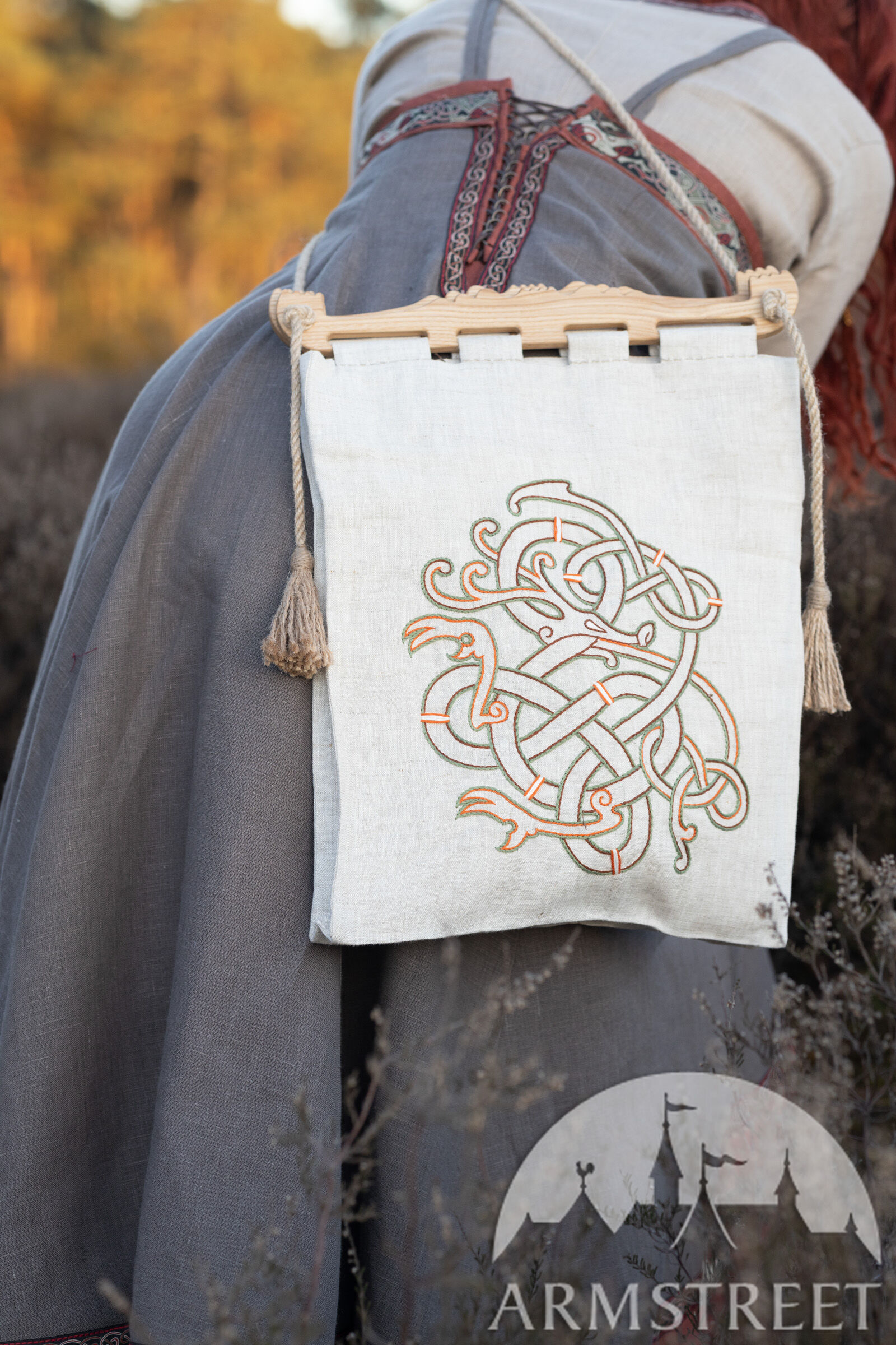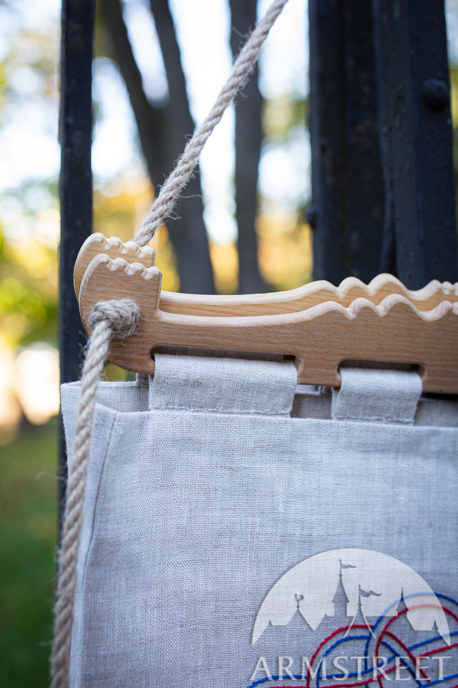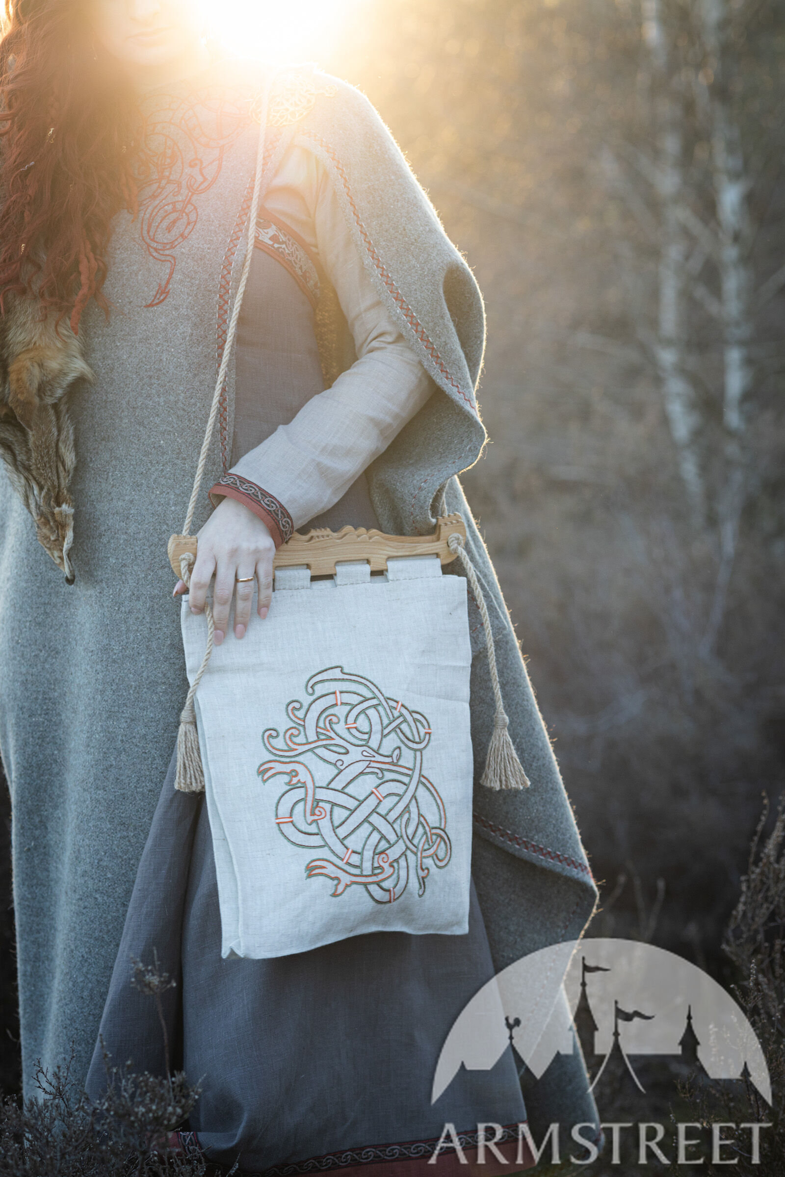 Wir haben diese neue Linie von Wikinger-Accessoires mit einem Rahmen aus massivem Eschenholz auf den Markt gebracht, der nur mit Öl behandelt wurde, um ihn vor Witterungseinflüssen zu schützen und Haltbarkeit zu gewährleisten. Die Wikinger verwendeten jedoch aufwendige Holzbearbeitungstechniken, um den Rahmen mit Schnitzereien zu verzieren. Im Gegensatz zu Kiefernholz pfropft Esche nicht und kratzt nicht auf Ihrer Haut. Die Außenschicht der Tasche besteht aus strapazierfähigem Leinen, verziert mit handgefertigten Stickereien mit Wolfs- oder Wasserdrachenmustern, passend zu Ihren vorhandenen Wikinger-Outfits von ArmStreet. Die Riemen am oberen Rand der Hedeby-Tasche sind um die Löcher in einem „Stuhlrücken“-Griff geschlungen und mit Handnähten verziert. Sie können den Hanfseilgriff mit einfachen Knoten ganz einfach an Ihre Körpergröße und Vorlieben anpassen. Sobald Sie die Tasche anziehen, verschließt der Seilgriff die Taschenöffnung fest, indem er zwei Teile des Holzrahmens zusammenzieht, um alle Ihre Wertsachen sicher aufzubewahren, egal wie aktiv Ihr mittelalterlicher Alltag ist. Ein Vollfutter in natürlicher Farbe bietet Ihren Sachen zusätzlichen Schutz.
