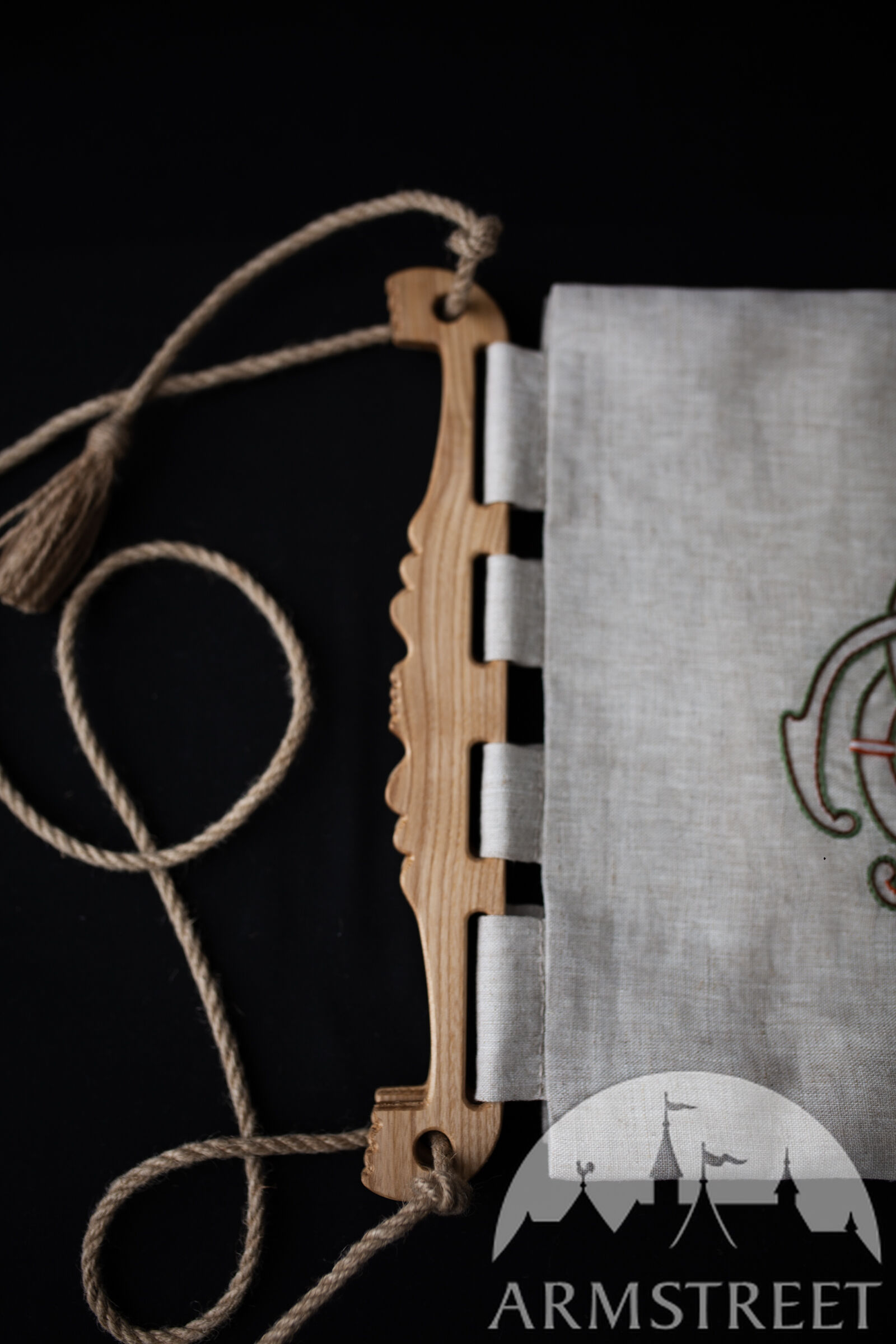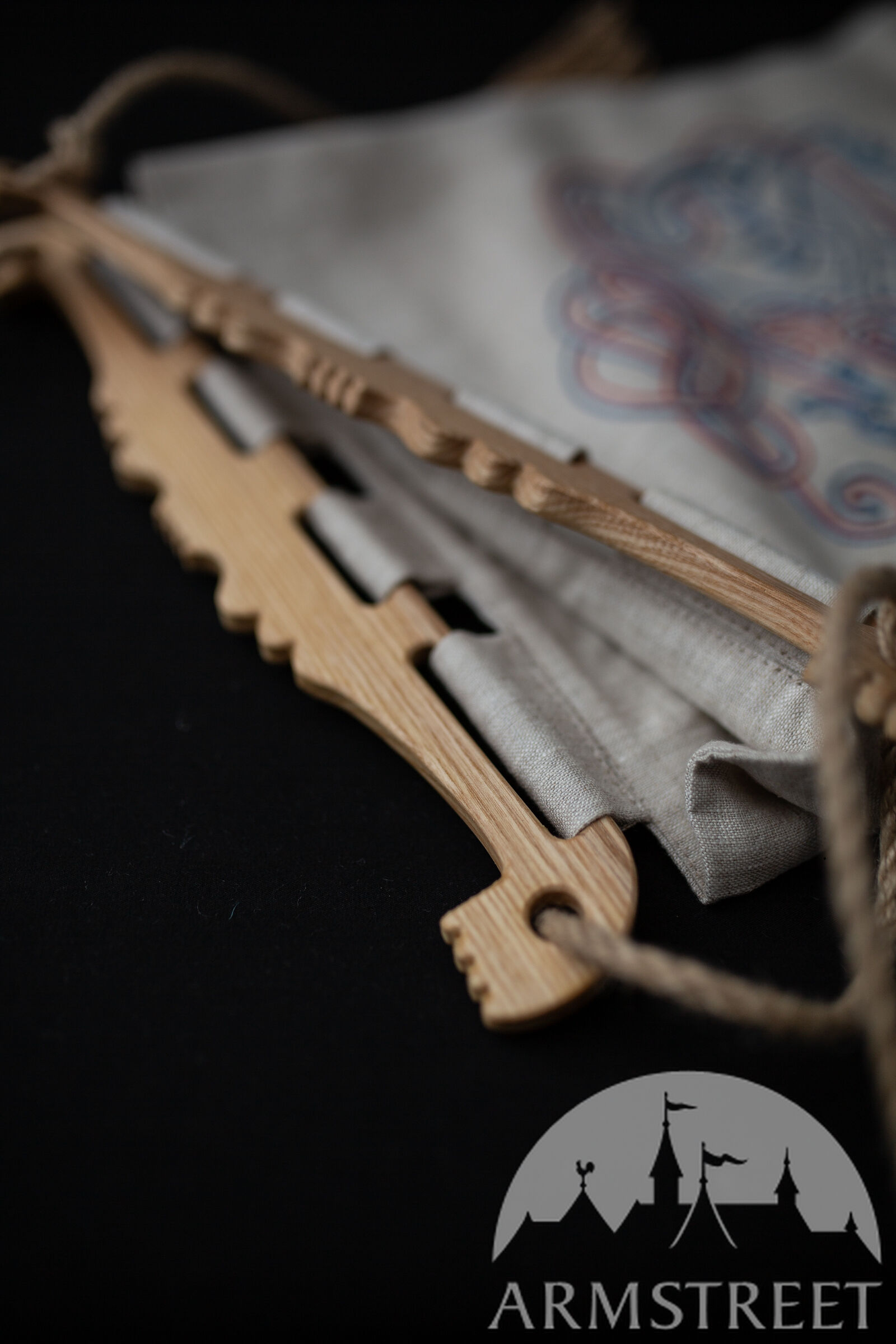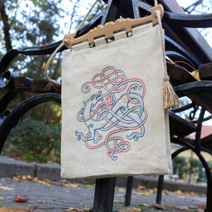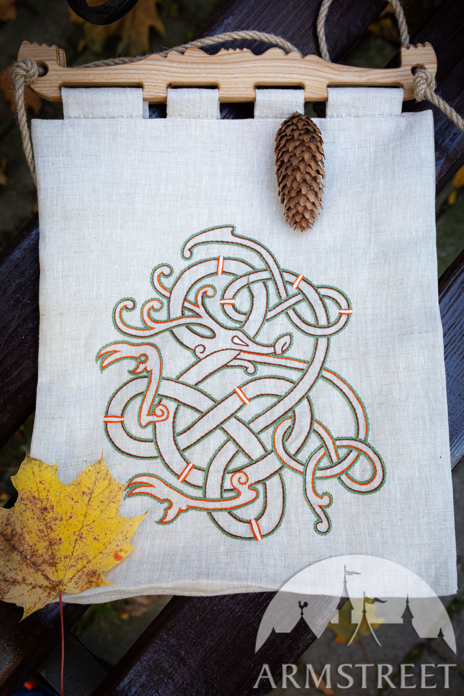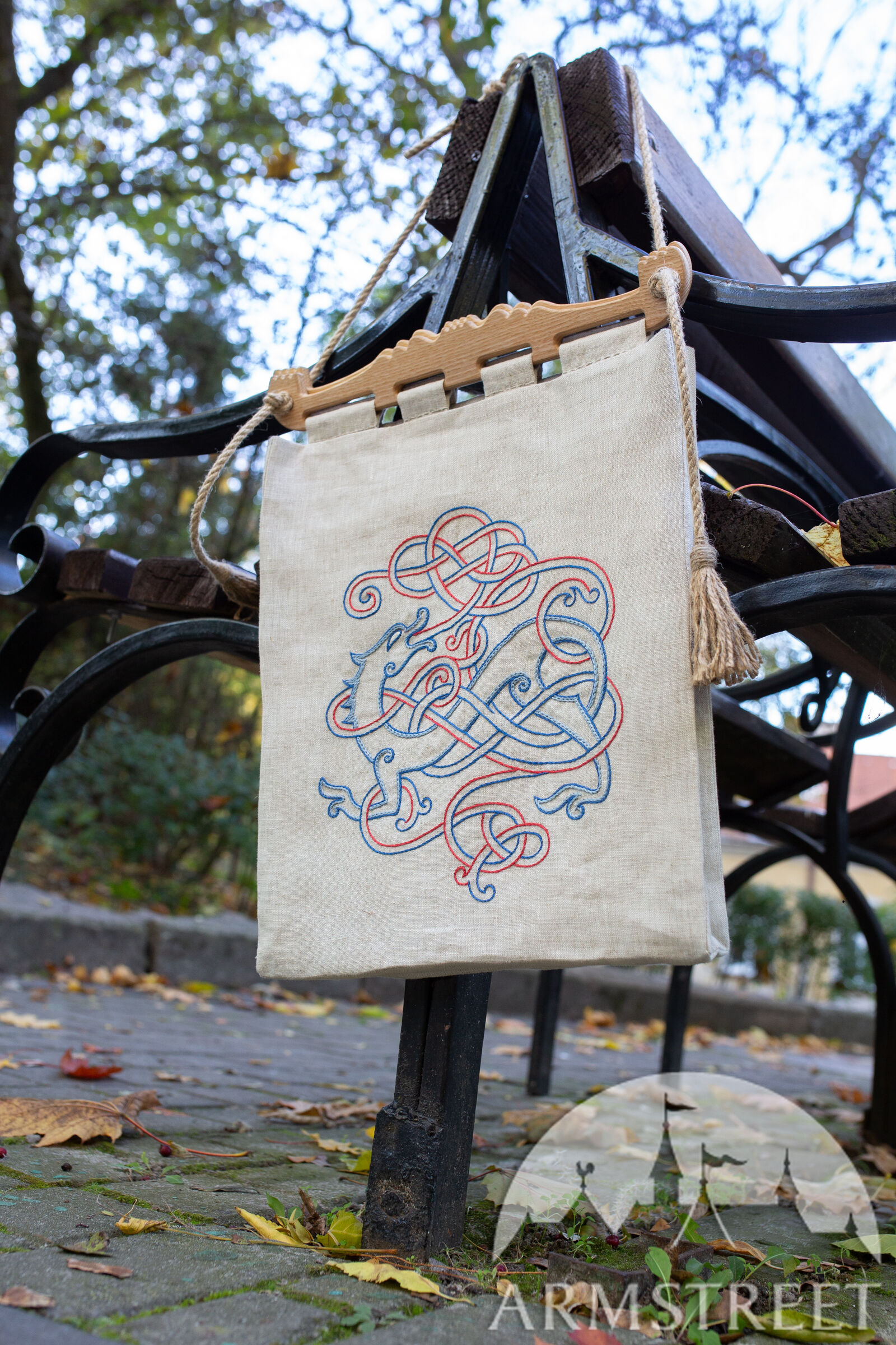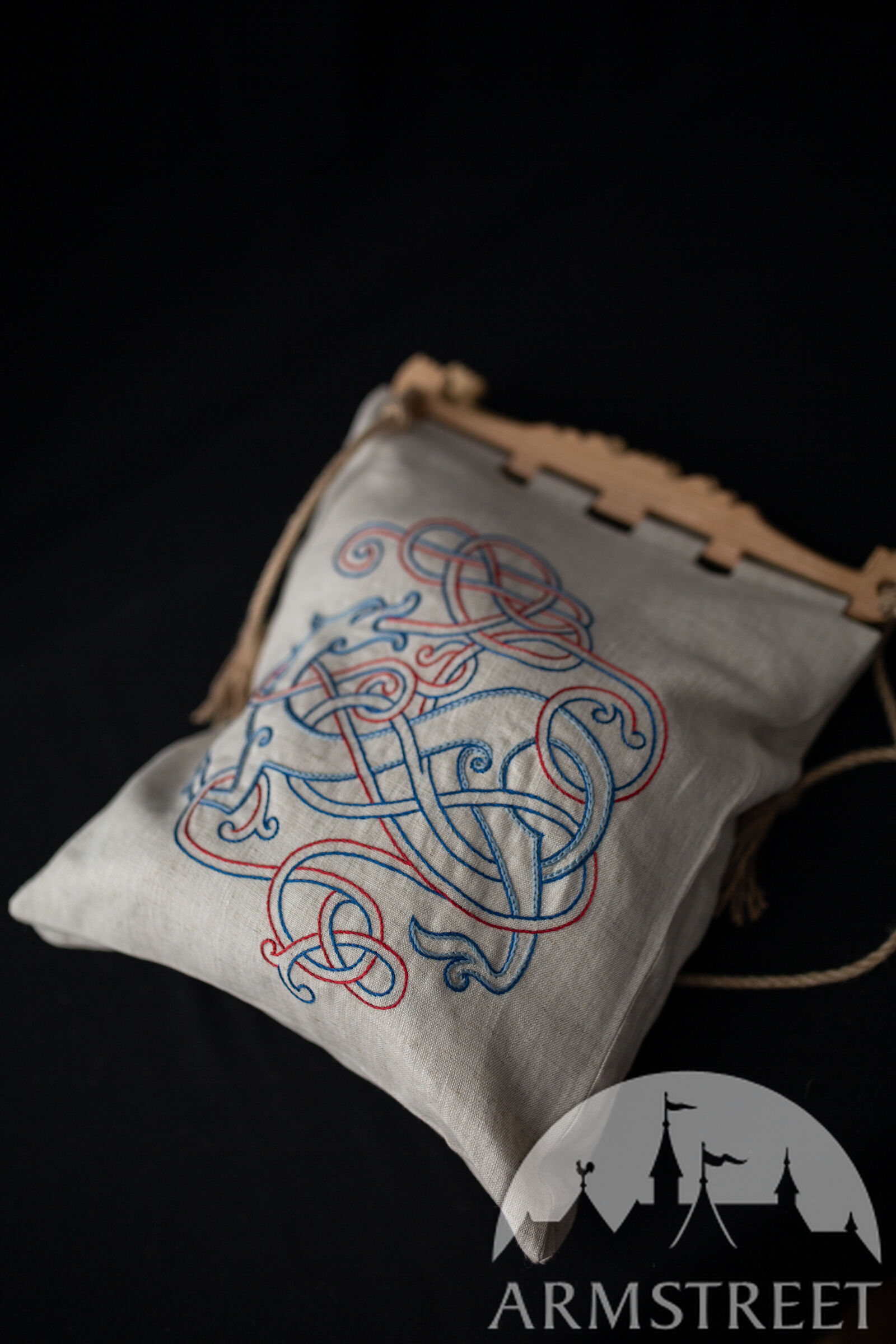 Wir haben diese neue Linie von Wikinger-Accessoires mit einem Rahmen aus massivem Eschenholz auf den Markt gebracht, der nur mit Öl behandelt wurde, um ihn vor Witterungseinflüssen zu schützen und Haltbarkeit zu gewährleisten. Die Wikinger verwendeten jedoch aufwendige Holzbearbeitungstechniken, um den Rahmen mit Schnitzereien zu verzieren. Im Gegensatz zu Kiefernholz pfropft Esche nicht und kratzt nicht auf Ihrer Haut. Die Außenschicht der Tasche besteht aus strapazierfähigem Leinen, verziert mit handgefertigten Stickereien mit Wolfs- oder Wasserdrachenmustern, passend zu Ihren vorhandenen Wikinger-Outfits von ArmStreet. Die Riemen am oberen Rand der Hedeby-Tasche sind um die Löcher in einem „Stuhlrücken“-Griff geschlungen und mit Handnähten verziert. Sie können den Hanfseilgriff mit einfachen Knoten ganz einfach an Ihre Körpergröße und Vorlieben anpassen. Sobald Sie die Tasche anziehen, verschließt der Seilgriff die Taschenöffnung fest, indem er zwei Teile des Holzrahmens zusammenzieht, um alle Ihre Wertsachen sicher aufzubewahren, egal wie aktiv Ihr mittelalterlicher Alltag ist. Ein Vollfutter in natürlicher Farbe bietet Ihren Sachen zusätzlichen Schutz.
