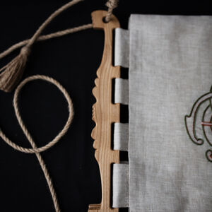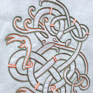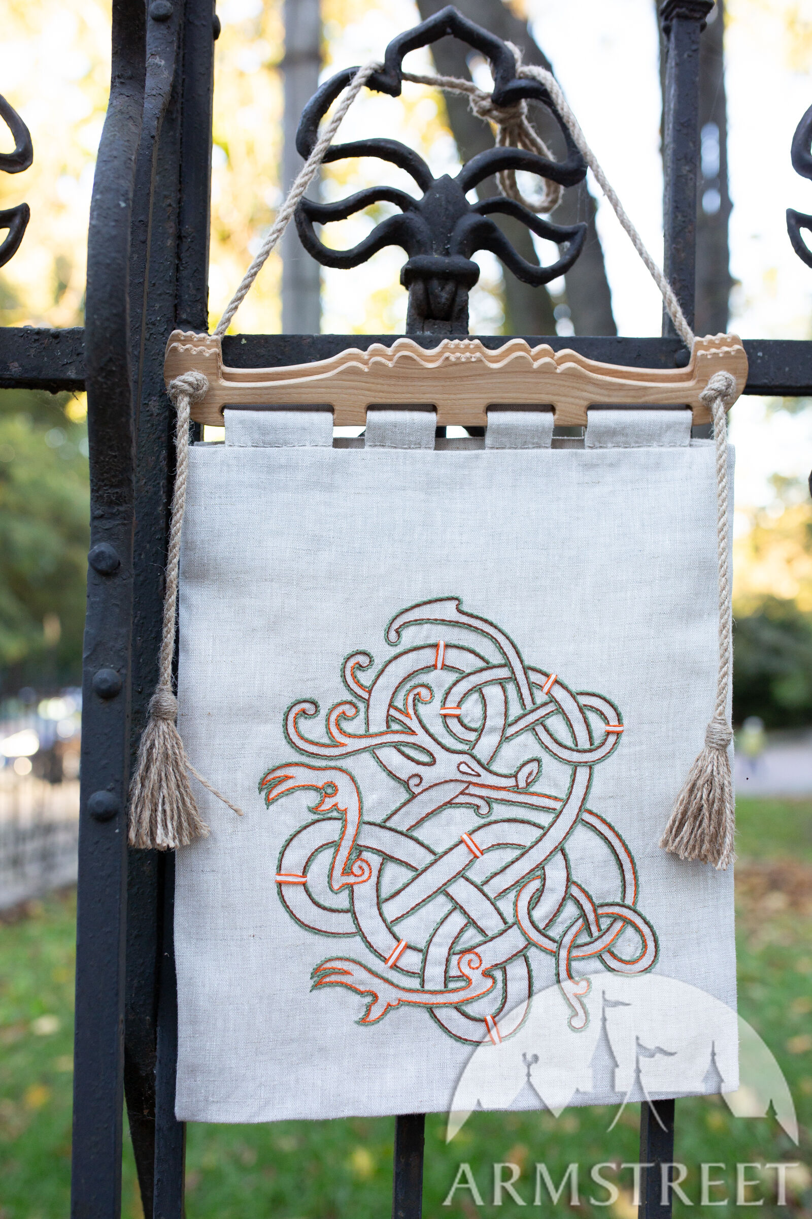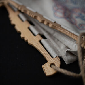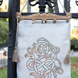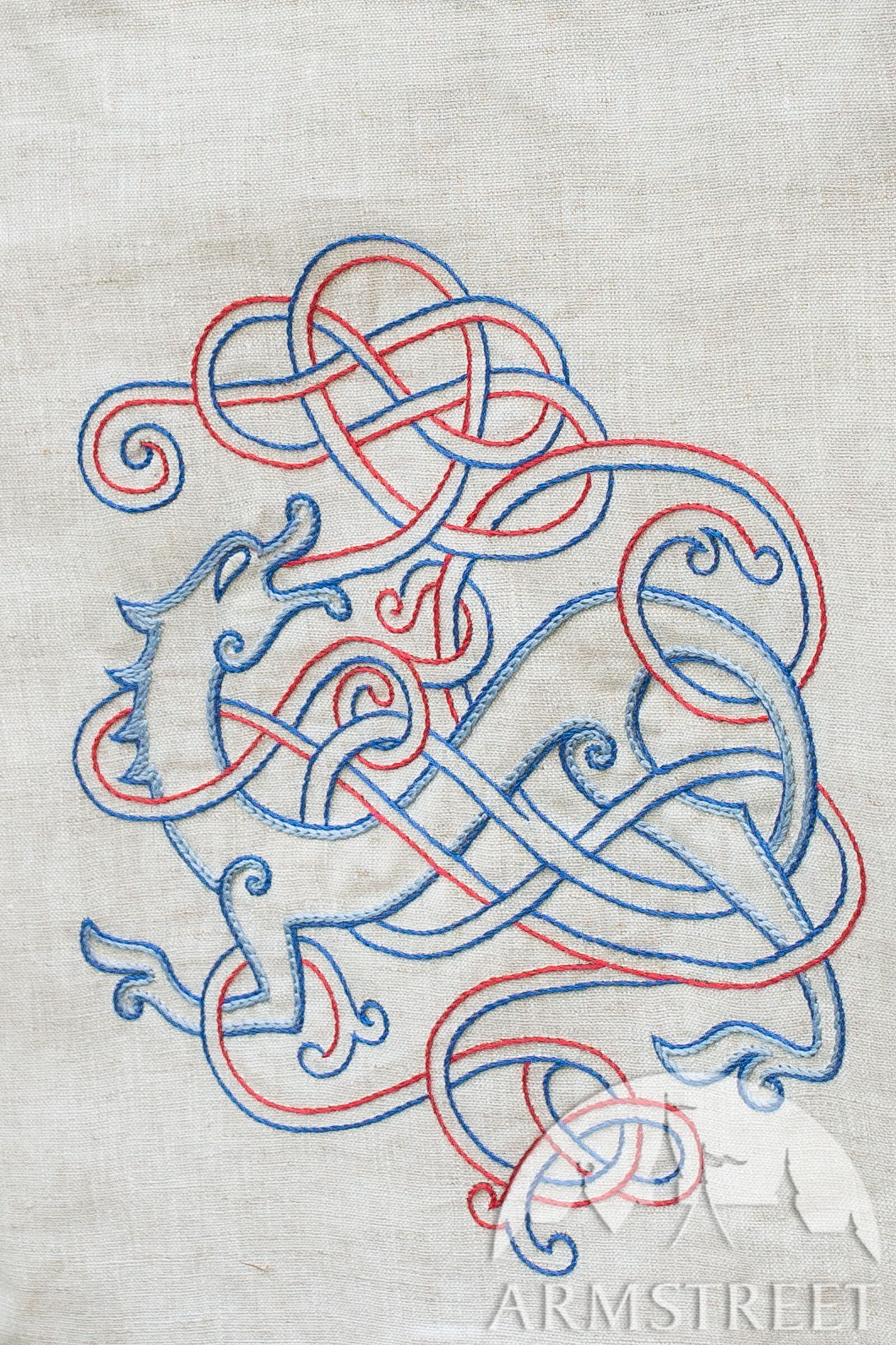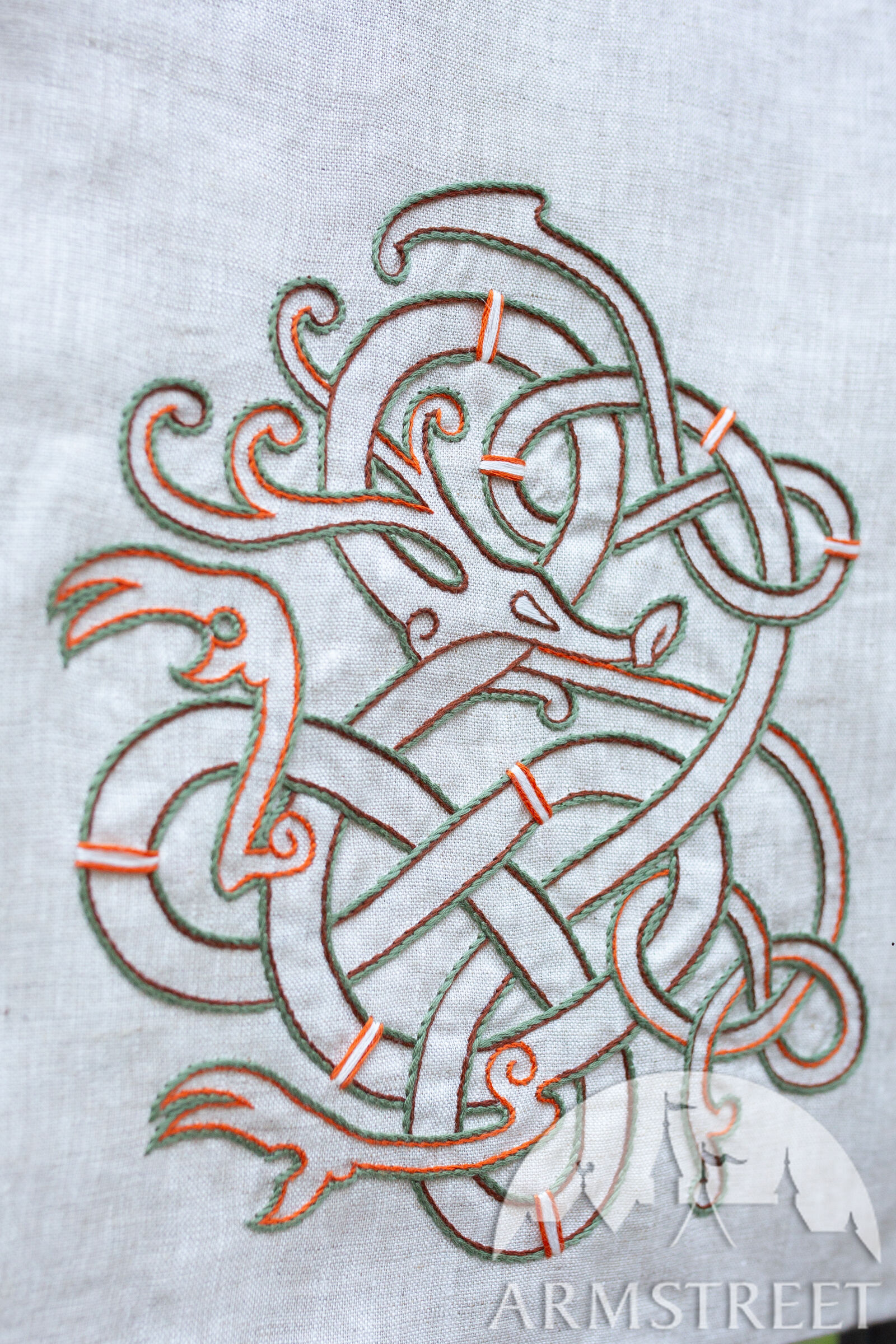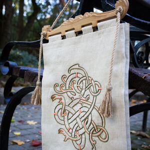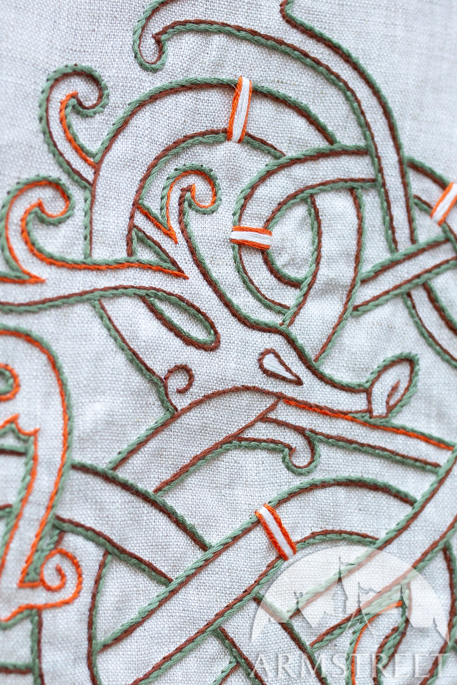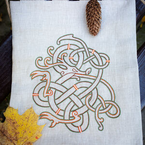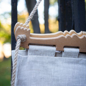 Wir haben diese neue Linie von Wikinger-Accessoires mit einem Rahmen aus massivem Eschenholz auf den Markt gebracht, der nur mit Öl behandelt wurde, um ihn vor Witterungseinflüssen zu schützen und Haltbarkeit zu gewährleisten. Die Wikinger verwendeten jedoch aufwendige Holzbearbeitungstechniken, um den Rahmen mit Schnitzereien zu verzieren. Im Gegensatz zu Kiefernholz pfropft Esche nicht und kratzt nicht auf Ihrer Haut. Die Außenschicht der Tasche besteht aus strapazierfähigem Leinen, verziert mit handgefertigten Stickereien mit Wolfs- oder Wasserdrachenmustern, passend zu Ihren vorhandenen Wikinger-Outfits von ArmStreet. Die Riemen am oberen Rand der Hedeby-Tasche sind um die Löcher in einem „Stuhlrücken“-Griff geschlungen und mit Handnähten verziert. Sie können den Hanfseilgriff mit einfachen Knoten ganz einfach an Ihre Körpergröße und Vorlieben anpassen. Sobald Sie die Tasche anziehen, verschließt der Seilgriff die Taschenöffnung fest, indem er zwei Teile des Holzrahmens zusammenzieht, um alle Ihre Wertsachen sicher aufzubewahren, egal wie aktiv Ihr mittelalterlicher Alltag ist. Ein Vollfutter in natürlicher Farbe bietet Ihren Sachen zusätzlichen Schutz.