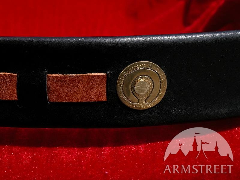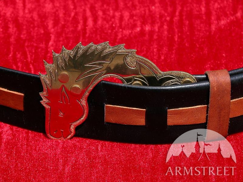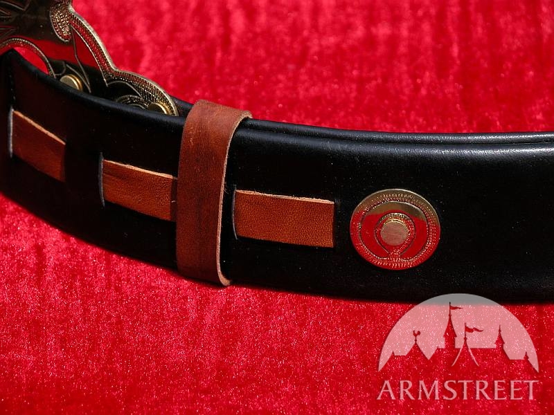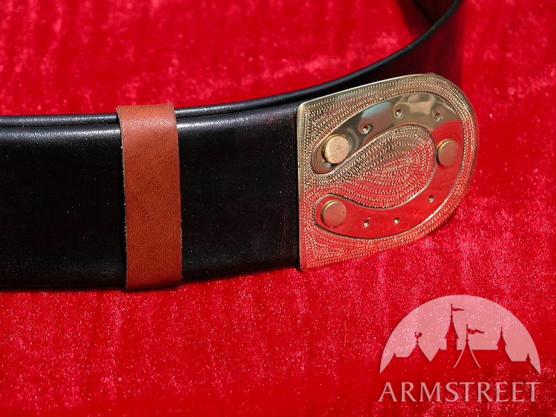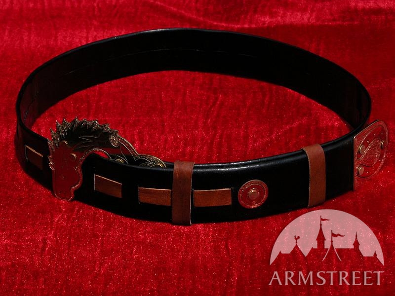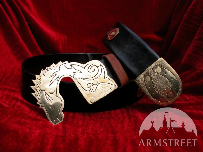 Handgefertigter, schwerer mittelalter LARP Gürtel mit handgeschmiedeten Messingverzierungen und sehr ungewöhnllichen Schliessen. Wunderbare Ergänzung für jedes mittelalter Gewand oder Kostüme, aber auch als Gürtel für jeden Tag verwendbar. Aus festem, echtem Leder in hervorragender Qualität gefertigt. Mittelalter Gürtel und Messingornamente sind komplett handgefertigt. Maße: Länge - 106,6 cm + 5,08 cm, Breite - 3,8 cm.