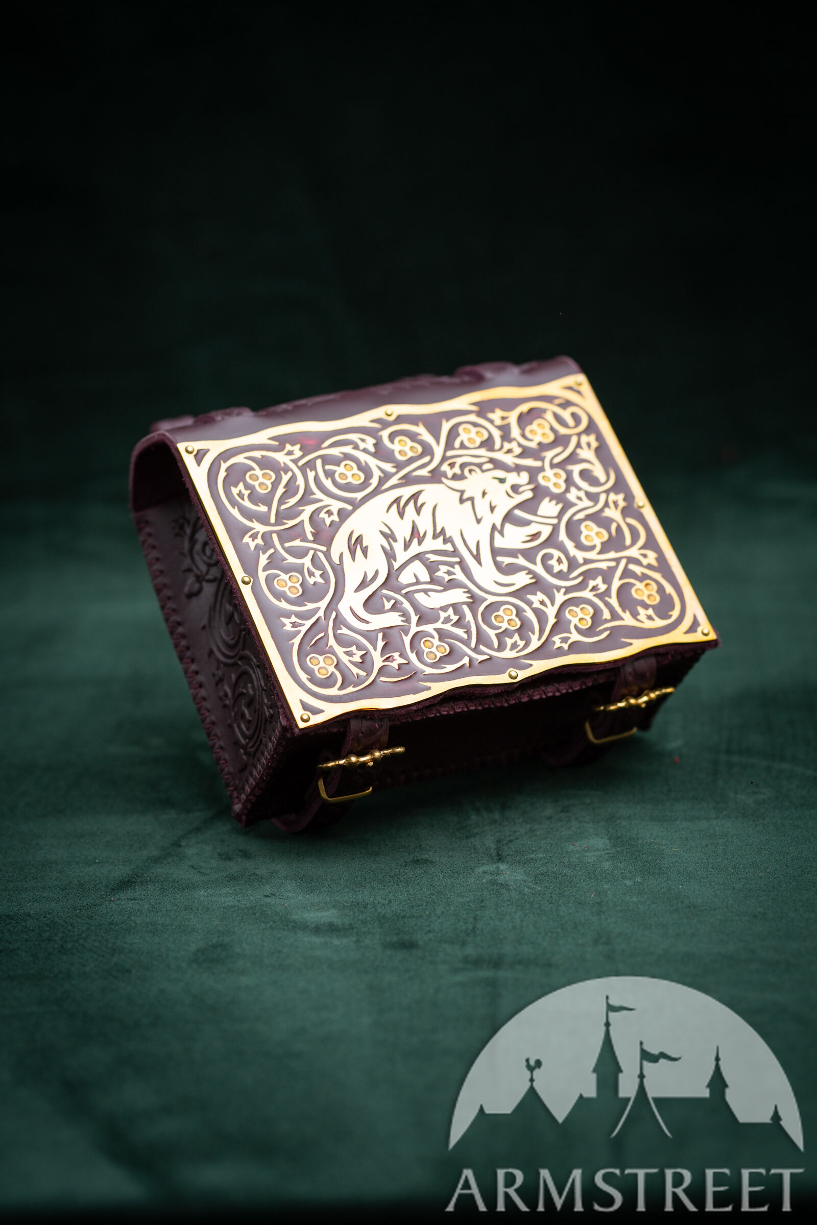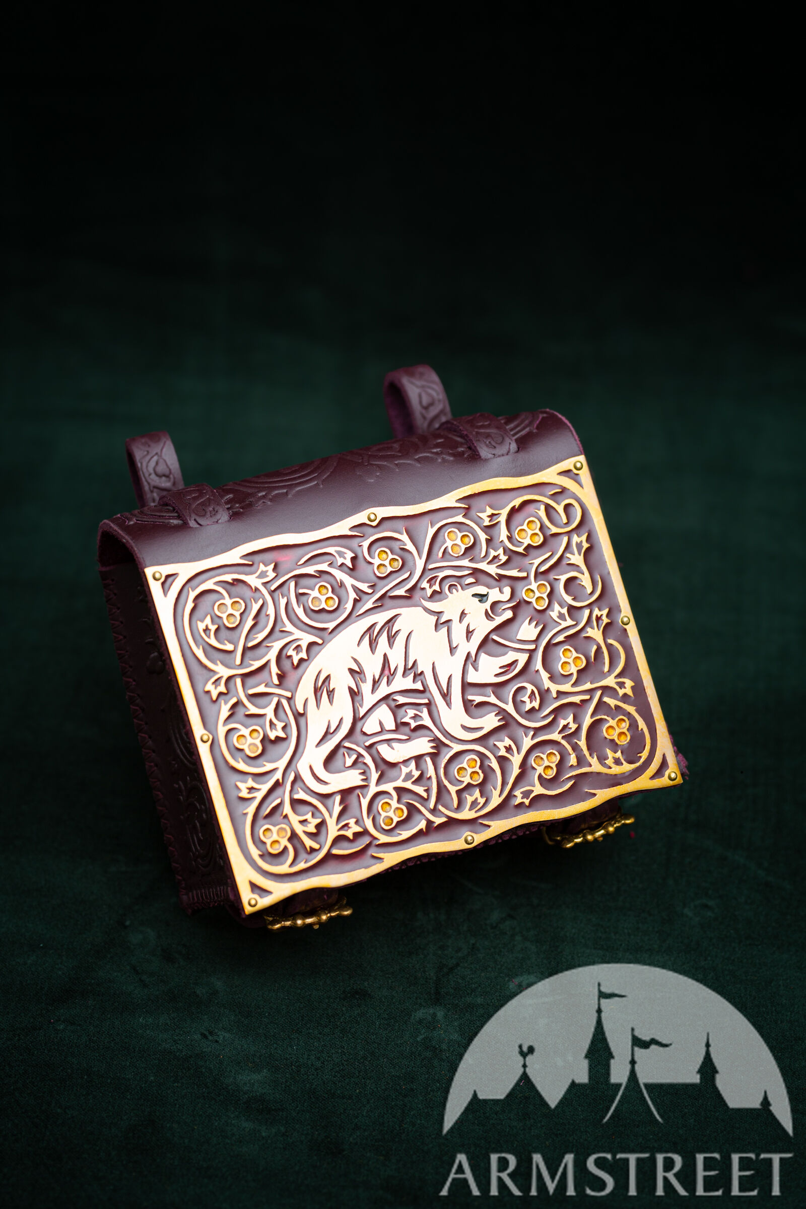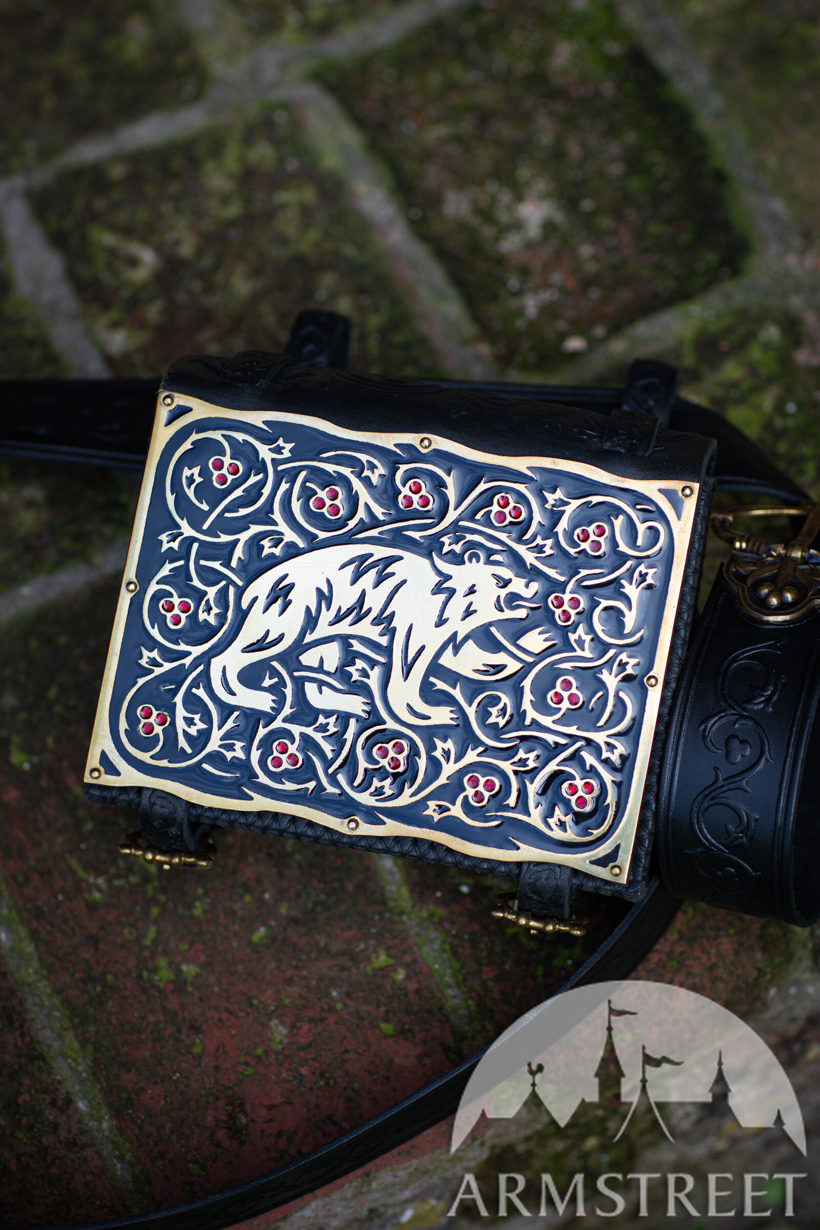 Willkommen, das neue Accessoire! Es bereitet allen, die Bären auf ihrer Kleidung oder anderen Accessoires lieben, Freude und ein „Endlich!“. Hier ist er, der wilde Bär, in Messing geätzt und mit Emaille verziert. Um das Tier herum, sowohl auf dem Messingpaneel als auch auf dem Leder selbst, sind wunderschön florale Muster angeordnet. Diese mittelalterliche Tasche ist deutlich raffinierter und edler als ein gewöhnlicher Beutel und passt perfekt zu einer edlen Persönlichkeit oder einem Ritter.