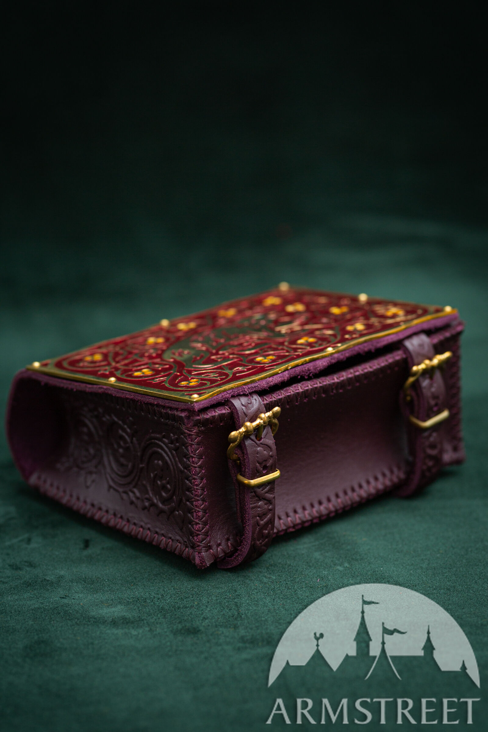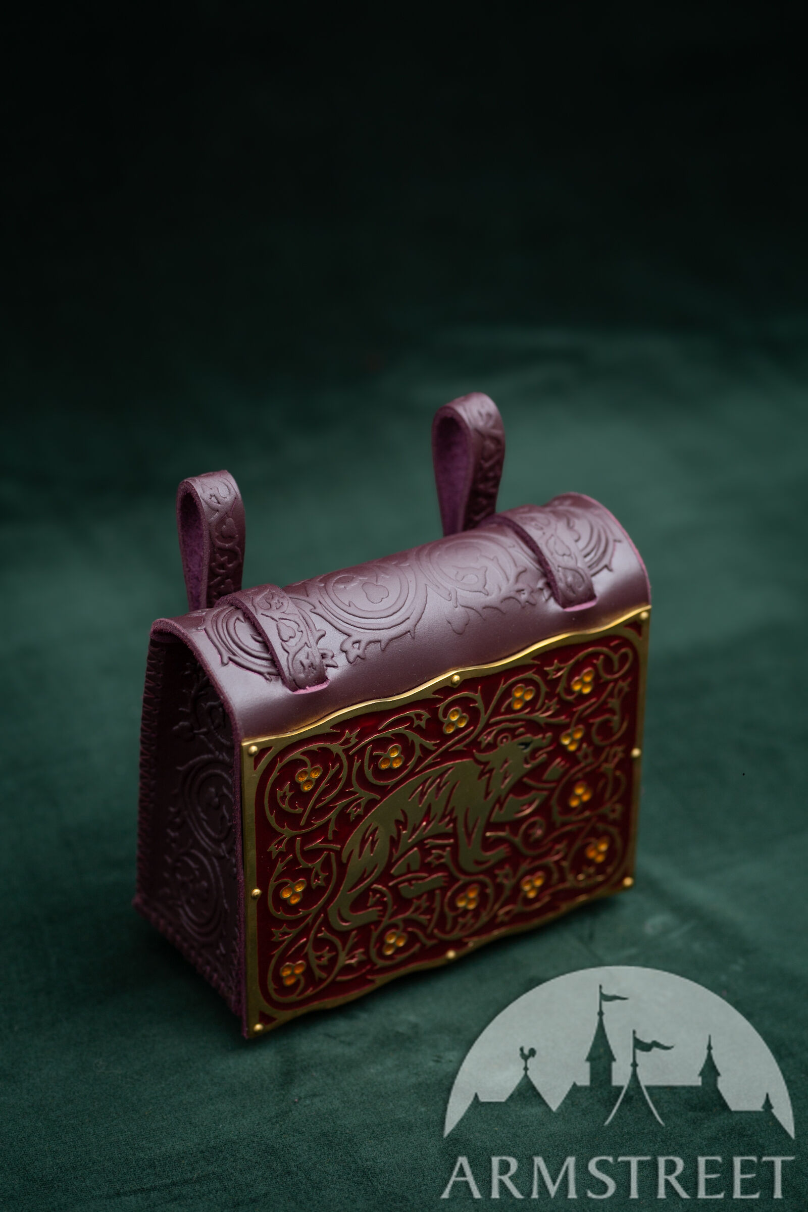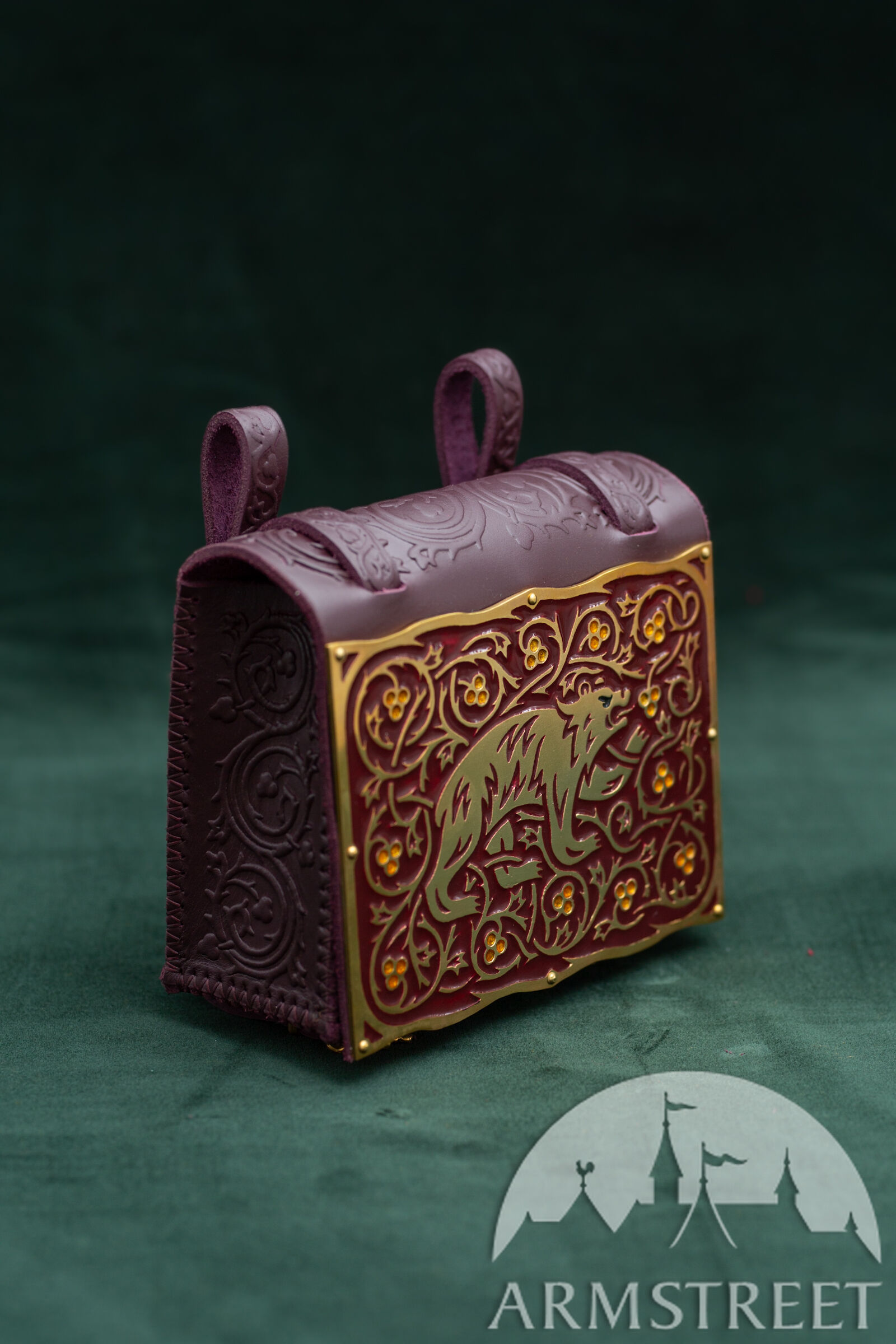 Willkommen, das neue Accessoire! Es bereitet allen, die Bären auf ihrer Kleidung oder anderen Accessoires lieben, Freude und ein „Endlich!“. Hier ist er, der wilde Bär, in Messing geätzt und mit Emaille verziert. Um das Tier herum, sowohl auf dem Messingpaneel als auch auf dem Leder selbst, sind wunderschön florale Muster angeordnet. Diese mittelalterliche Tasche ist deutlich raffinierter und edler als ein gewöhnlicher Beutel und passt perfekt zu einer edlen Persönlichkeit oder einem Ritter.