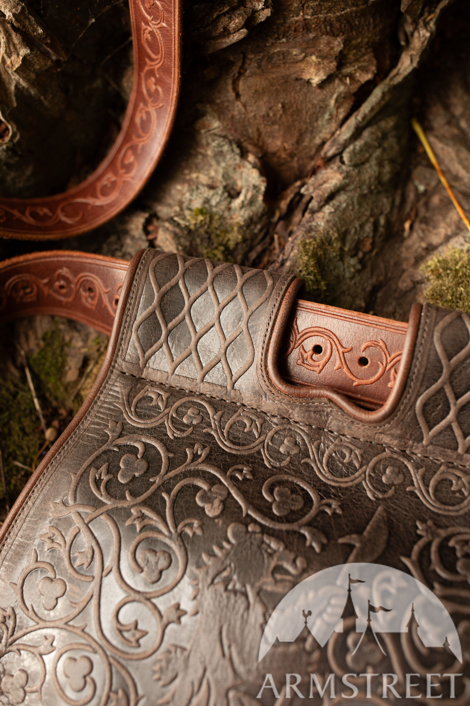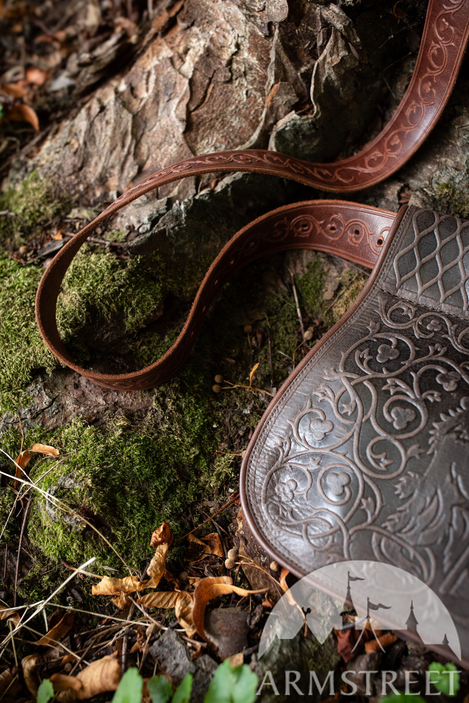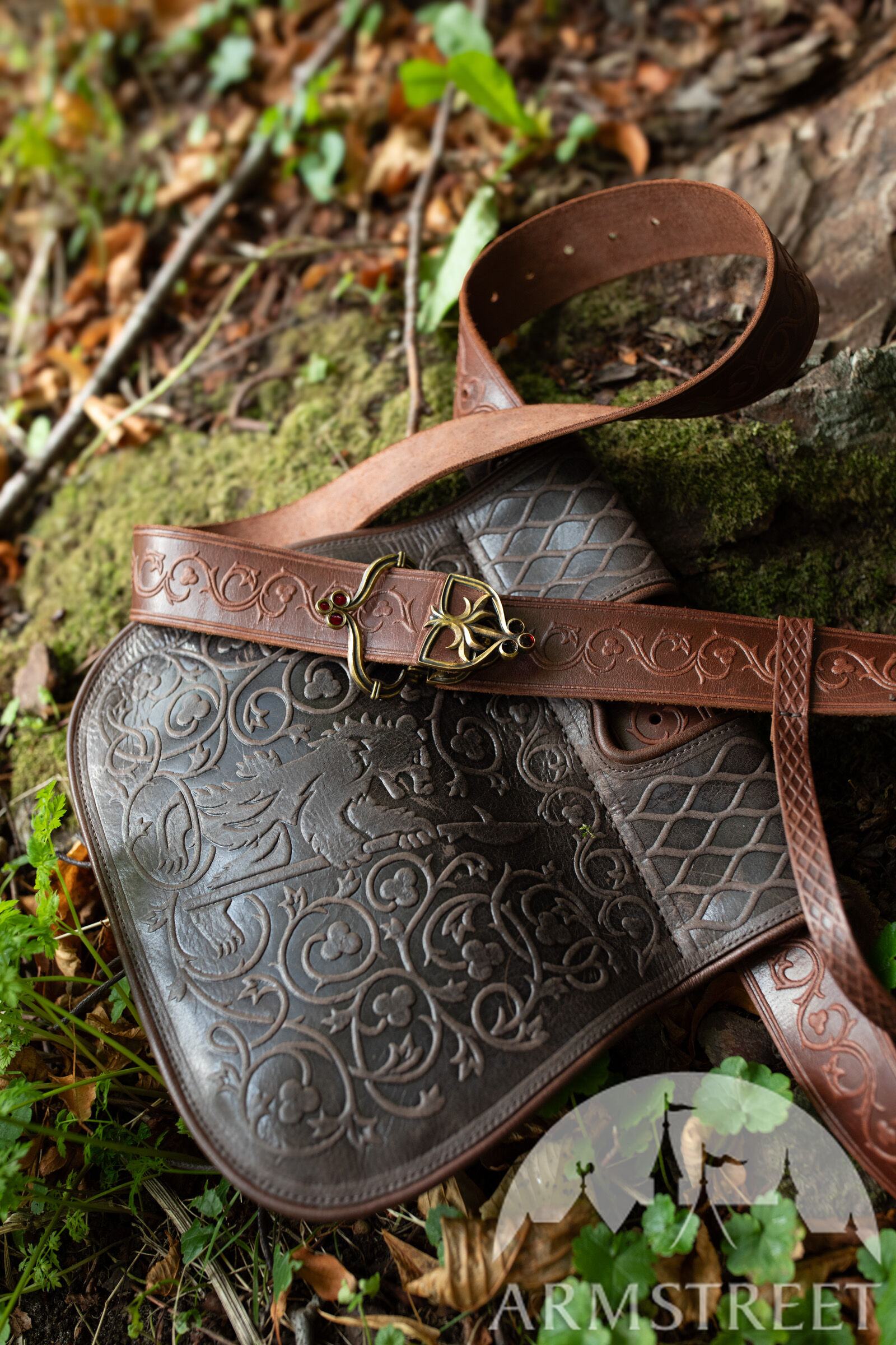 Die Prägung auf der Klappe zeigt einen Bären, umgeben von floralen Ornamenten. Um die Tasche besser mit den Accessoires der Kollektion „Zeitloses Mittelalter“ zu kombinieren, wird die Hauptprägung von geometrischen Mustern auf den Gürtelschlaufen begleitet. Wie bei vielen anderen Kreationen in unserem Shop basieren diese Motive nicht auf einer historischen Vorlage, sondern sind das Ergebnis der Arbeit unseres Designteams. Sie wurden von mittelalterlichen Funden inspiriert und fügen sich daher perfekt in die Garderobe der SCA-Persönlichkeit ein.
