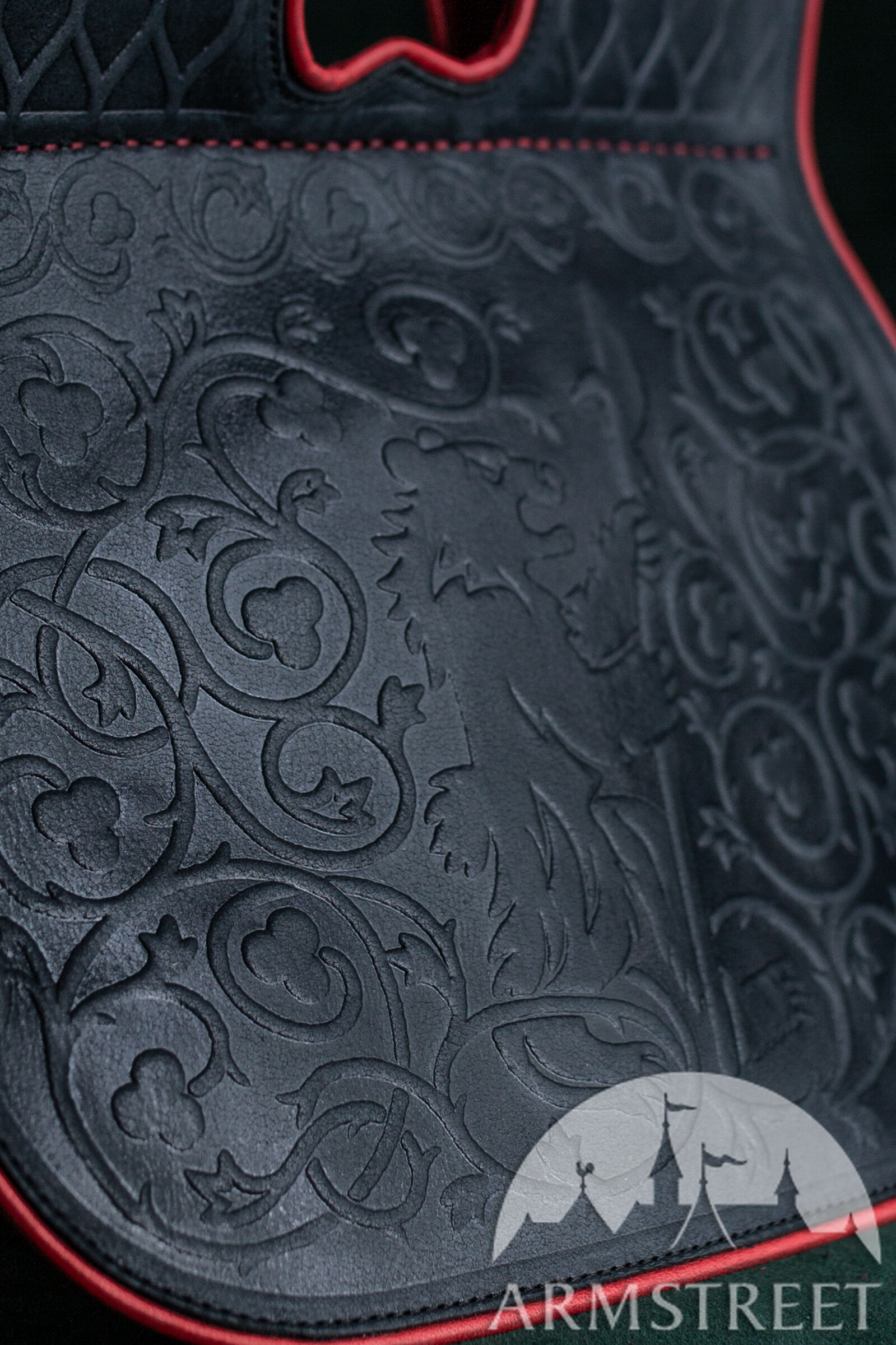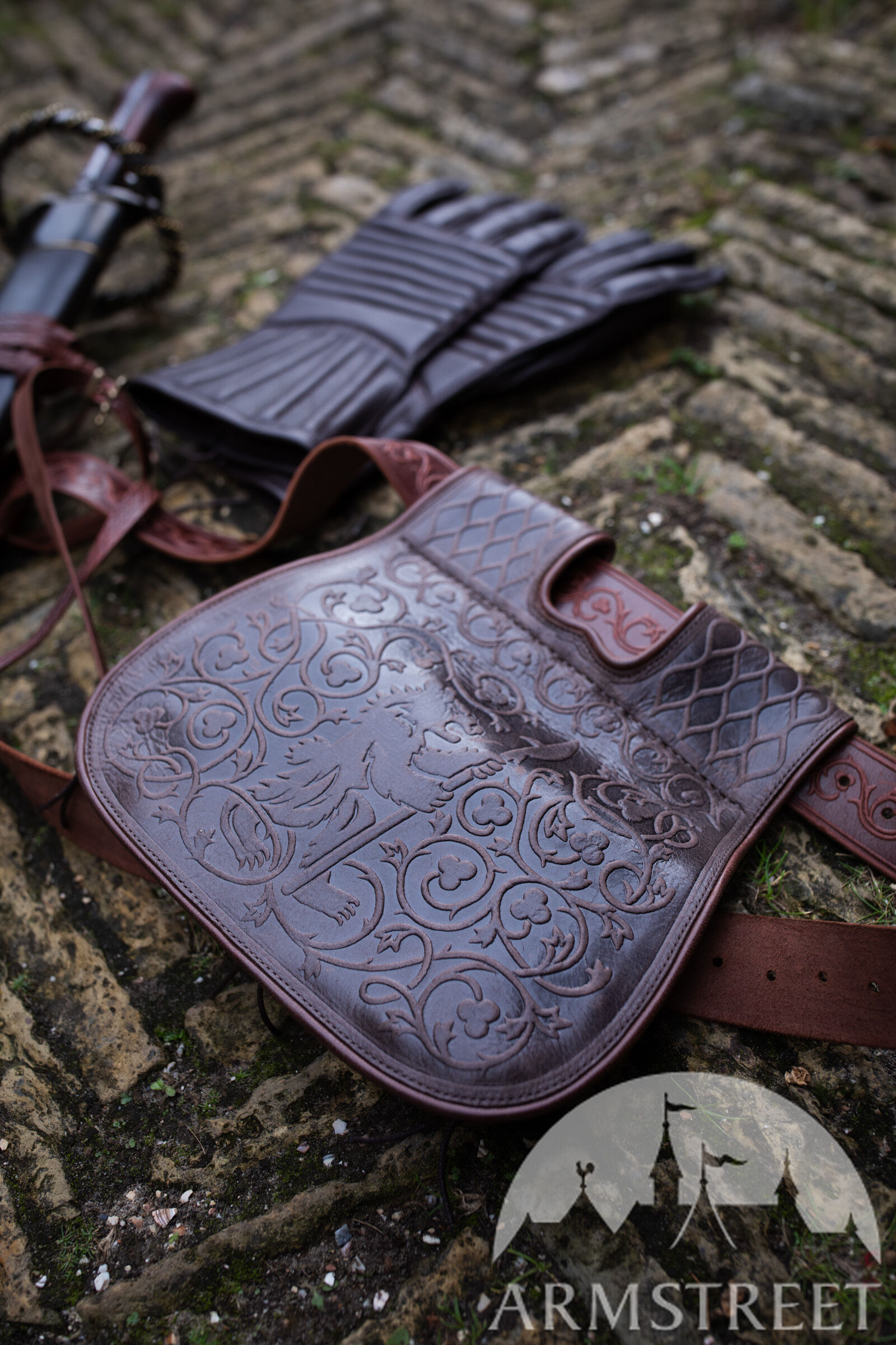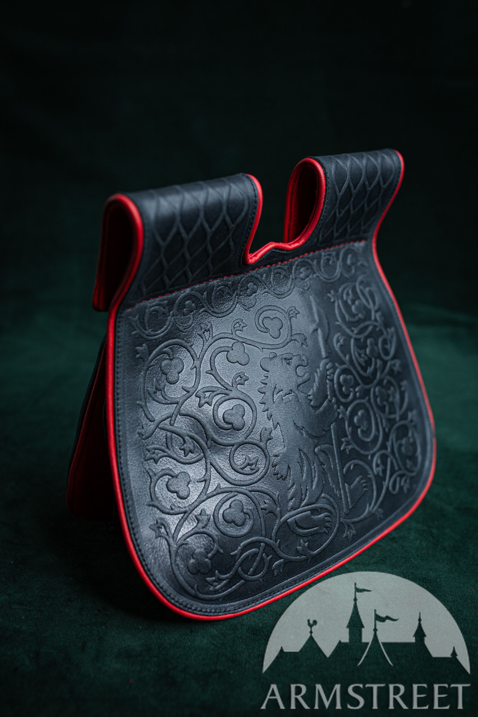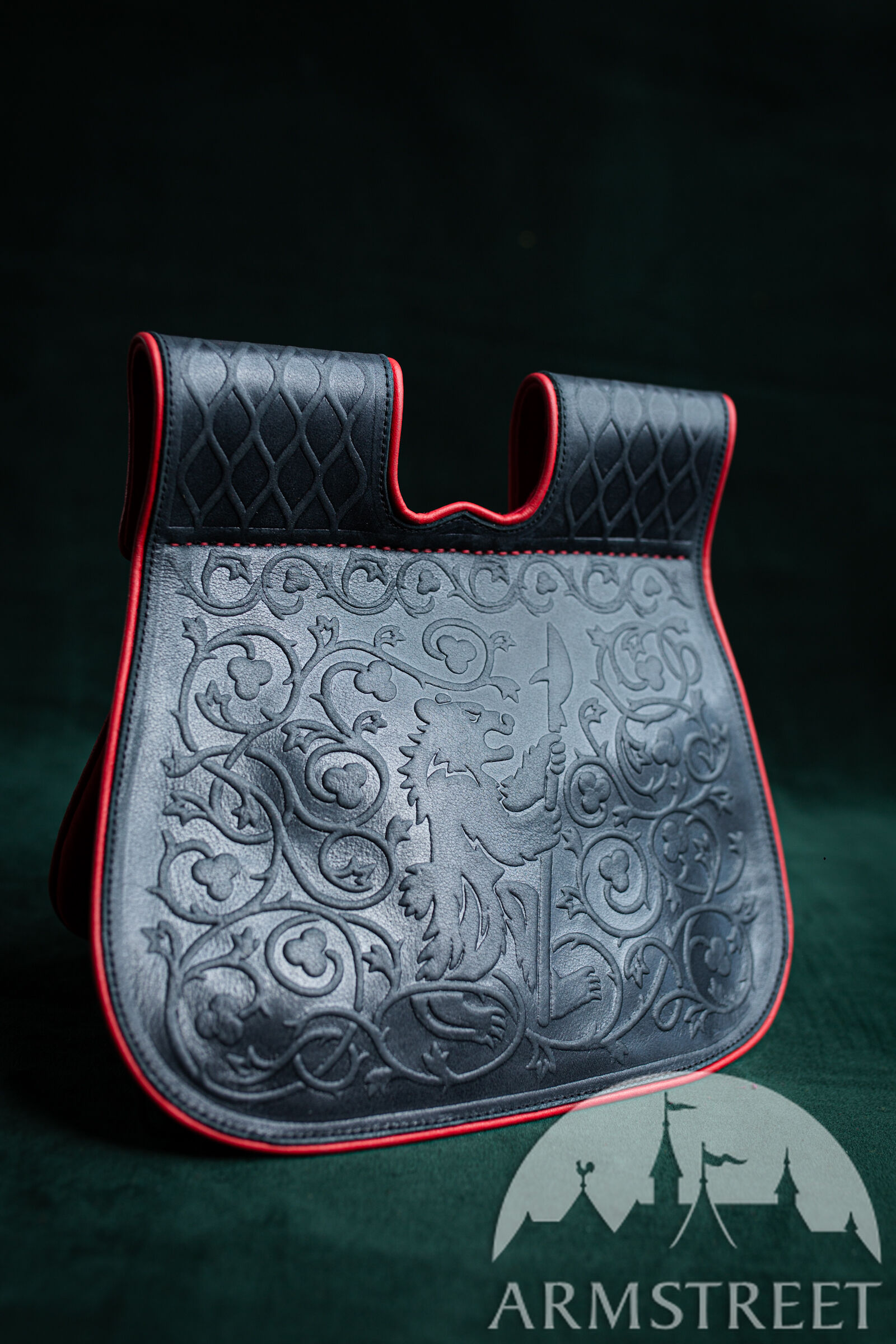 Die Prägung auf der Klappe zeigt einen Bären, umgeben von floralen Ornamenten. Um die Tasche besser mit den Accessoires der Kollektion „Zeitloses Mittelalter“ zu kombinieren, wird die Hauptprägung von geometrischen Mustern auf den Gürtelschlaufen begleitet. Wie bei vielen anderen Kreationen in unserem Shop basieren diese Motive nicht auf einer historischen Vorlage, sondern sind das Ergebnis der Arbeit unseres Designteams. Sie wurden von mittelalterlichen Funden inspiriert und fügen sich daher perfekt in die Garderobe der SCA-Persönlichkeit ein.