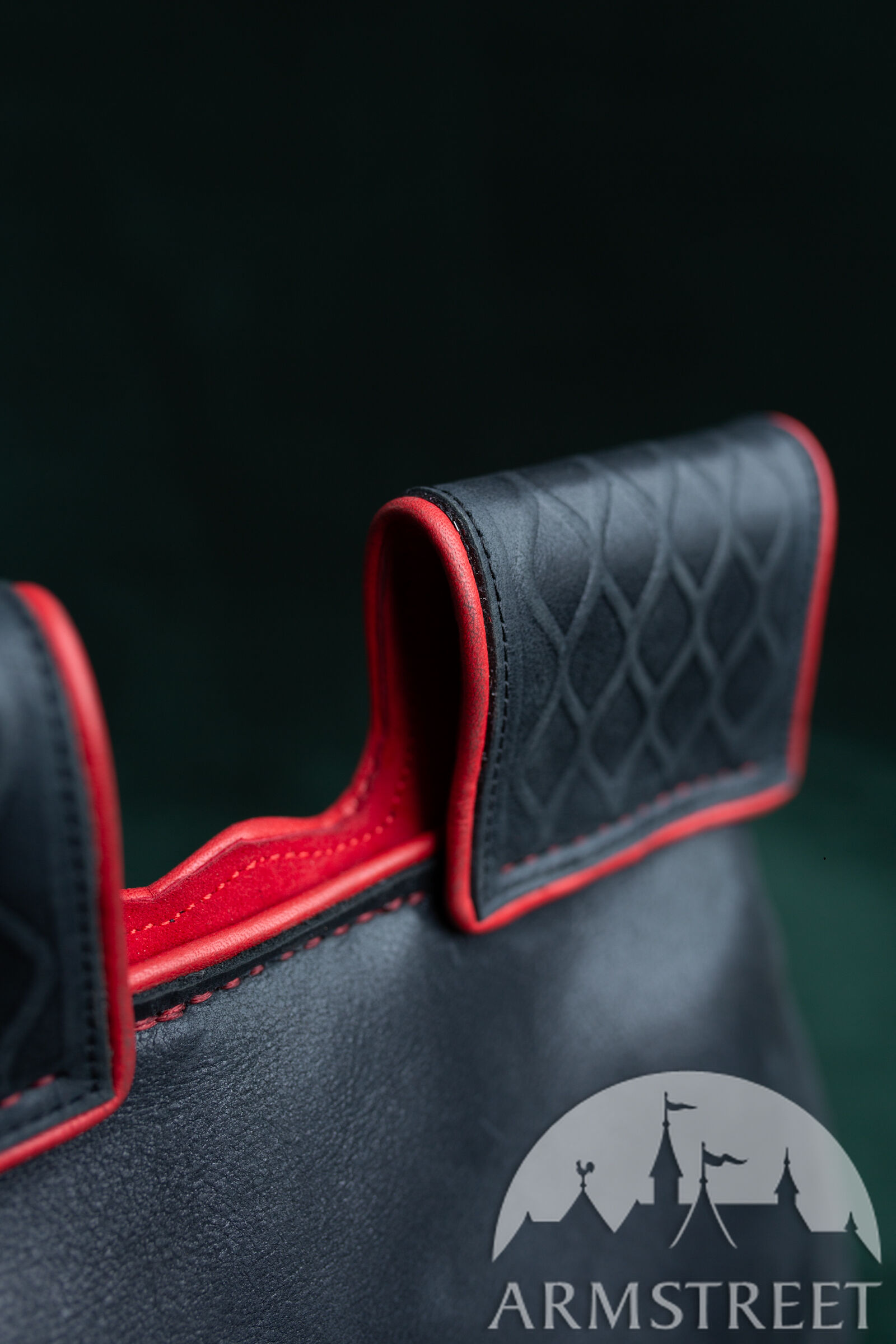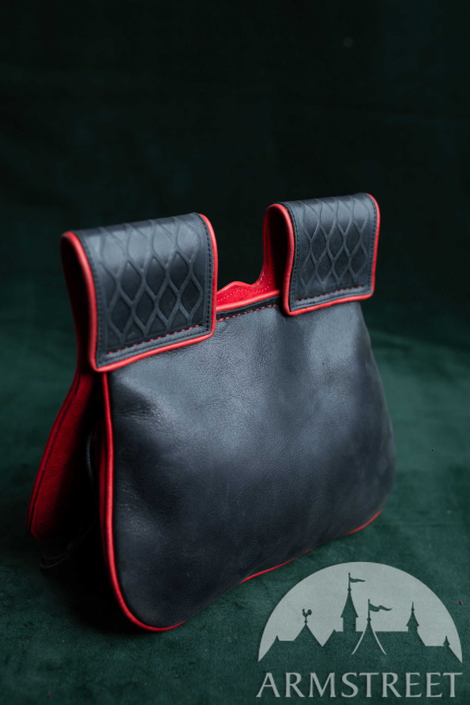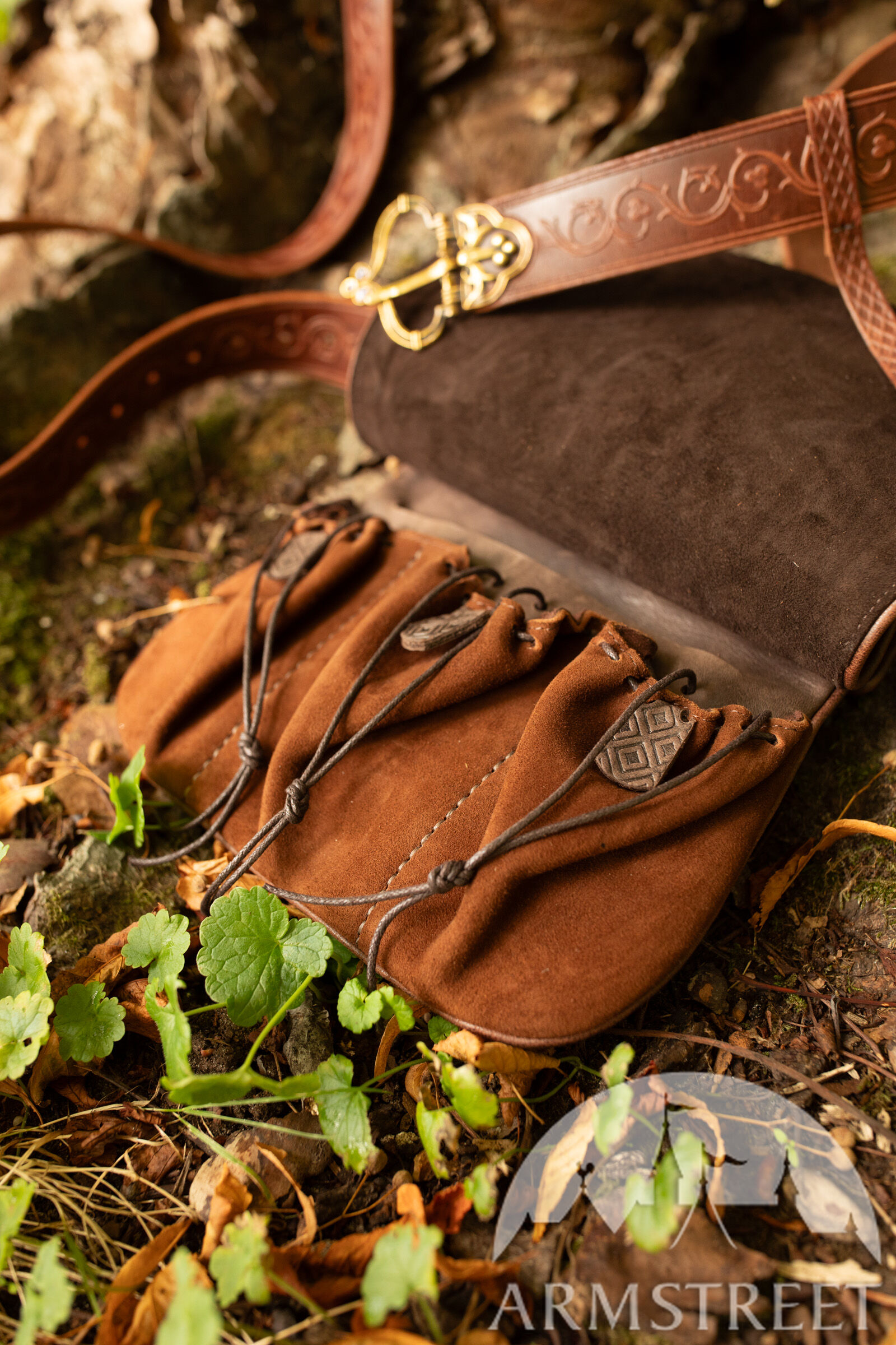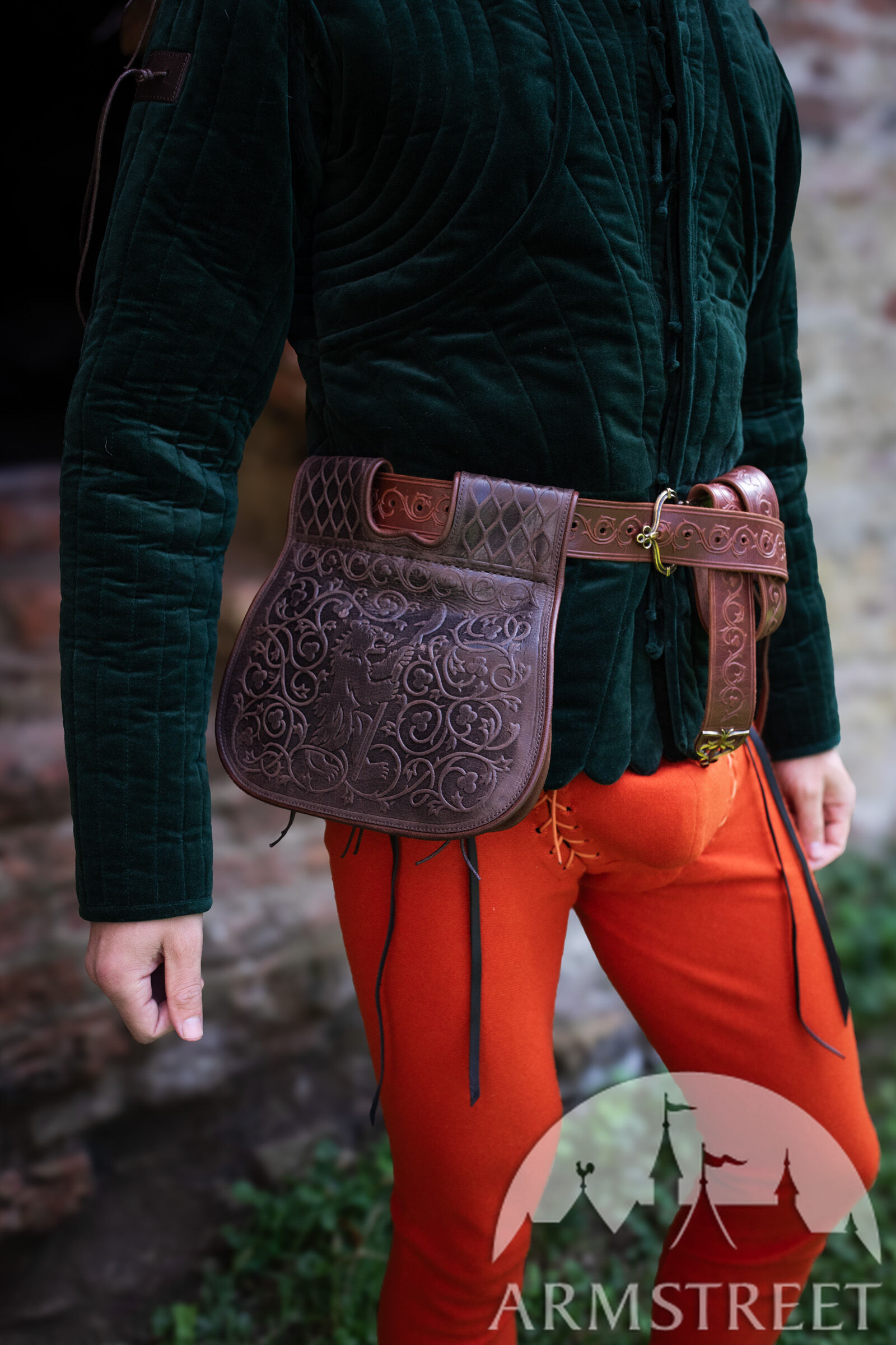 Moderne Kleidung hat glücklicherweise Taschen, doch im Mittelalter waren Taschen die einzige Möglichkeit, Schlüssel, Münzen und andere Wertgegenstände griffbereit aufzubewahren. Historische Funde zeigen die erstaunliche Vielfalt an Formen, Materialien und Tragemöglichkeiten dieser unverzichtbaren mittelalterlichen Accessoires. Diese besondere Ledertasche ist vom spätmittelalterlichen Stil inspiriert und passt zu vielen Charakteren. Es handelt sich um eine Gürteltasche, d. h. der Gürtel wird durch die Schlaufen oben an der Tasche geführt und etwa auf Hüfthöhe befestigt. Auch als „Nierentasche“ bezeichnet, wird sie üblicherweise mit dem 14. und 15. Jhdt in Verbindung gebracht. Damals wie heute war sie nicht nur ein praktisches Accessoire, sondern auch ein modisches Statement und eine Möglichkeit, aufzufallen.