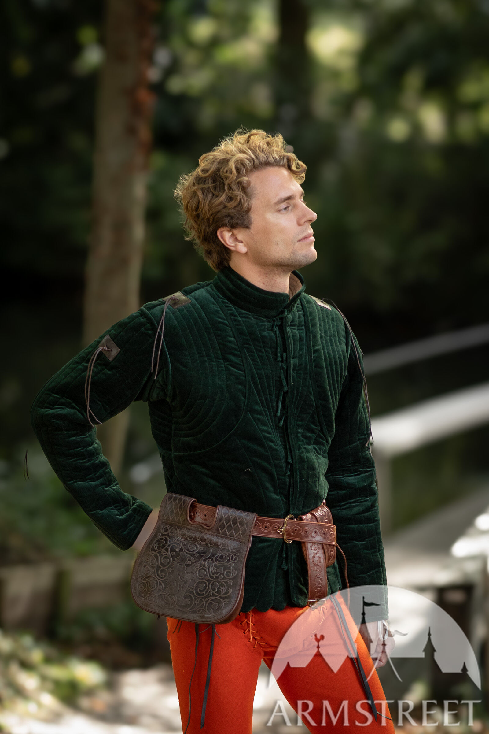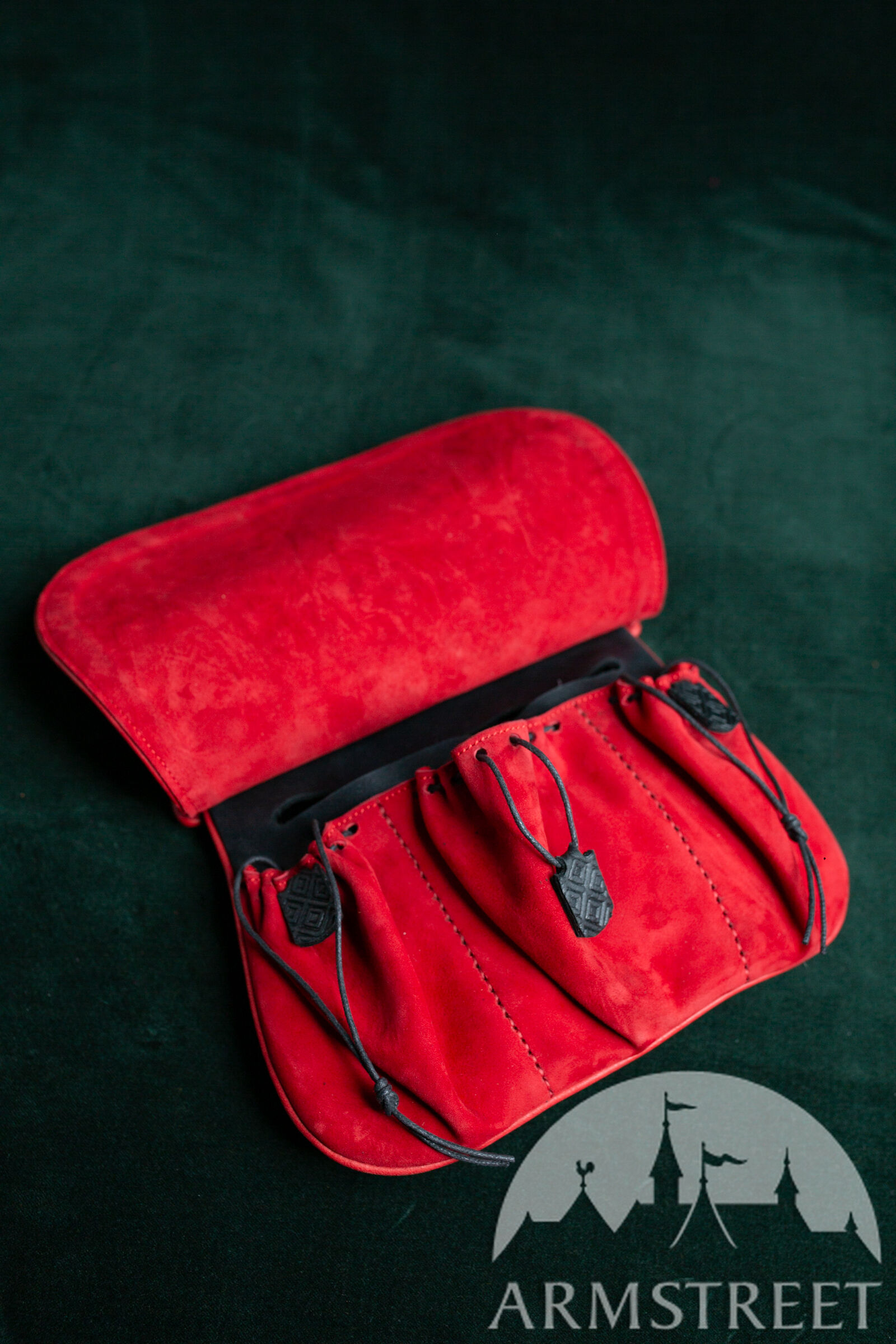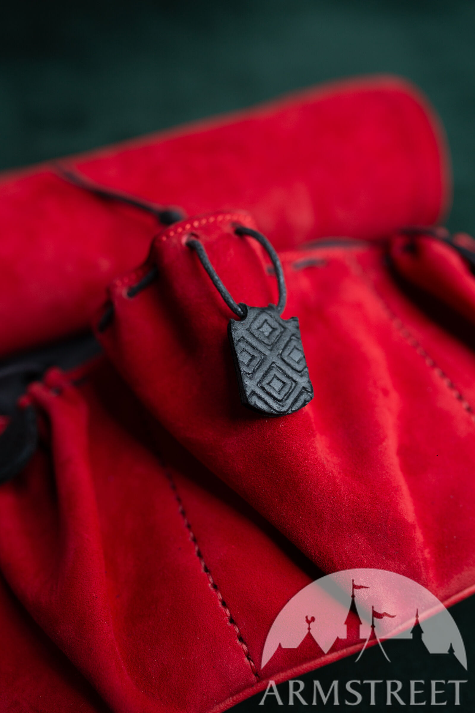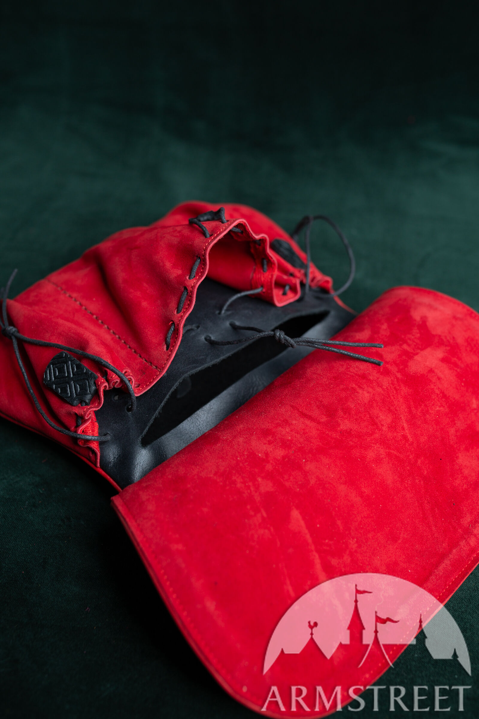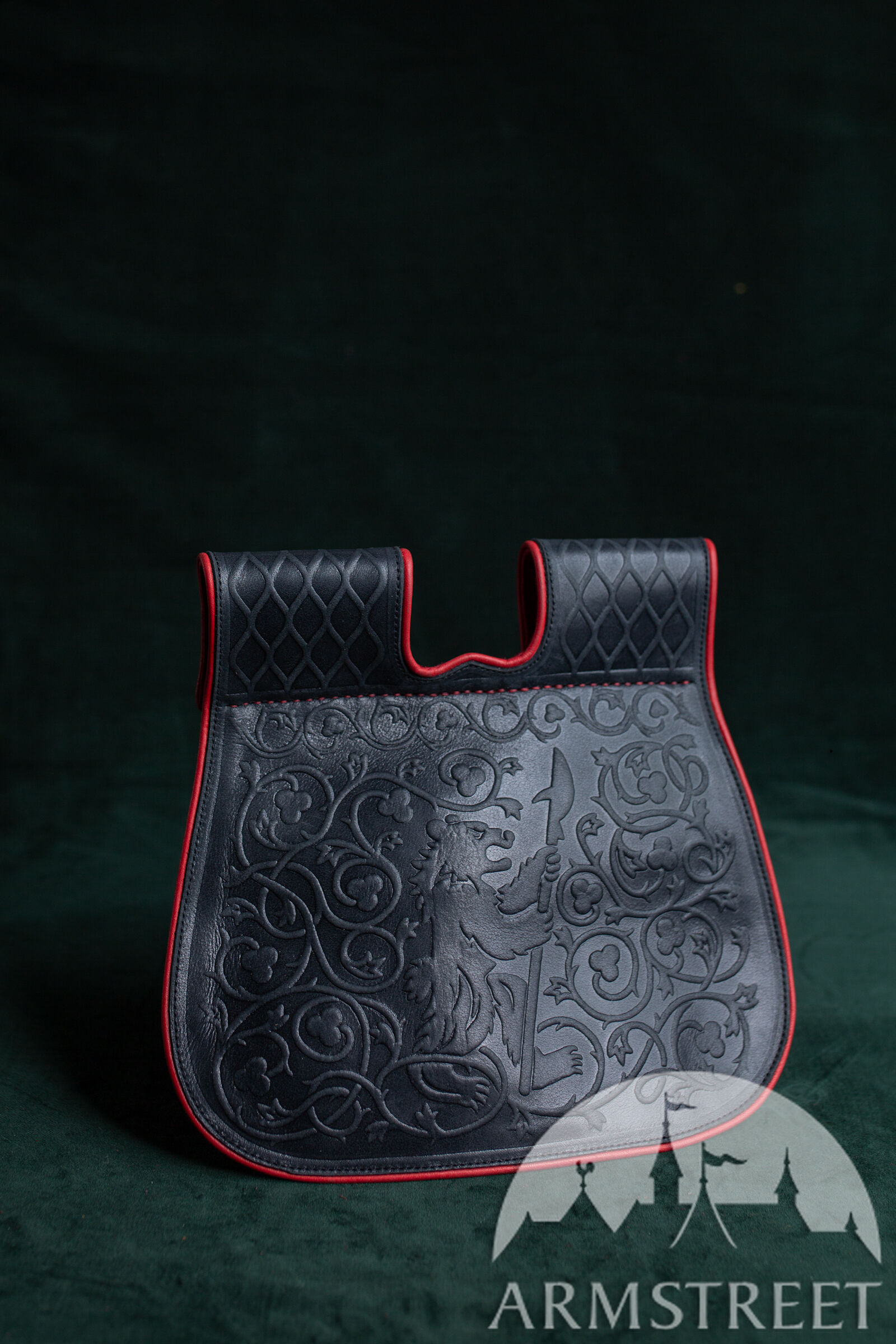 Moderne Kleidung hat glücklicherweise Taschen, doch im Mittelalter waren Taschen die einzige Möglichkeit, Schlüssel, Münzen und andere Wertgegenstände griffbereit aufzubewahren. Historische Funde zeigen die erstaunliche Vielfalt an Formen, Materialien und Tragemöglichkeiten dieser unverzichtbaren mittelalterlichen Accessoires. Diese besondere Ledertasche ist vom spätmittelalterlichen Stil inspiriert und passt zu vielen Charakteren. Es handelt sich um eine Gürteltasche, d. h. der Gürtel wird durch die Schlaufen oben an der Tasche geführt und etwa auf Hüfthöhe befestigt. Auch als „Nierentasche“ bezeichnet, wird sie üblicherweise mit dem 14. und 15. Jhdt in Verbindung gebracht. Damals wie heute war sie nicht nur ein praktisches Accessoire, sondern auch ein modisches Statement und eine Möglichkeit, aufzufallen.