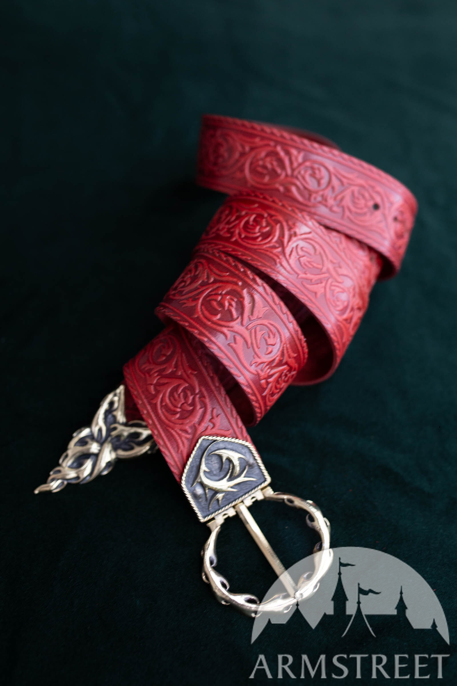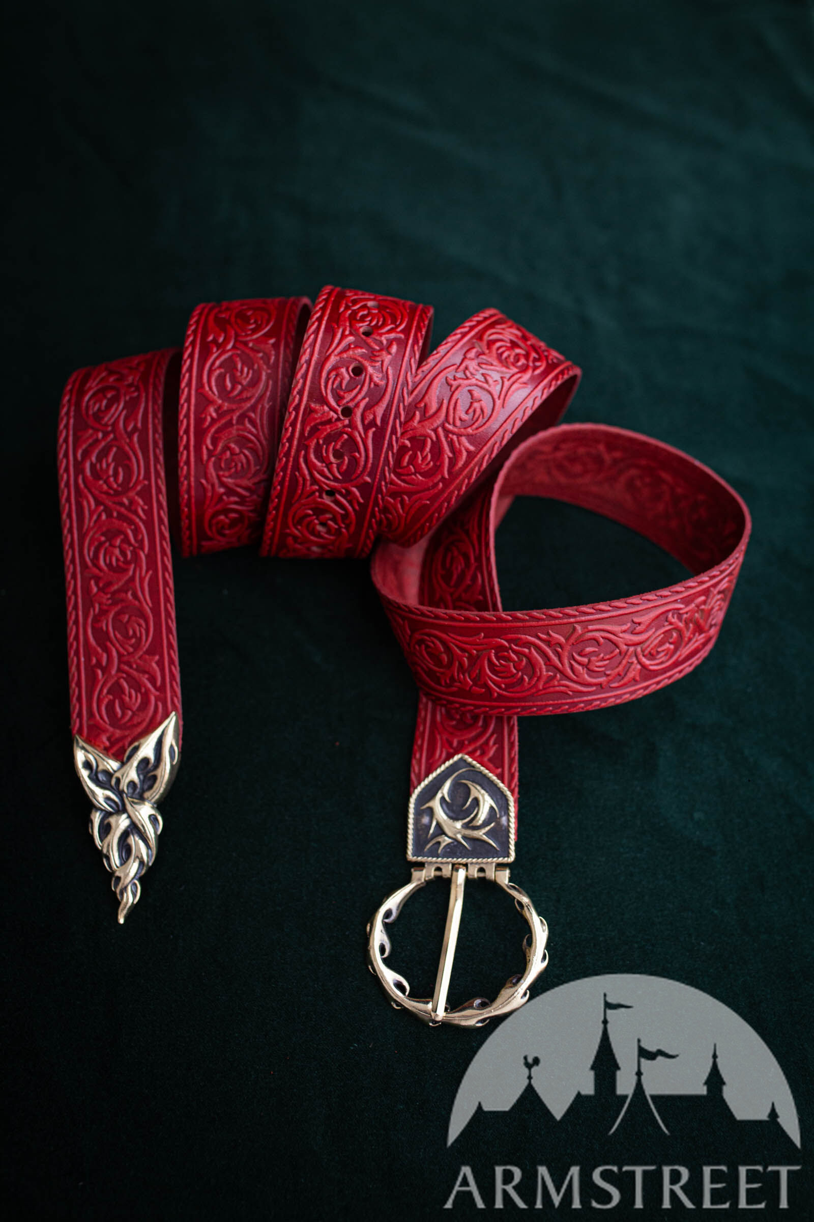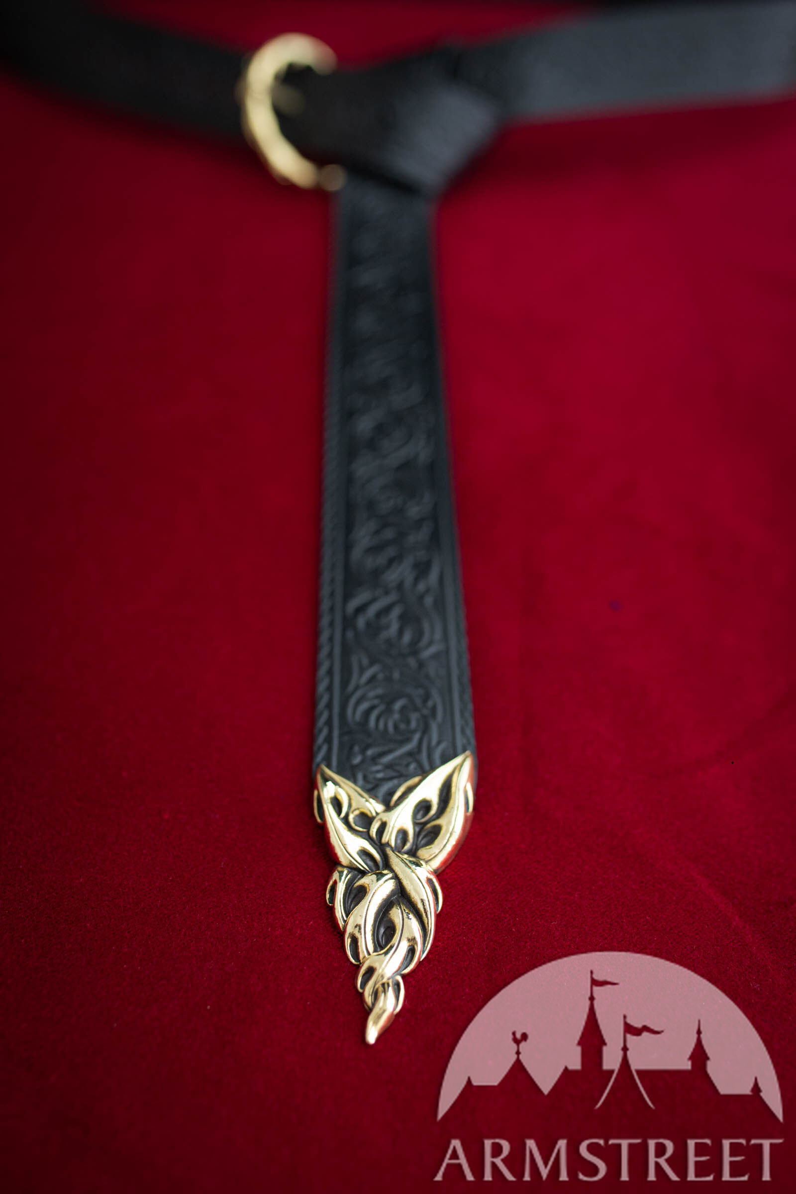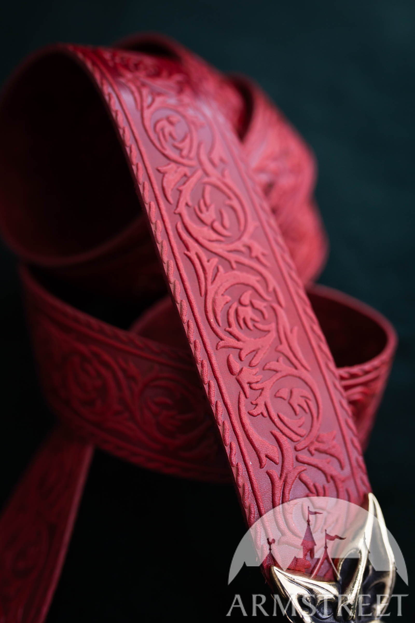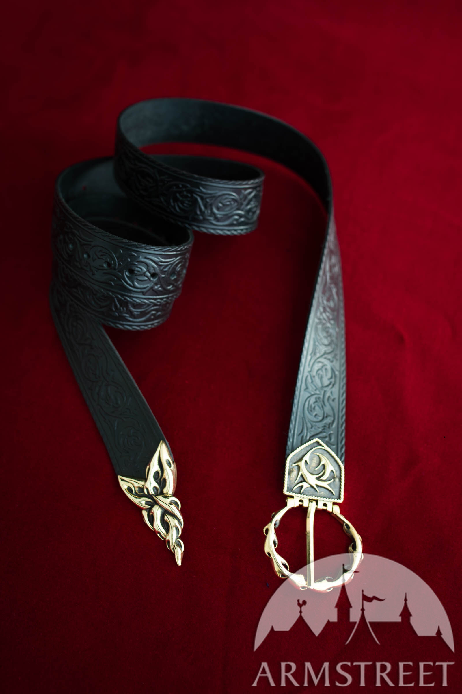 Dieser Gürtel besteht aus hochwertigem Leder, das tief mit schlangenartigen, dornigen Ranken geprägt wurde. Er ist dicker als unser durchschnittlicher Damengürtel, weil wir ihn so entworfen haben, dass er zu Rüstungen, Gambesons und anderen Kleidungsstücken passt, die etwas schwerer sind als unsere Damenbekleidung.