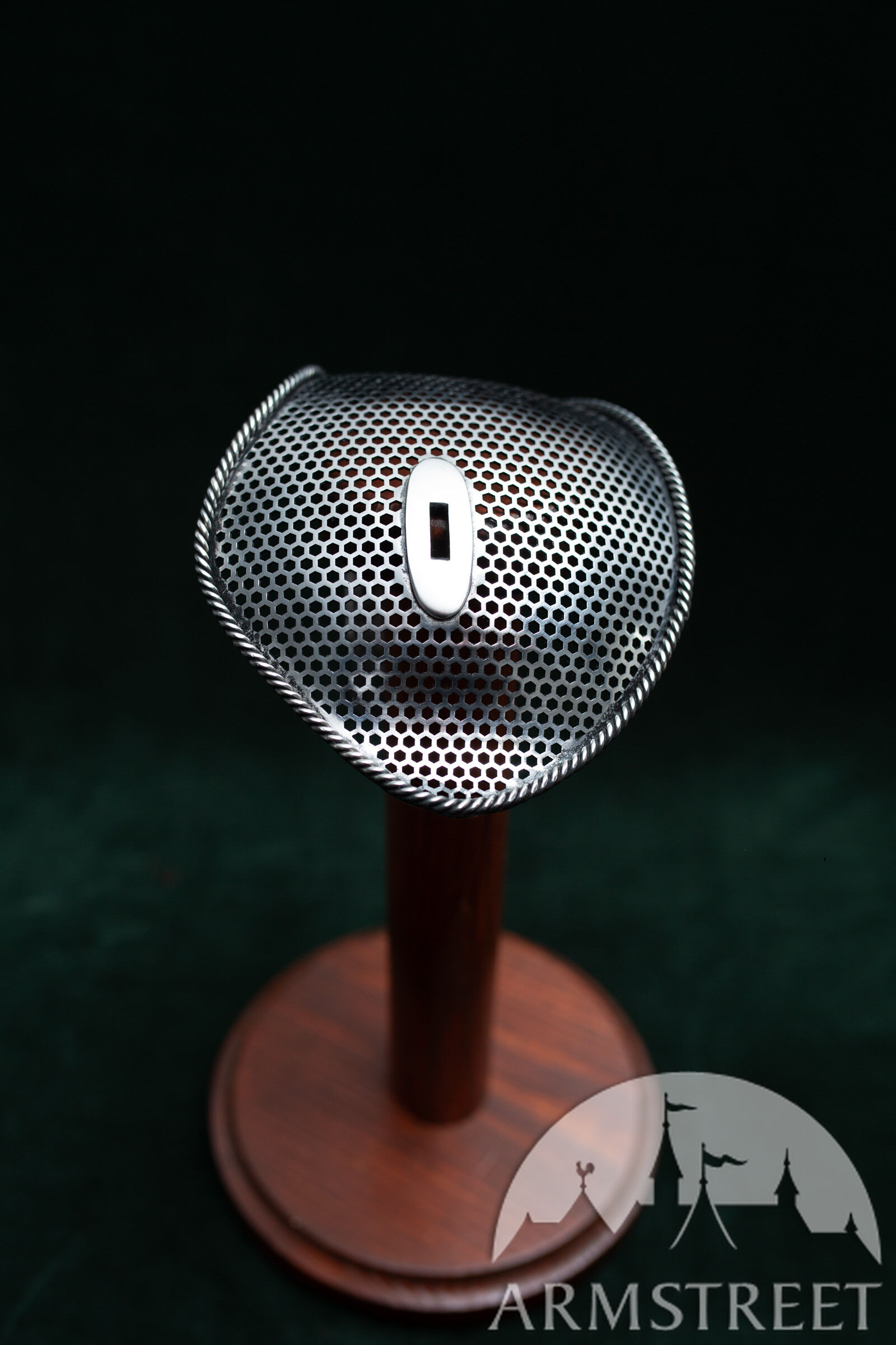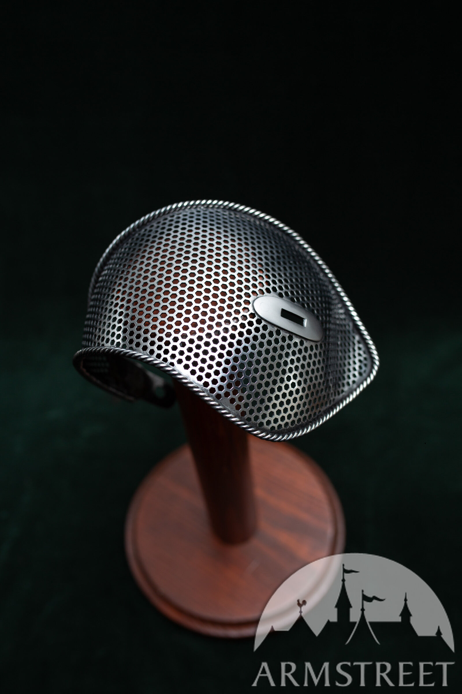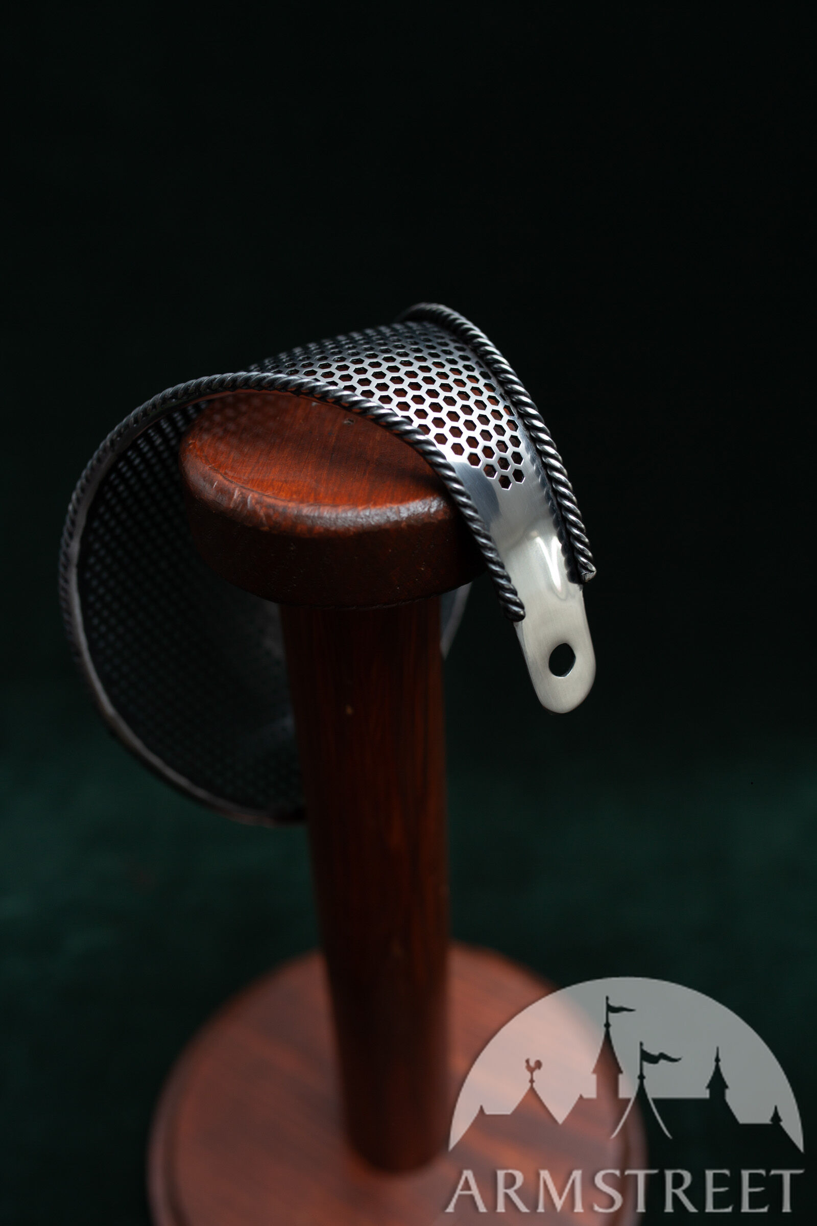Dieser elegante Schutz liegt genau zwischen unserem „Massiven Sparring-Schutz“ und dem leichten perforierten Schutz. Er vereint somit die Vorteile beider Varianten: Er ist 30–40 g leichter als der massive Schutz und gleichzeitig deutlich robuster als der perforierte Hochleistungs-Schutz ohne Einfassung. Zudem besticht er durch sein sportliches Design mit perforiertem, gehärtetem Stahlkorpus und der Seilkanteneinfassung, die an die Zeit des gepanzerten Kampfes und frühe Experimente mit kunstvollen Säbelschutzvorrichtungen erinnert.