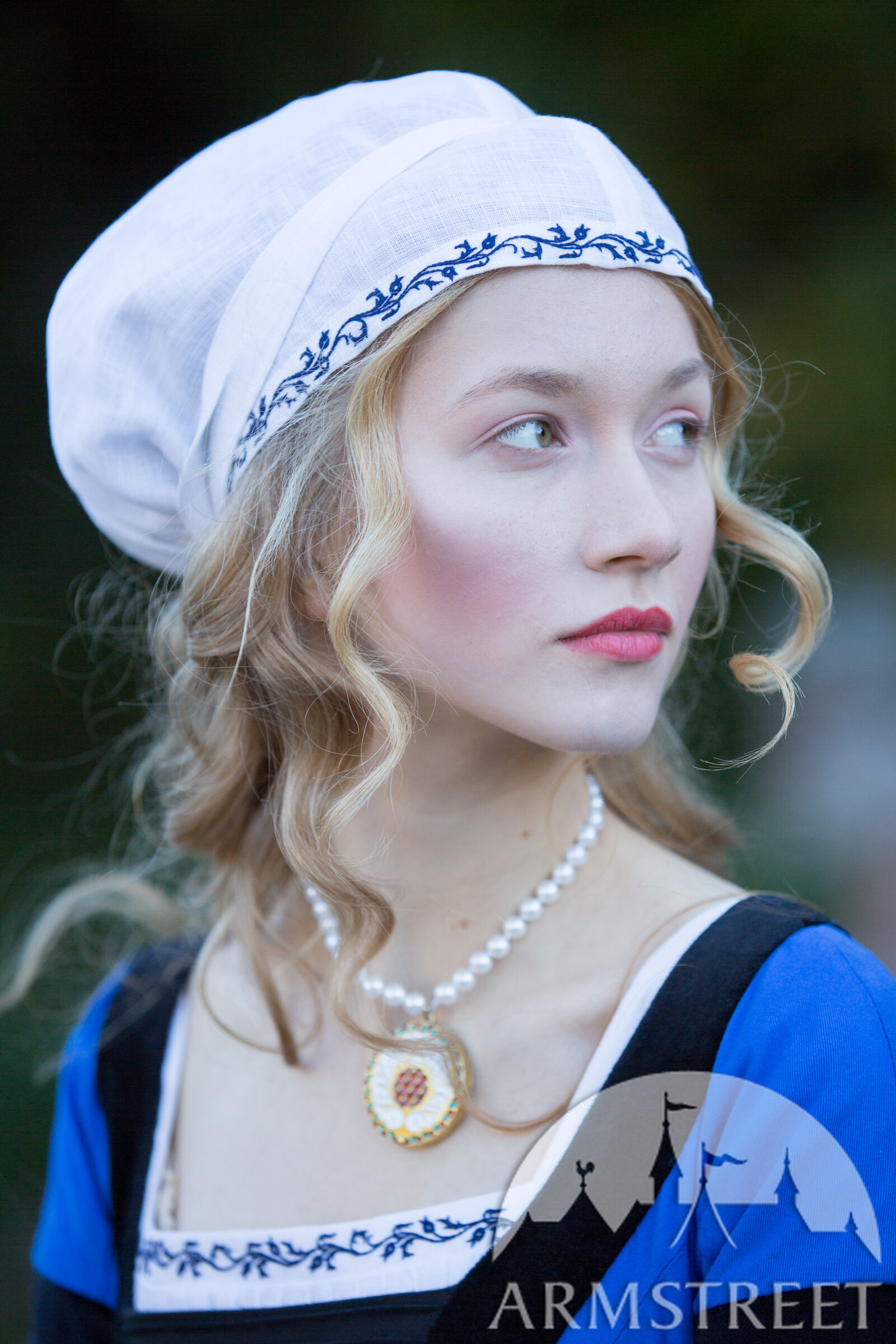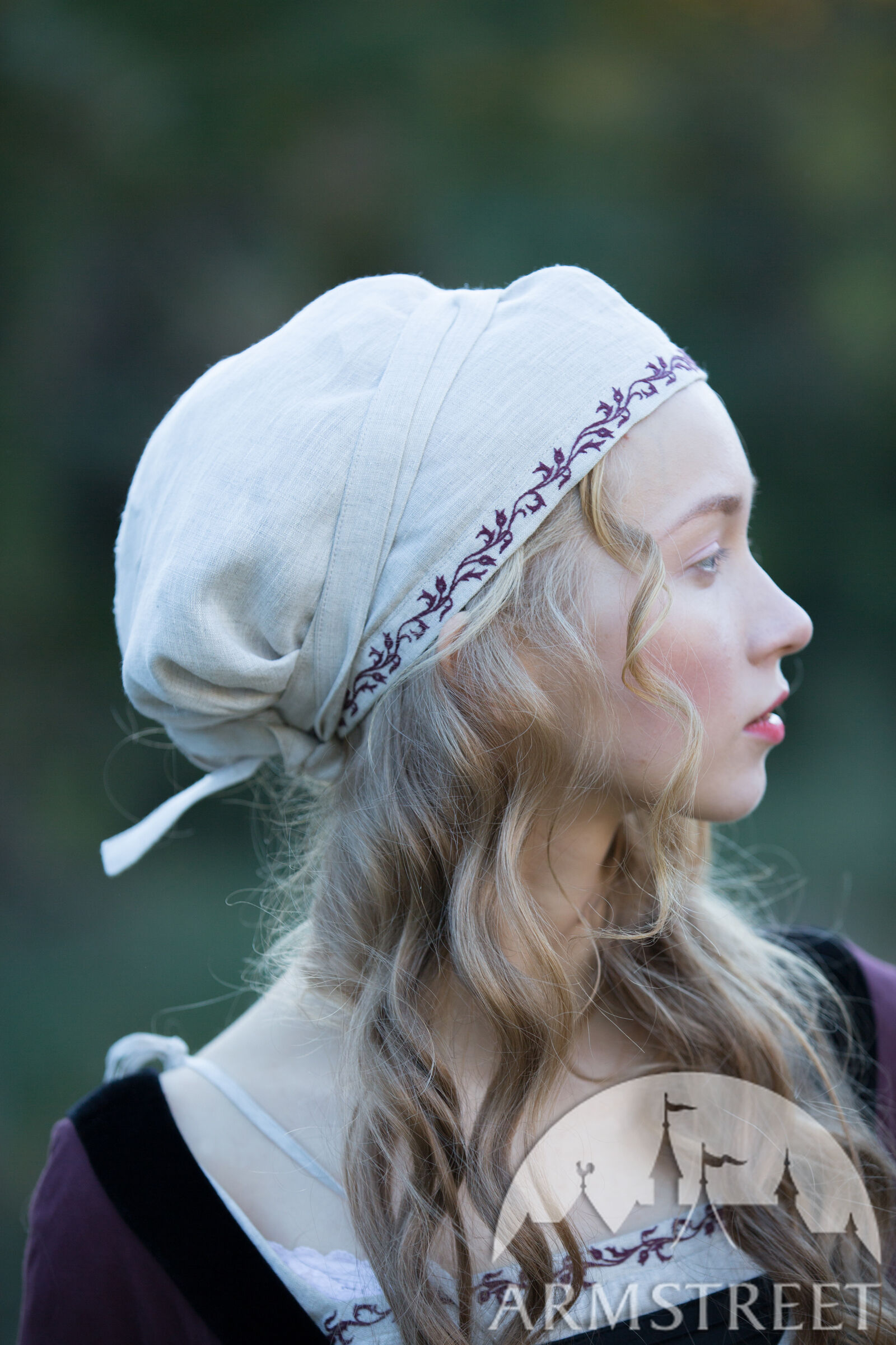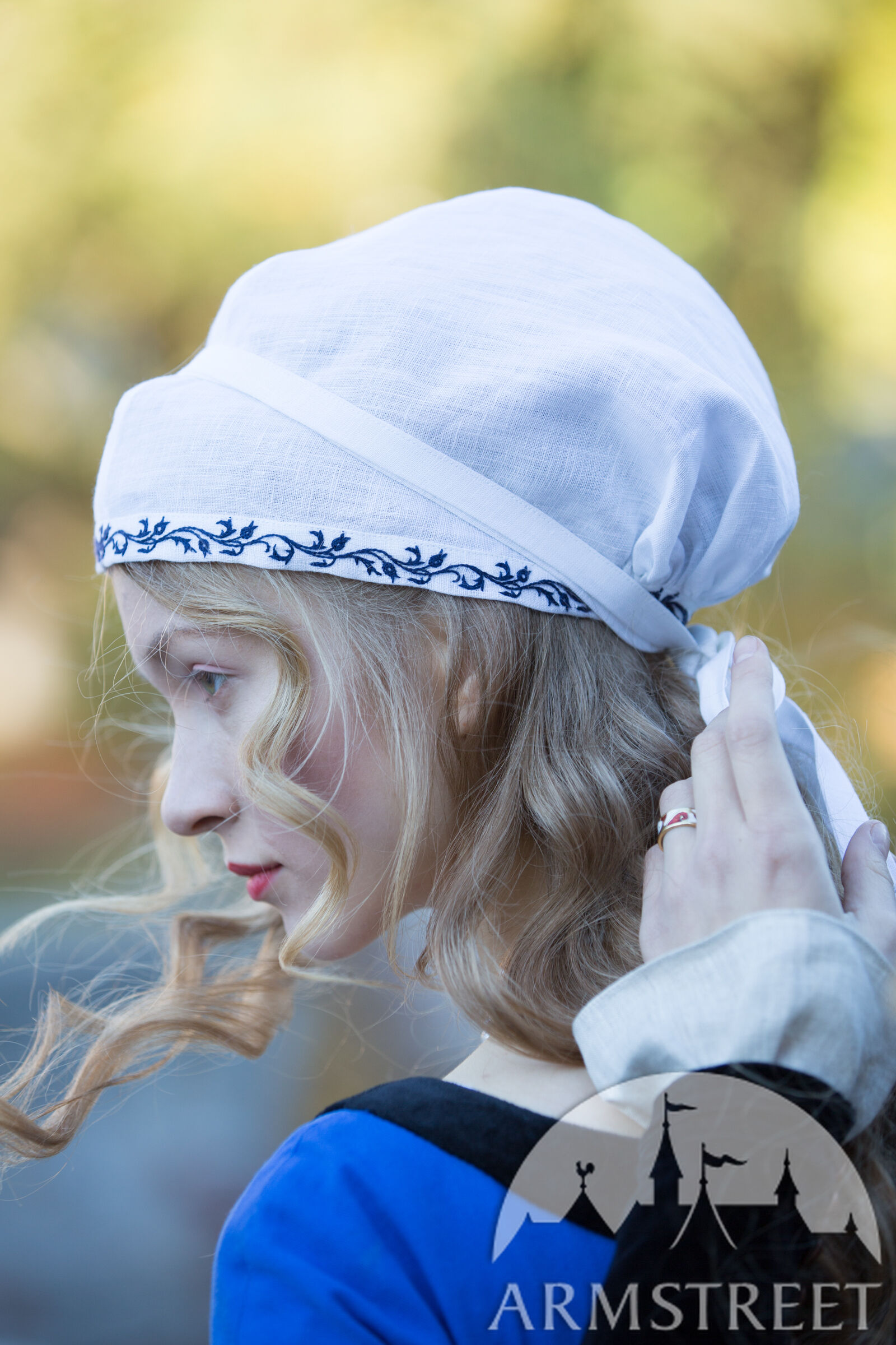 Dieses Stück basiert auf der historischen „St. Birgitta´s Haube”, einer gut dokumentierten Kopfbedeckung, die in verschiedenen Bildquellen gefunden wurde, beginnend im 13. Jahrhundert mit der Maciejowski-Bibel. Diese Mützen wurden manchmal allein getragen, um die Haare zu bedecken und sie dem Gesicht des Trägers fernzuhalten. Sie können auch gesehen werden, wie sie unter Hüten getragen werden und dieselbe Funktion erfüllen wie Leinenkostüme für Männer: Sie schützen teurere Kopfbedeckungen vor dem Öl Ihrer Kopfhaut.