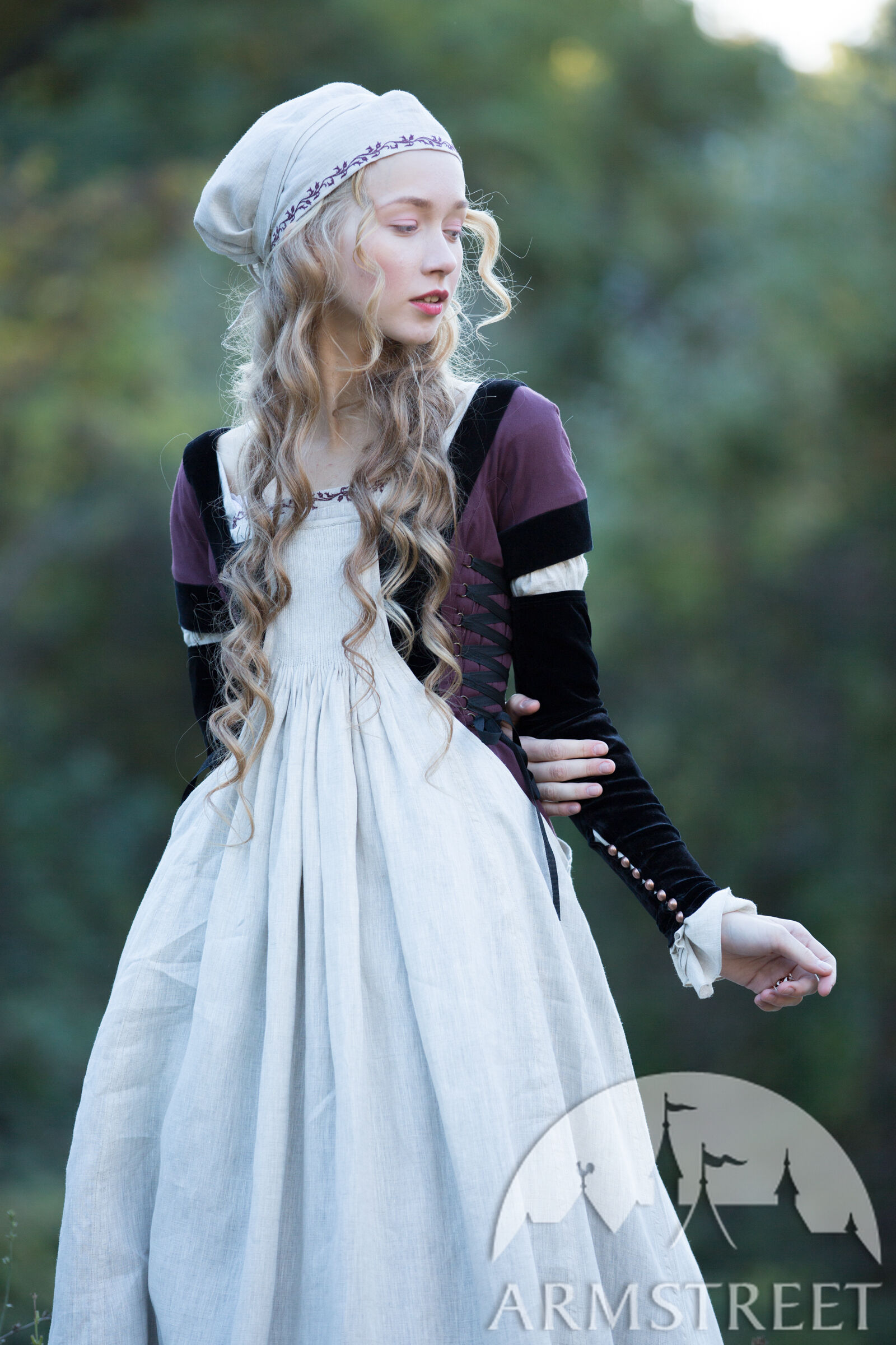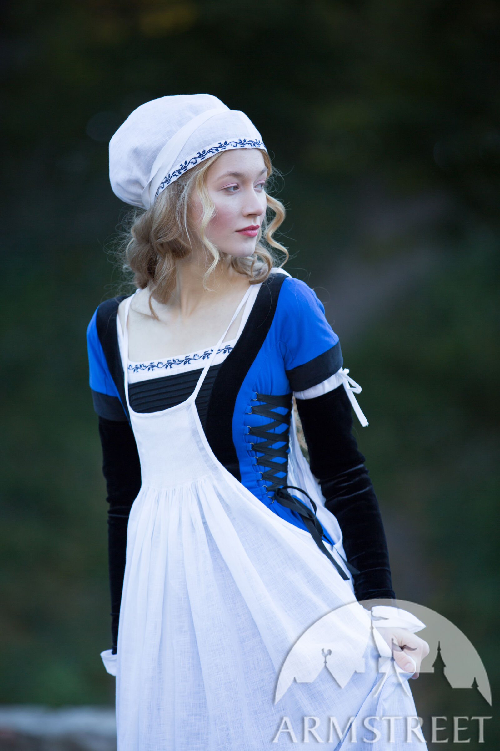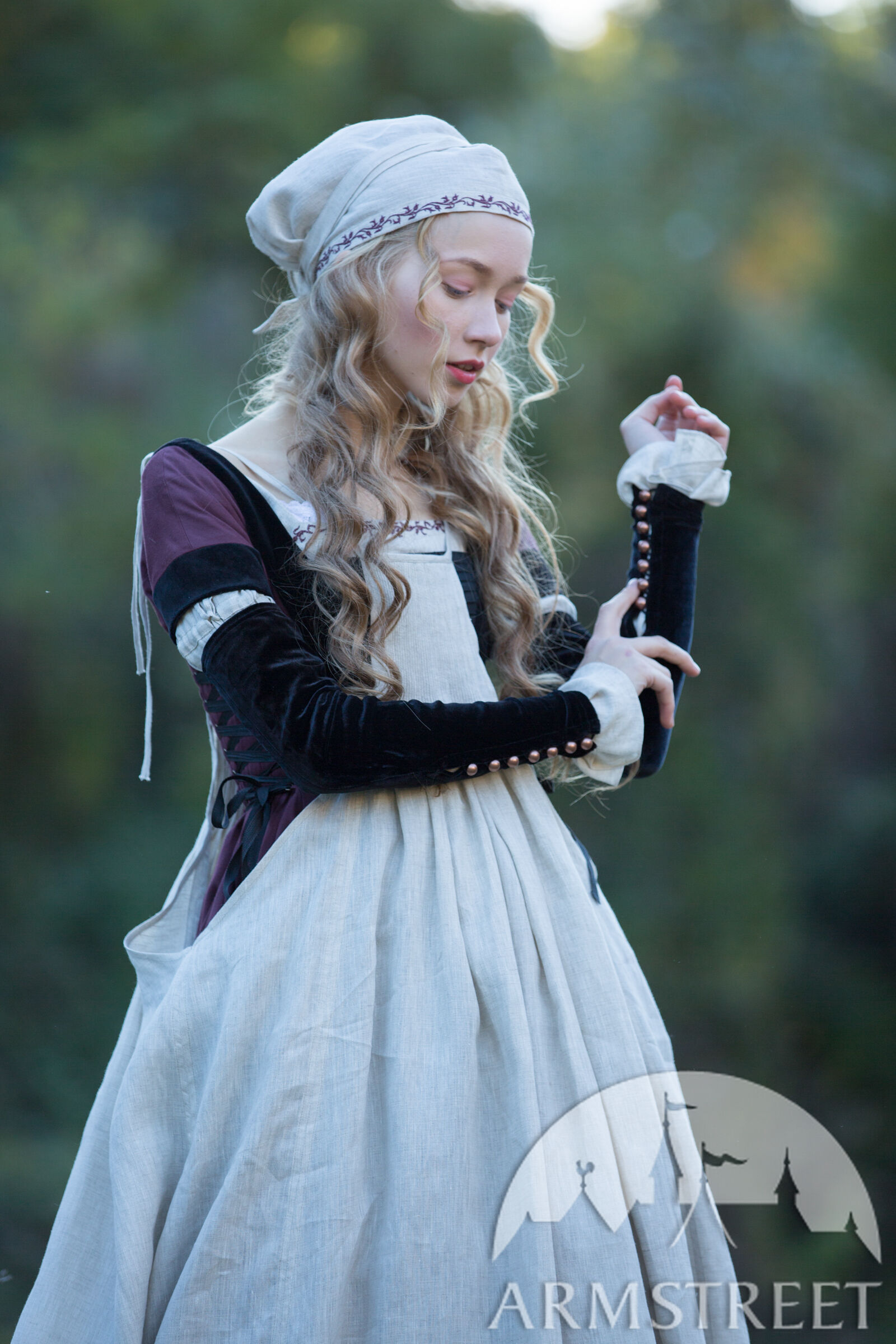 Dieses Stück basiert auf der historischen „St. Birgitta´s Haube”, einer gut dokumentierten Kopfbedeckung, die in verschiedenen Bildquellen gefunden wurde, beginnend im 13. Jahrhundert mit der Maciejowski-Bibel. Diese Mützen wurden manchmal allein getragen, um die Haare zu bedecken und sie dem Gesicht des Trägers fernzuhalten. Sie können auch gesehen werden, wie sie unter Hüten getragen werden und dieselbe Funktion erfüllen wie Leinenkostüme für Männer: Sie schützen teurere Kopfbedeckungen vor dem Öl Ihrer Kopfhaut.