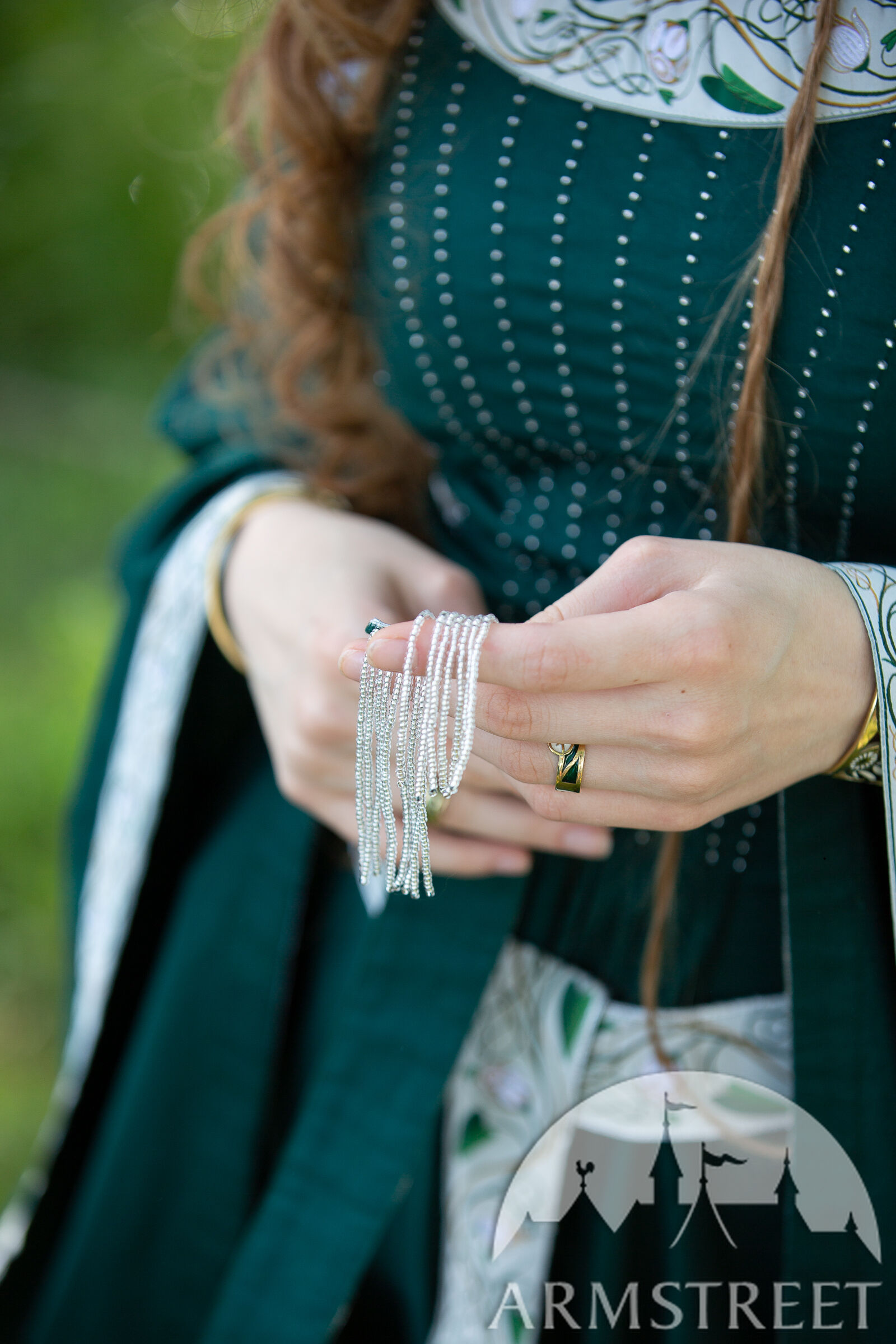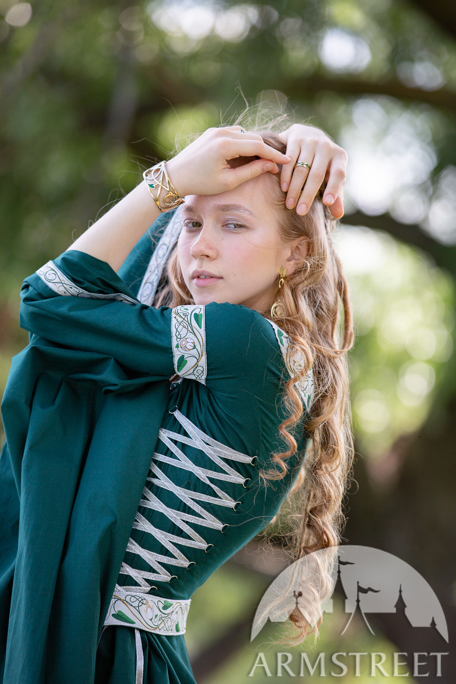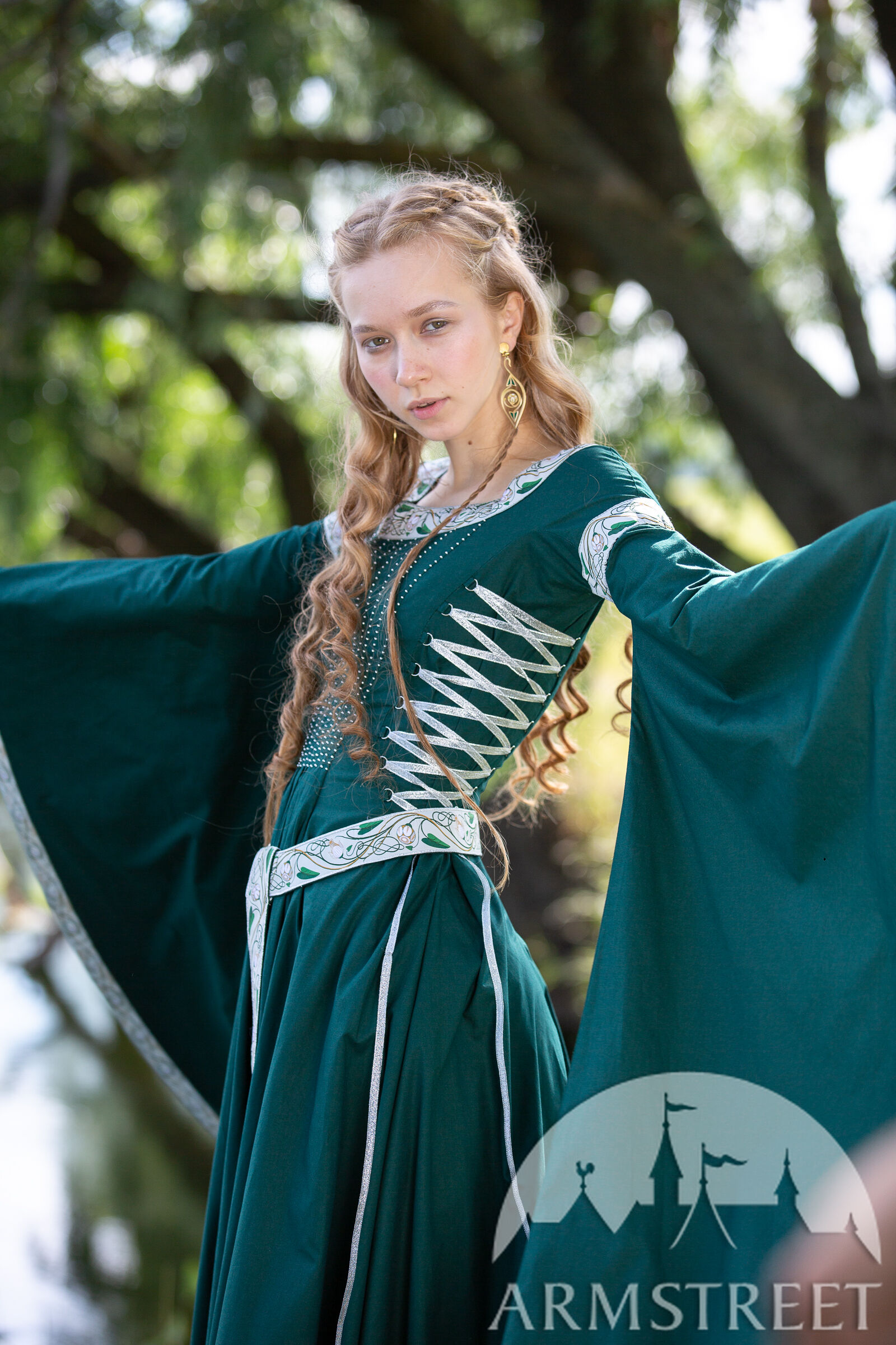 Dieses Kleid ist die perfekte Linie aus Geschichte und Fantasie, verwendet die besten Teile mittelalterlicher Kleidung und kombiniert sie mit einem Gefühl des Staunens. Dieses Kleid sieht aus, als wäre es aus einer Artuslegende hervorgegangen und für eine Königin, Priesterin, Magierin, Adlige oder Göttin geeignet. Ein kunstvoll plissiertes Oberteil hat einen weiten Ausschnitt, der zu Ärmeln führt, die an der Schulter sitzen, aber lang sind und unten fließen. Durch die seitliche Schnürung am Oberteil erhalten Sie die perfekte Passform für Ihren Oberkörper, und der Rock fließt mit zusätzlichen Gores für mehr Volumen zum Boden.