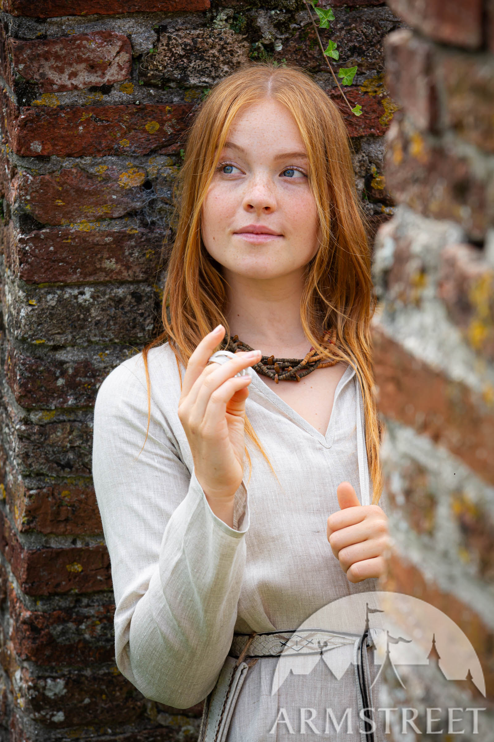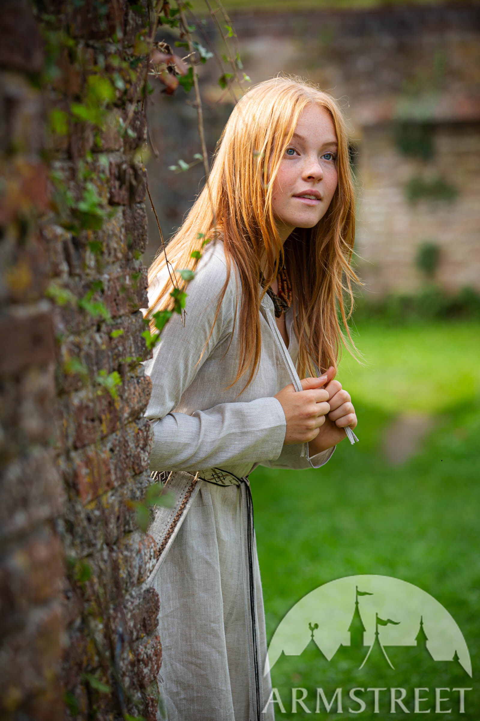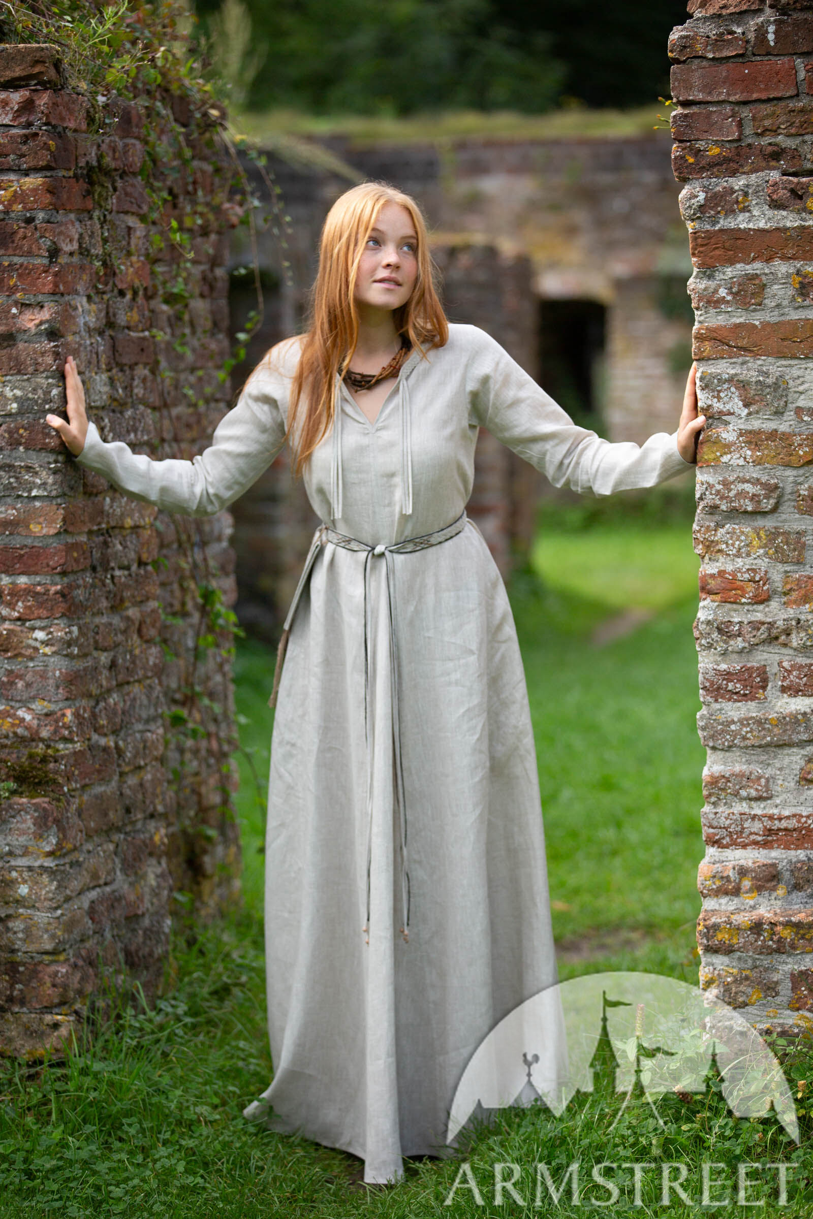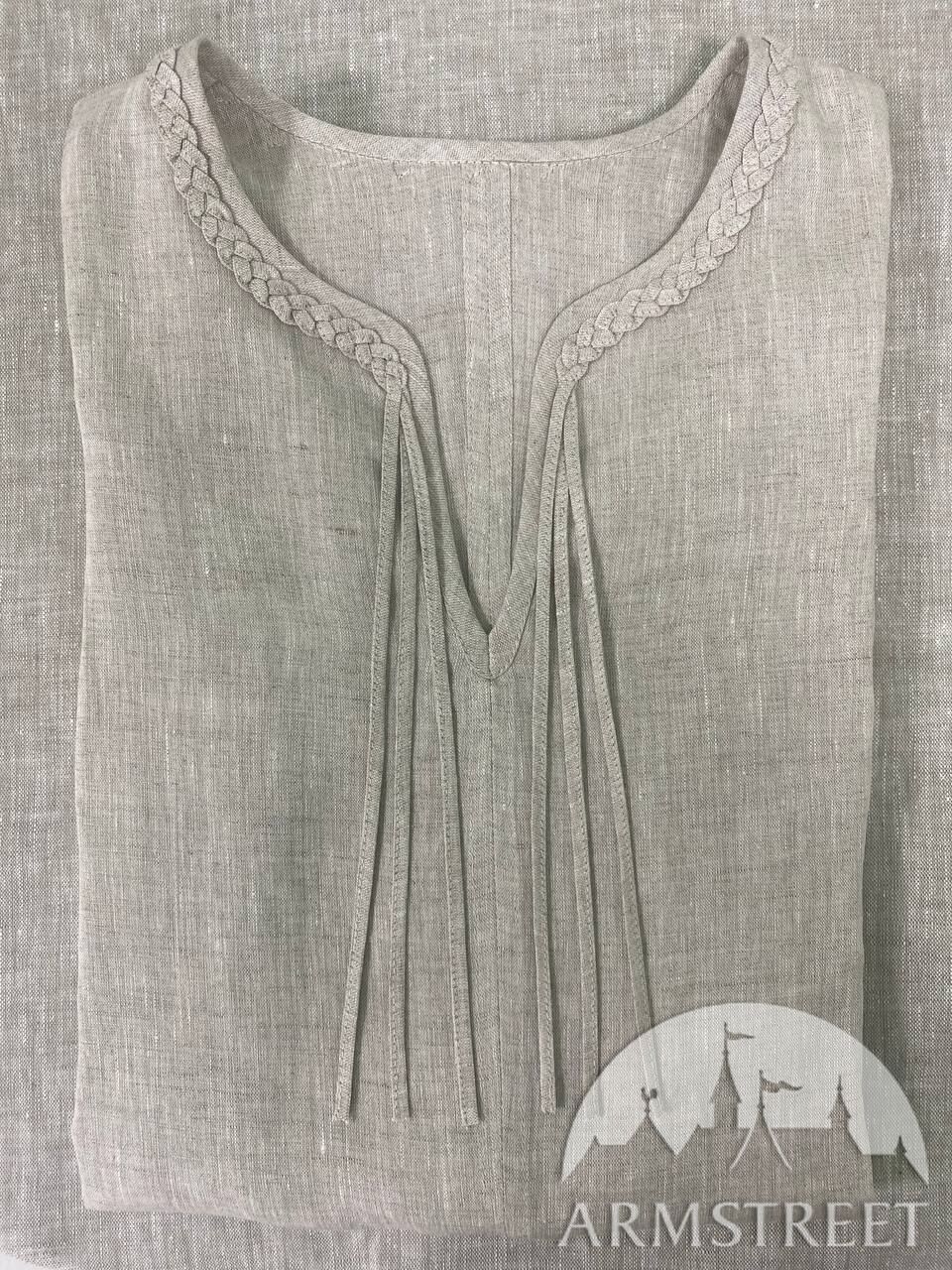 Unsere Kollektion „Mittelalter Familie“ entstand aus dem Verständnis der Nachfrage nach allgemeiner frühmittelalterlicher Kleidung. Mit Fokus auf Schlichtheit und erstklassiger Qualität haben wir ein einfaches Hemd entworfen und es mit den hübschen Zöpfen entlang des Ausschnitts verfeinert. Diese verwobenen Akzente bestehen aus feinen Flachsleinenstreifen. Das Unterkleid ist ein unglaublich vielseitiges Stück mit viel Raum für Personalisierung und Lagenkombinationen, um einen einzigartigen Look zu kreieren.
