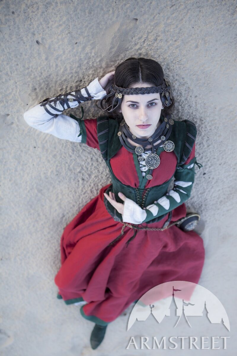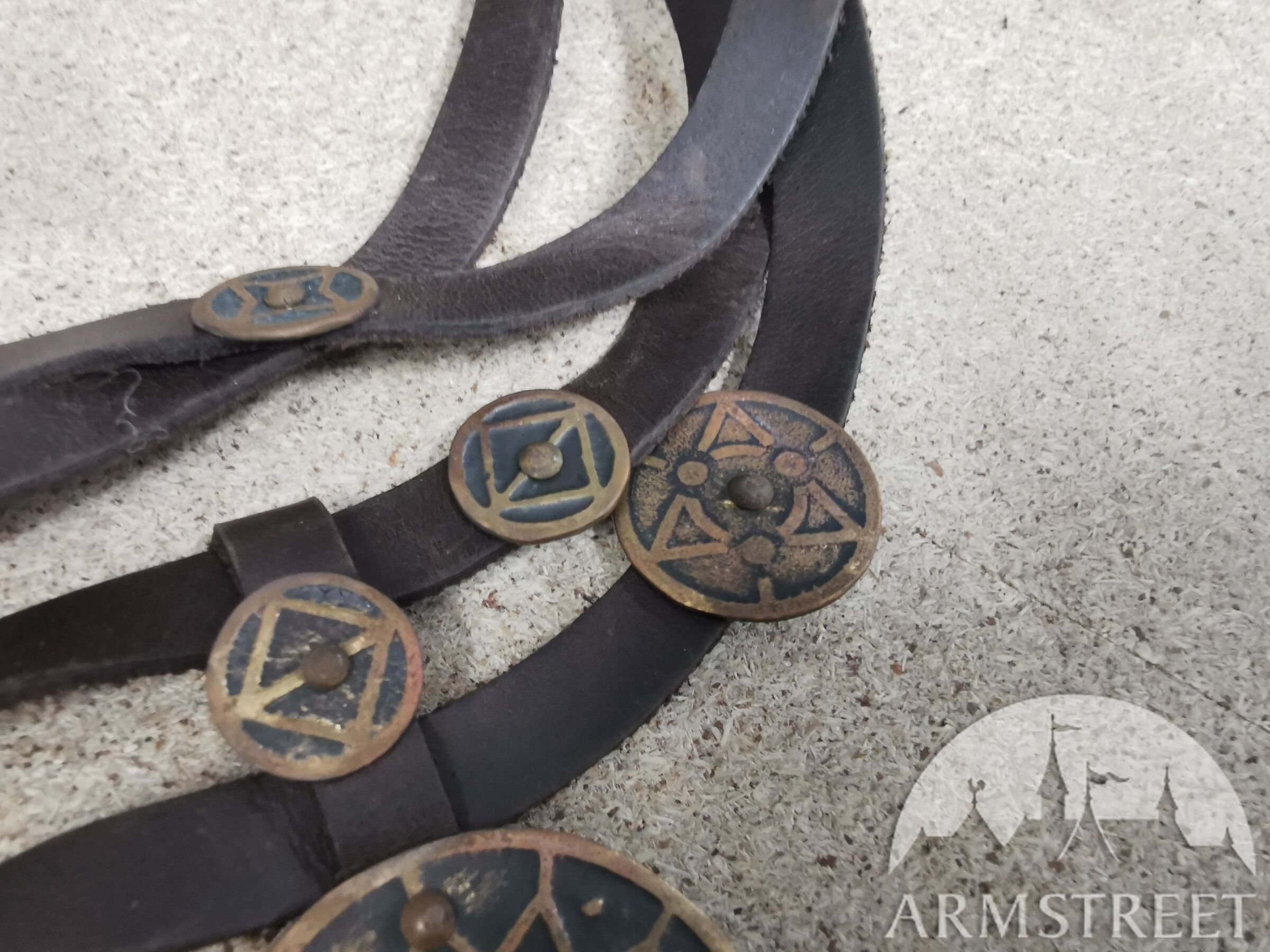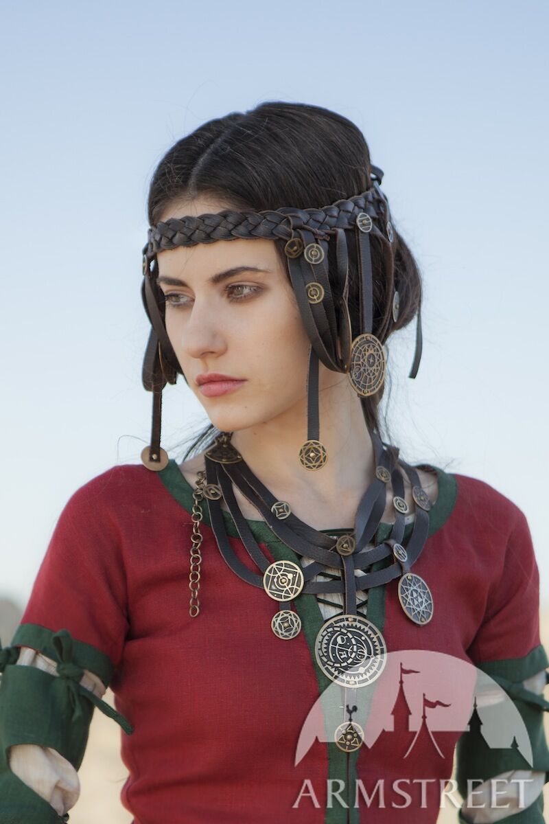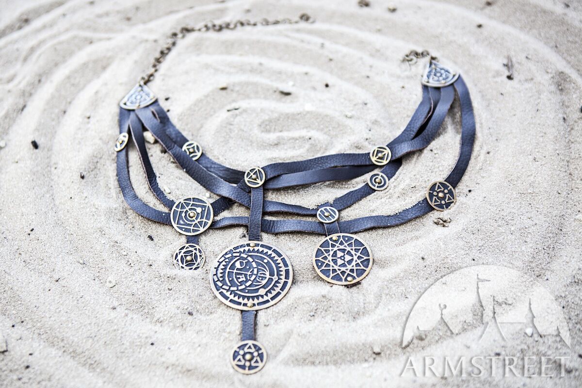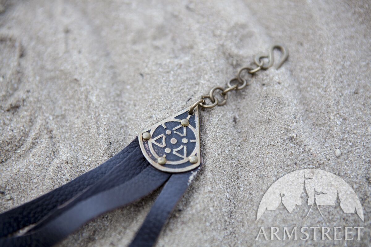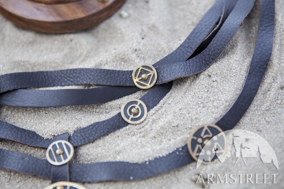 Diese einzigartige Juwelierarbeit wurde speziell für unser Kostüm und Accessoire-Set „Tochter des Alchimisten“ entworfen. Die elegante „Zufälligkeit“ und der natürliche Look sind die Ergebnisse harter Arbeit und der kreativen Visionen unserer Designer und Handwerker. Die Bänder aus echtem Leder sind mit Messingornamenten (wahlweise rostfreiem Stahl) geschmückt. Jedes einzelne Ornament ist von Hand gefertigt und mit Ätzmustern verziert.
