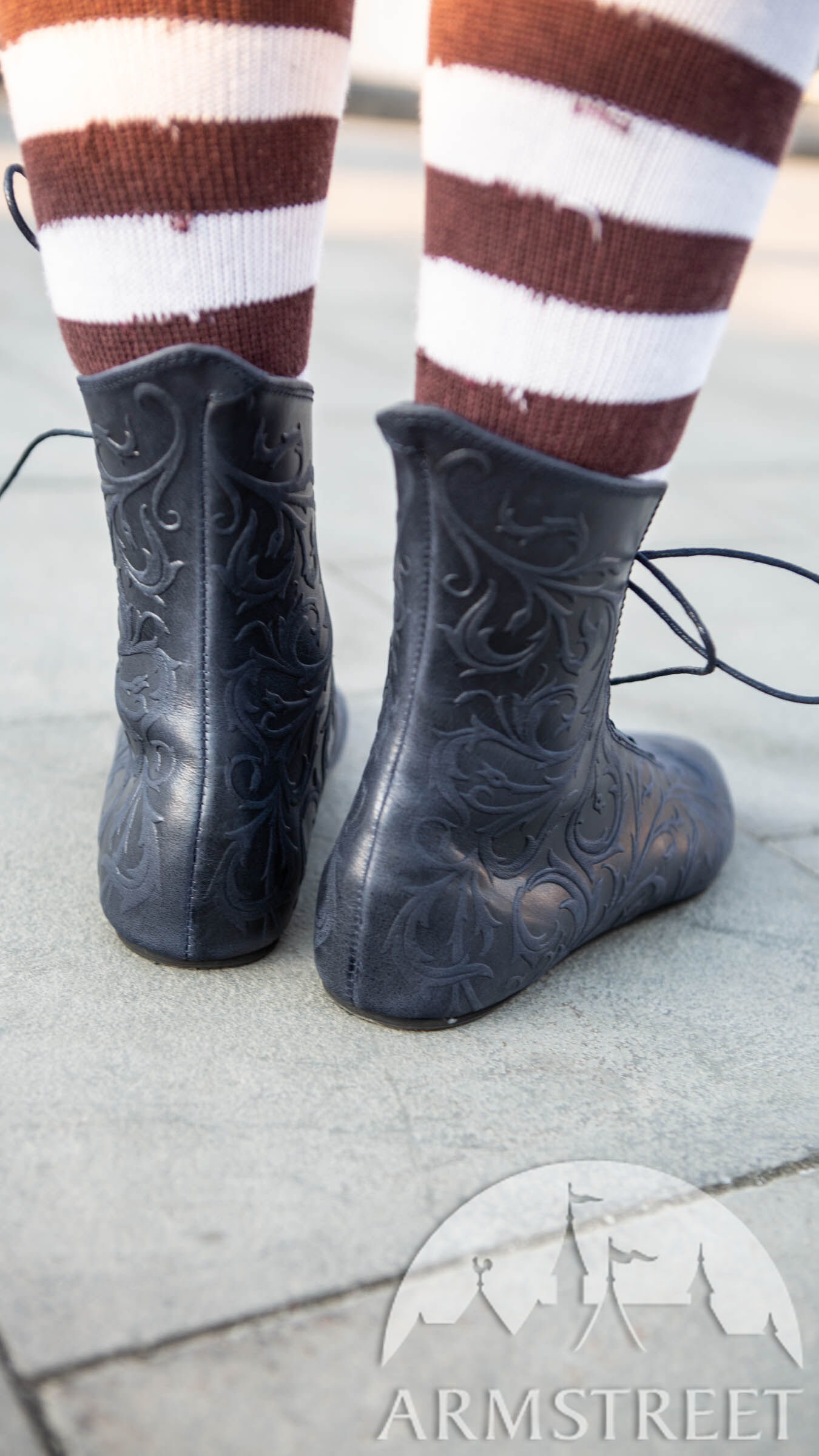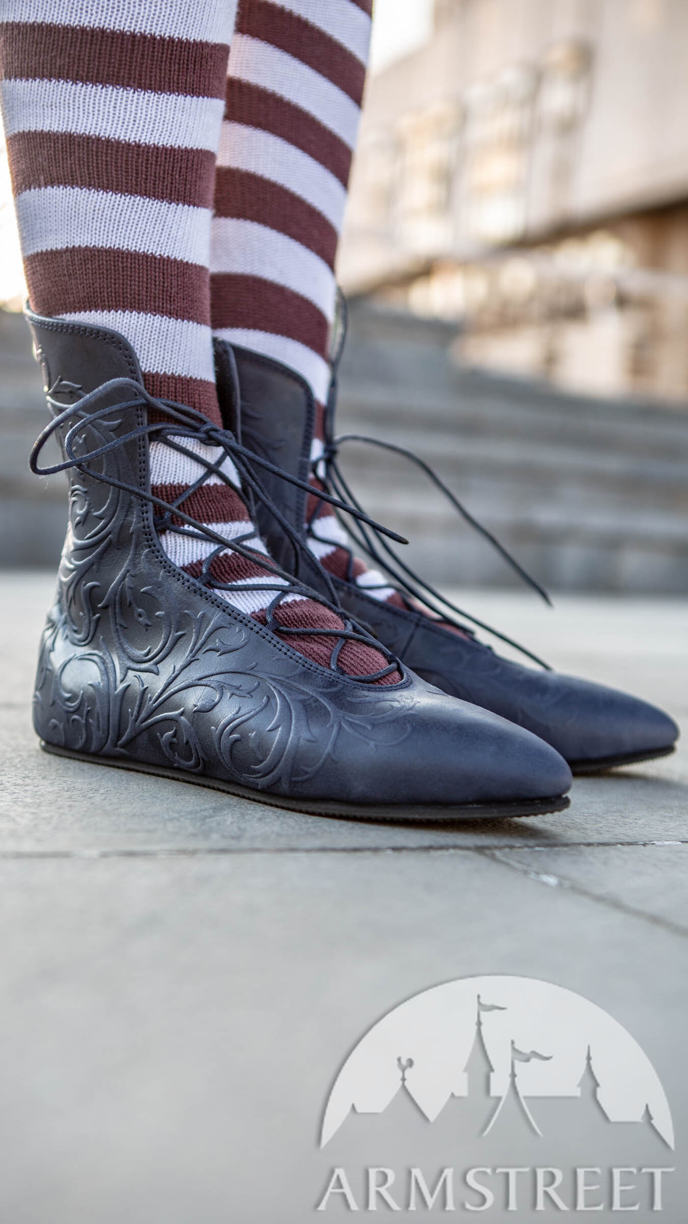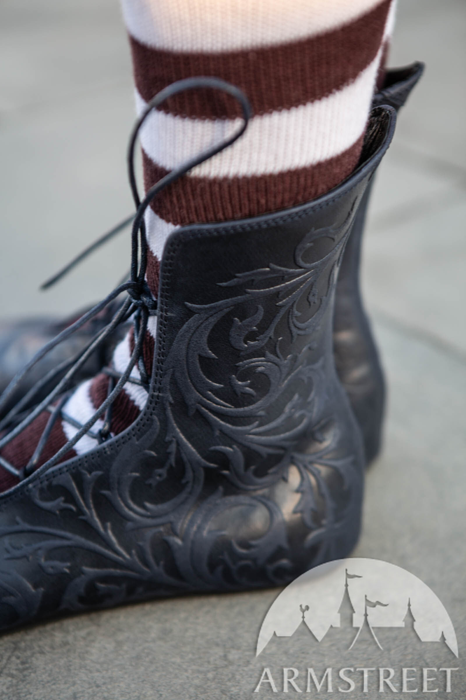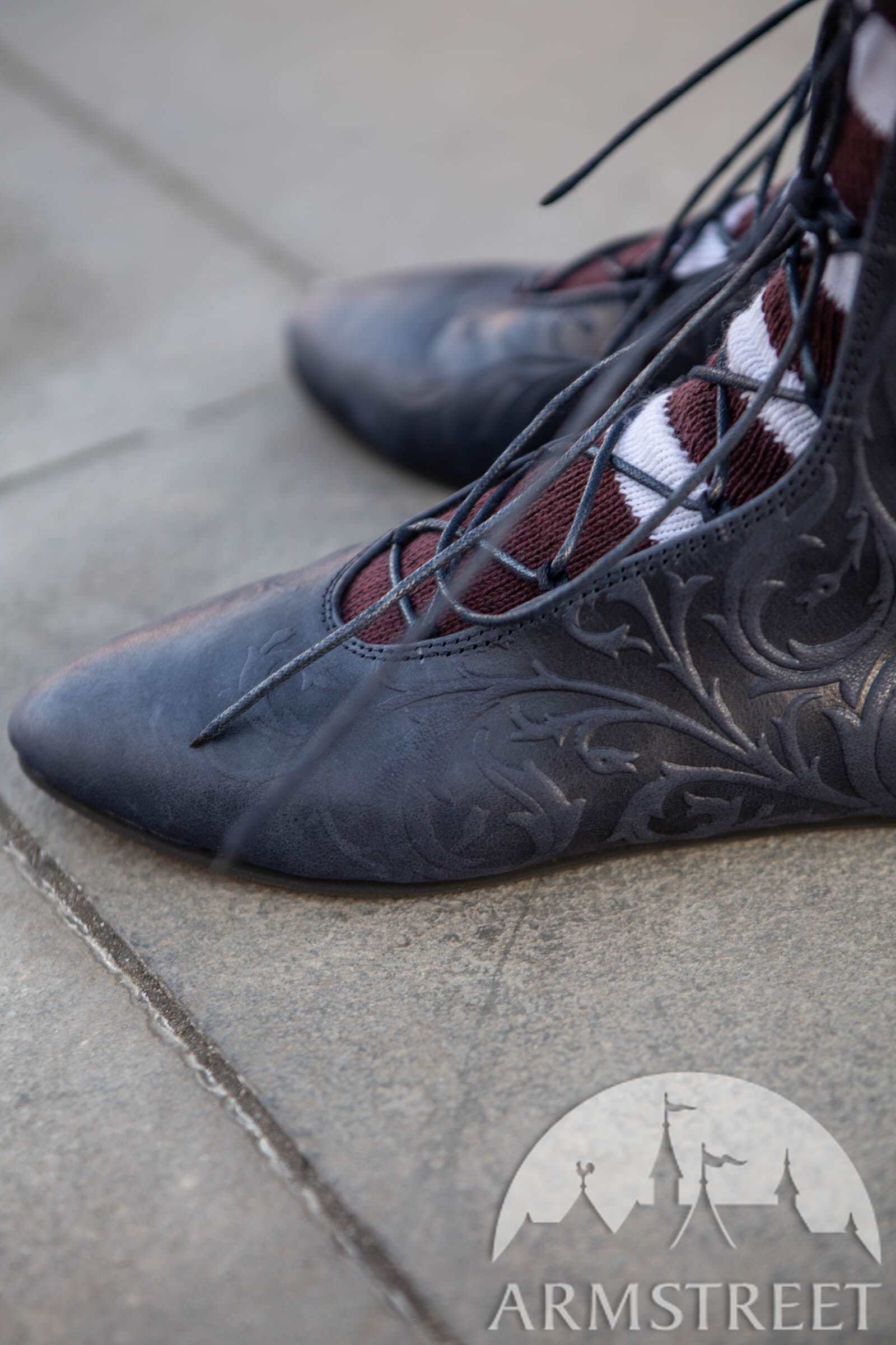 Schuhe mögen ein kleiner Teil eines Kostüms sein, aber sie sind unglaublich wichtig, wenn es darum geht, wirklich mittelalterlich auszusehen. Historische Schuhe hatten ein völlig anderes Profil als moderne Schuhe und waren in der Regel ohne Absatz und völlig flach. Obwohl dieser Unterschied klein erscheint, macht er tatsächlich einen großen Unterschied! Mit einem Paar mittelalterlicher Schuhe können Sie Ihr Kostüm sofort aufwerten.