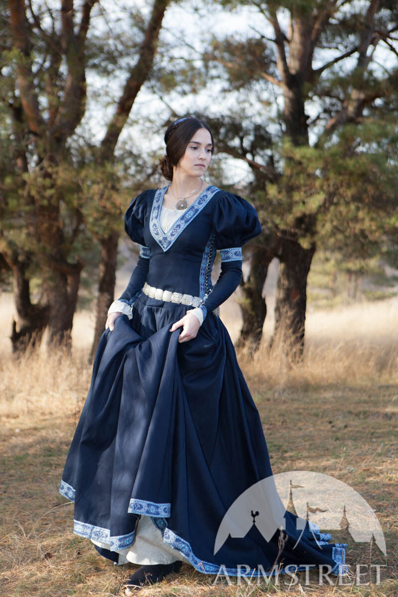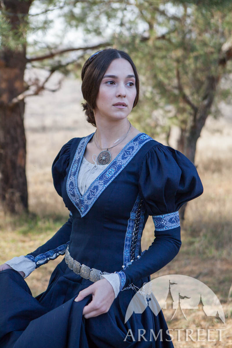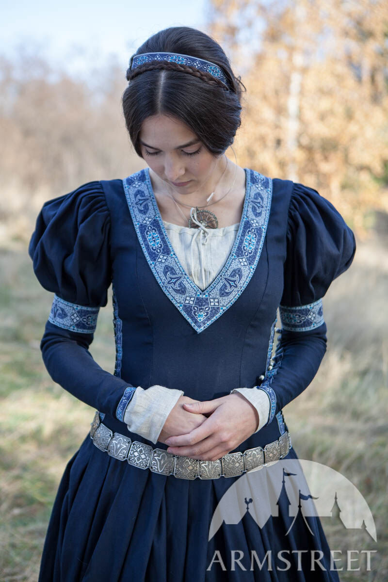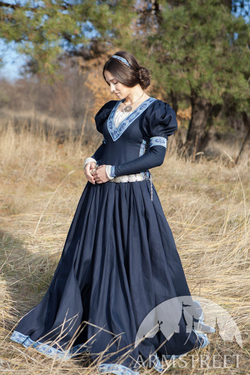 Unser einfaches Baumwollgewebe wird als Hauptmaterial verwendet, was das Kleid vielseitiger wandlungsfähiger macht. Die Borte um den tiefen Ausschnitt, die Ärmel und den unteren Abschluss des Kleides sorgt für eine exquisite Noblesse. Dieses Kleid ist so gestaltet, dass jeder wie eine Prinzessin aussieht: ein seitliches Schnürmieder umschmeichelt sanft die Figur des Trägers für eine perfekte Passform und schmeichelt jeder Silhouette. Puffärmel sind eine der charakteristischen Merkmale, die das Kleid erkennbar machen, und die gut angebrachten, geknöpften Ärmel garantieren bei verschiedenen Gelegenheiten Funktionalität.