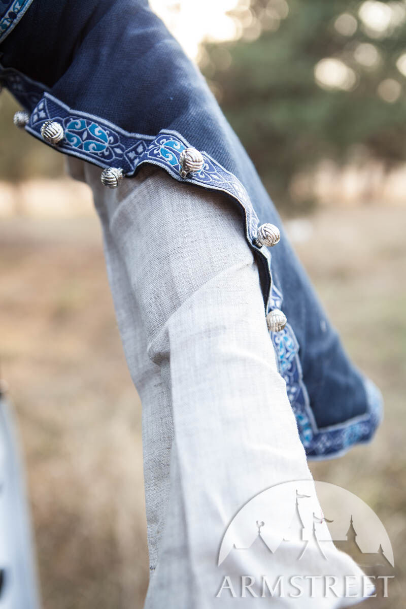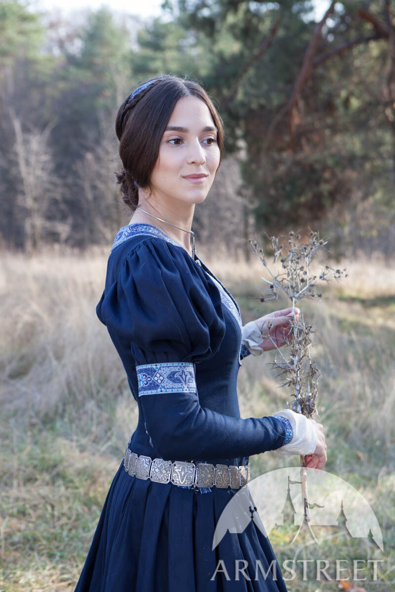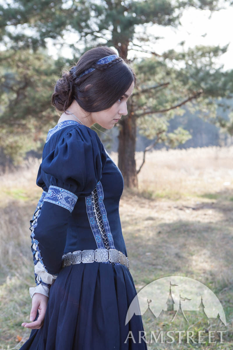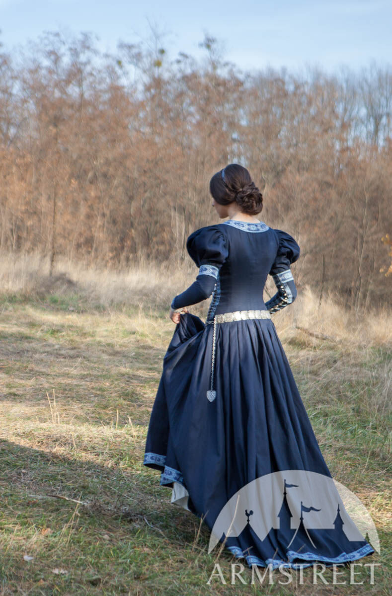 Unser einfaches Baumwollgewebe wird als Hauptmaterial verwendet, was das Kleid vielseitiger wandlungsfähiger macht. Die Borte um den tiefen Ausschnitt, die Ärmel und den unteren Abschluss des Kleides sorgt für eine exquisite Noblesse. Dieses Kleid ist so gestaltet, dass jeder wie eine Prinzessin aussieht: ein seitliches Schnürmieder umschmeichelt sanft die Figur des Trägers für eine perfekte Passform und schmeichelt jeder Silhouette. Puffärmel sind eine der charakteristischen Merkmale, die das Kleid erkennbar machen, und die gut angebrachten, geknöpften Ärmel garantieren bei verschiedenen Gelegenheiten Funktionalität.