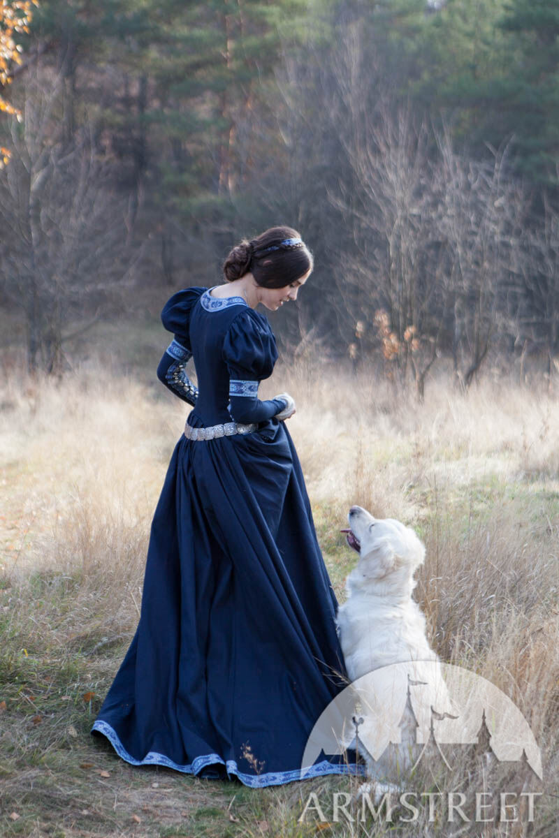 Dies ist ein Kleid von zuverlässigem, einfachem und praktischem Design, gefertigt aus edlen Materialien. Während die Prinzessin an einem Lagerfeuer in einem kalten Wald sitzt, eine lange Fahrt zu Pferd unternimmt und sich auf einem belebten Marktplatz bewegt, ist sie in ihrer Kleidung gleichermaßen wohl. Während ihr Geist gedämpft werden kann, wird die niedergeschlagene Prinzessin von passender Kleidung gehalten, die keine Zweifel darüber lässt, wer sie ist. Die Eleganz der Verkleidung zeigt ihren unvergleichlichen Geschmackssinn, während sie nicht kitschig wirkt - die raffinierte Erscheinung ist ein Beweis für ihren hohen Status.