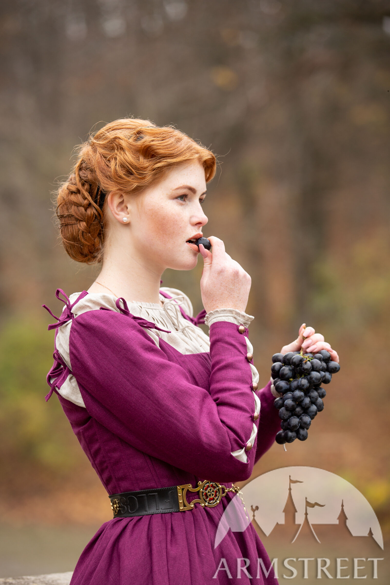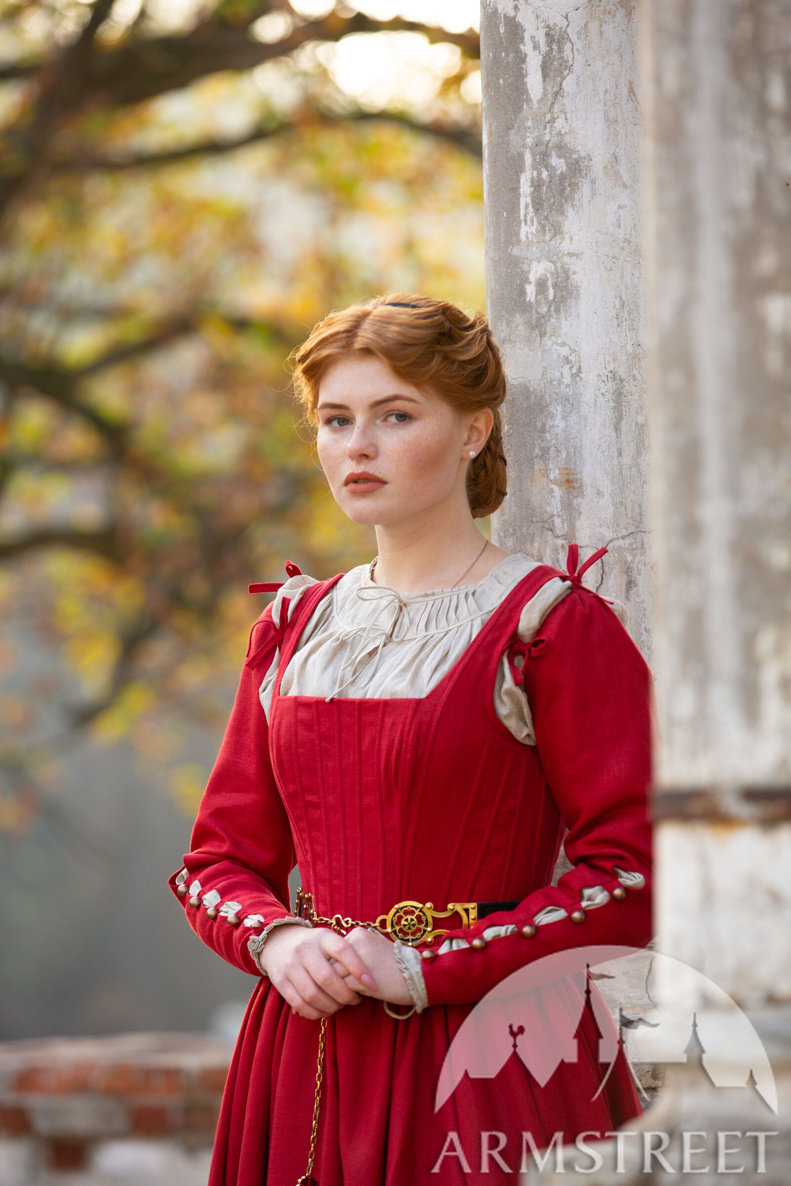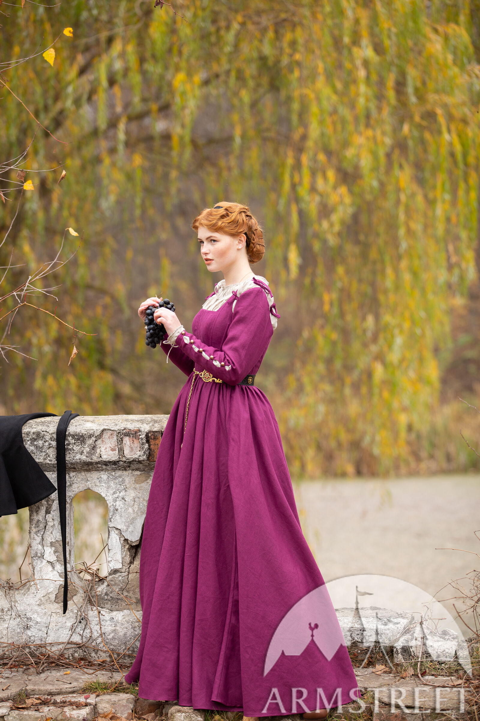 Dieses Kleid ist stark vom 16. Jahrhundert inspiriert, insbesondere von Woensam-Gemälden. Wir sehen, wie sich die Grundgewänder des XIV-XV. Jahrhunderts verzweigen und strukturierter und taillierter werden. Dieser Entwurf würde wahrscheinlich von einer Frau mit höherem Status getragen worden sein, da es schwierig wäre, die Schnürung des Rückens alleine vorzunehmen, sodass sie eine Dienerin oder Magd gehabt hätte. Die Basis des Kleides ist jedoch wunderbar einfach, so dass Sie viel Platz haben, es sich selbst zu gestalten und es so anzupassen, dass es zu Ihrer Person oder Ihrem Charakter passt. Wer weiß - vielleicht kann Ihre bäuerliche Figur einfach ihre eigene Rückenschnürung sehr gut machen!
