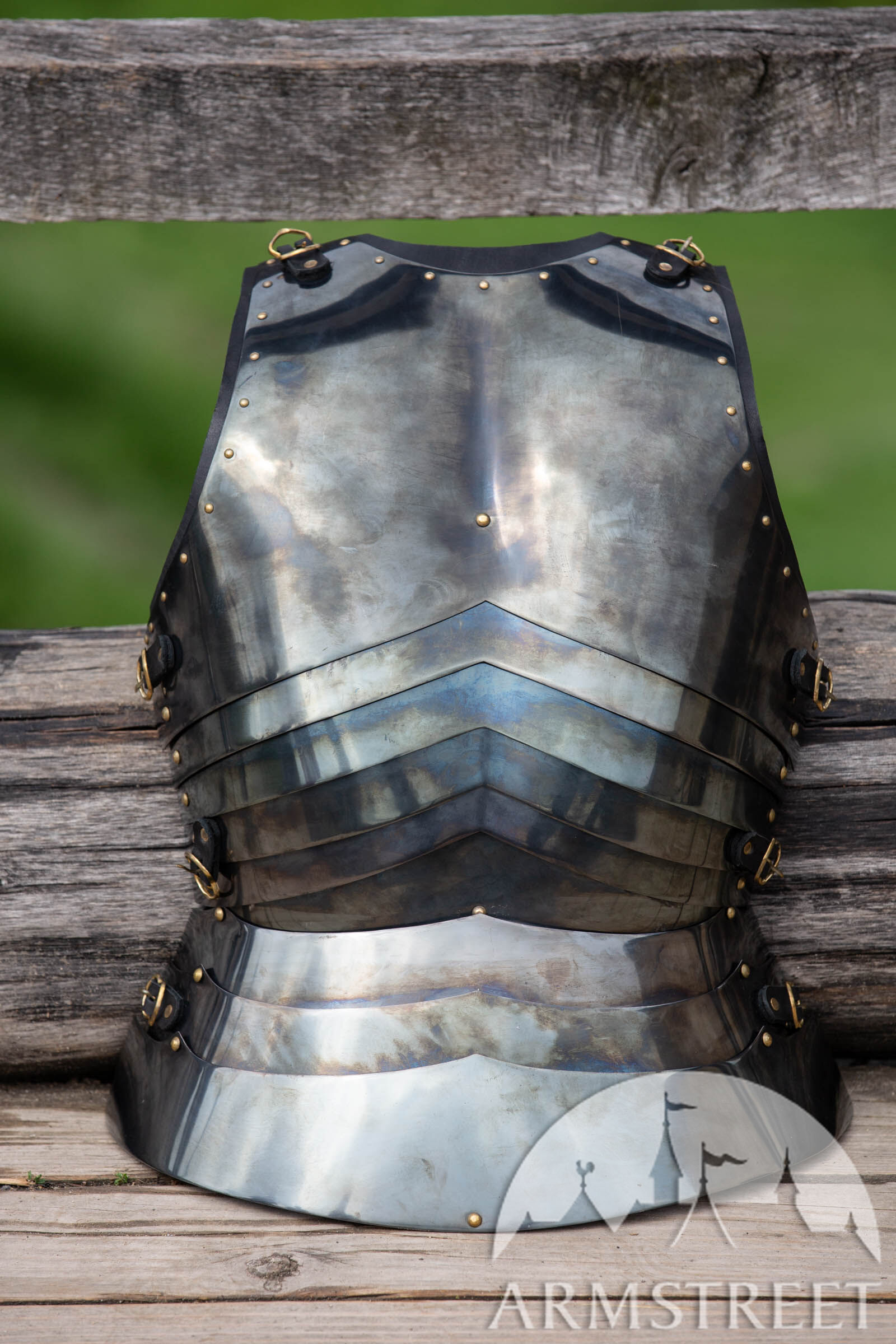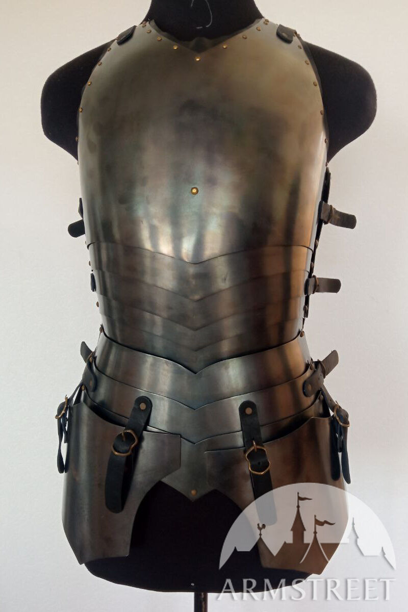 Dieser Brustpanzer ist der Silhouette und den Formen des 15. Jhdt nachempfunden und besteht aus einem einteiligen oberen Brustpanzer, der die Brust mit einem starren Schutz bedeckt. Darunter befinden sich fünf Gelenkarme, die sich der Taille anpassen. Diese Methode wird mit Gleitnieten und integrierten Lederbändern zusammengehalten und bietet unvergleichlichen Komfort und Bewegungsfreiheit. Aus der Taille schießen drei weitere Plättchen um die Hüften, um eine Reihe von Faulds zu bilden, die eine nahezu vollständige, ungehinderte Bewegung ermöglichen. Über den Lücken zwischen den Faulds und dem Beingurt befinden sich zwei Tassetten, die mit Schnallen an unteren Platten befestigt sind. Dieses Teil ist mit einer passenden artikulierten Rückenplatte ausgestattet, die fantastisch sitzt und Sie stilvoll schützt.