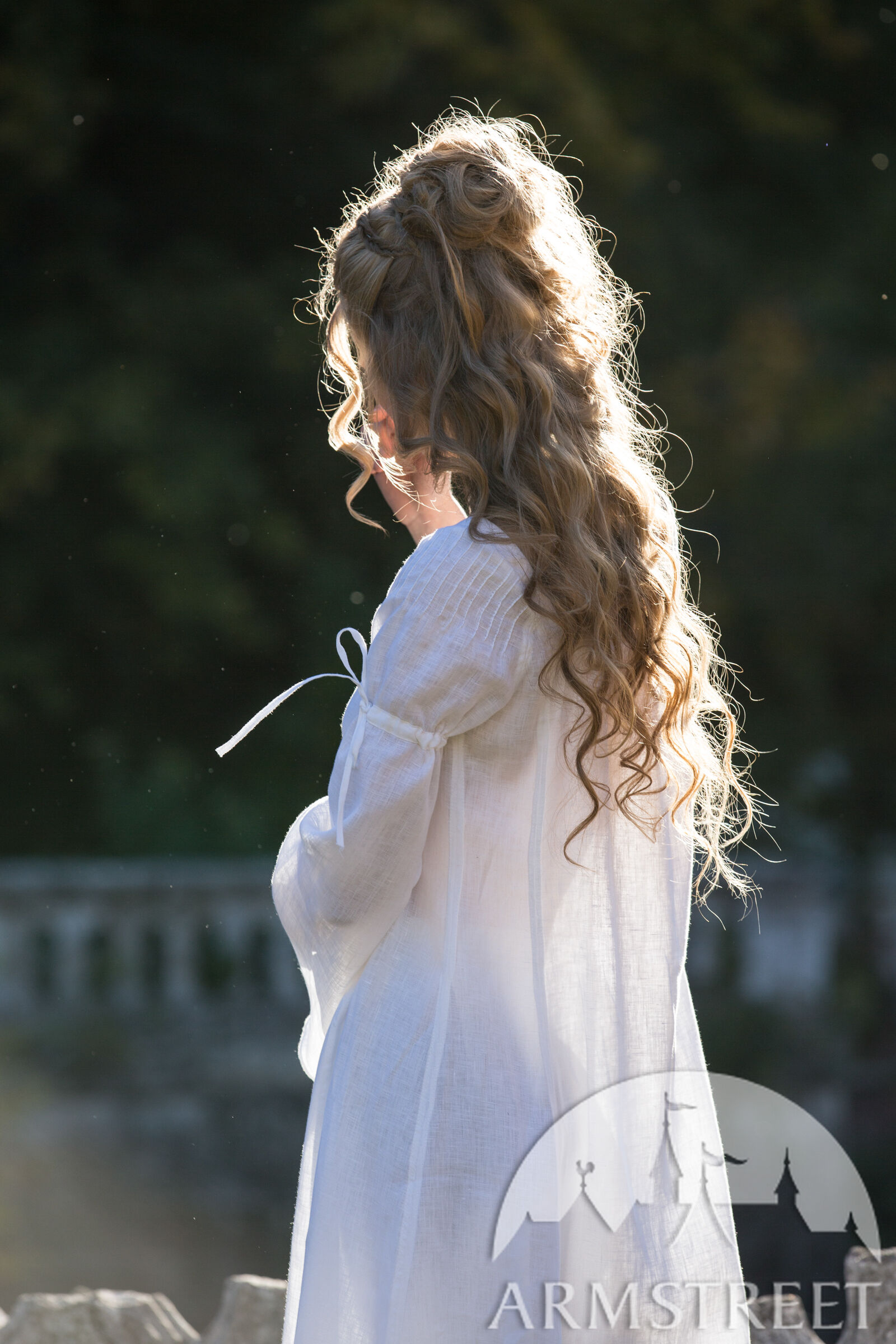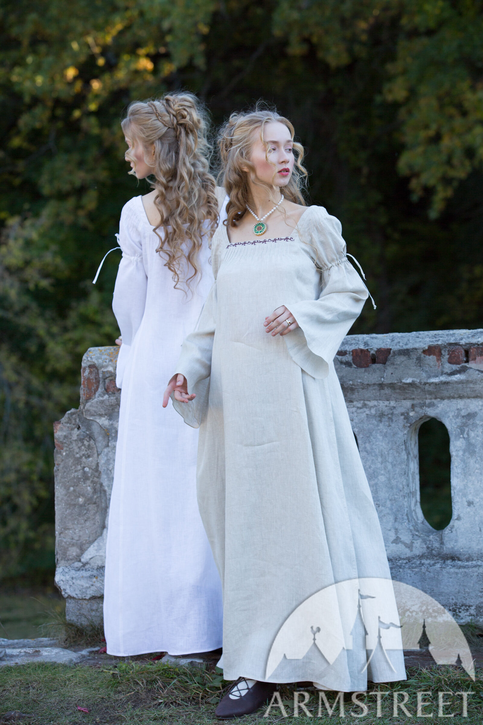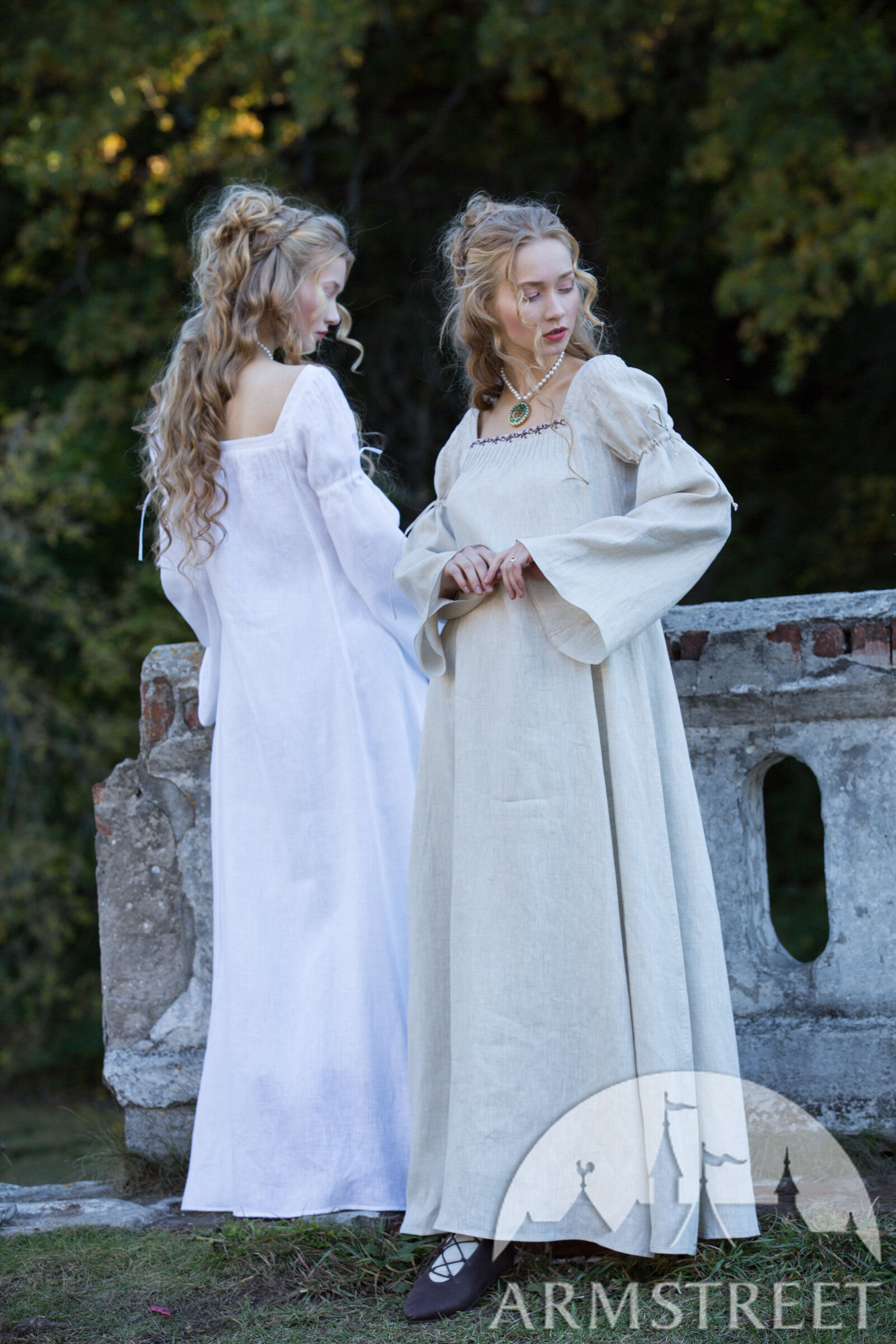 Dieses Hemd hat glockenförmige Ärmel, die sich mit Hilfe eines Leinenkordels am Bizeps sammeln. Winzige Falten an der Schulter schaffen einen femininen Hauch, der die verträumte Silhouette dieses Stücks unterstreicht. Ein viereckiger Ausschnitt verleiht diesem Hemd den unverkennbaren Renaissance-Look, der durch zierliche Falten über der Büste ergänzt wird. Von der Brust drapiert es locker über Ihren Körper, bedeckt Sie vollständig und endet zu Ihren Füßen. Sie enthält zusätzliche Keile an der Seite des Körpers, um das Gesamtvolumen des Rocks zu erhöhen. Dadurch entsteht ein Saum mit einem Durchmesser von etwa 3 m, der für solch ein Unterhemd großzügig ist!