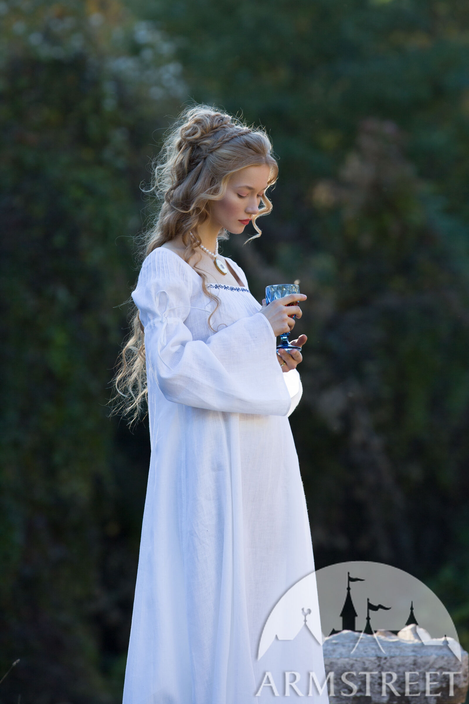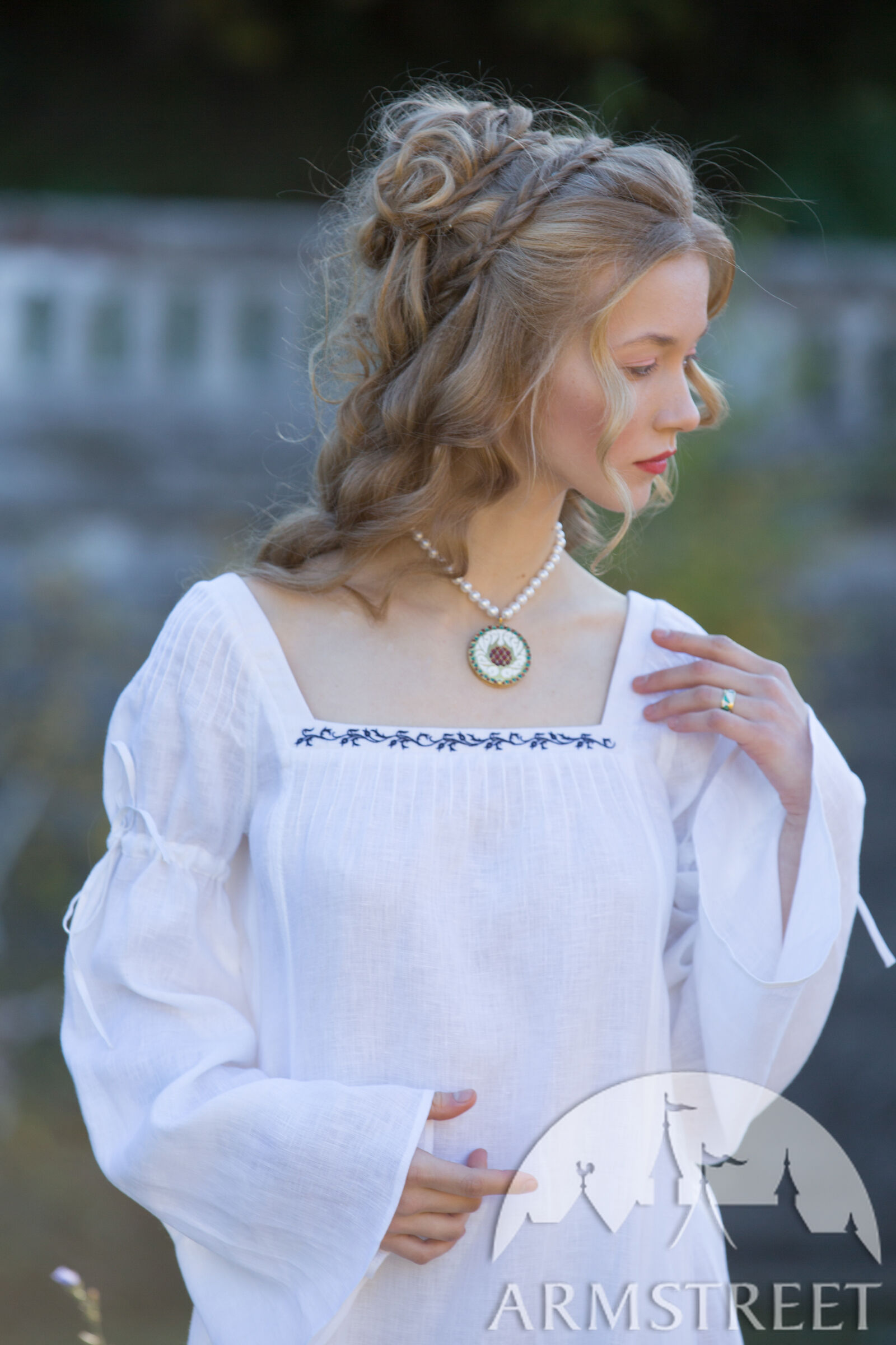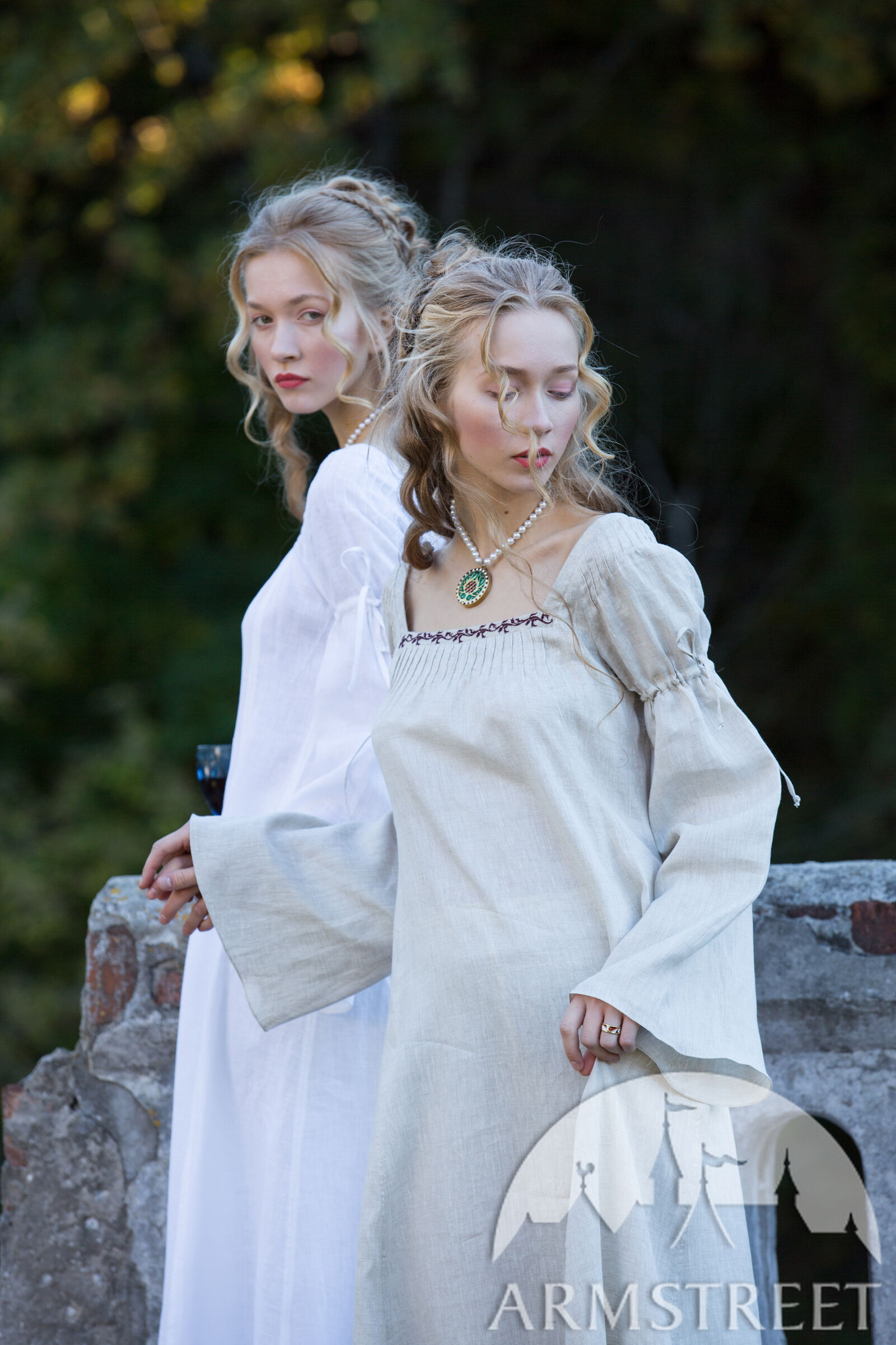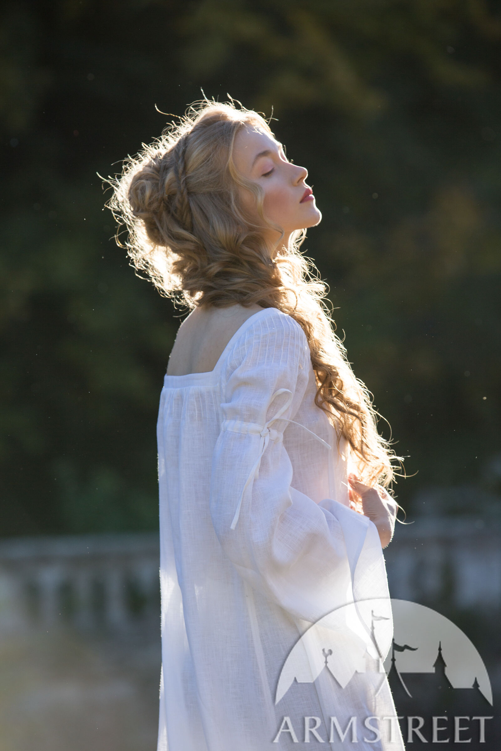 Dieses Hemd hat glockenförmige Ärmel, die sich mit Hilfe eines Leinenkordels am Bizeps sammeln. Winzige Falten an der Schulter schaffen einen femininen Hauch, der die verträumte Silhouette dieses Stücks unterstreicht. Ein viereckiger Ausschnitt verleiht diesem Hemd den unverkennbaren Renaissance-Look, der durch zierliche Falten über der Büste ergänzt wird. Von der Brust drapiert es locker über Ihren Körper, bedeckt Sie vollständig und endet zu Ihren Füßen. Sie enthält zusätzliche Keile an der Seite des Körpers, um das Gesamtvolumen des Rocks zu erhöhen. Dadurch entsteht ein Saum mit einem Durchmesser von etwa 3 m, der für solch ein Unterhemd großzügig ist!