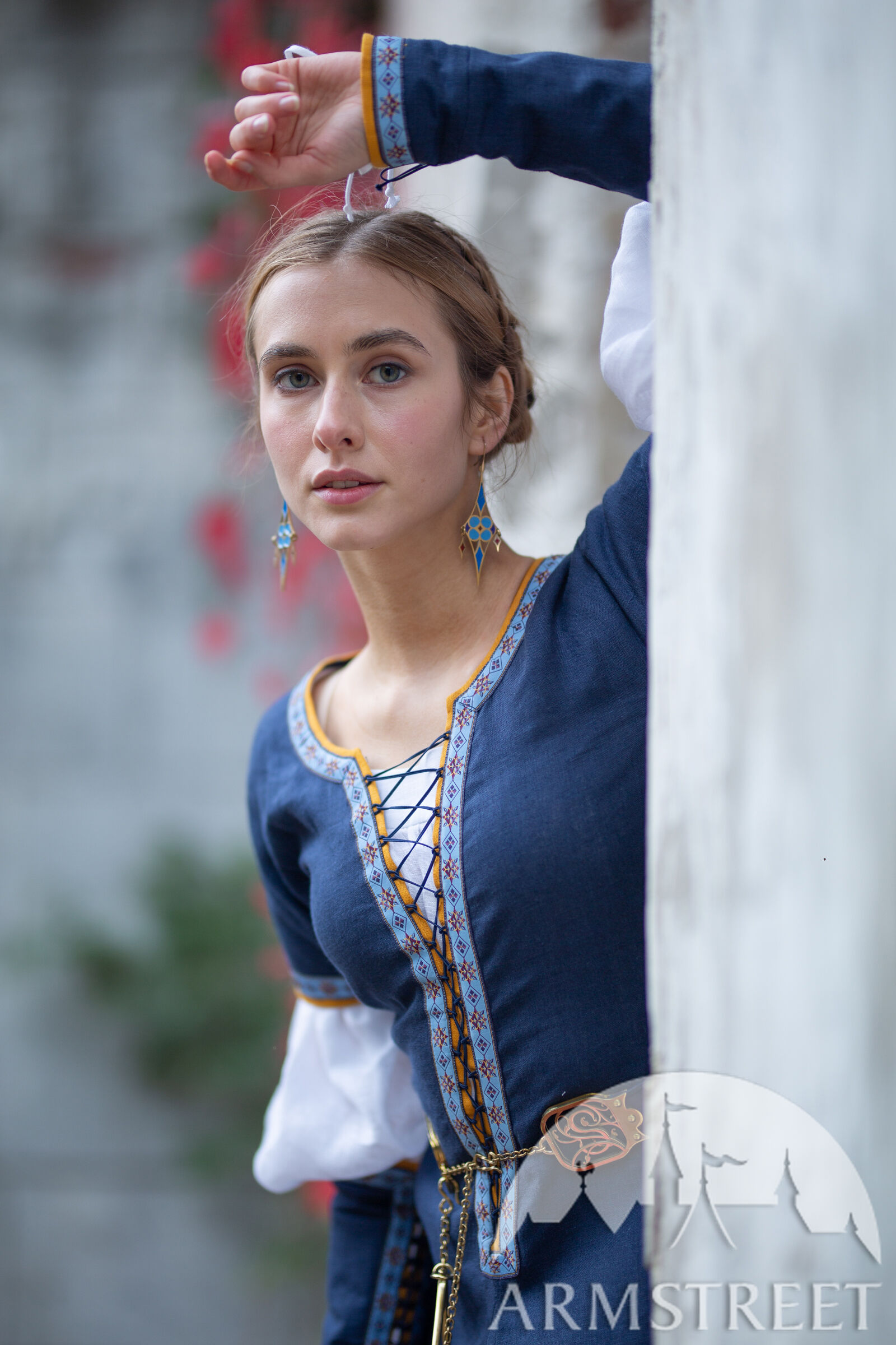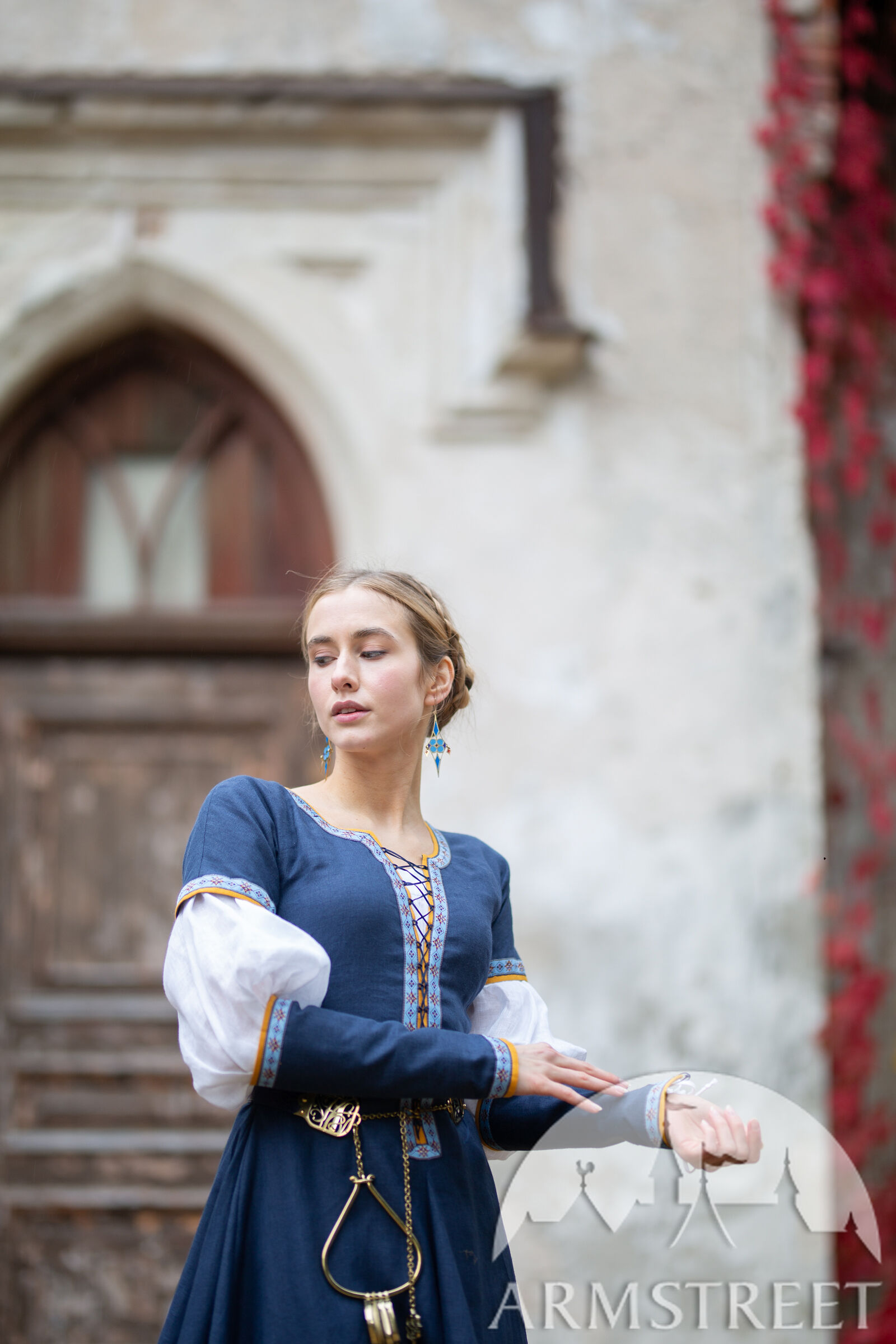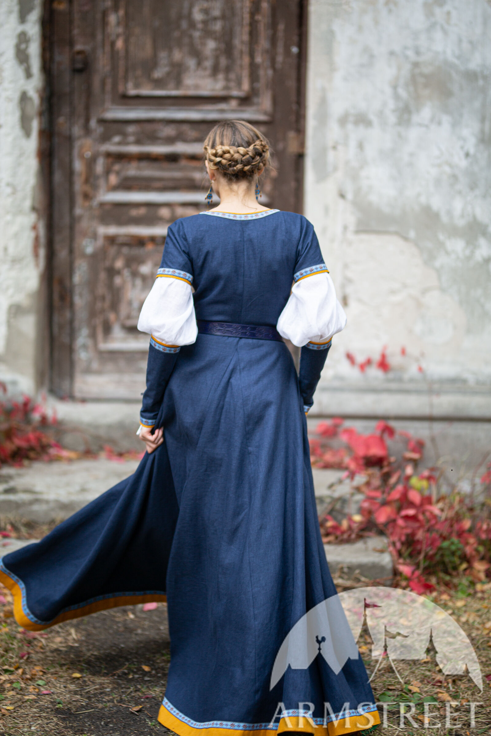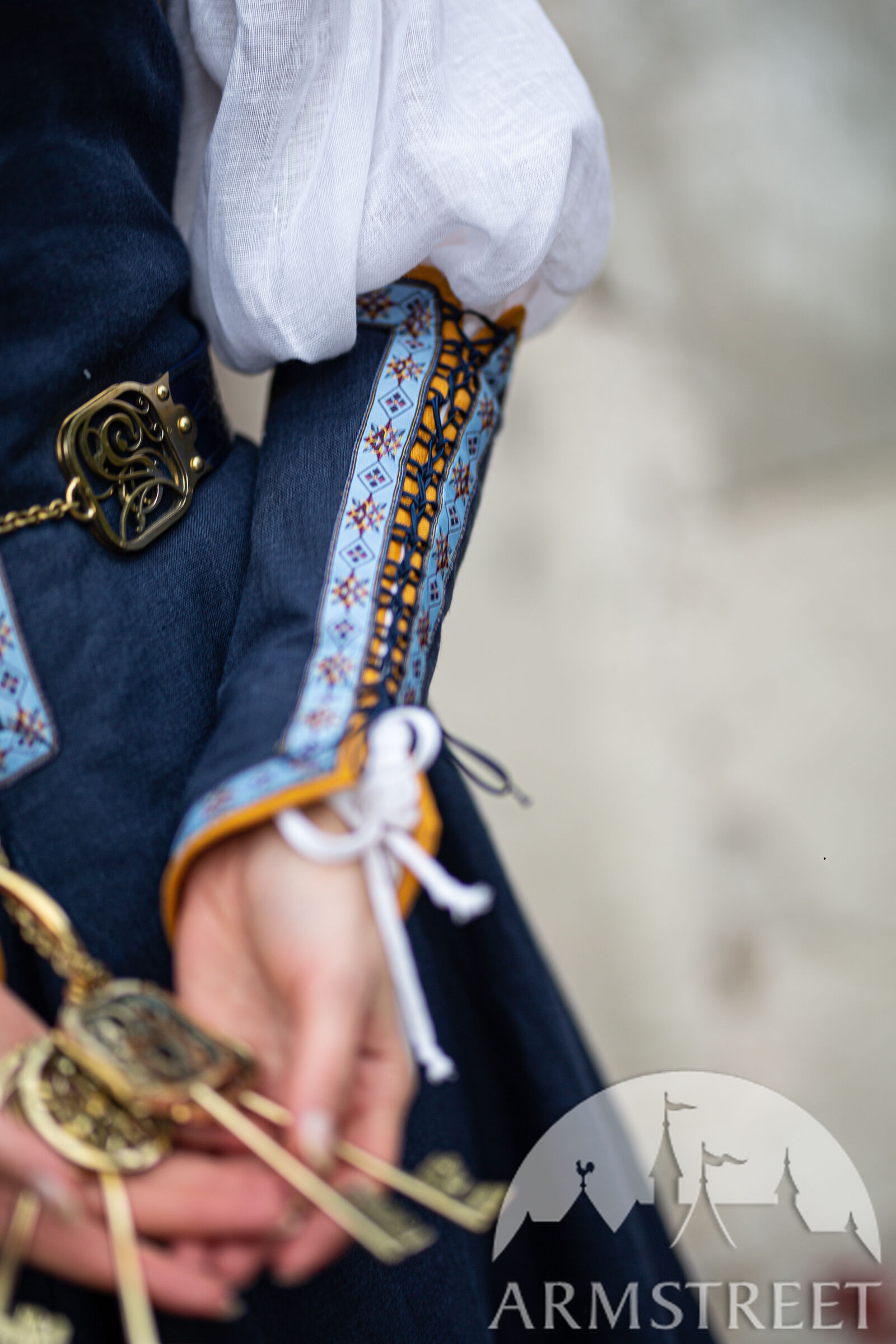 Anstatt Ärmel mit Schnürung am Kleid herzustellen, haben wir uns für frei schwebende Ärmel entschieden, die Armstulpen sehr ähnlich sind. Dadurch bleibt Ihr Ellbogen frei von sperrigem Stoff und sieht wunderschön aus. Die Ärmel bestehen aus dem gleichen Leinen und Borte, den Sie auf dem Rest des Kleides finden, mit der Hauptfarbe oben und einer Kontrastfarbe, die als Futter verwendet wird. Die Kordel wurde in die Nähte eingewebt, um Schlaufen zu schaffen, durch die die Schnürung geführt wird. Dadurch sind sie verstellbar und lassen sich leicht an Ihre Arme anpassen. Die Ärmel sind am Handgelenk leicht ausgestellt und reichen bis knapp unter den Ellbogen.