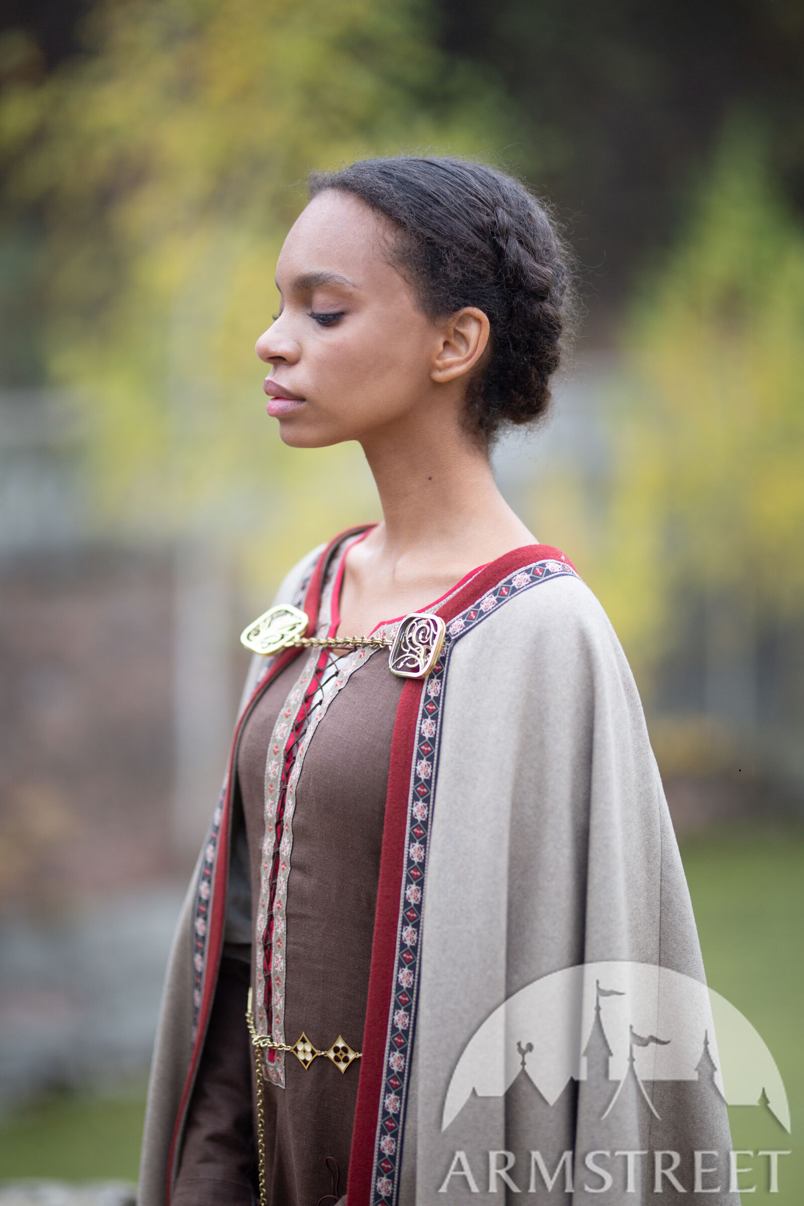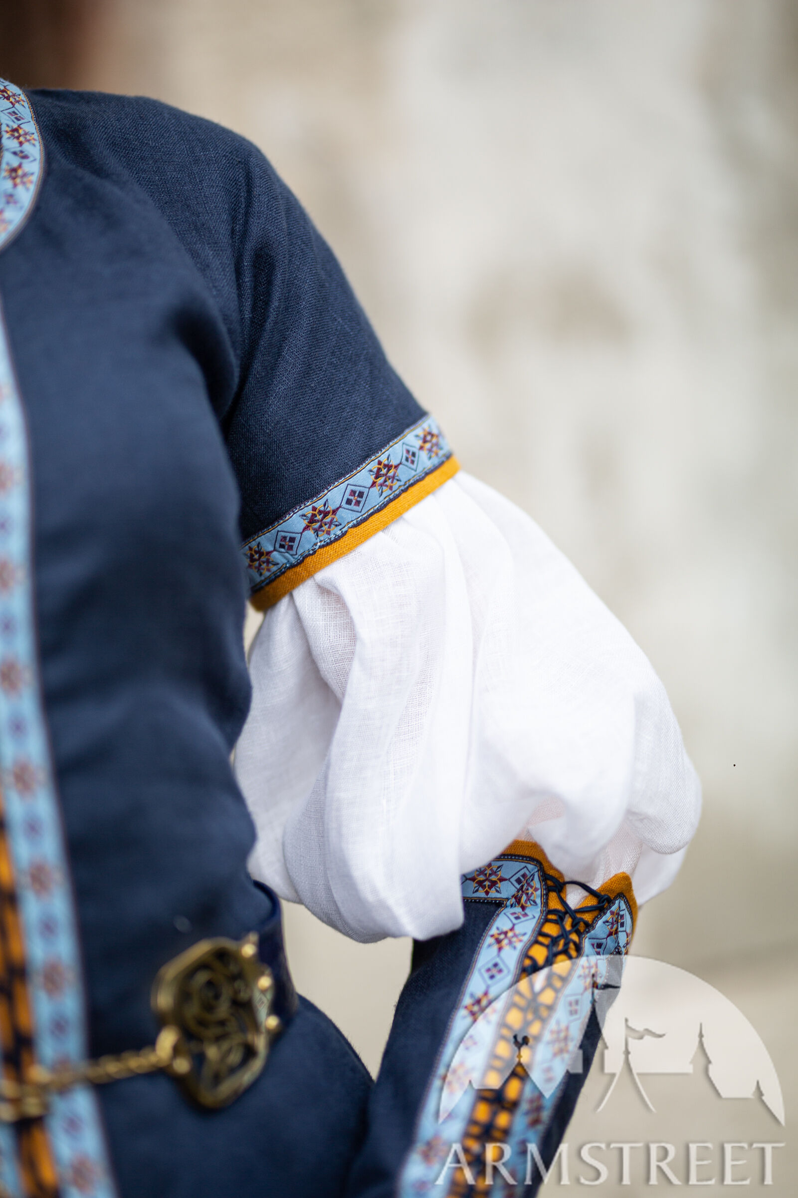 Die Borte des Kleides und der Ärmel wurde von unseren Künstlern entworfen, die sich von mittelalterlichen Mustern und geometrischen Formen inspirieren ließen. Da diese Verkleidung hier bei ArmStreet entworfen wurde, werden Sie sie nirgendwo anders finden. Das Design der Verzierung ist jedoch nicht der einzige erstaunliche Teil - die Art und Weise, wie sie auf das Kleid aufgetragen wird, ist ebenso atemberaubend. Am Ausschnitt und an den Ärmeln sind 7 mm Schrägband aus Leinen mit der Zierleiste aufgenäht, um einen kontrastierenden Rand zu erhalten. Die Unterseite des Kleides ist ähnlich verziert, mit 4-5 cm Leinen mit Besatz.