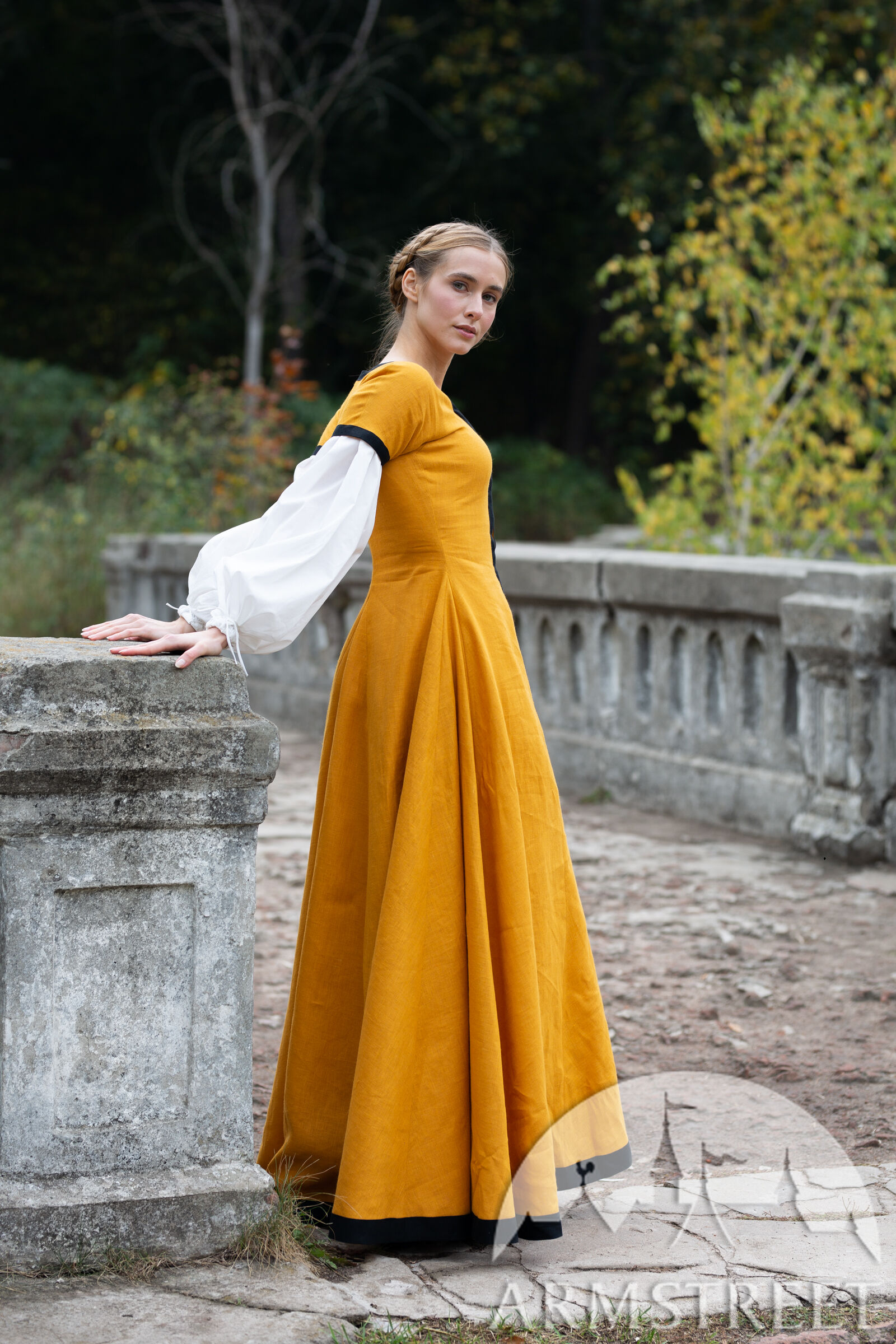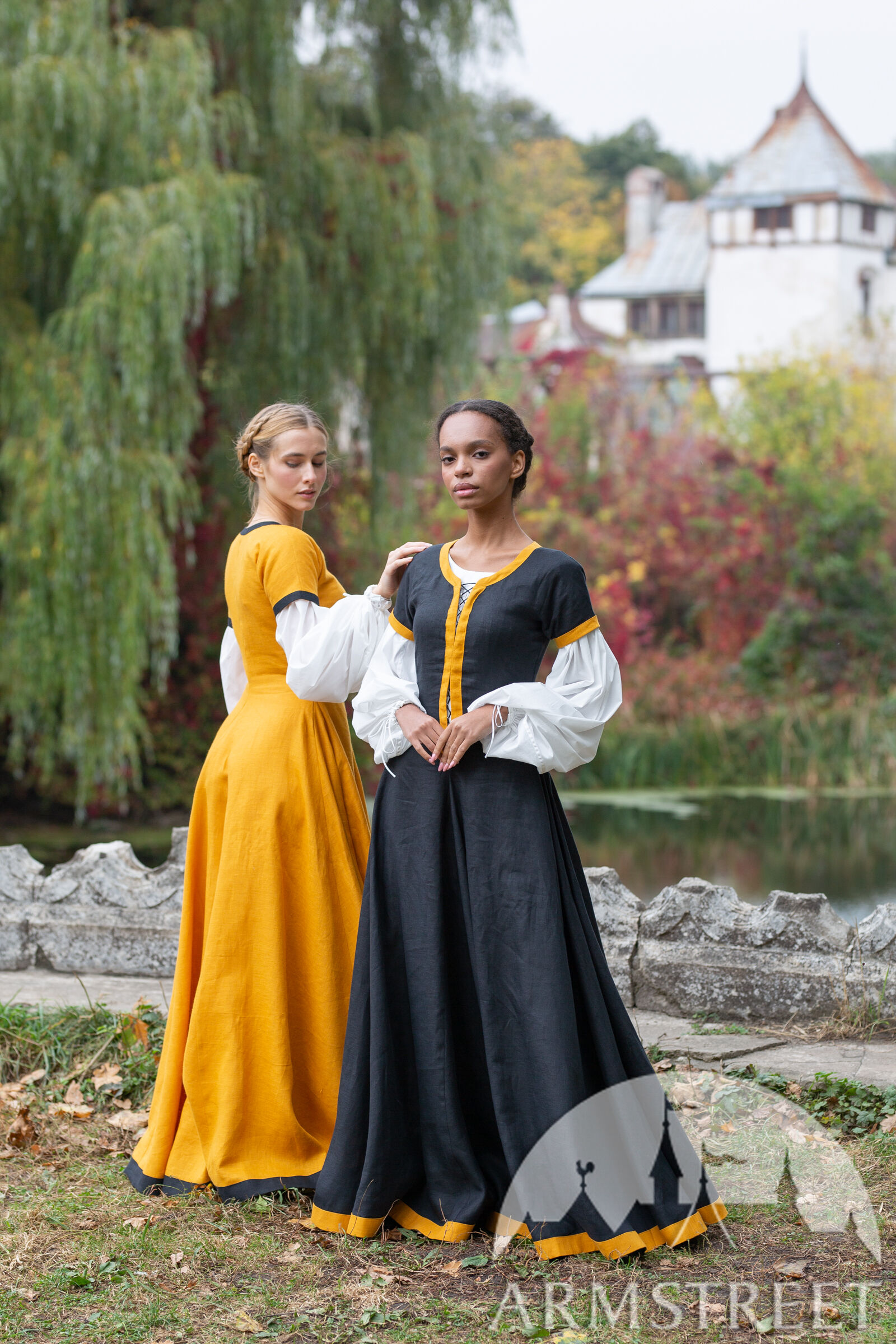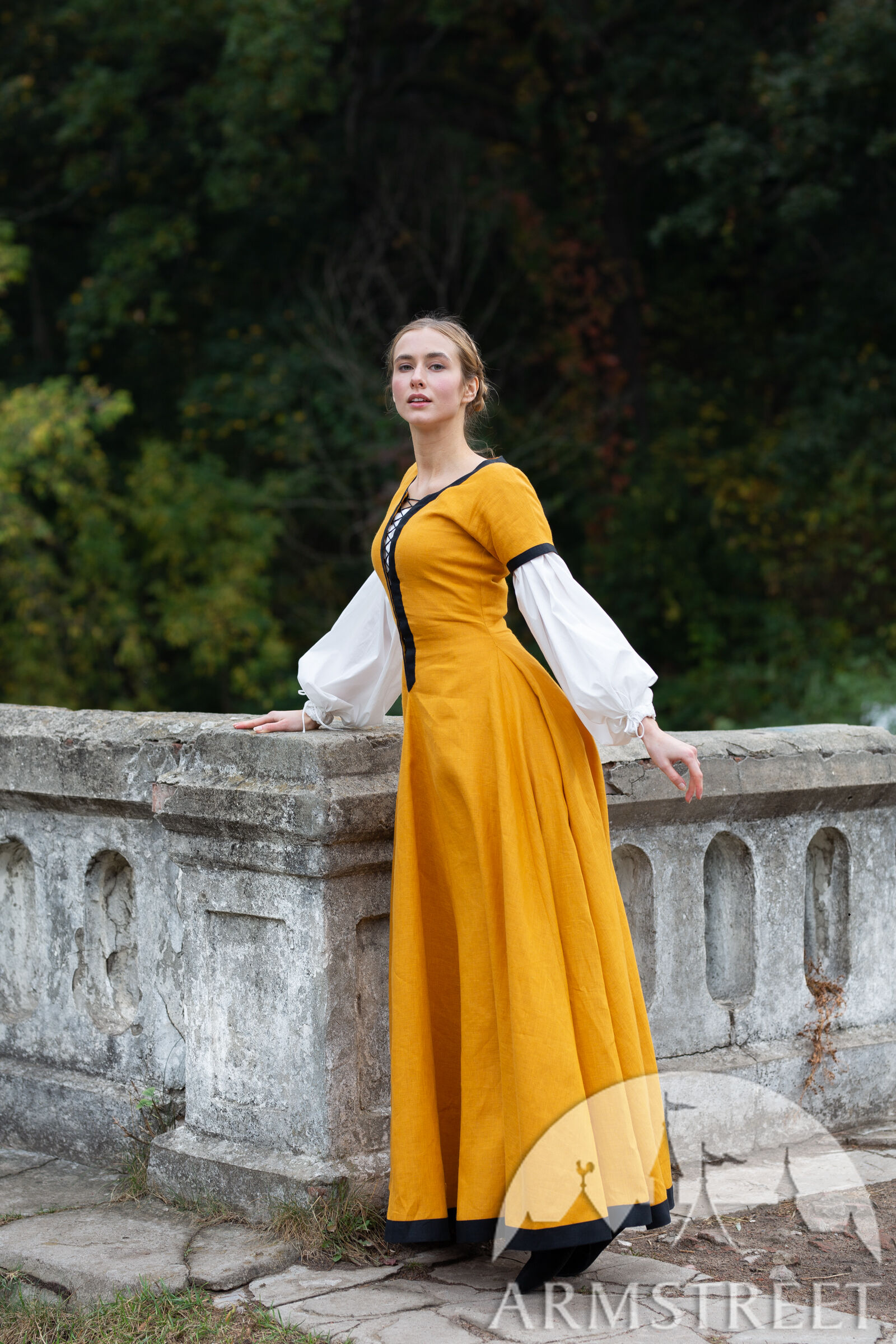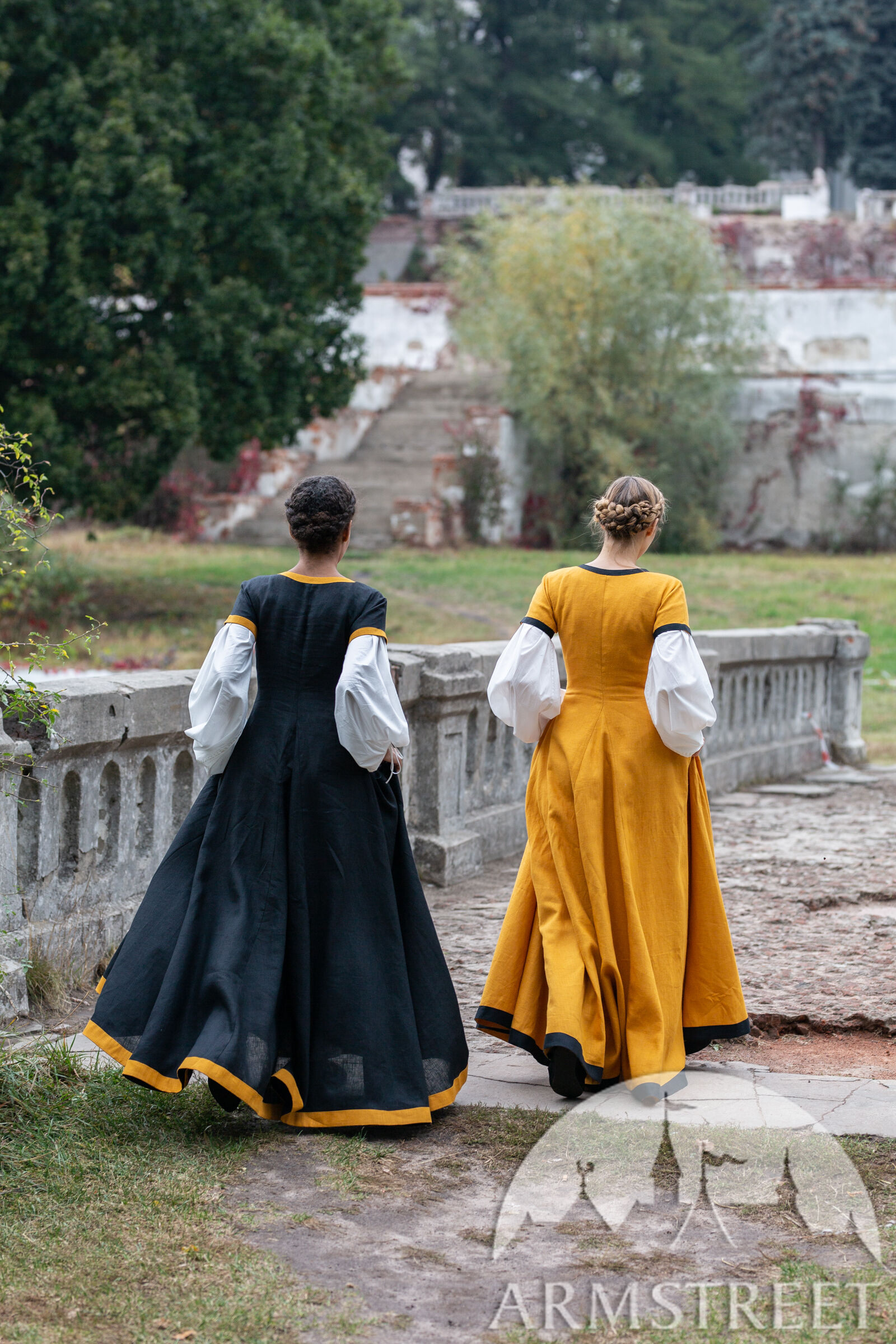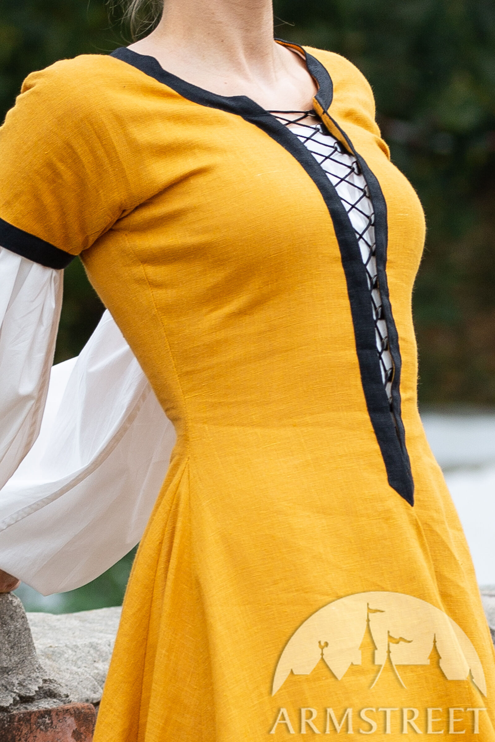 Das Design dieses Kleides stammt ursprünglich aus den Wünschen unserer Kunden nach einem mittelalterlichen Kleid mit kurzen Ärmeln. Bei vielen Veranstaltungen bei heißem Wetter stellten die Leute fest, dass langärmelige Kleider etwas zu eng waren. Unsere Lösung war dieses wundervolle Kleid, das mittelalterlich aussieht, aber schöne kurze Ärmel hat, die Sie je nach Komfort mit bloßen Armen tragen oder mit einem leichten Hemd kombinieren können. Es gibt keine spezifische historische Inspiration, aber der Stil kann mit dem Cotehardie der Frauen und anderen Beispielen für eng anliegende Kleider aus dem XIV-XV Jhdt verglichen werden.