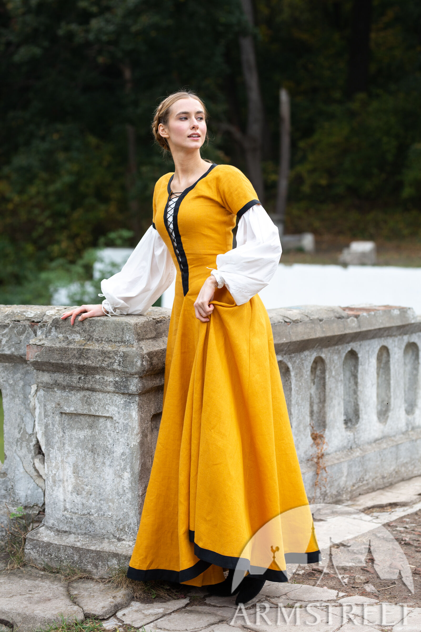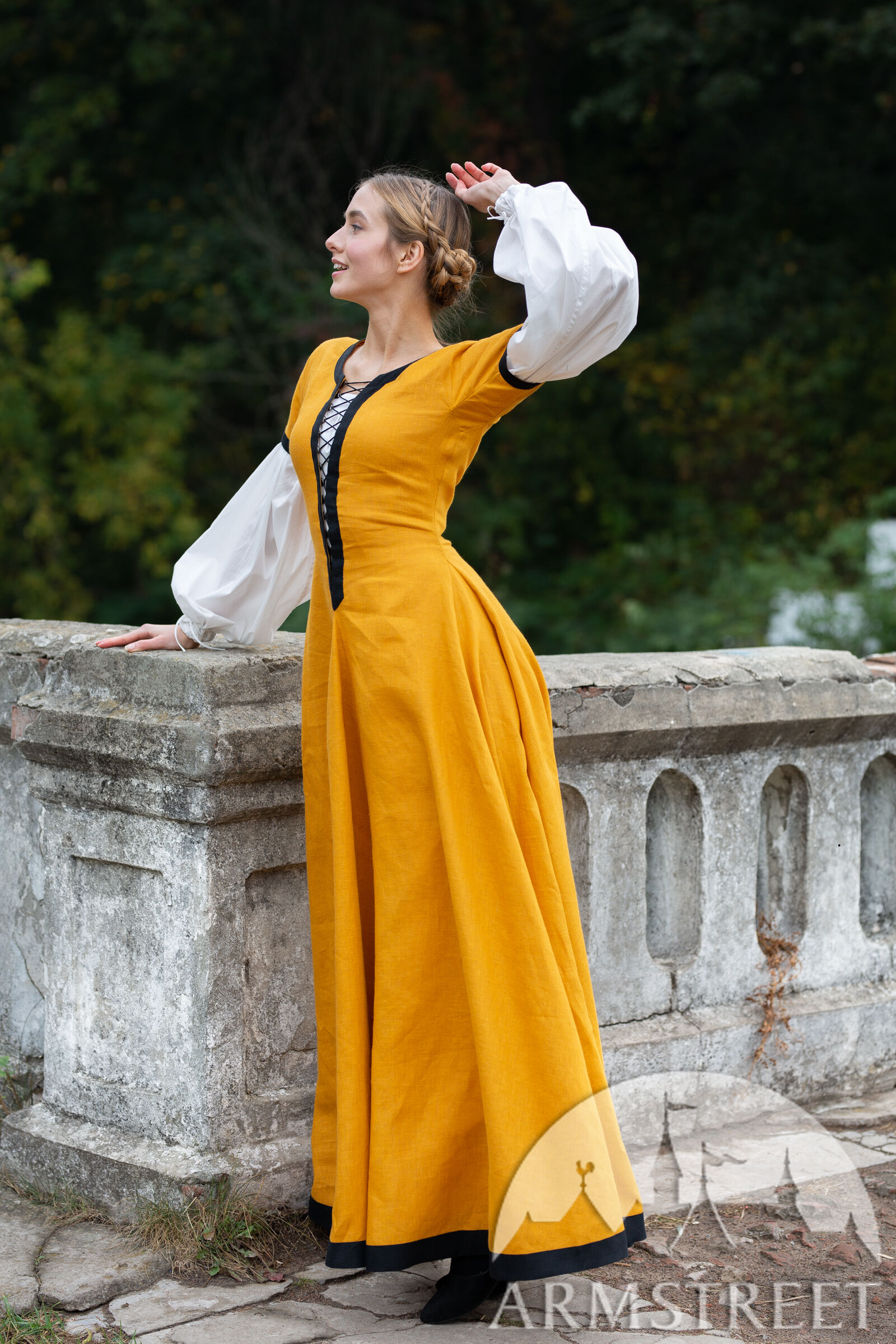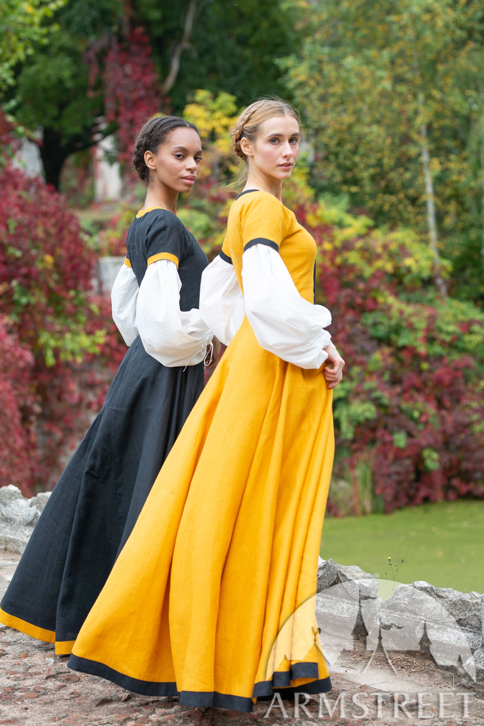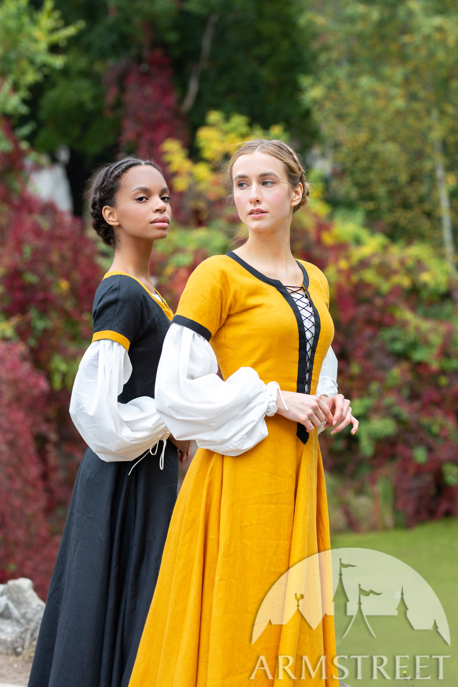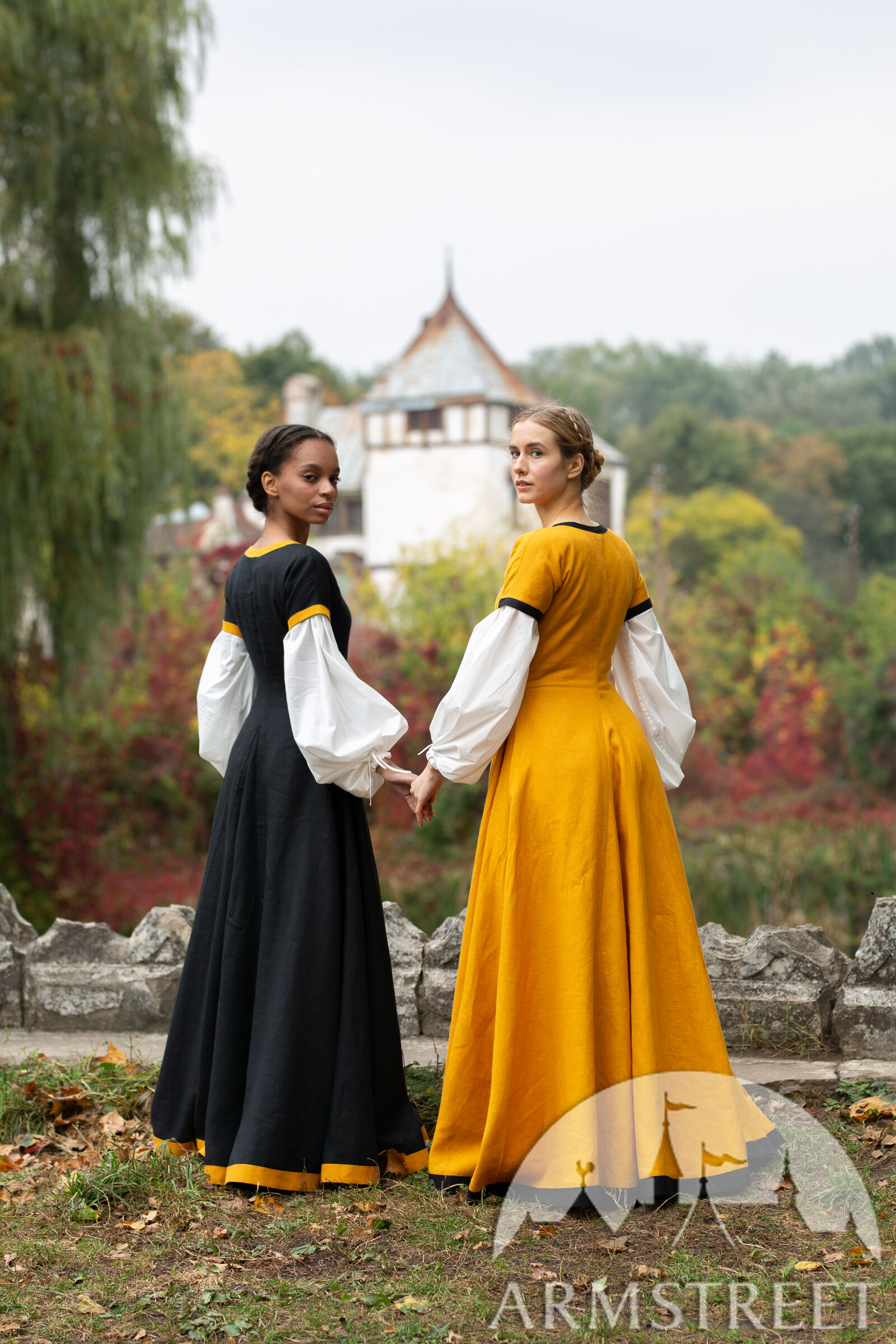 Das Design dieses Kleides stammt ursprünglich aus den Wünschen unserer Kunden nach einem mittelalterlichen Kleid mit kurzen Ärmeln. Bei vielen Veranstaltungen bei heißem Wetter stellten die Leute fest, dass langärmelige Kleider etwas zu eng waren. Unsere Lösung war dieses wundervolle Kleid, das mittelalterlich aussieht, aber schöne kurze Ärmel hat, die Sie je nach Komfort mit bloßen Armen tragen oder mit einem leichten Hemd kombinieren können. Es gibt keine spezifische historische Inspiration, aber der Stil kann mit dem Cotehardie der Frauen und anderen Beispielen für eng anliegende Kleider aus dem XIV-XV Jhdt verglichen werden.
