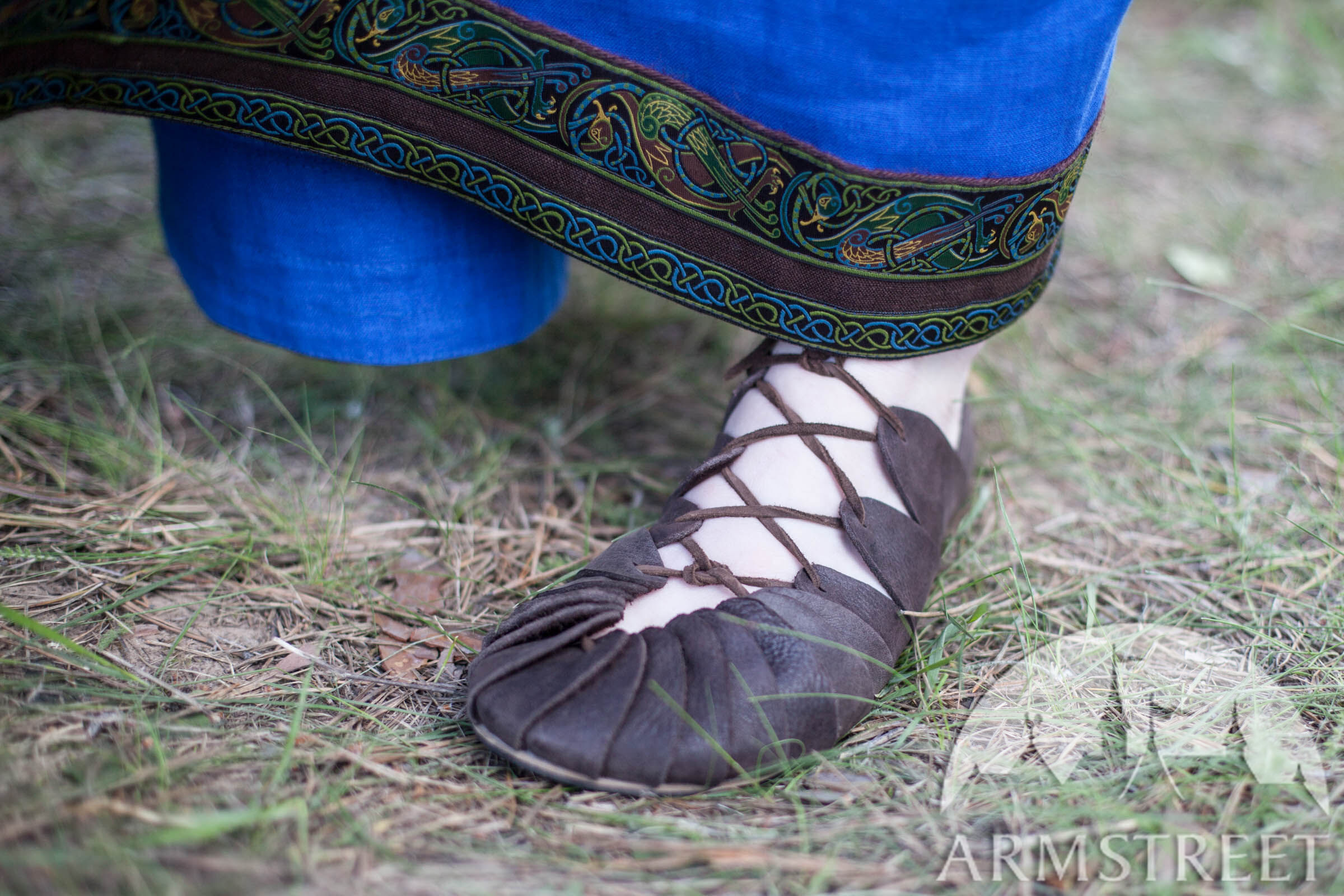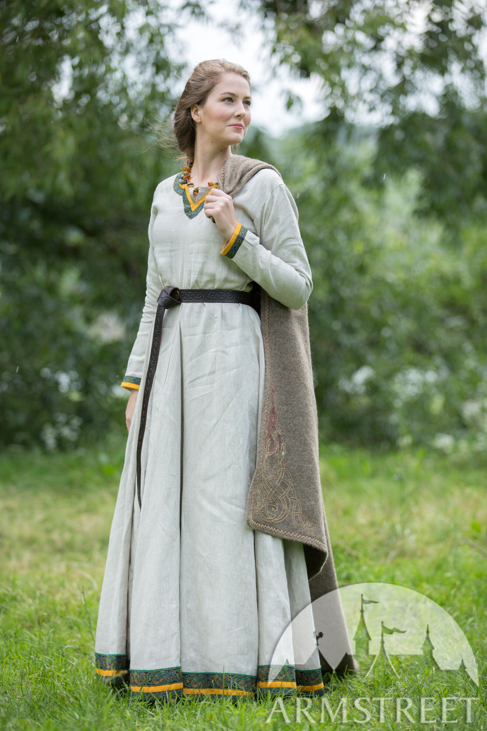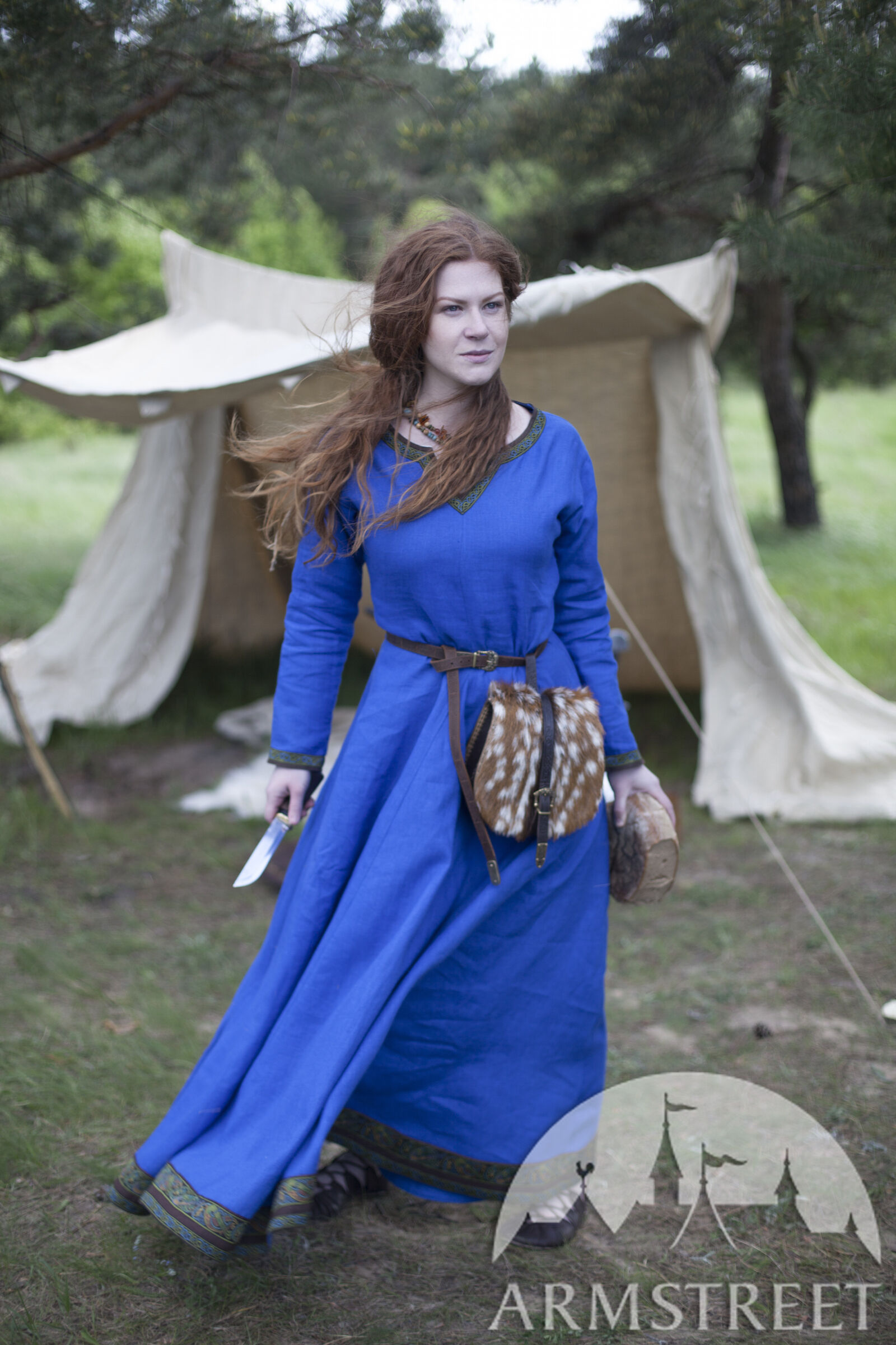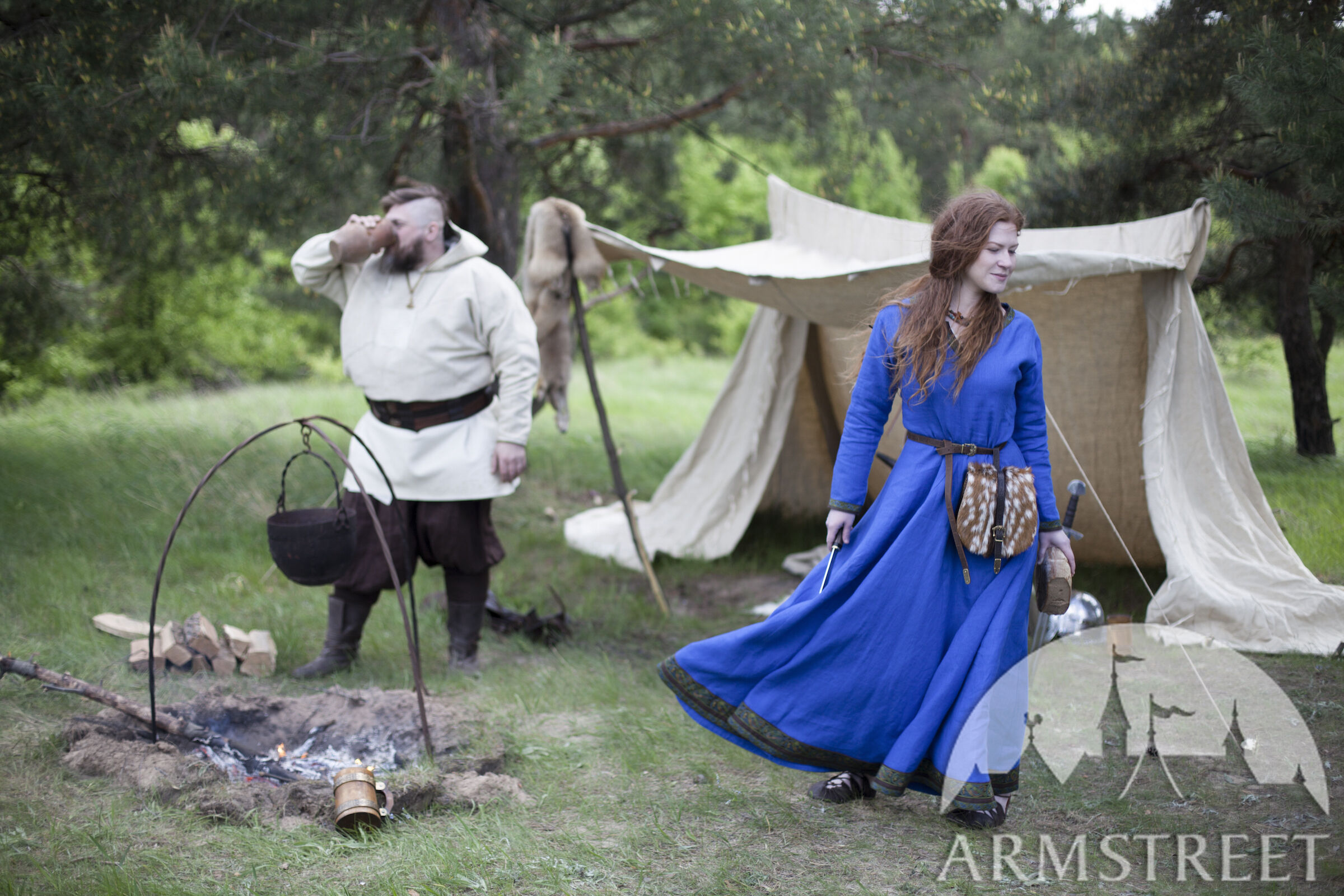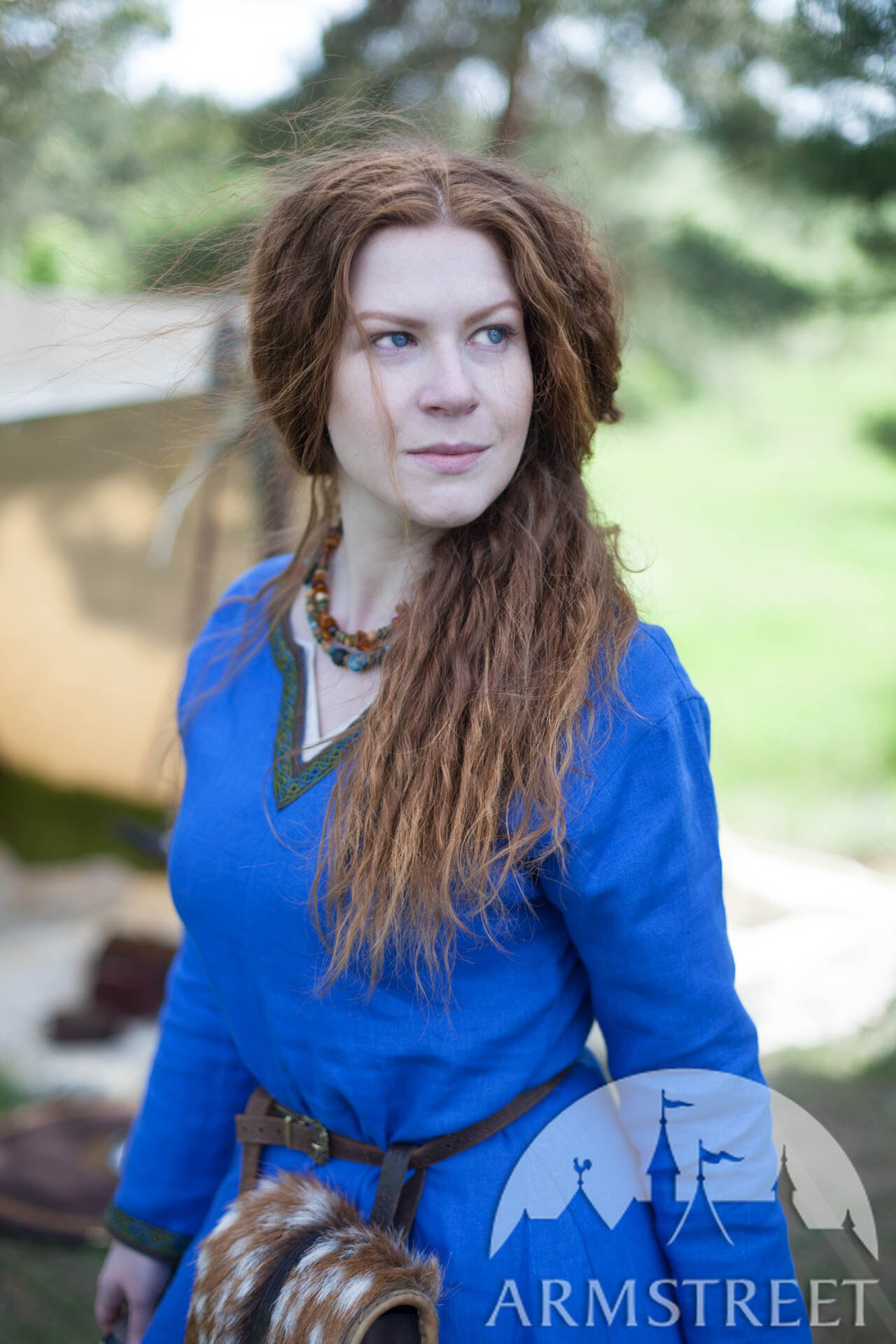 Allerdings haben wir es versucht, die Schönheit der weiblichen Figur zu betonen, so viel wie die Wikinger Kleidung das ermöglicht - mit seinem freien und schwimmenden Schnitt. Recht geräumig im Bizeps und an Handgelenk verengt, ist es deshalb möglich, die Ärmel in allen täglichen Aufgaben beschäftigt zu machen. Ein weiter Rock erreicht die Knöchel, deshalb begrenzt den Schritt nicht, und betont eine feminine Silhouette.
