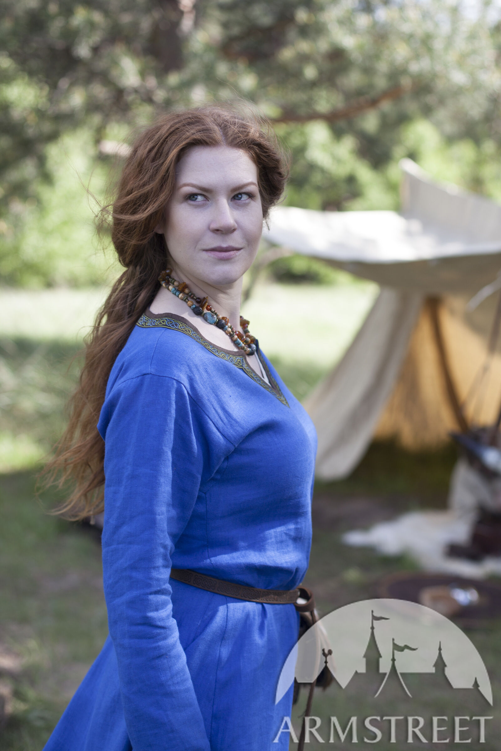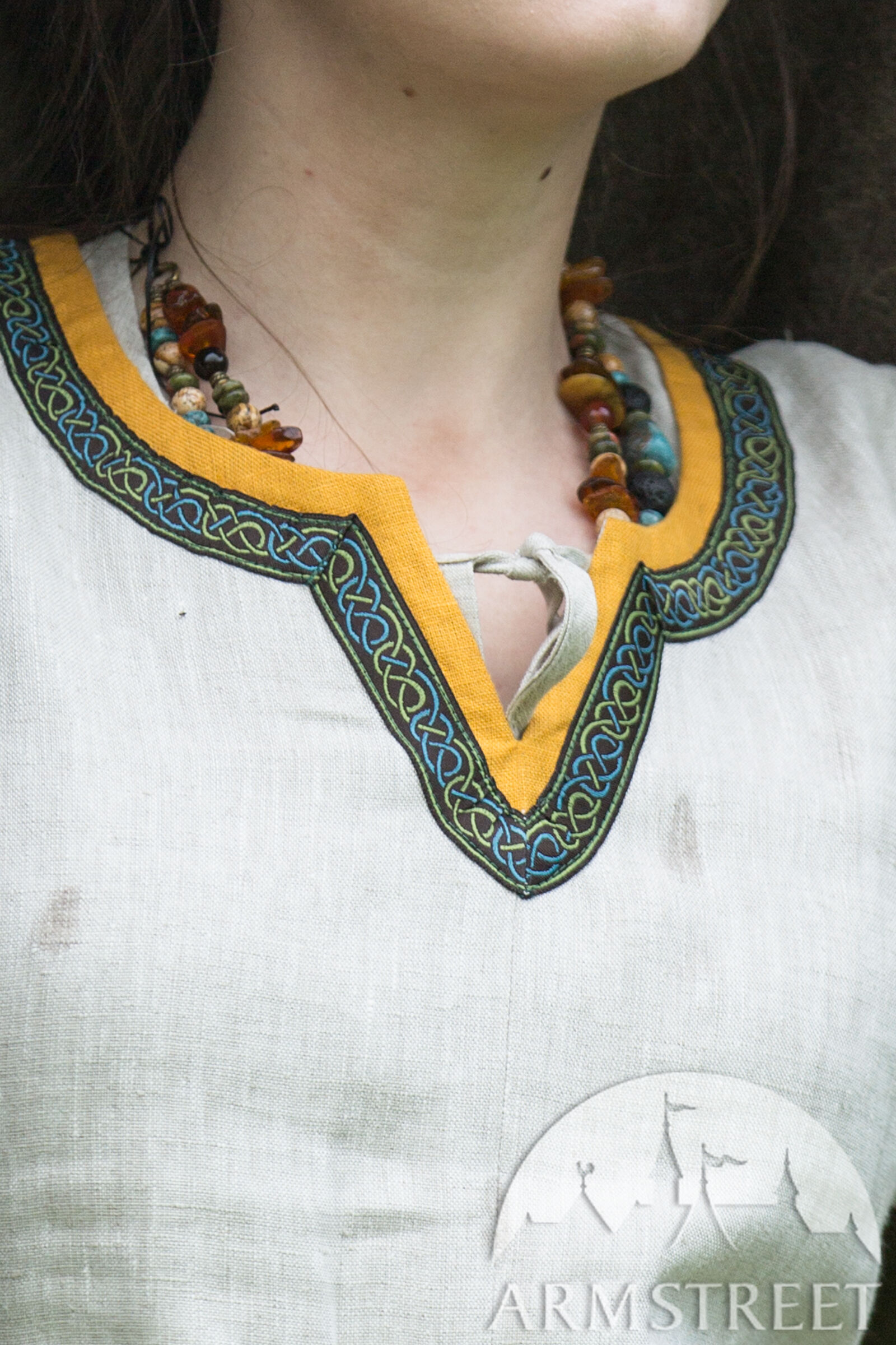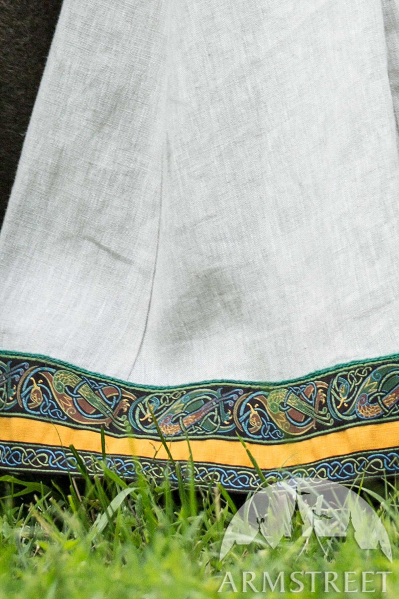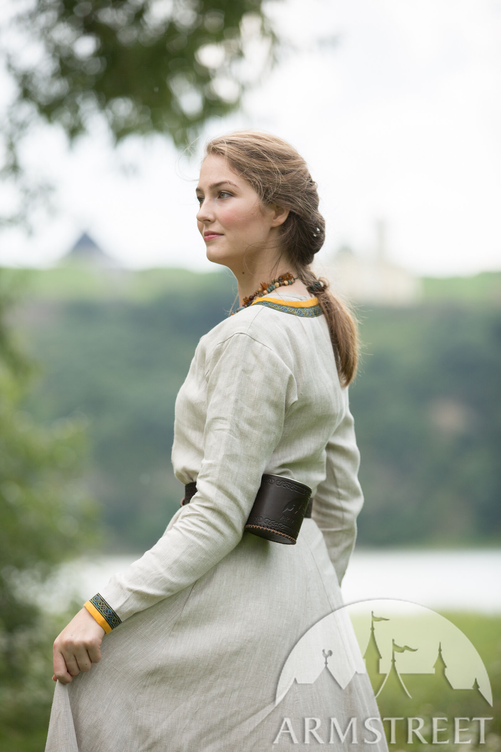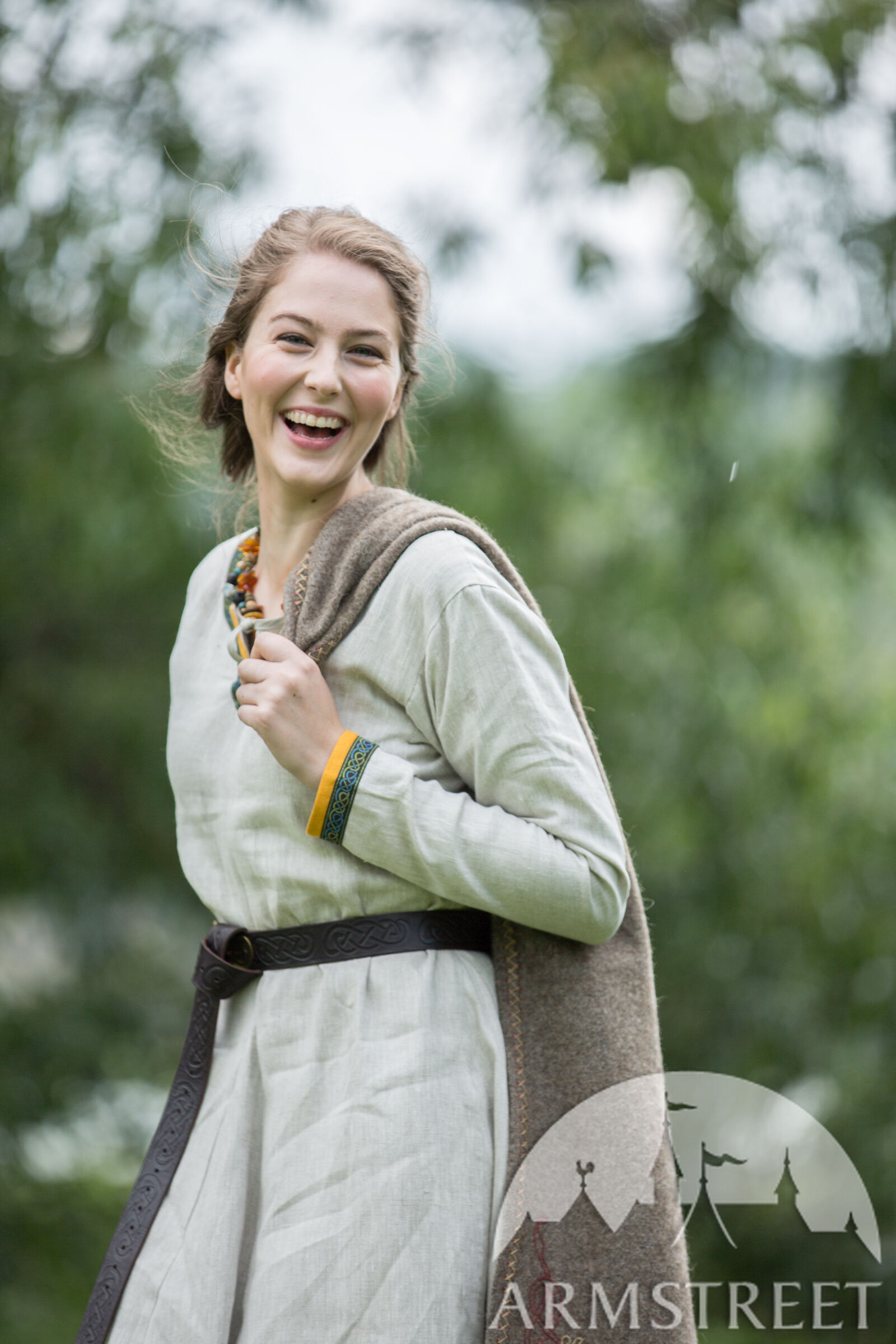 Traditionelle T-Form Leinentunika mit Kontrastnaht, exklusive Borte und mit einer gefärbten Jutefaser verziert. Die Silhouetten der antiken Verkleidung der normannischen Krieger war sehr ähnlich mit der Damen-Verkleidung jener Zeiten.