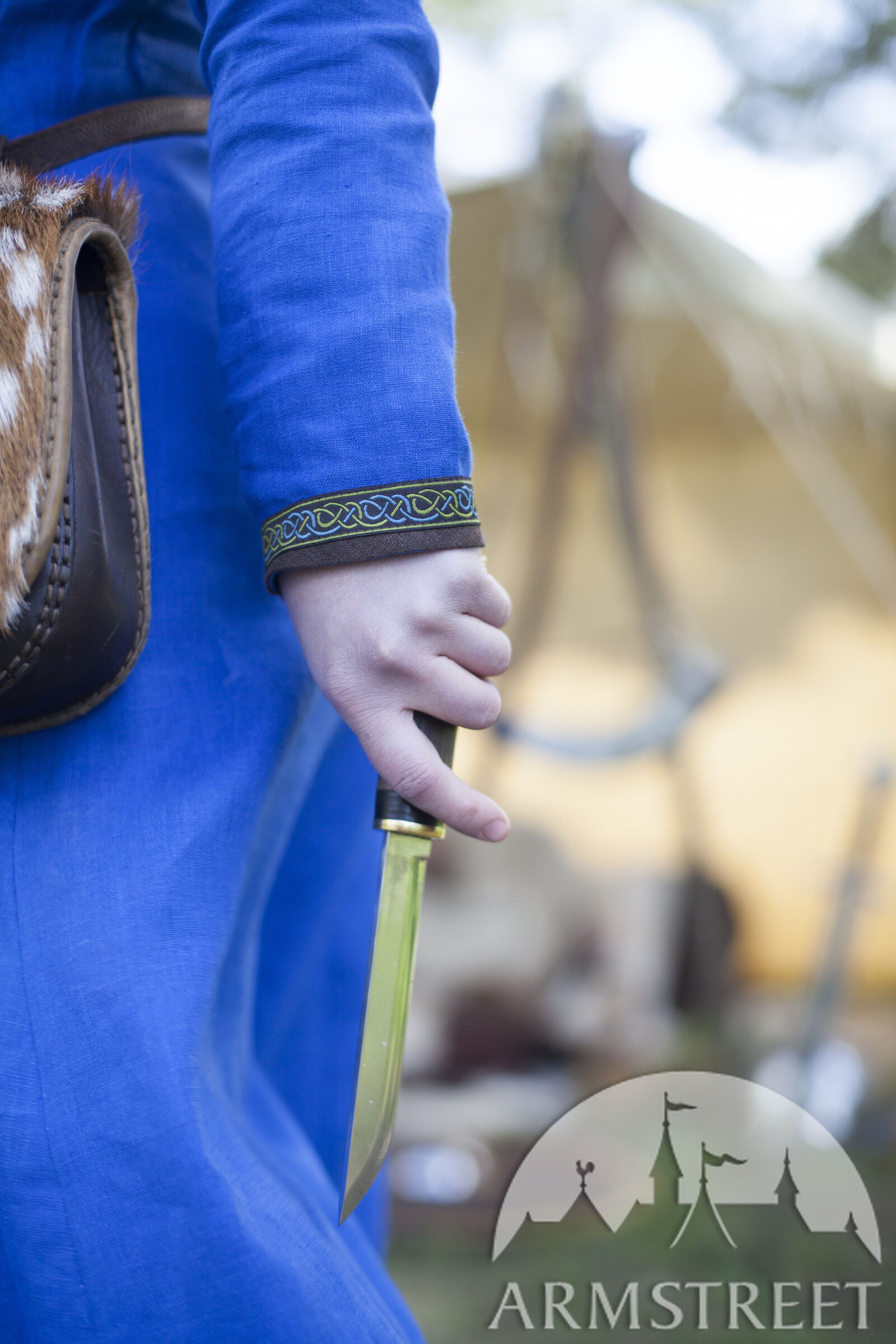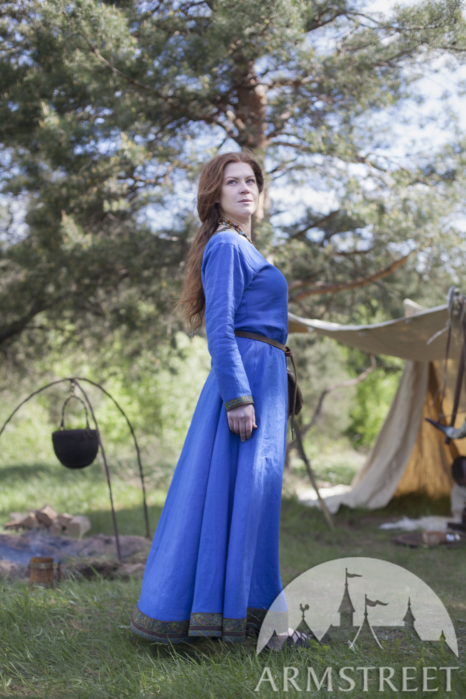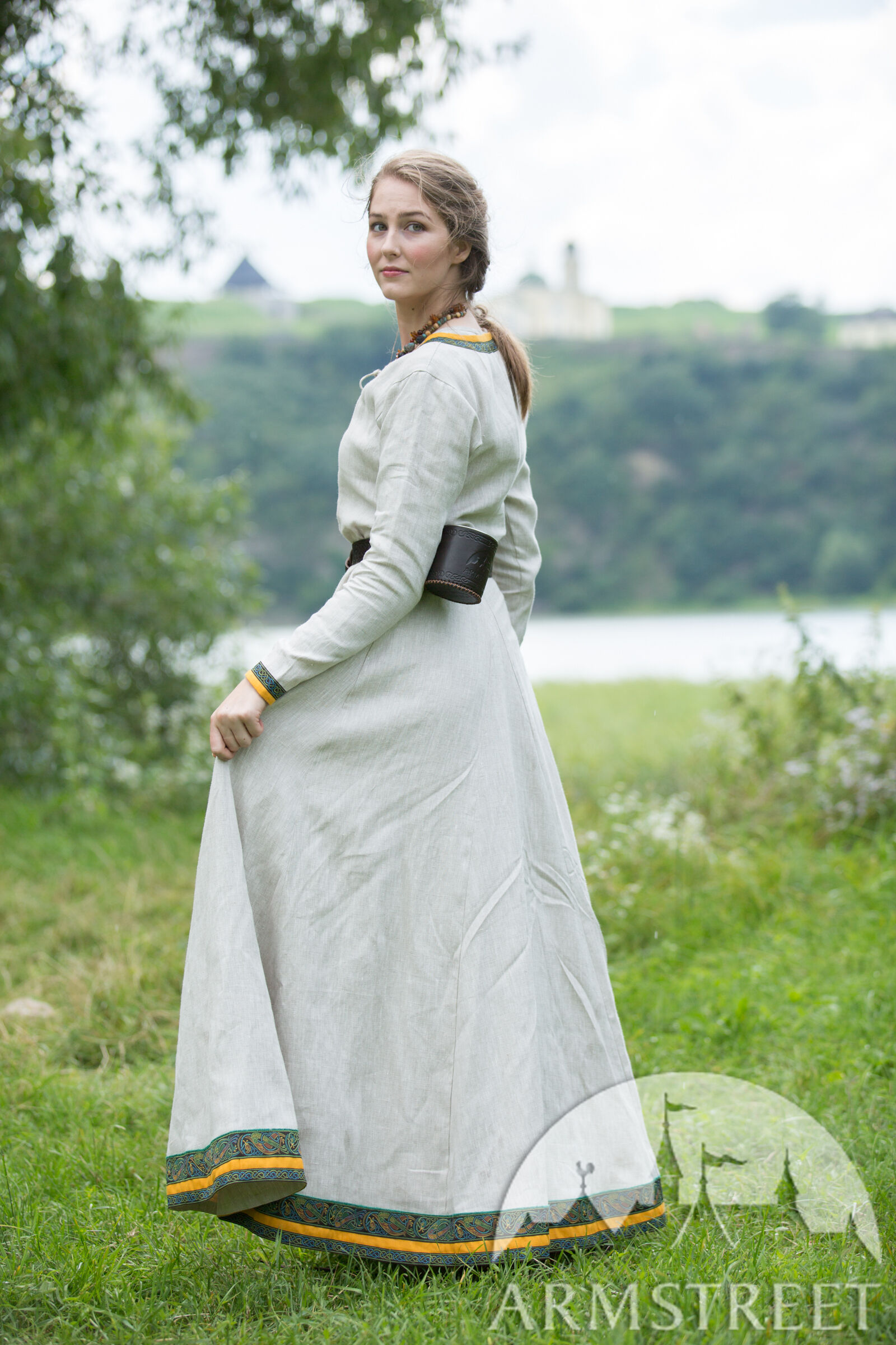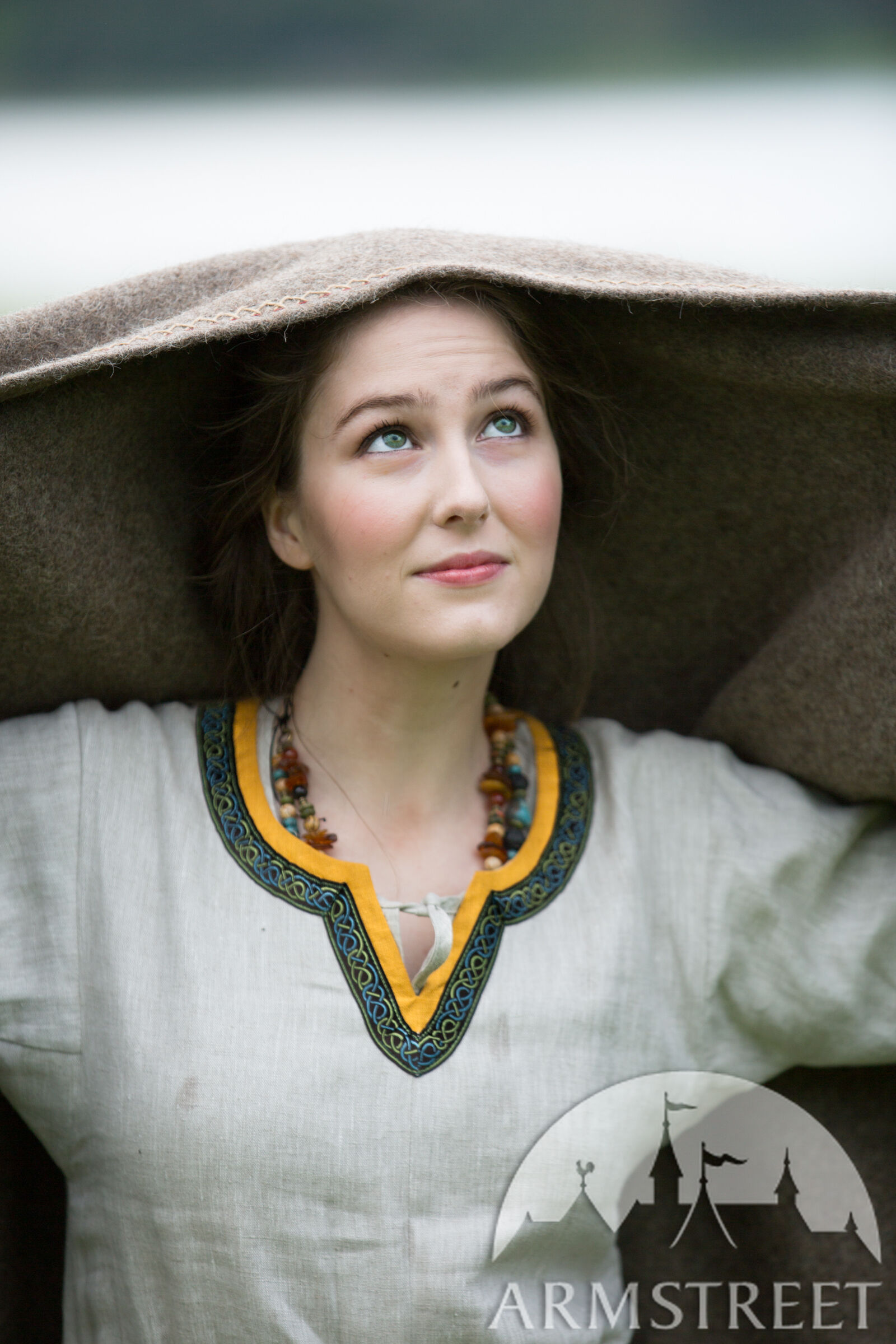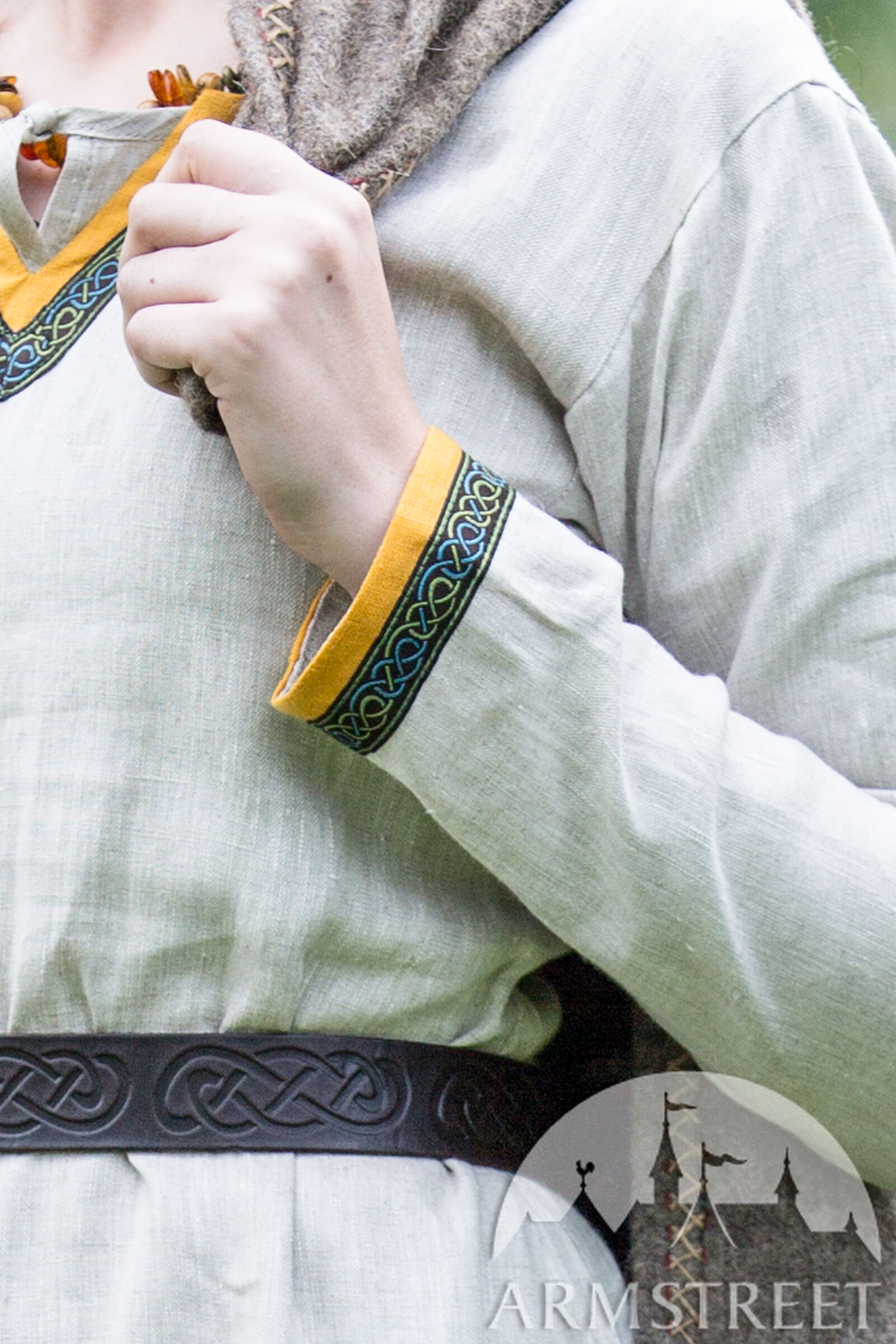 Traditionelle T-Form Leinentunika mit Kontrastnaht, exklusive Borte und mit einer gefärbten Jutefaser verziert. Die Silhouetten der antiken Verkleidung der normannischen Krieger war sehr ähnlich mit der Damen-Verkleidung jener Zeiten.