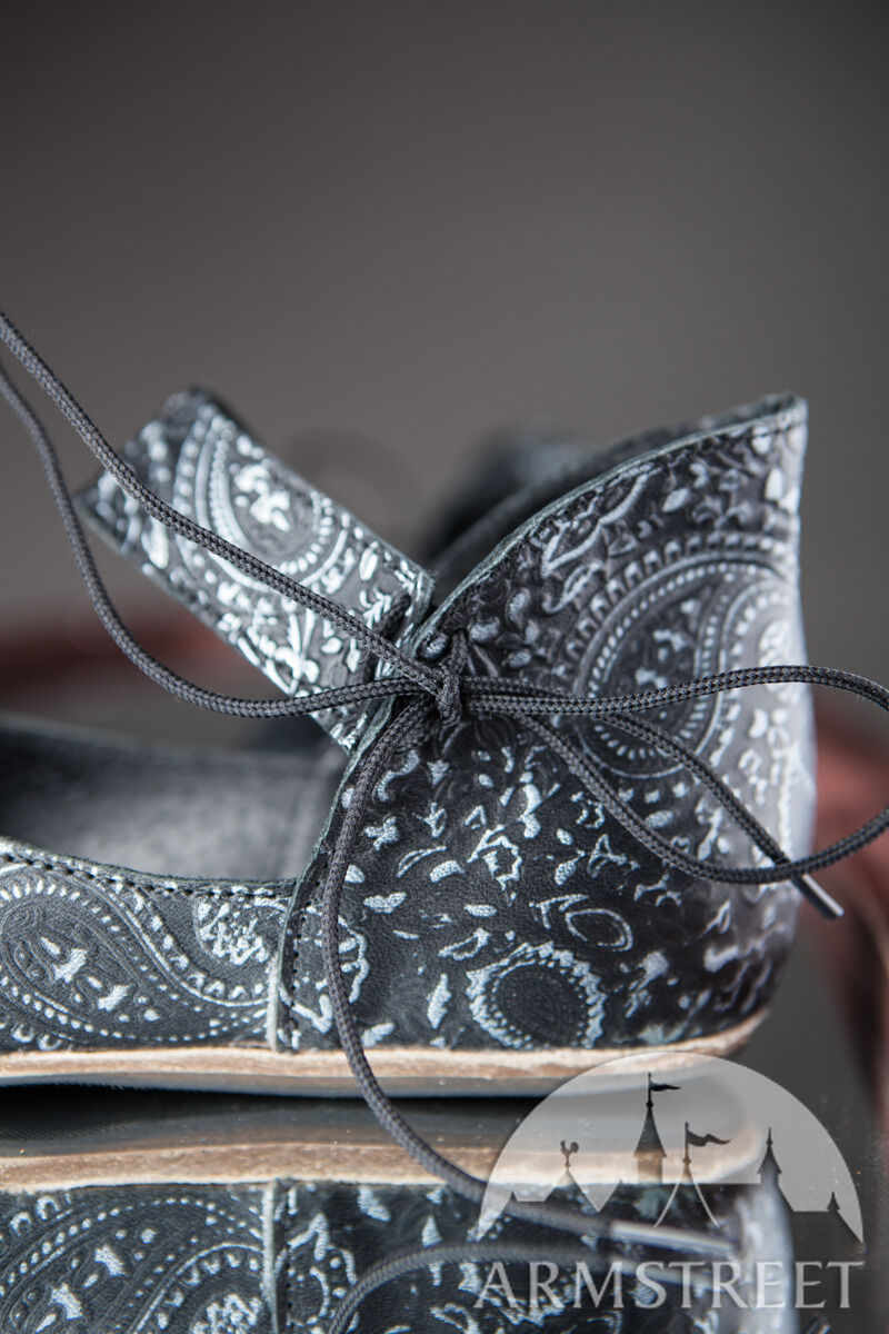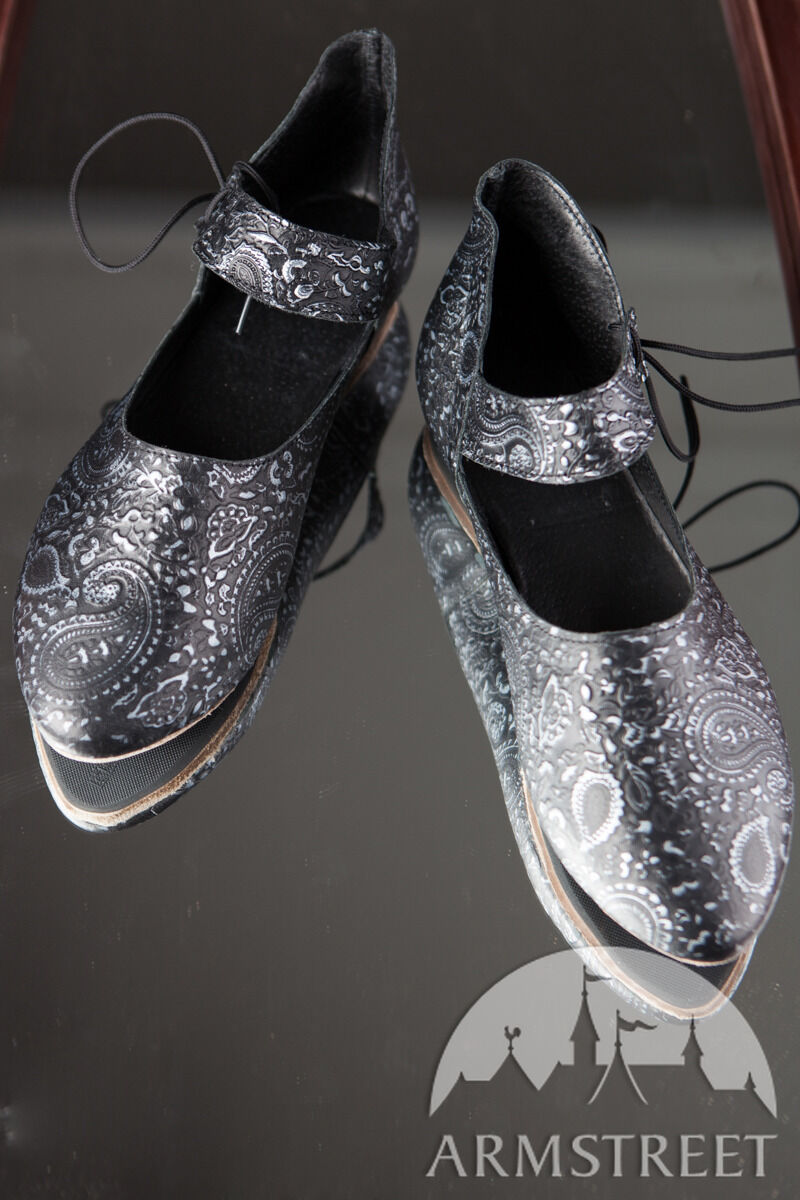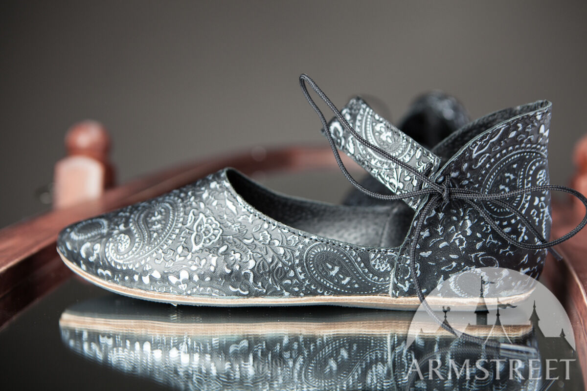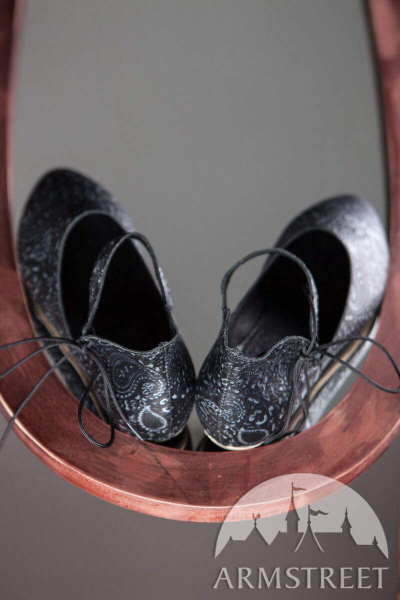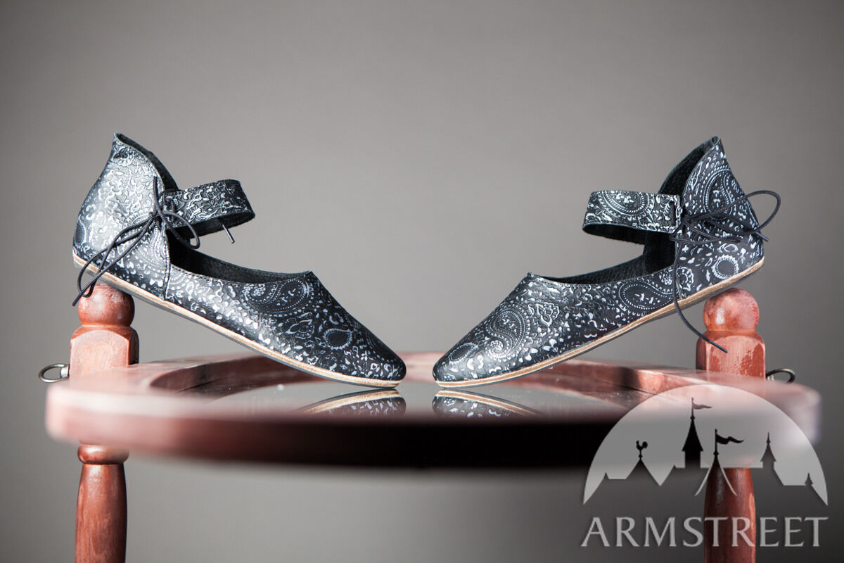 Wunderschöne Damenschuhe im mittelalterlichen Stil für alle Mittelalter- oder Renaissance-Events, SCA-Festivals und Kostümbälle. Diese federleichten Lederschuhe ergänzen auf ganz bezaubernde Weise Ihr Kostüm bei allen sommerlichen Festen und Veranstaltungen.