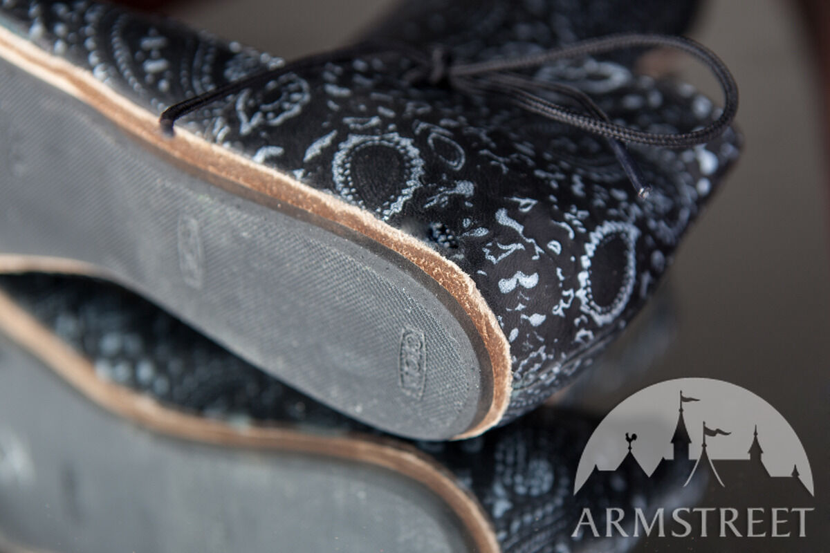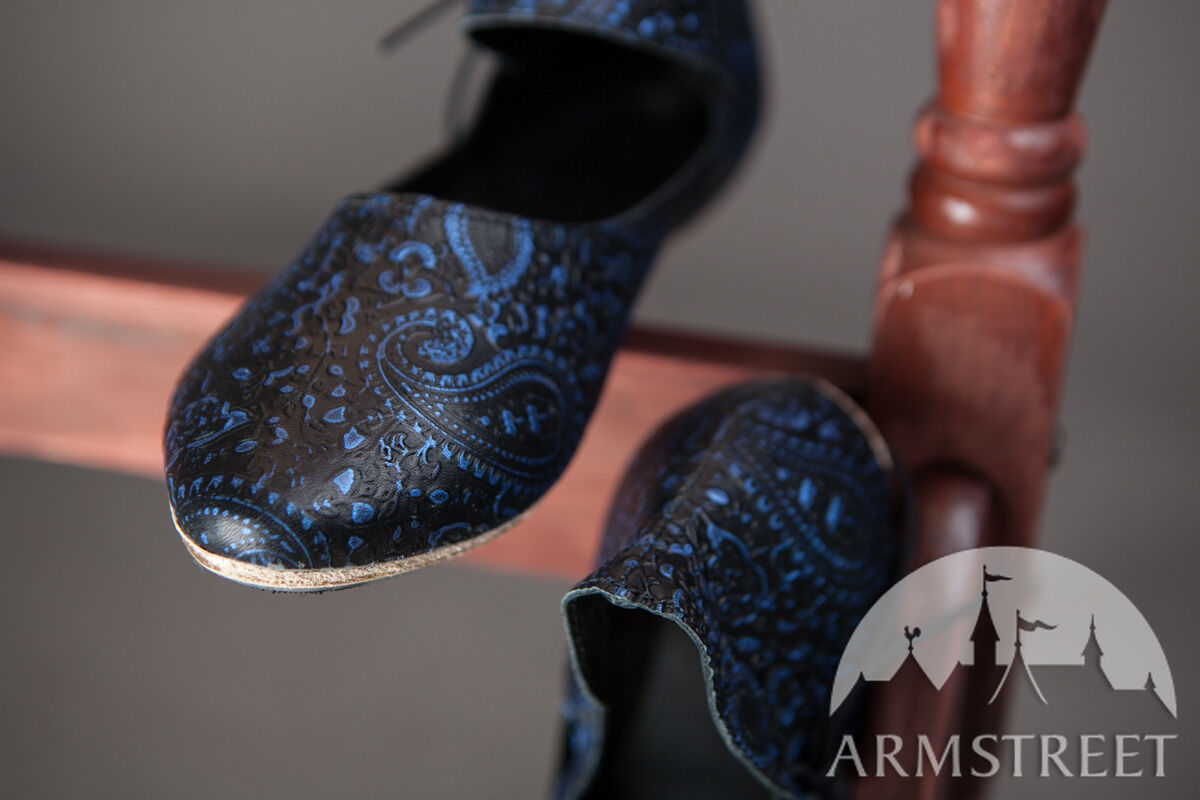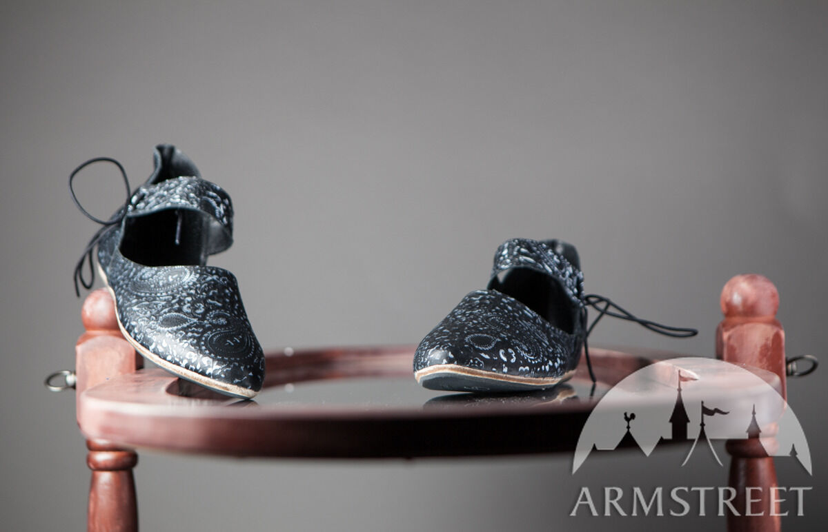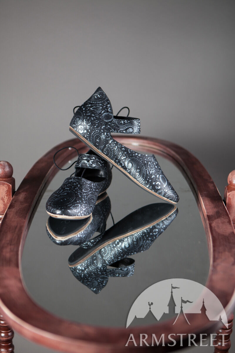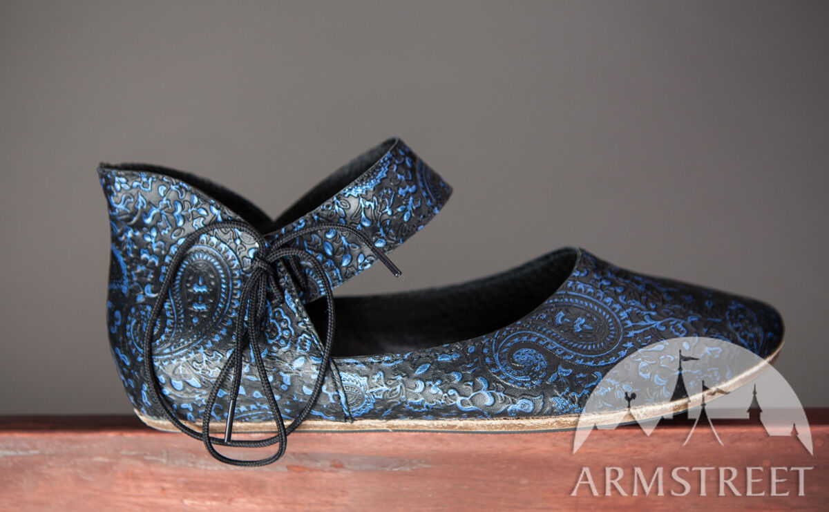 Wunderschöne Damenschuhe im mittelalterlichen Stil für alle Mittelalter- oder Renaissance-Events, SCA-Festivals und Kostümbälle. Diese federleichten Lederschuhe ergänzen auf ganz bezaubernde Weise Ihr Kostüm bei allen sommerlichen Festen und Veranstaltungen.