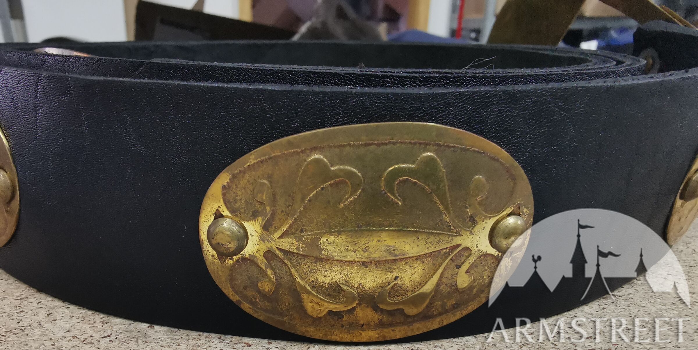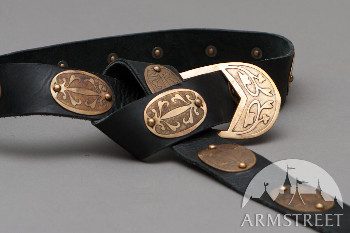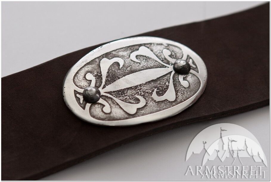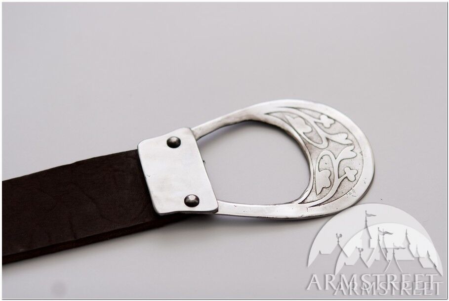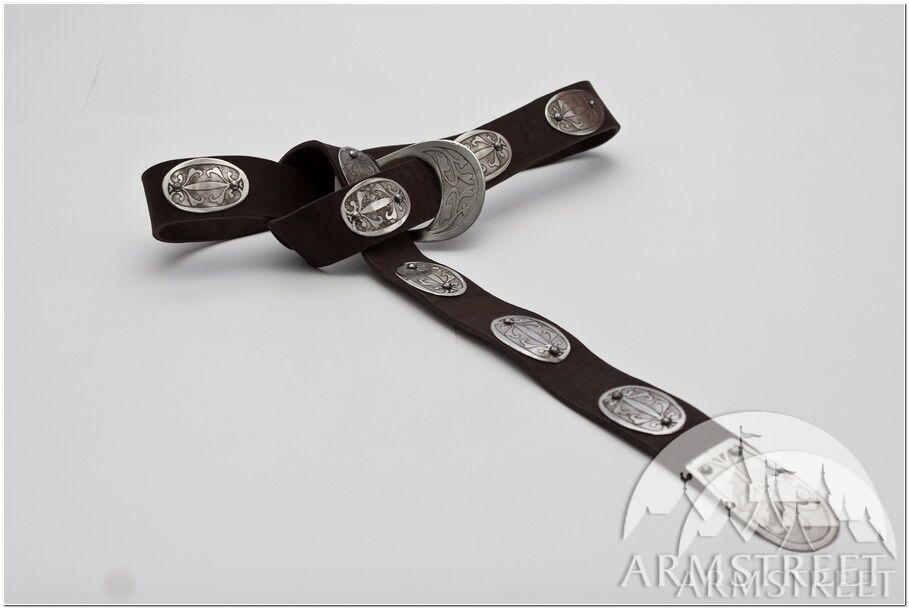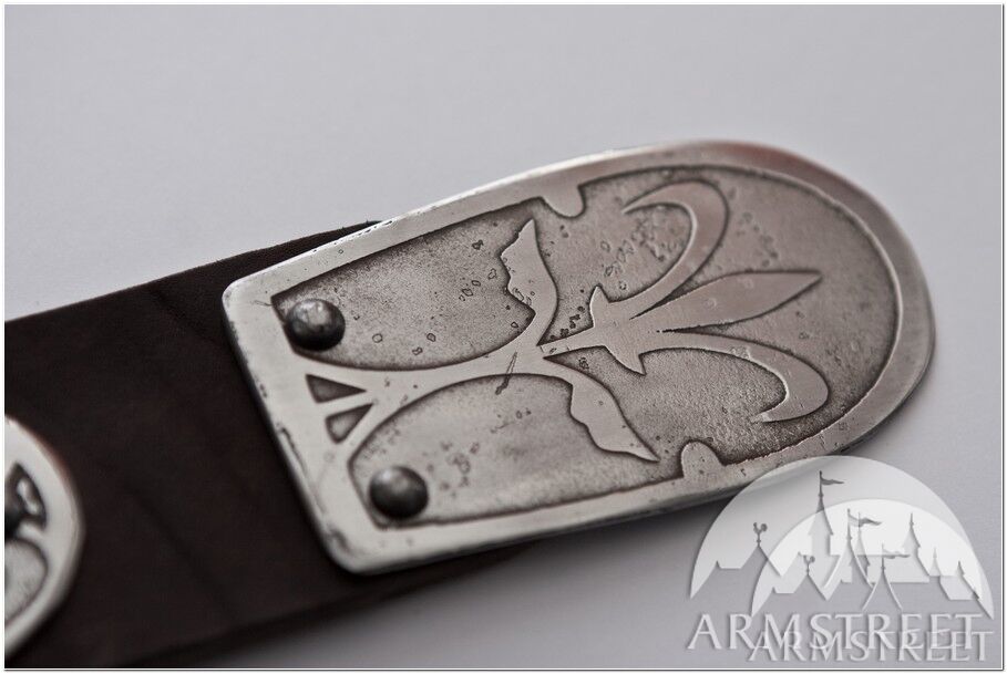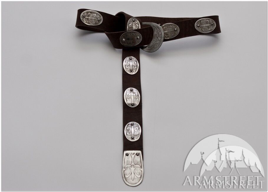 Handgefertigter Gürtel im Mittelalter Stil aus dunkelbraunem Leder mit handgeschmiedeten und geätzen Stahlverzierungen. Eine wunderbare Ergänzung für jedes Mittelalter Kleid oder Kostüm aber auch als Gürtel für jeden Tag verwendbar. Dieser Gürtel ist hervorragend kombinierbar mit dem Kettenpanzer oder Gambeson. Aus festem, echtem Leder in hervorragender Qualität gefertigt.
