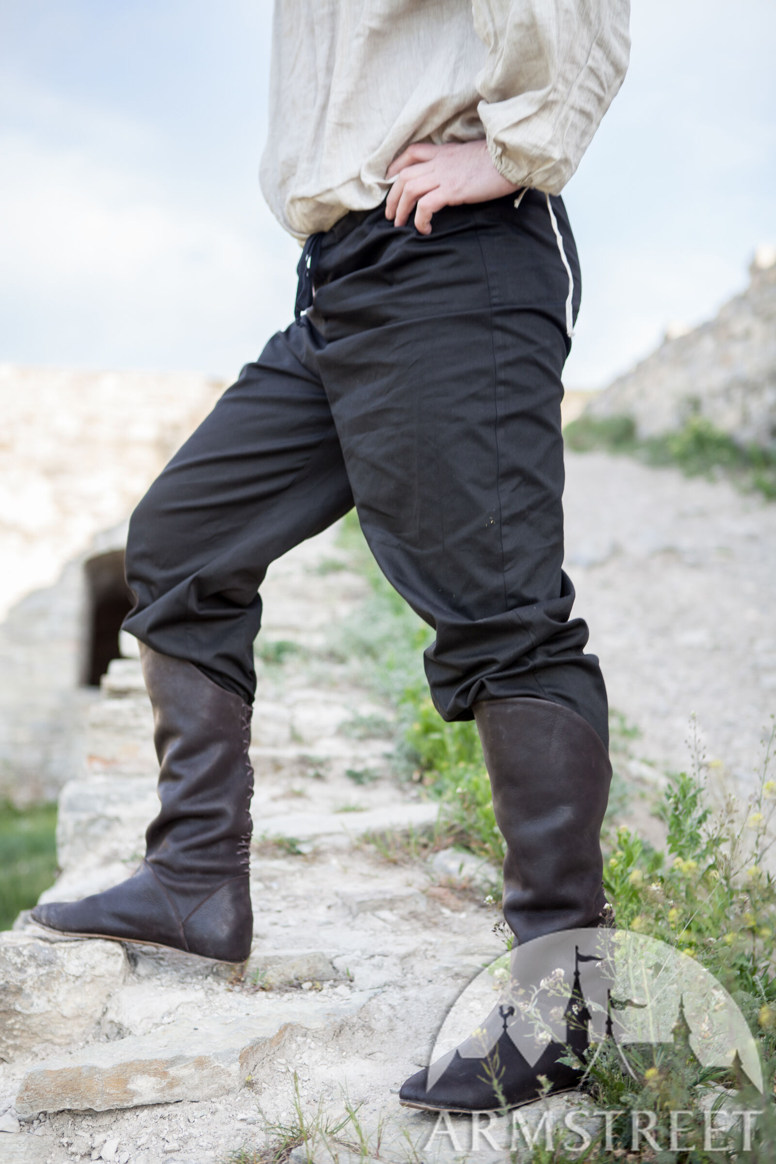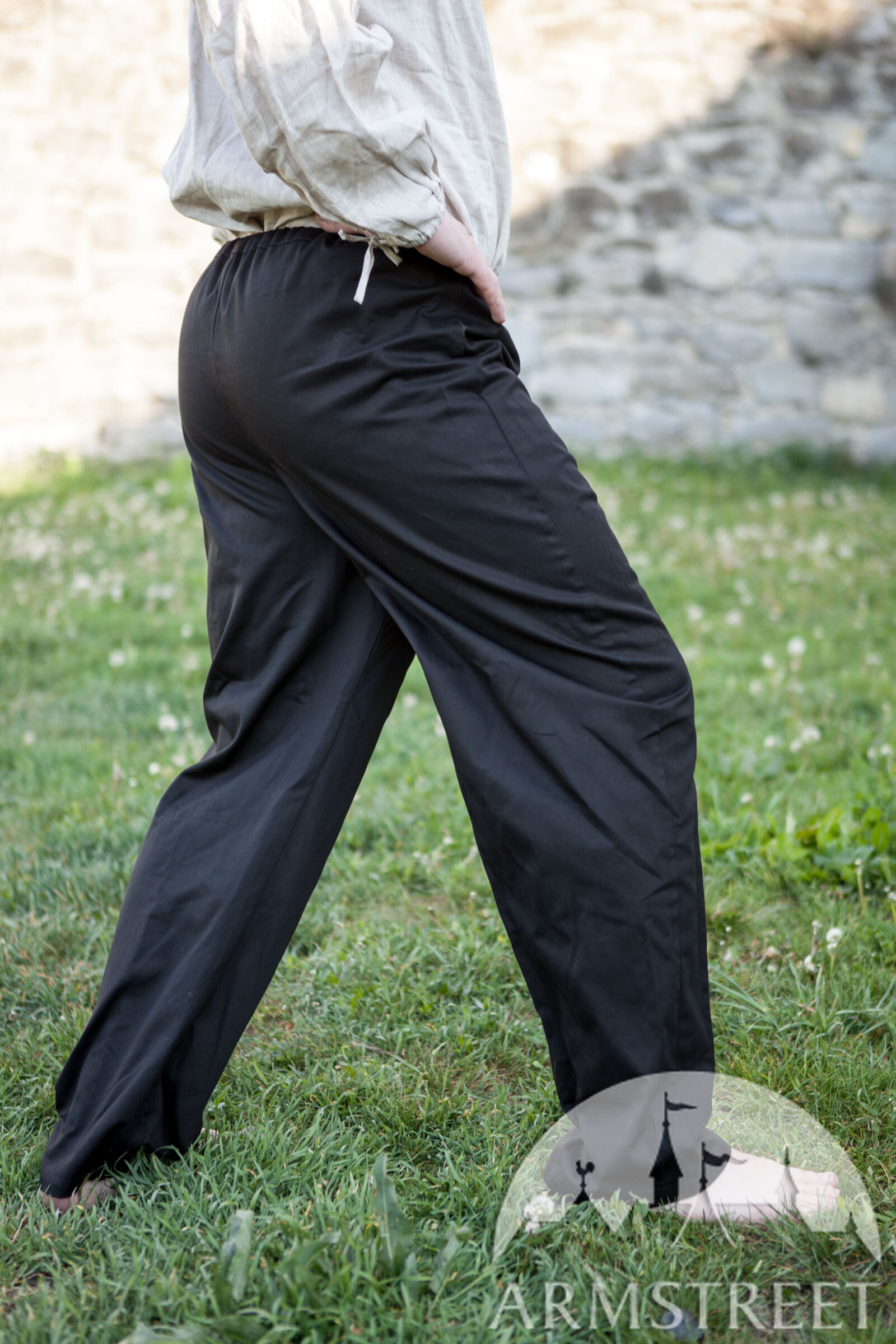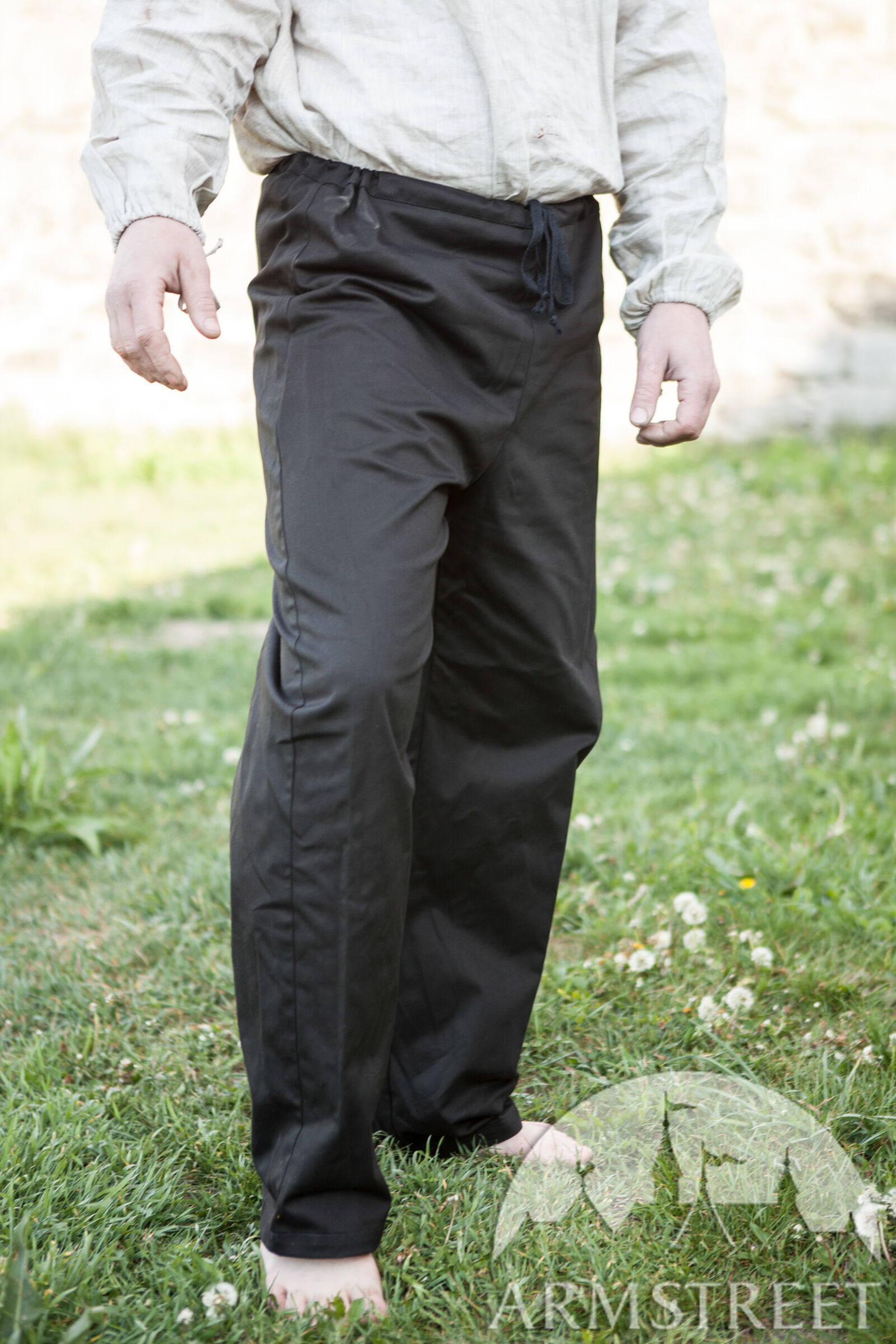 Schwarze Mittelalter Baumwollhose. Als erfahrene LARP-Spieler und Teilnehmer an historischen Veranstaltungen erinnern wir uns, wie schwierig es ist, einfache Hosen ohne all diese modernen Verschlüsse, Nieten und Stiche zu finden. Deshalb bieten wir einfache Baumwollhosen an, die nach dem klassischen Muster hergestellt wurden. Sie bestehen aus 100% natürlicher Baumwolle und können mit jeder Art von mittelalterlichen Schuhen oder Stiefeln getragen werden.
