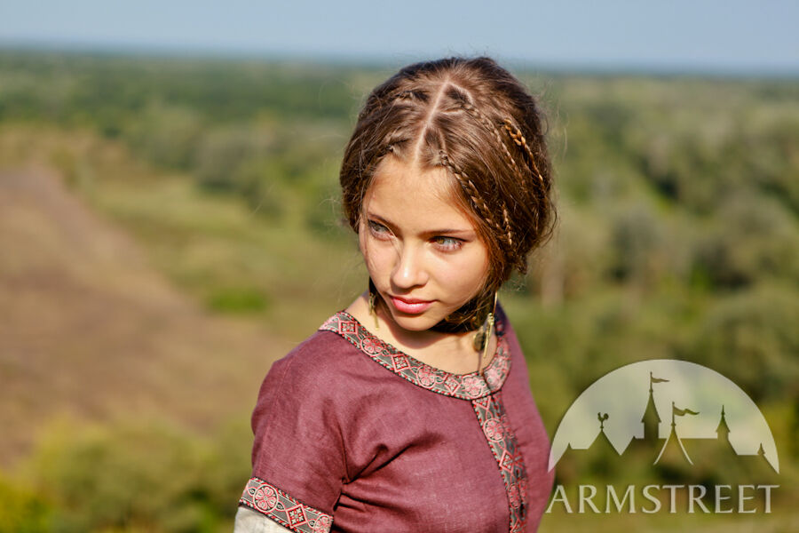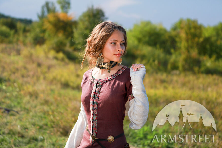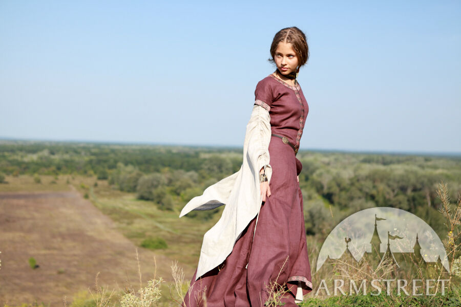 Dieses Kleid ist aus Leinen gefertigt und hat einen klassischen gotischen Schnitt (Europäische Mode der XIII-XIV Jhdte). Die Taille und Brust werden betont und der Rock ist breit dank des Einsatzes von 4 zusätzlichen Keilen.
