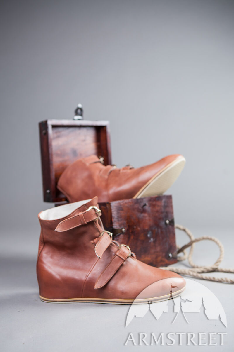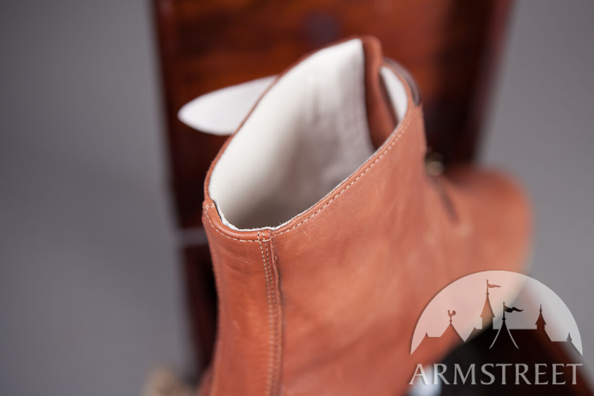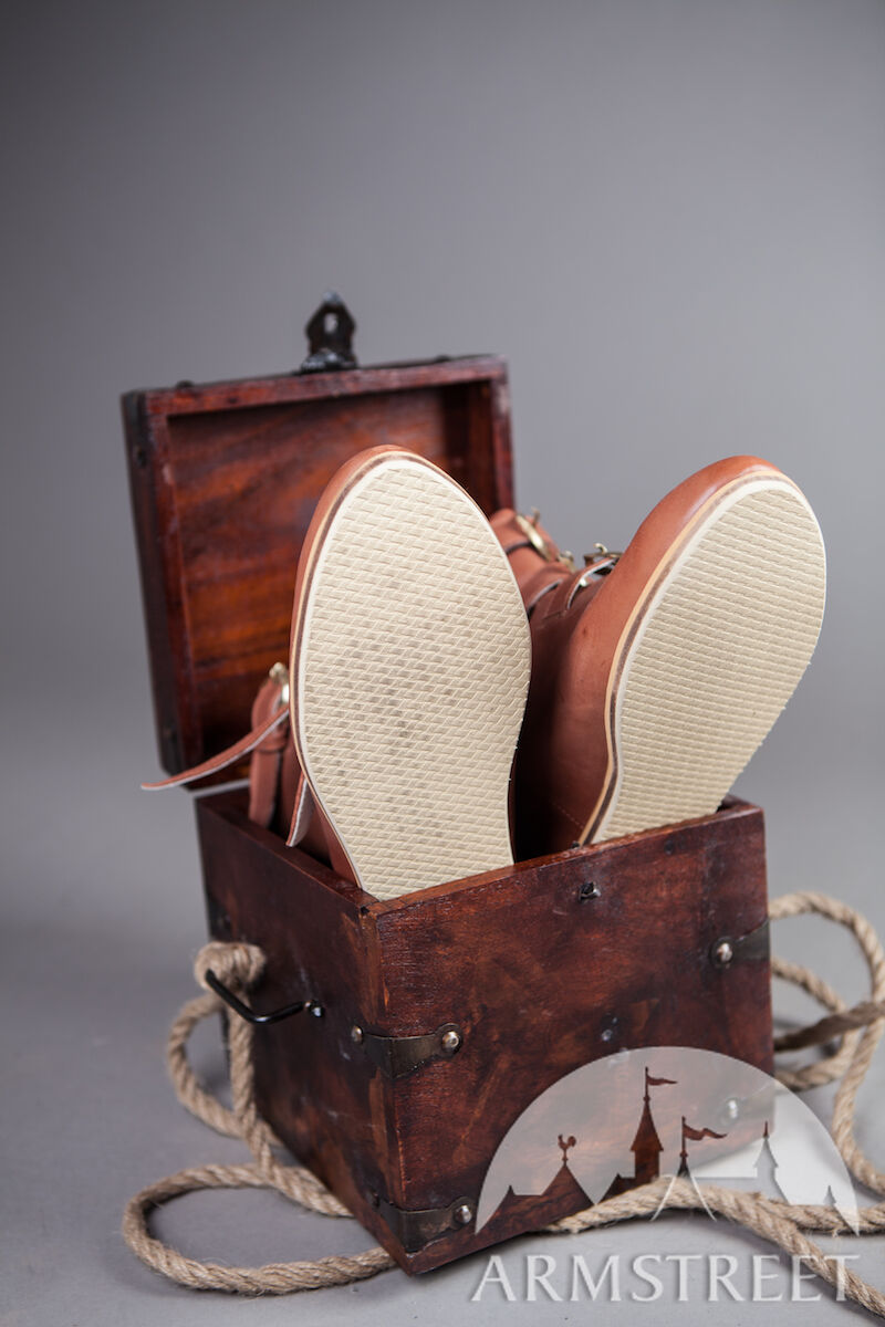 Hier unsere Version der knöchelhohen Ritterstiefel im Stil des XIV. Jahrhunderts. Robuste und zuverlässige Stiefel, perfekt, um unter der Rüstung als Kampfstiefel getragen zu werden. Die Stiefel sind aus robustem, echtem Leder gefertigt und die Sohle ist zur Verbesserung der Rutschfestigkeit mit einer modernen Gummiauflage („vibrum“) versehen. Die "Vibrum-Sohle" ist fest mit der Echtledersohle verklebt. Dank ihrer hellen Naturfarbe gleicht die Optik jedoch einer mehrschichtigen Ledersohle, so dass das moderne Material selbst aus der Nähe nicht als solches erkennbar ist.