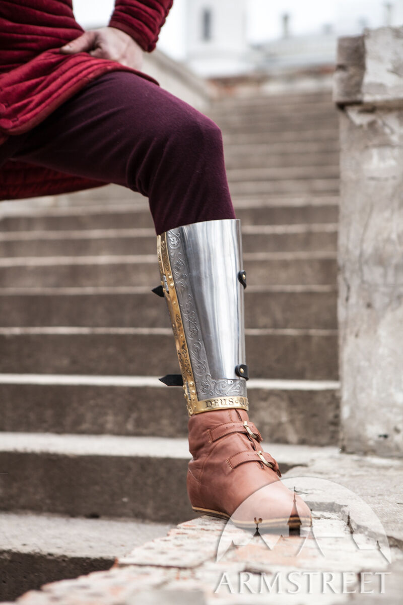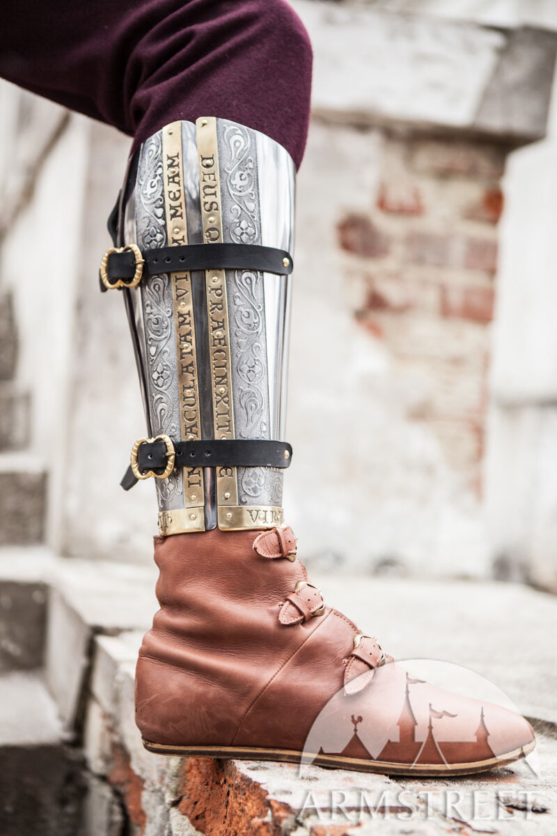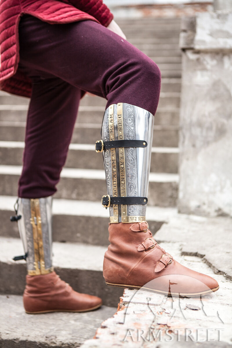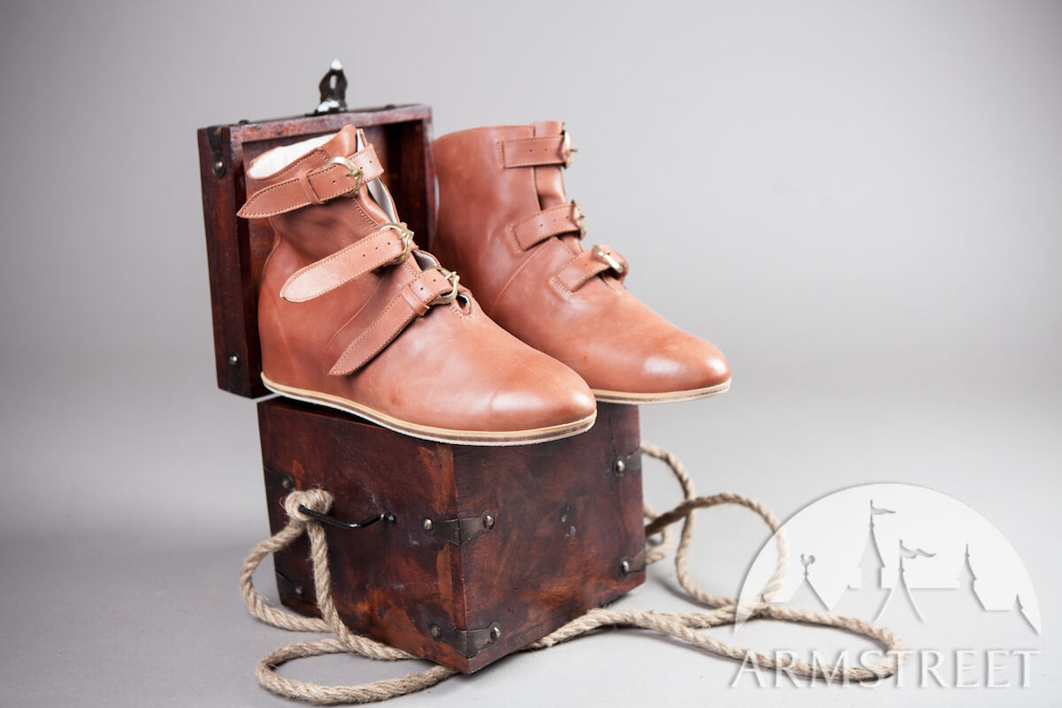 Hier unsere Version der knöchelhohen Ritterstiefel im Stil des XIV. Jahrhunderts. Robuste und zuverlässige Stiefel, perfekt, um unter der Rüstung als Kampfstiefel getragen zu werden. Die Stiefel sind aus robustem, echtem Leder gefertigt und die Sohle ist zur Verbesserung der Rutschfestigkeit mit einer modernen Gummiauflage („vibrum“) versehen. Die "Vibrum-Sohle" ist fest mit der Echtledersohle verklebt. Dank ihrer hellen Naturfarbe gleicht die Optik jedoch einer mehrschichtigen Ledersohle, so dass das moderne Material selbst aus der Nähe nicht als solches erkennbar ist.