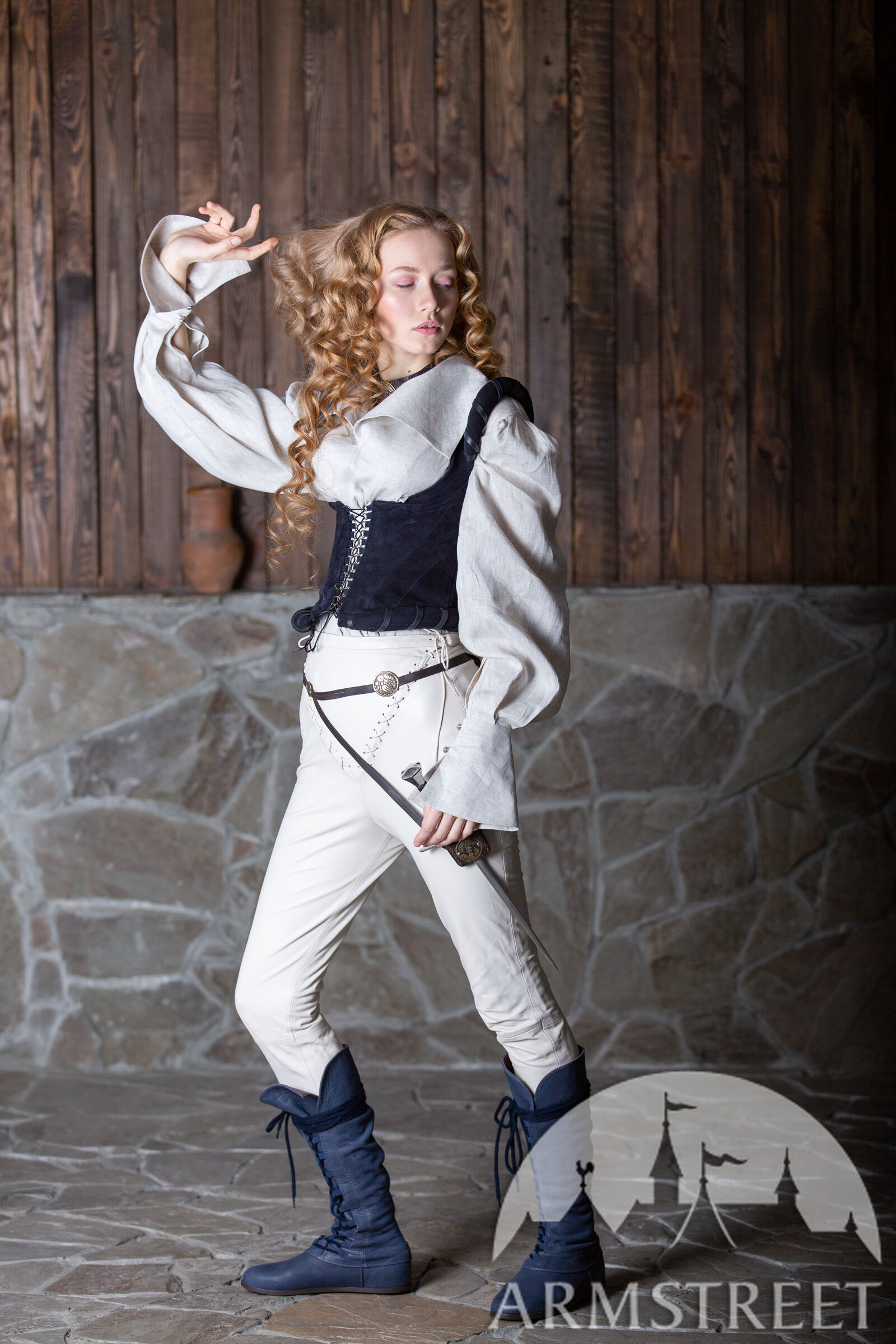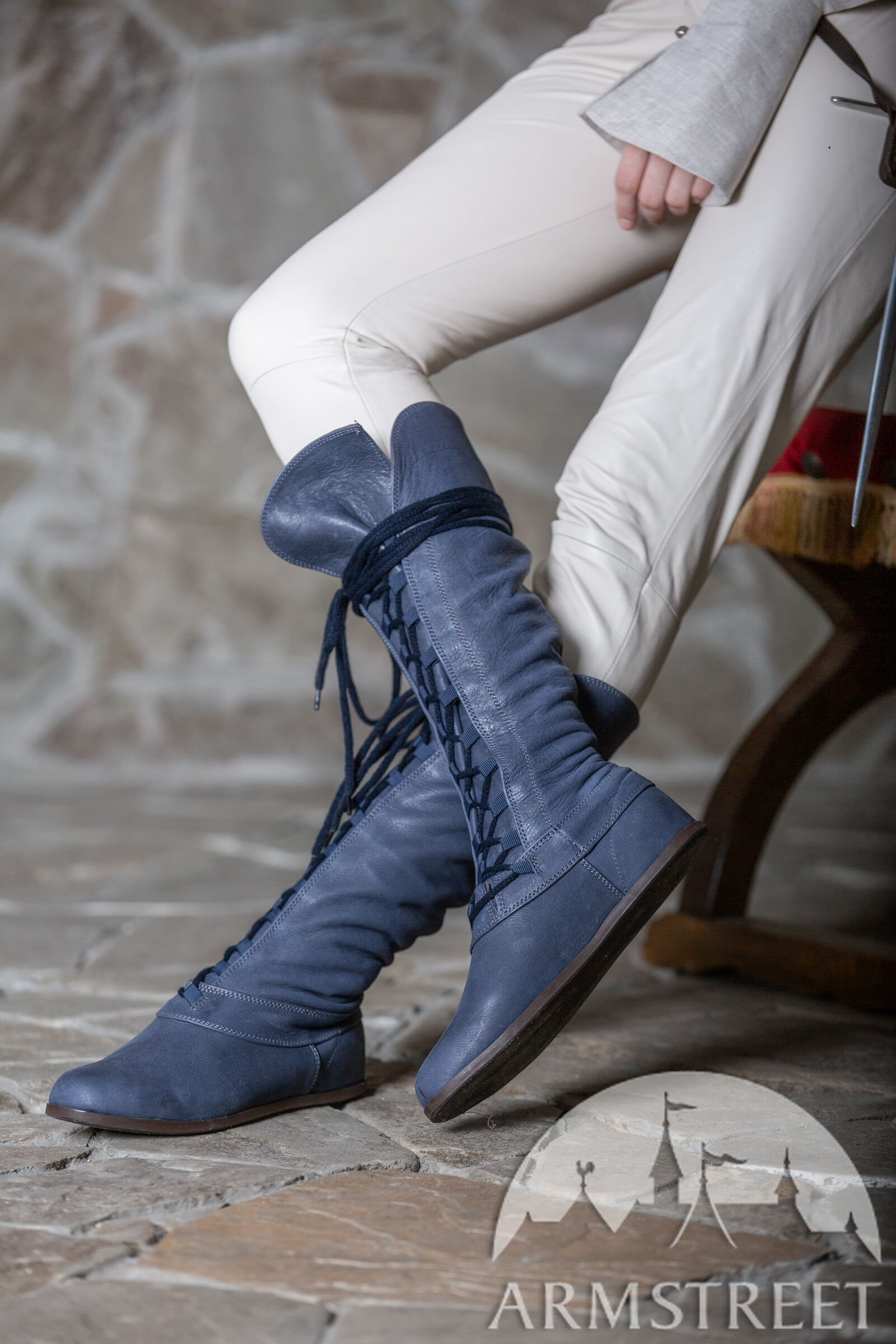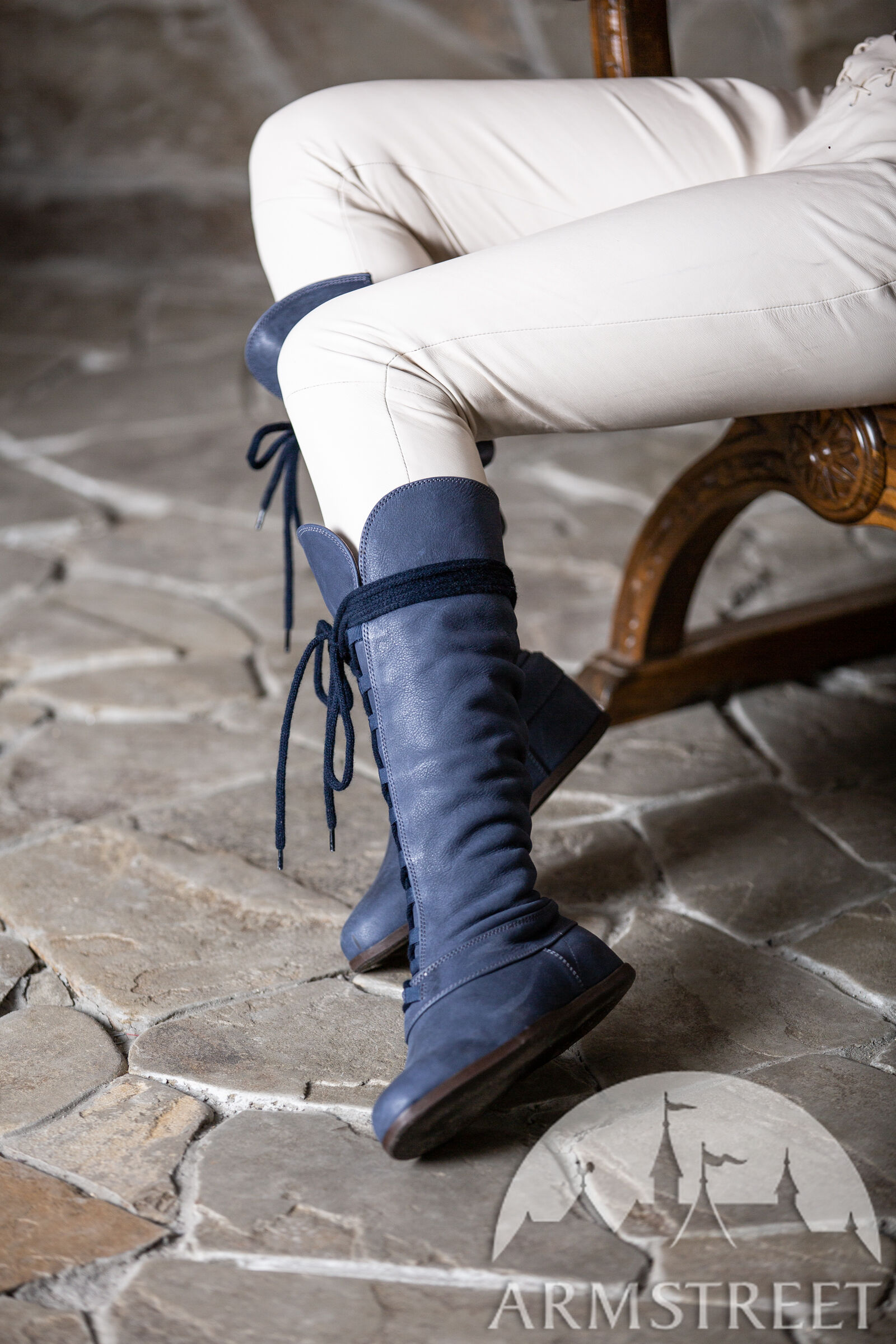Natürliches Schweinsleder ist das Hauptmaterial, aus dem wir die Stiefel hergestellt haben. Es ist perfekt für diese Art von Design, weil es super stark ist, aber auch gut zum Leben passt. Das Design des Stiefels ist schön und einfach und zielt darauf ab, nicht auf extravagante Weise hervorzuheben, sondern den Rest Ihres Kostüms zu ergänzen und ein Teil davon zu sein. Die Form des Stiefels ist vorne mit einem schlanken, schmeichelhaften Profil abgerundet, das ihnen einen raffinierten, praktischen Look verleiht. Sie sind fast kniehoch und reichen bis zu Ihrer oberen Wade. Die Schnürung verläuft von der Knöchelbasis über die Fußspitze bis nach oben. Da sie sich mit Schnürung öffnen, können Sie Ihren Fuß in sie einpassen, haben aber immer noch einen taillierten Blick auf Ihre Beine. Die Zunge des Stiefels ist an einer Seite befestigt und kann auf der anderen Seite gespalten werden, was das Positionieren erleichtert (eine Zunge, die nicht mit den Seiten verbunden ist, lässt sich nur schwer an der richtigen Stelle positionieren und neigt dazu) unangenehm sein). Die Schlaufen für die Schnürung bestehen aus einem starken Stoff, der mit zwei Lagen Nähten am Leder befestigt ist, um die Haltbarkeit zu erhöhen. Dank der starken, extralangen Schnürung haben Sie die richtige Passform um Ihr Bein - es liegt an Ihnen, ob Sie die Schnürung kürzer schneiden möchten, sobald Sie die Stiefel besitzen, oder ob Sie sie wie ein „Strumpfband” zum Wickeln verwenden möchten um die Basis Ihres Knies und halten Sie die Stiefel hoch.