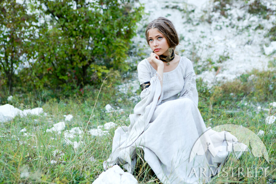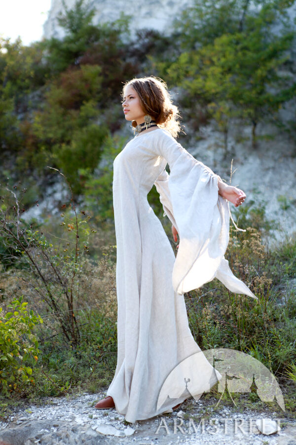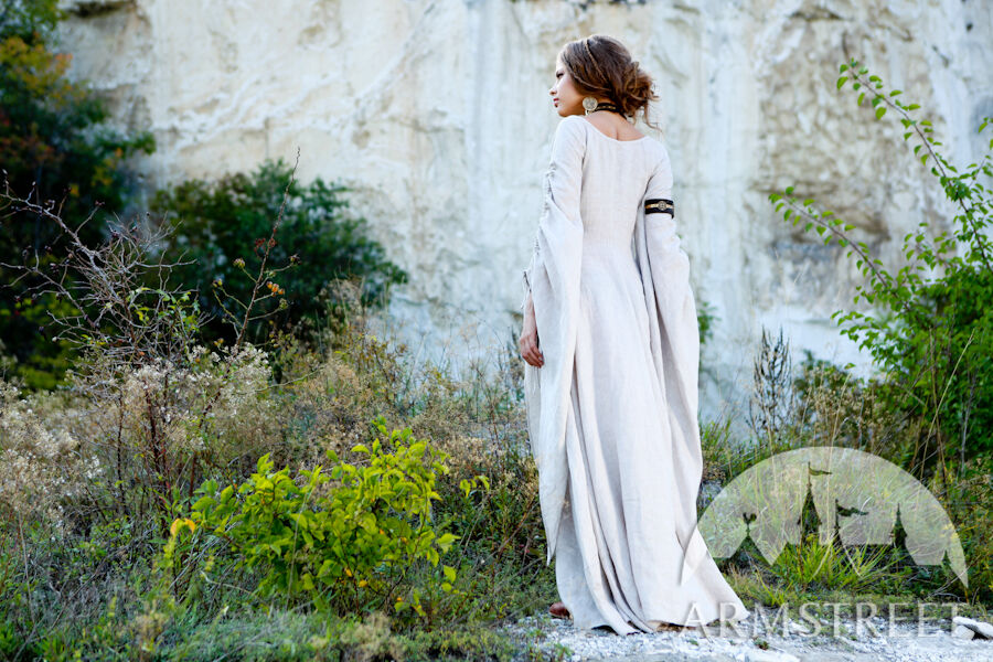 Diese Mittelalter Tunika hat einen klassischen gotischen Schnitt (Europäische Mode der XIII.-XIV. Jhdte). Taille und Brust werden betont, der Rock ist ziemlich breit. Lange breite Ärmel können auf jede beliebige Länge bis zum Bizeps mithilfe einer Schnur eingestellt werden.