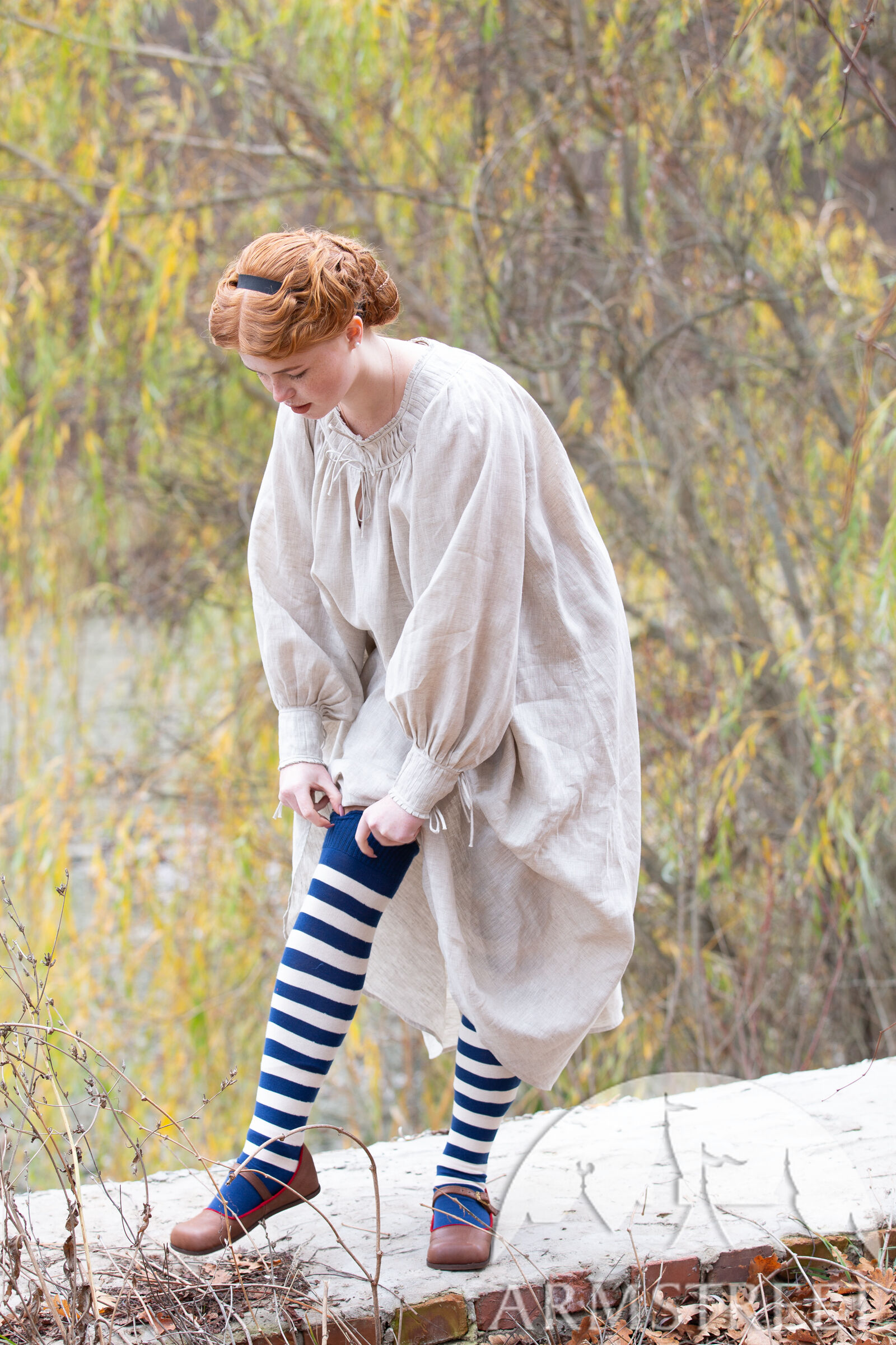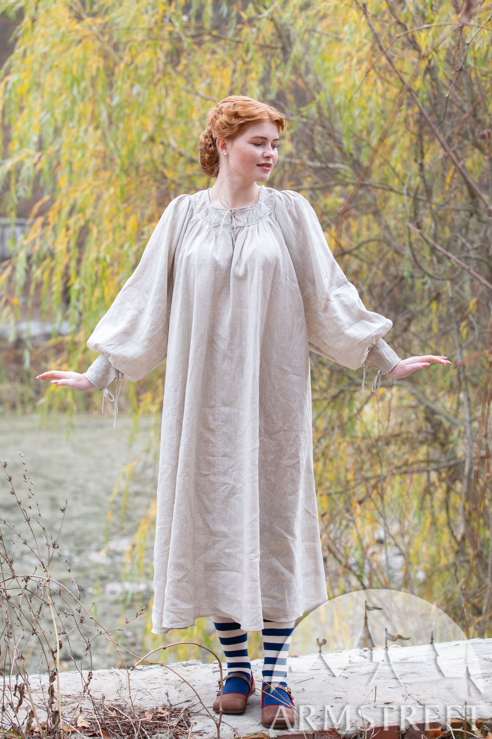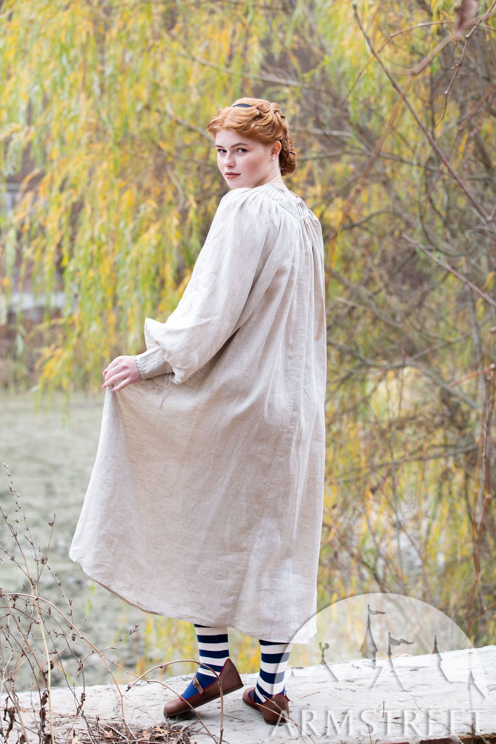 Inspiriert von Silhouetten aus dem XVI. Jahrhundert, fällt dieses Kleid locker und bequem aus. Wir haben uns von historischen Quellen von Frauen in Badehäusern inspirieren lassen, die uns einen Einblick in die Unterwäsche des Mittelalters geben. Es fließt bis knapp unter die Knie, was bedeutet, dass es nicht stört, wenn Sie knien oder rennen müssen. Im Nacken ist der gesamte wogende Stoff in einer Reihe von sehr hübschen kleinen Falten zusammengefasst und organisiert, die perfekt flach sitzen, wobei zwei Leinenbandlinien oben und unten in der Mitte Bindebänder bilden. Obwohl diese Falten perfekt funktionell sind, sehen sie nur deshalb dekorativ aus, weil sie meisterhaft genäht wurden!