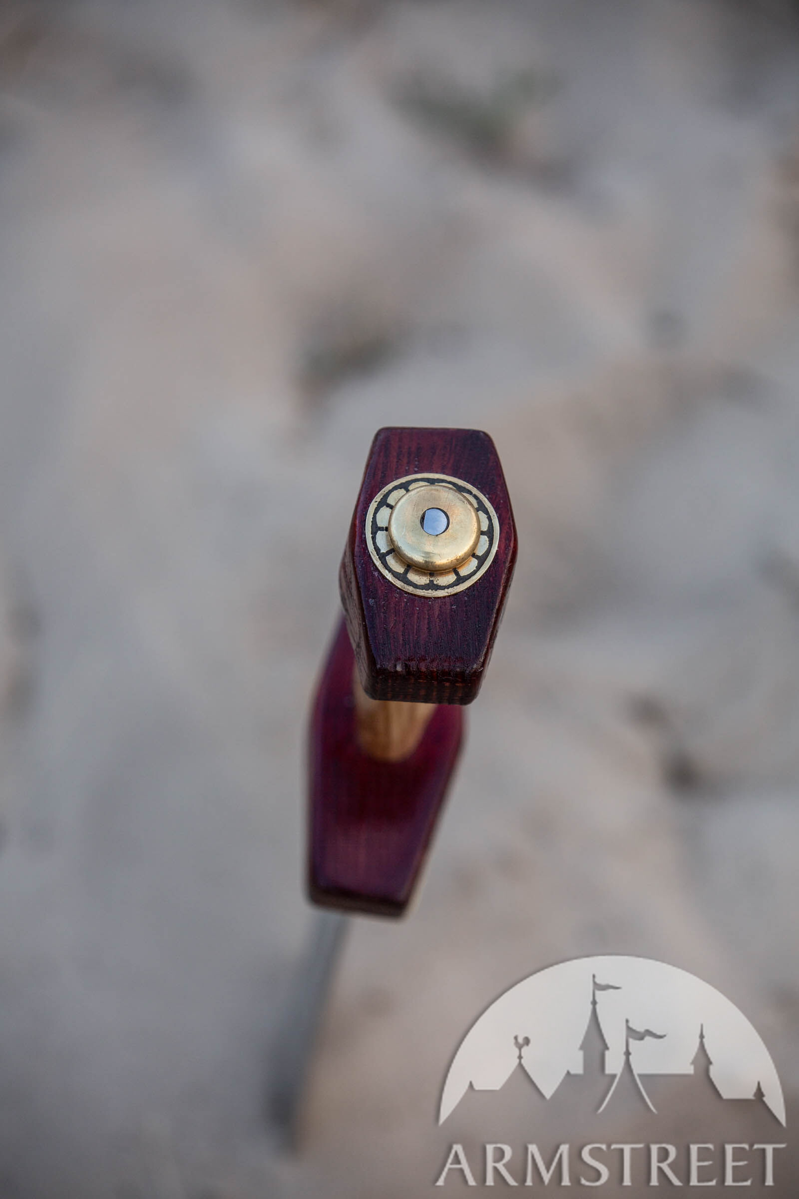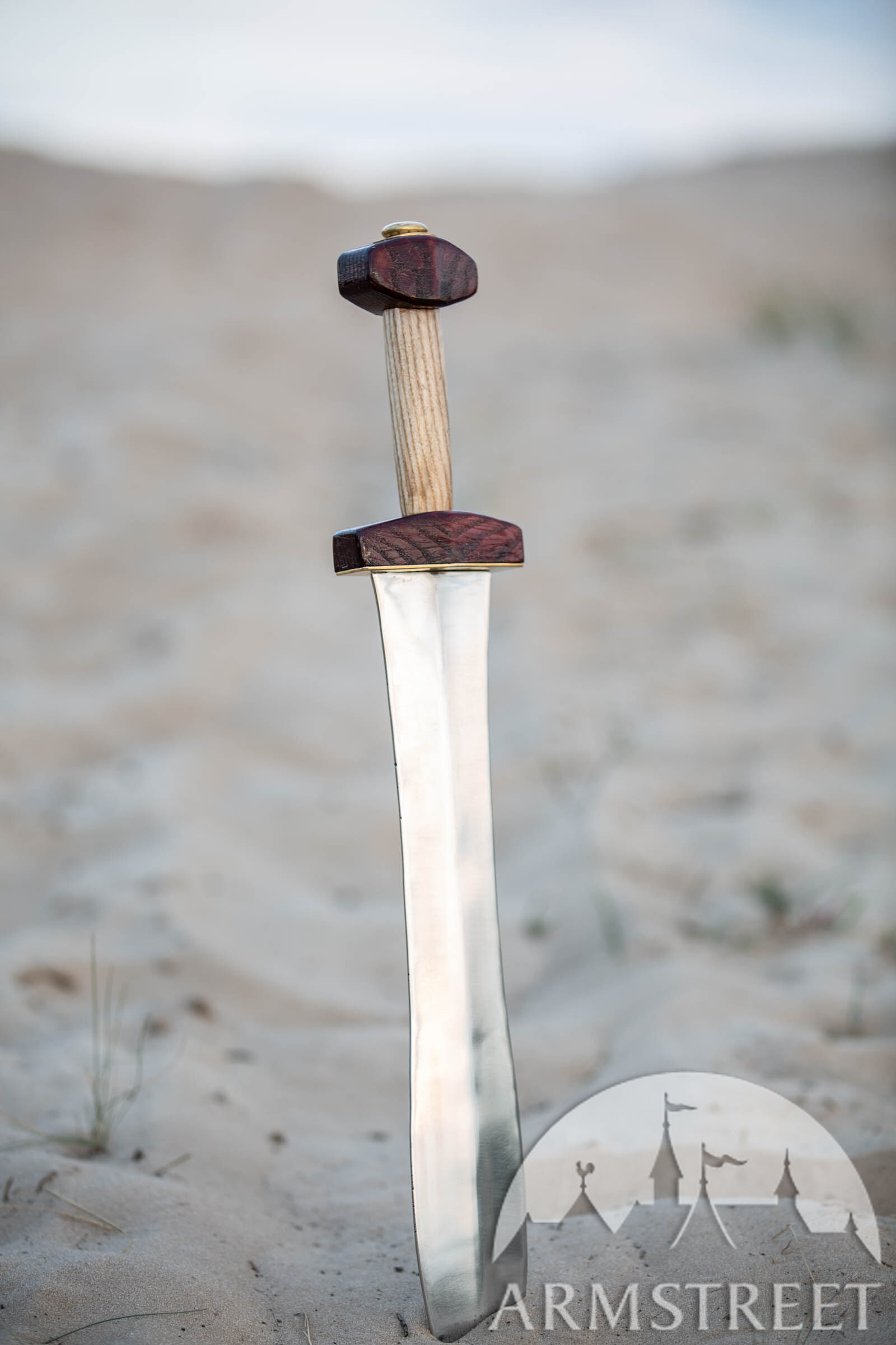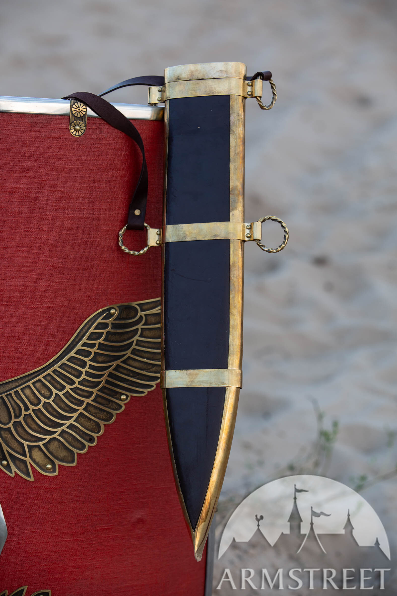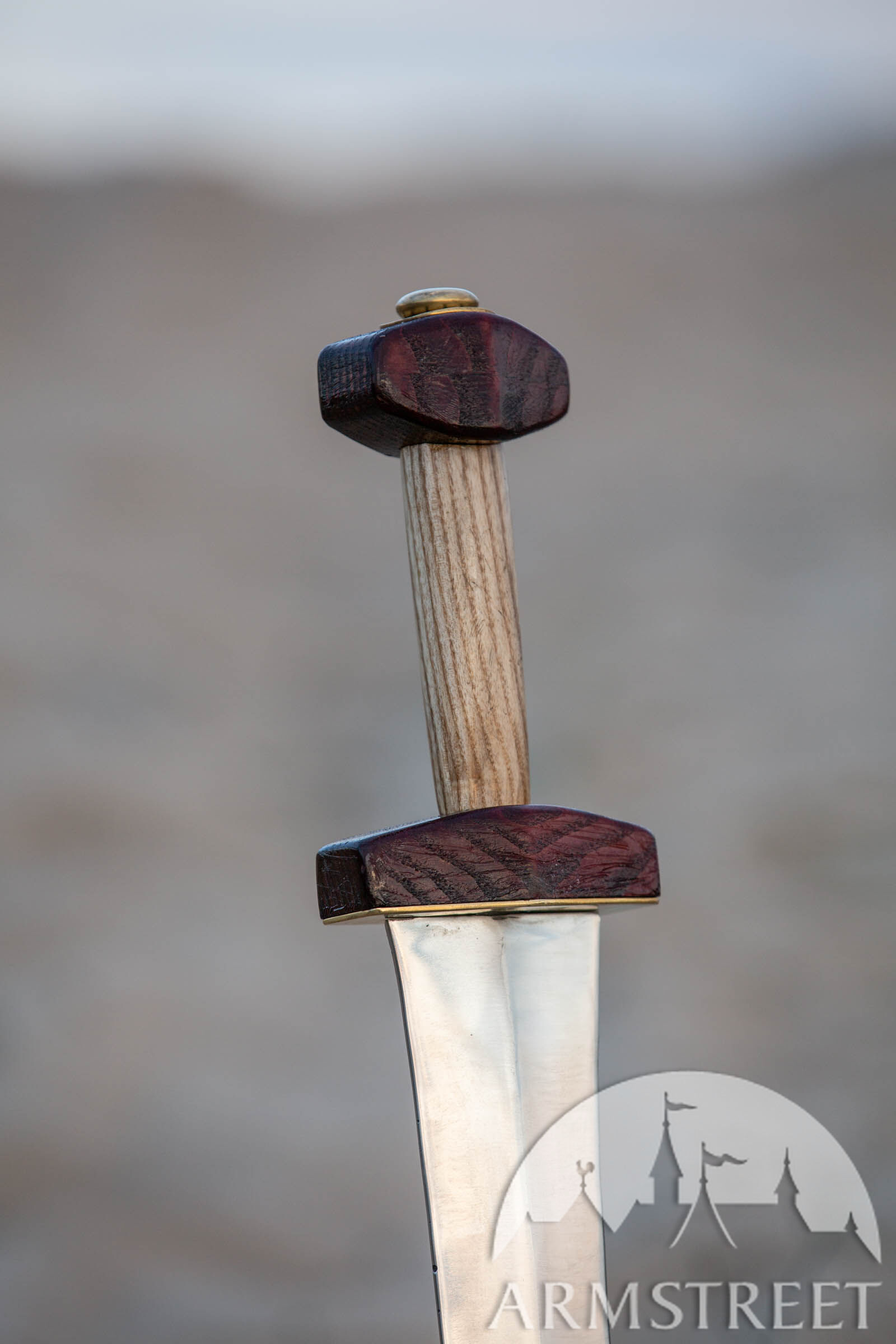 Im wahren römischen Stil haben wir das Gefühl, dass das Durcheinander dieses Stücks mit verschwenderischem Schmuck die Form der Klinge beeinträchtigt hätte. Die Klinge besteht aus 1,5 mm Edelstahl, der zu einer sehr einfachen Silhouette zusammengeschweißt ist. Anstatt uns auf unsere übliche ArmStreet-Radierung zu konzentrieren, haben wir uns stattdessen auf die Einfachheit und Eleganz der Form selbst konzentriert. Dieser Ansatz ist auch am Griff sichtbar. Messing wurde sparsam zwischen Klinge und Griff verwendet, um das Schwert zu verstärken und das wunderschön polierte zweifarbige Eschenholz zum Leuchten zu bringen. Als letzten Schliff wurde der Unterseite des Knaufs mit einem kleinen Messingakzent versehen.