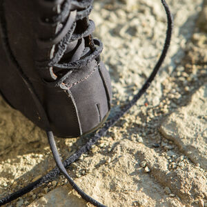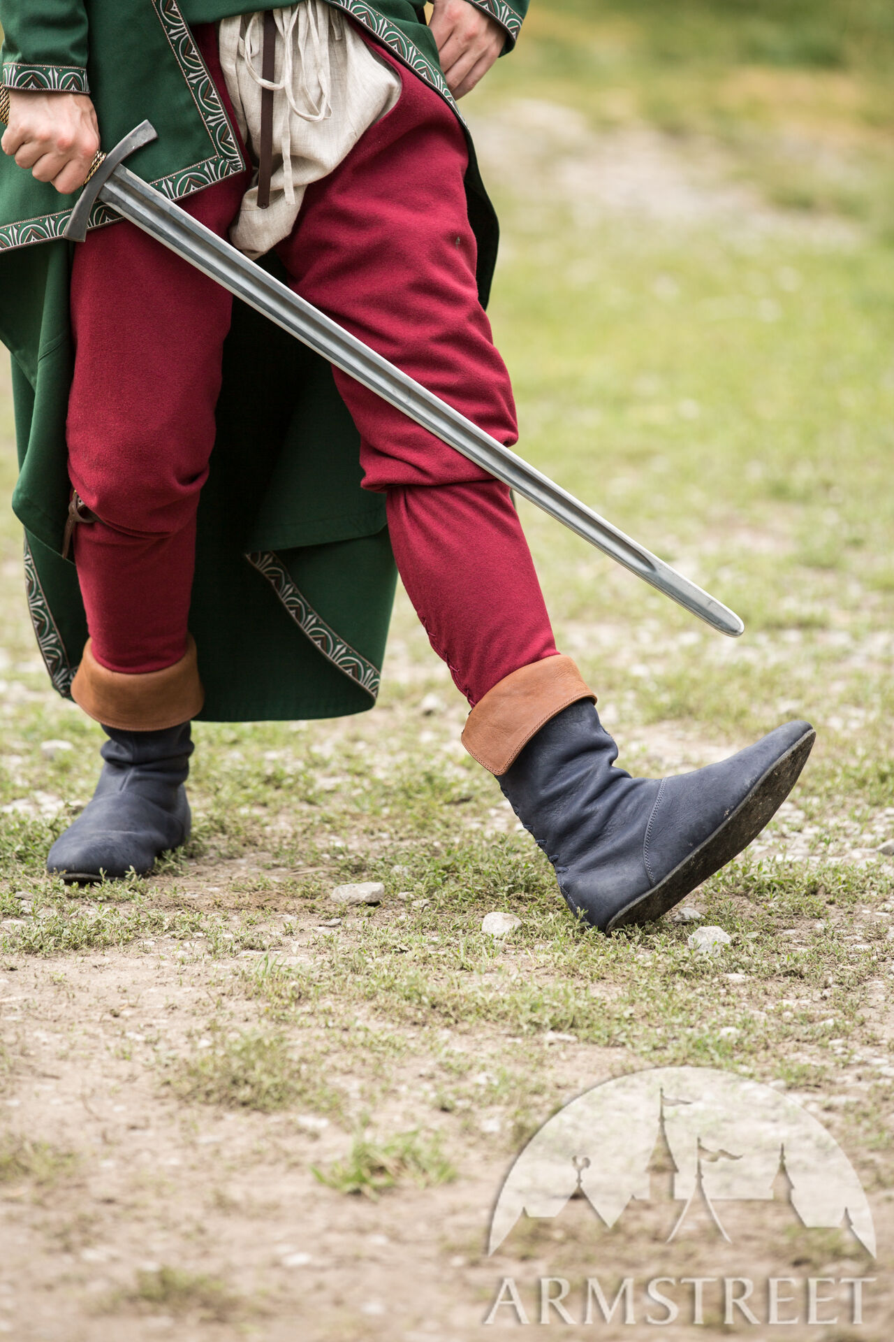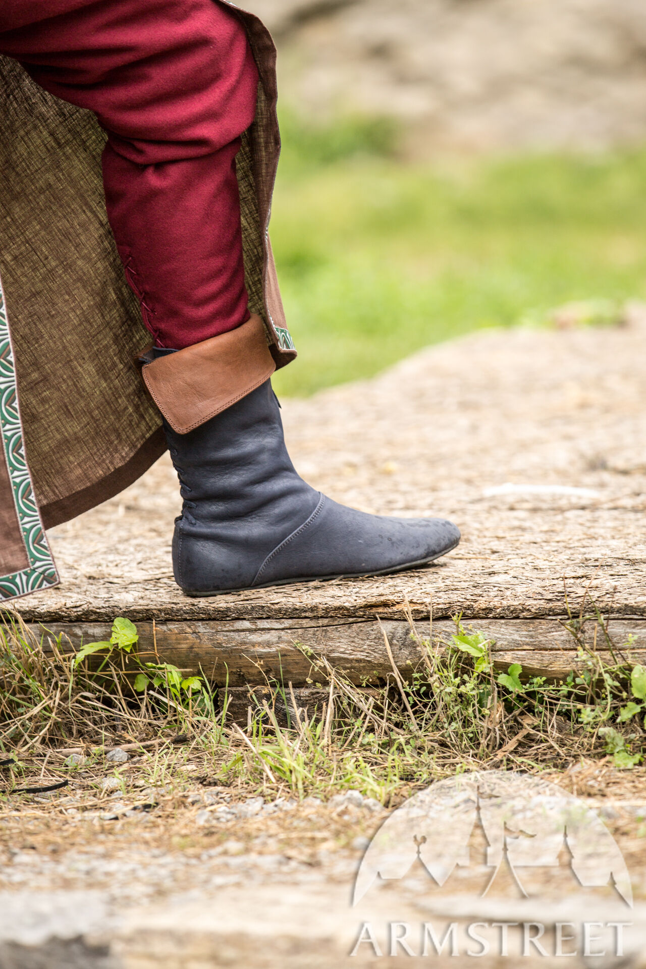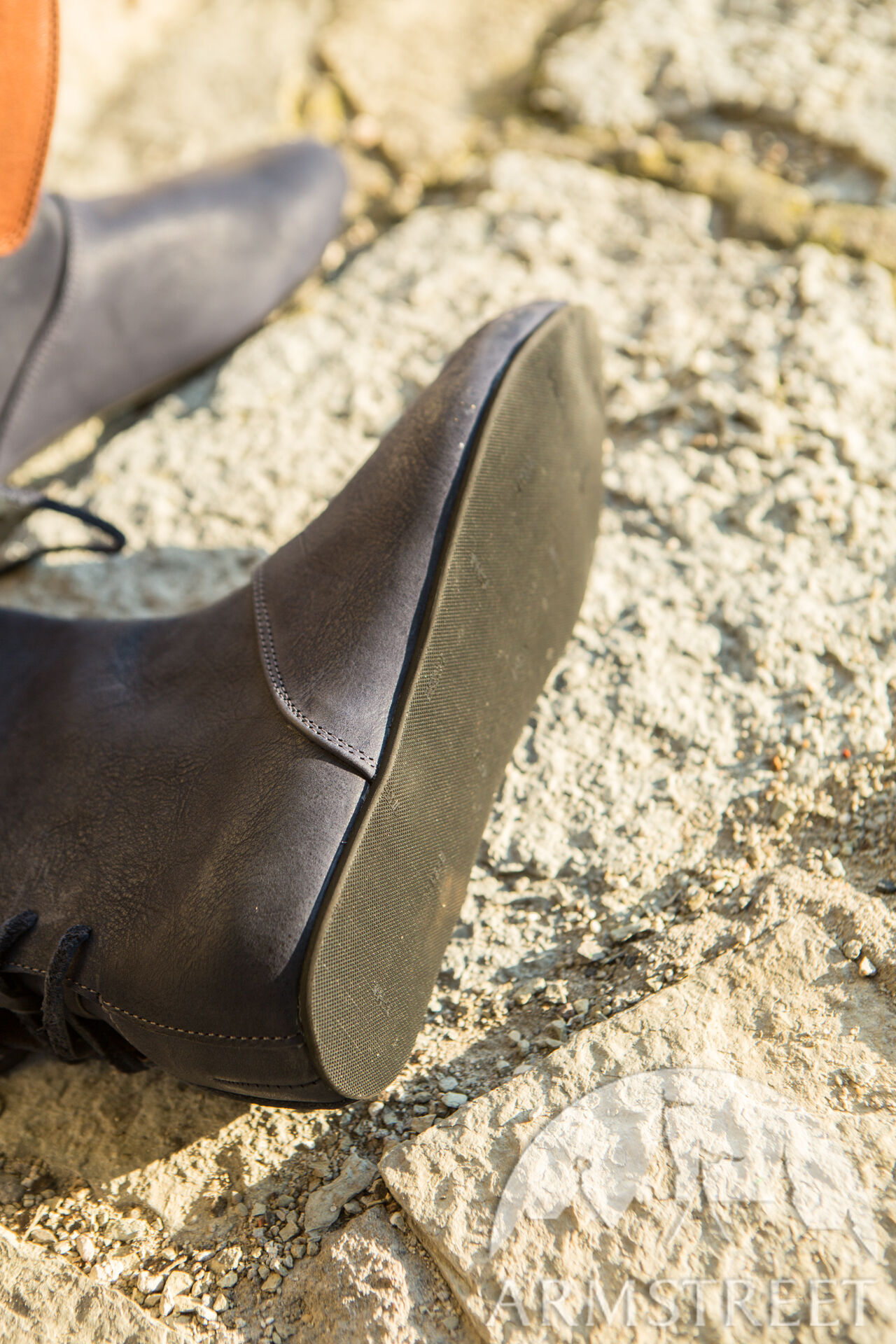 Diese Stiefel haben moderne Sohlen, die einen sicheren Halt gewährleisten und sich perfekt für verschiedene Arten von Aktivitäten eignen - vom üblichen Gehen über Tanzen bis hin zu mittelalterlichen Kämpfen. Sie bestehen aus mehreren Schichten: Ledereinlegesohle, Lederfaserplatte, poröse, atmungsaktive orthopädische Basis und gerippte Gummilaufsohle. Dieses Modell kann nicht mit authentischen Sohlen hergestellt werden, aber in unserem Geschäft finden Sie viele andere historisch genaue Modelle mit Ledersohlen.