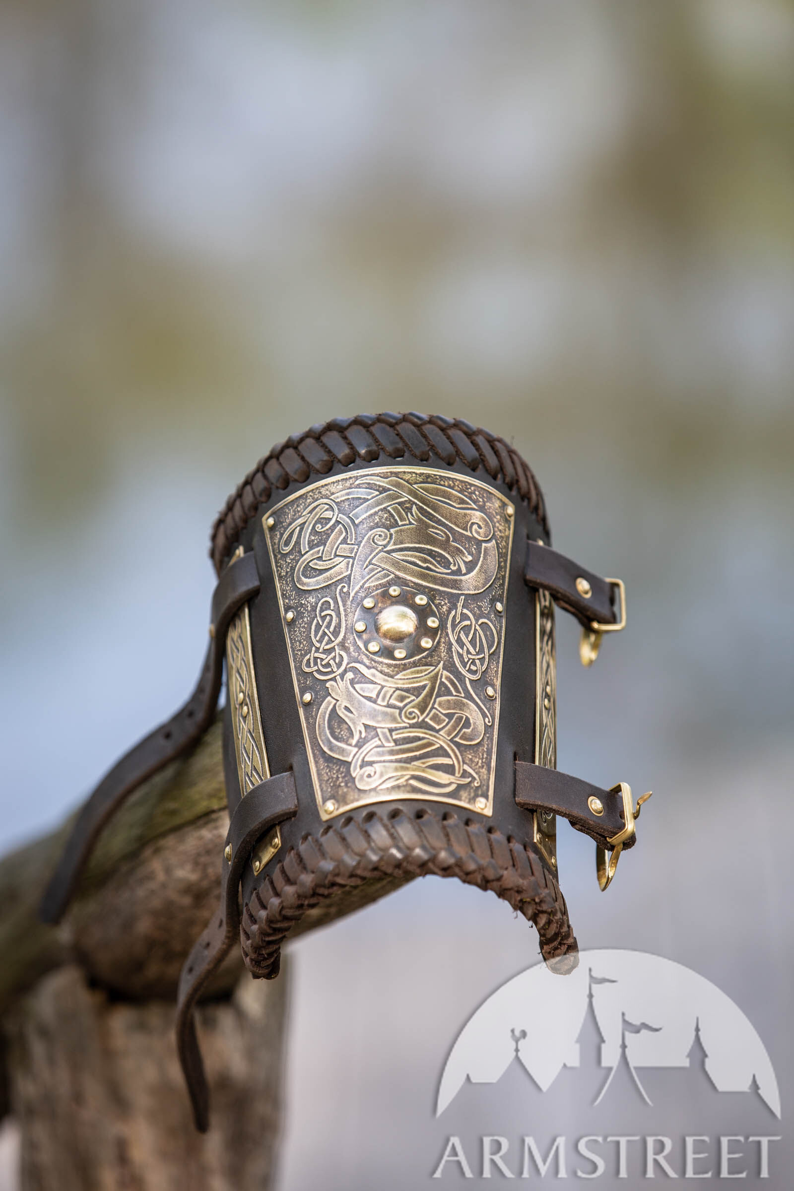 Diese Armschienen sind aus echtem Leder gefertigt und mit Akzenten aus Messing verstärkt, um ihnen zusätzliches Gewicht zu verleihen. Das Messing ist mit unserem neuen Wolfsmuster verziert, zusammen mit Wikinger Knotenmustern, die sie wirklich zu einem visuellen Vergnügen machen. Die Platten sind mit kleinen Messingnieten befestigt, die zum Gesamtbild beitragen. Die Außenseite der Armschiene ist mit einem Lederriemen versehen, der auf die Kante gestickt wurde.