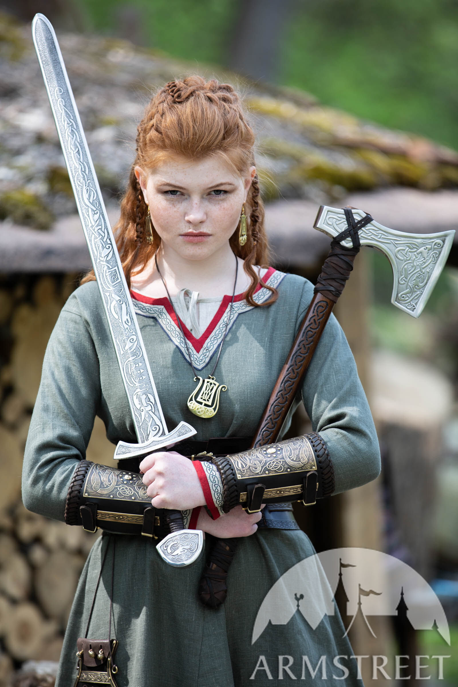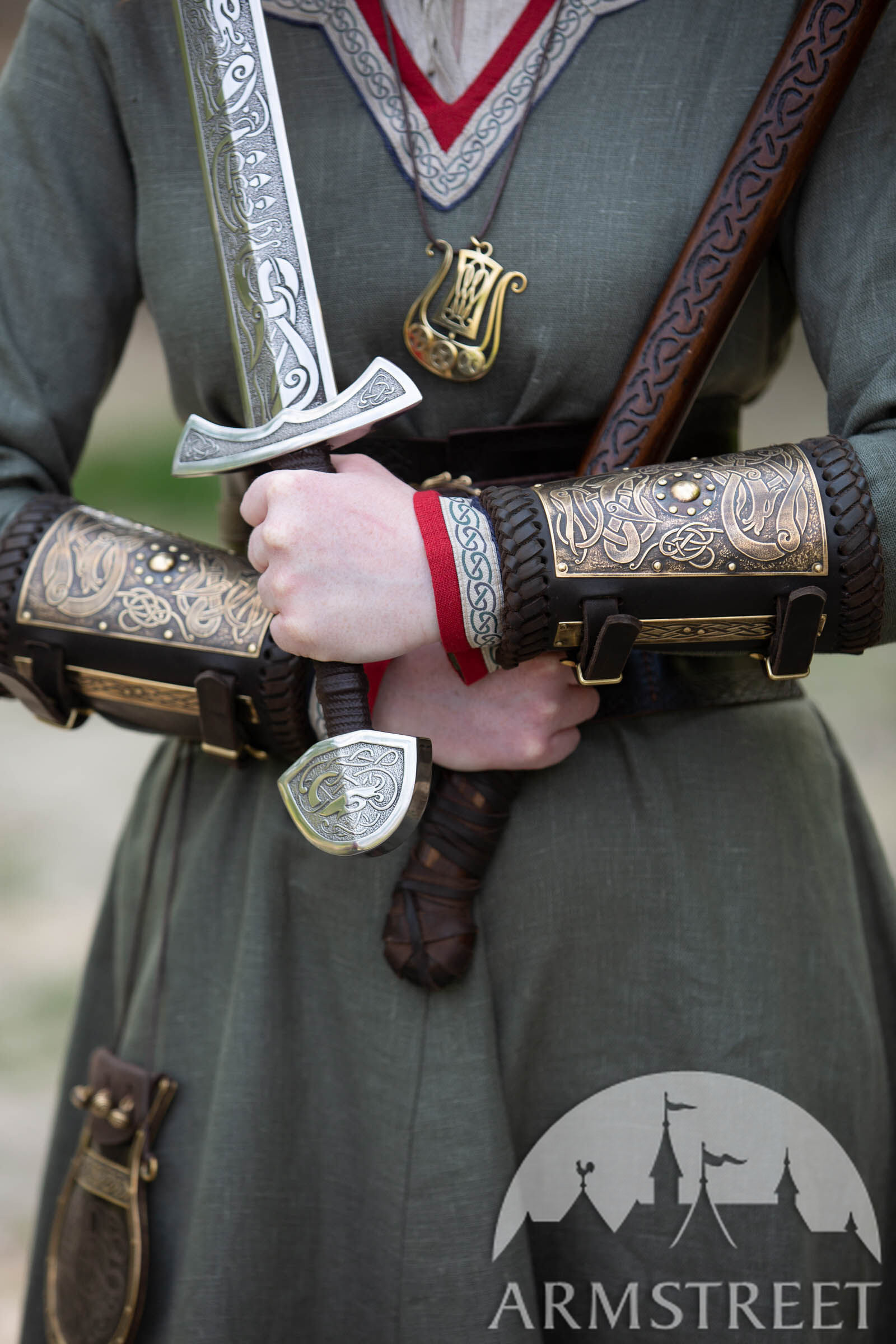 Die Armschienen werden mit Hilfe von zwei Riemen geschlossen, die mit Wikingerschnallen aus Messingguss verziert sind. Es handelt sich um kurze Armschienen, die sich etwa auf halber Höhe Ihres Unterarms befinden, sodass sie Sie nicht zu sehr belasten oder Ihren Kampf mit ihrer Masse beeinträchtigen. Wir wollten, dass diese leicht, bequem und dennoch schützend sind.