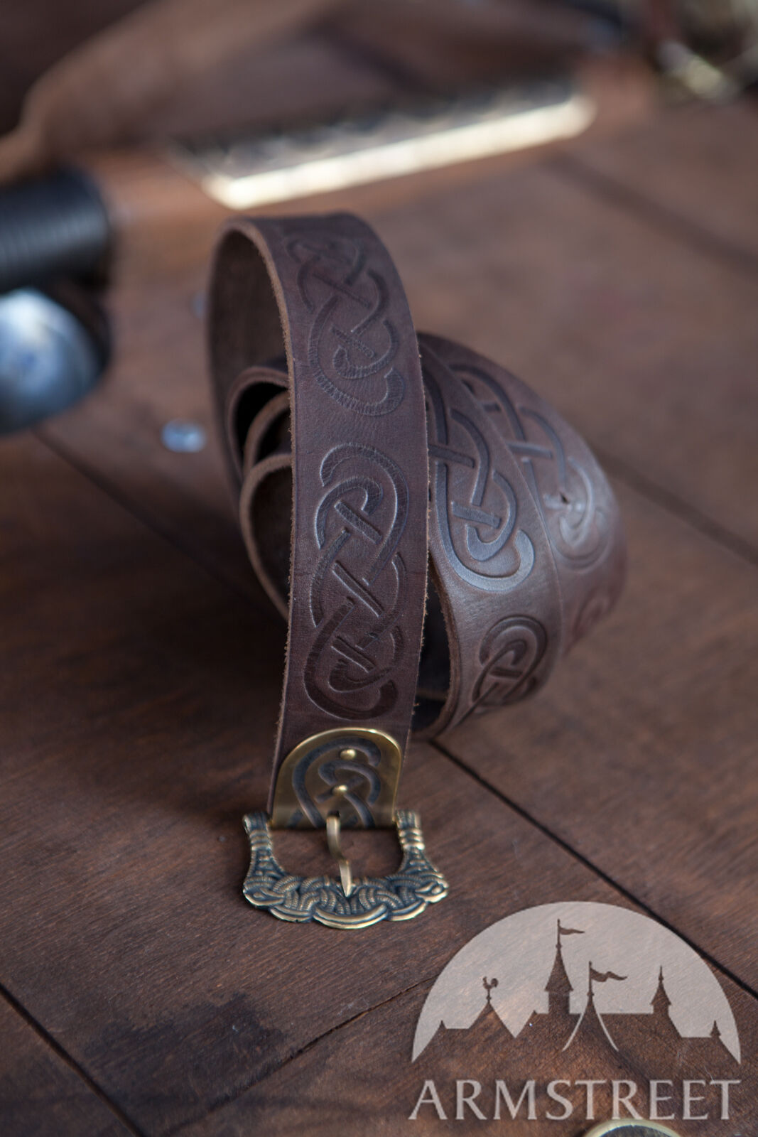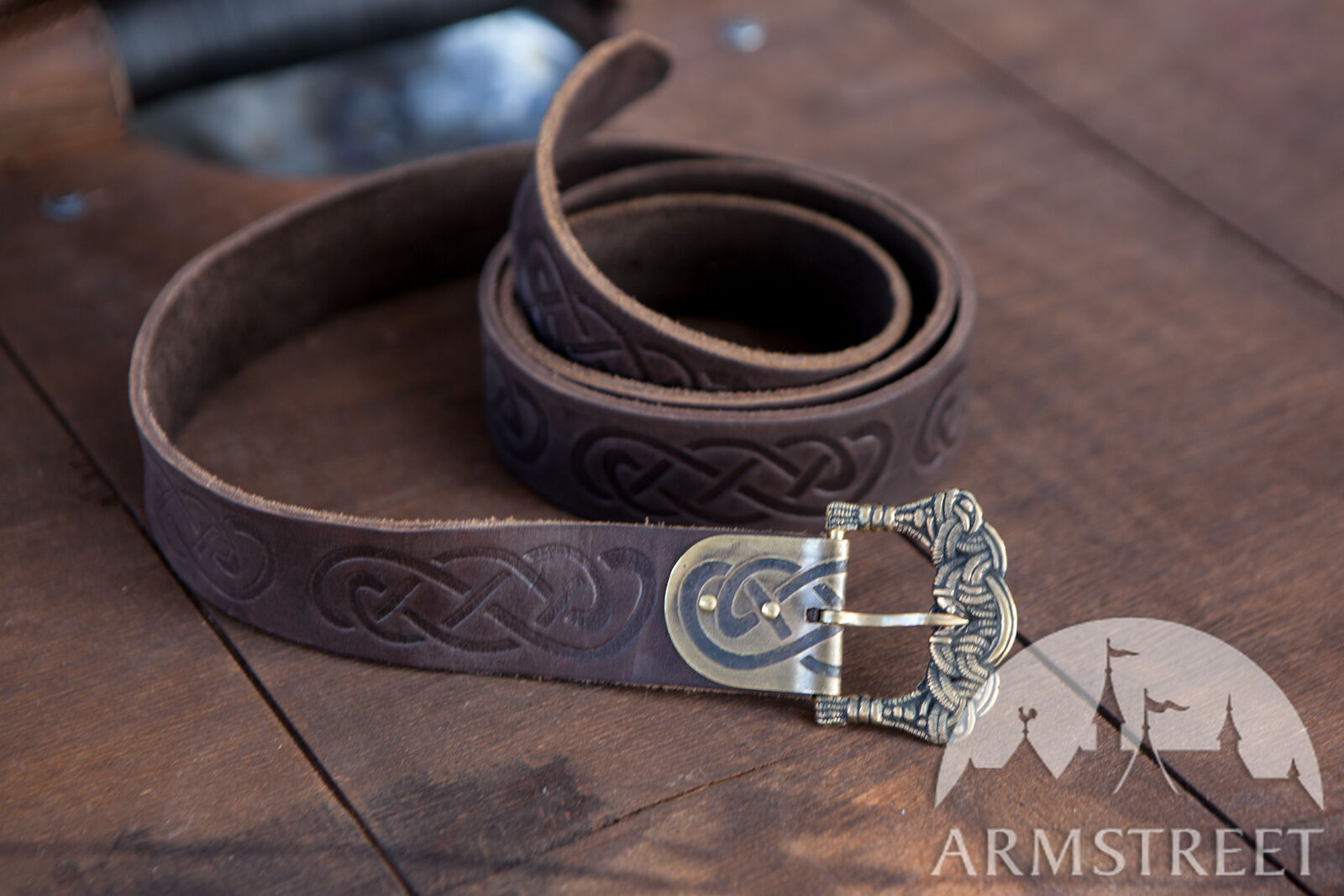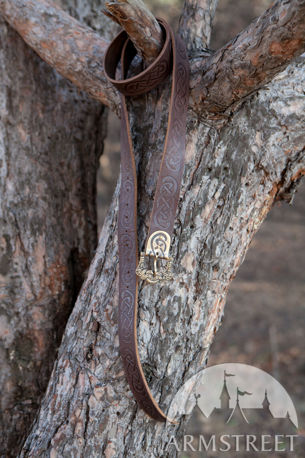Dieser Gürtel ist ein Teil unserer Wikinger-Kollektion. Es wird mit geprägtem Muster und handgemachten Spangen aus Messing verziert. Ein hervorragender stilvoller Teil Ihrer Mittelalter-Garderobe!
